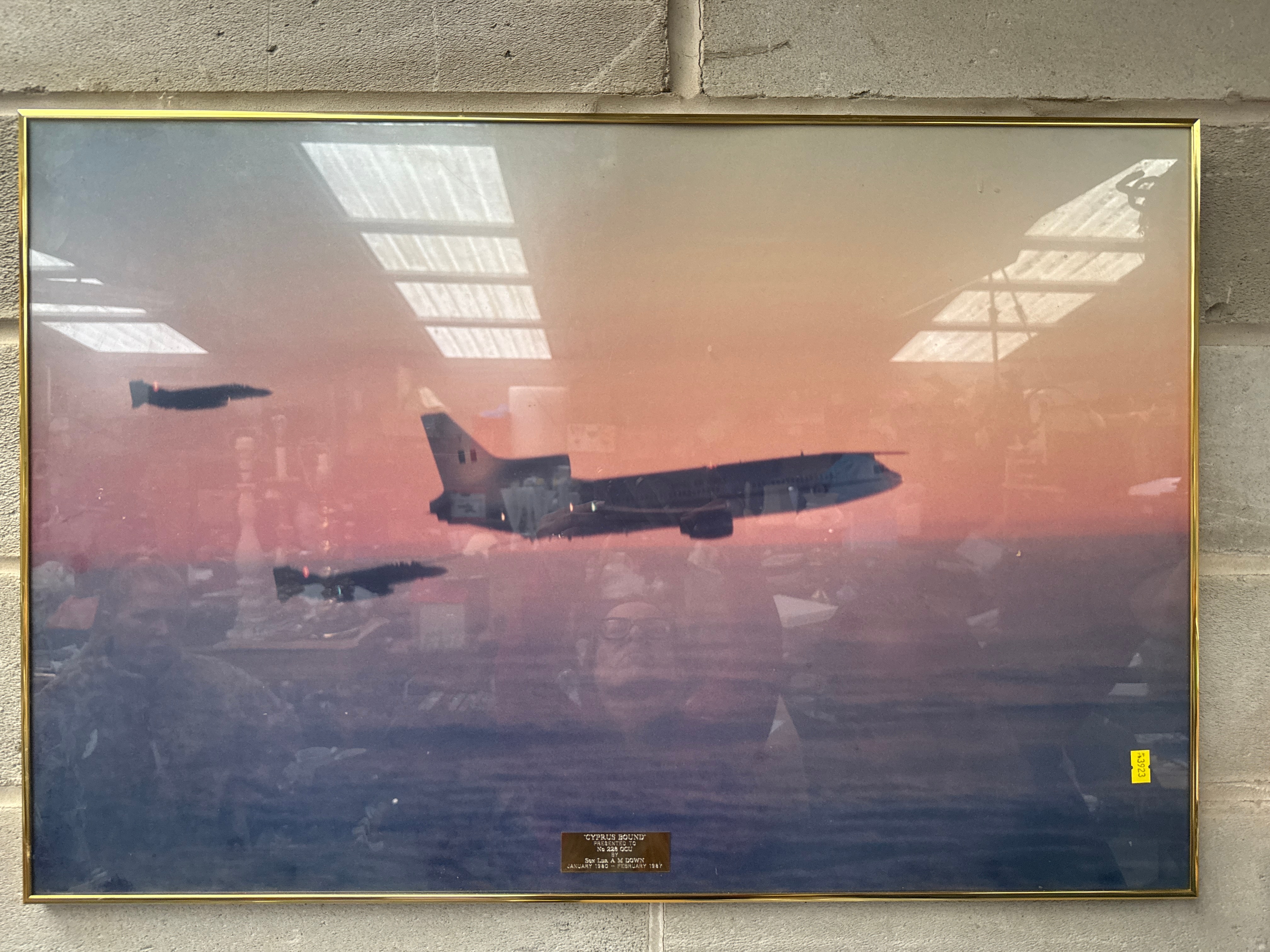 A photographic print by Steve H Clark, titled ‘Cyprus Bound’, depicting an RAF TriStar aircraft escorted by two fighter jets in silhouette against a vibrant sunset or sunrise sky over a body of water. The print is housed within a gold-toned metal frame and protected by glass glazing. Affixed to the matte beneath the image is a rectangular brass plaque inscribed with “CYPRUS BOUND”, “PRESENTED TO No 228 OCU”, “BY Sqn Ldr. A. M DOWN”, and dates “JANUARY 1980 – FEBRUARY 1987”, indicating a commemorative piece.
