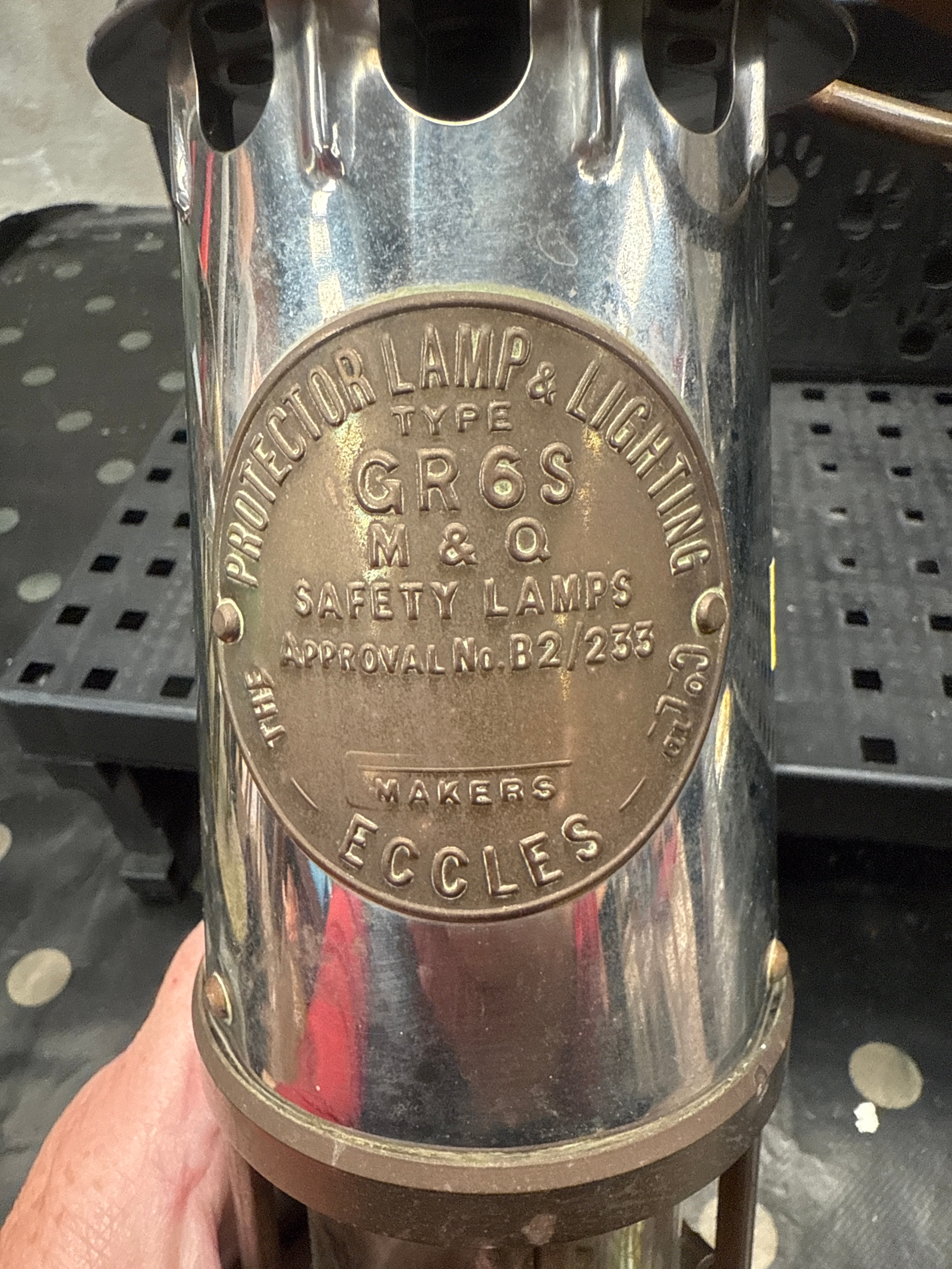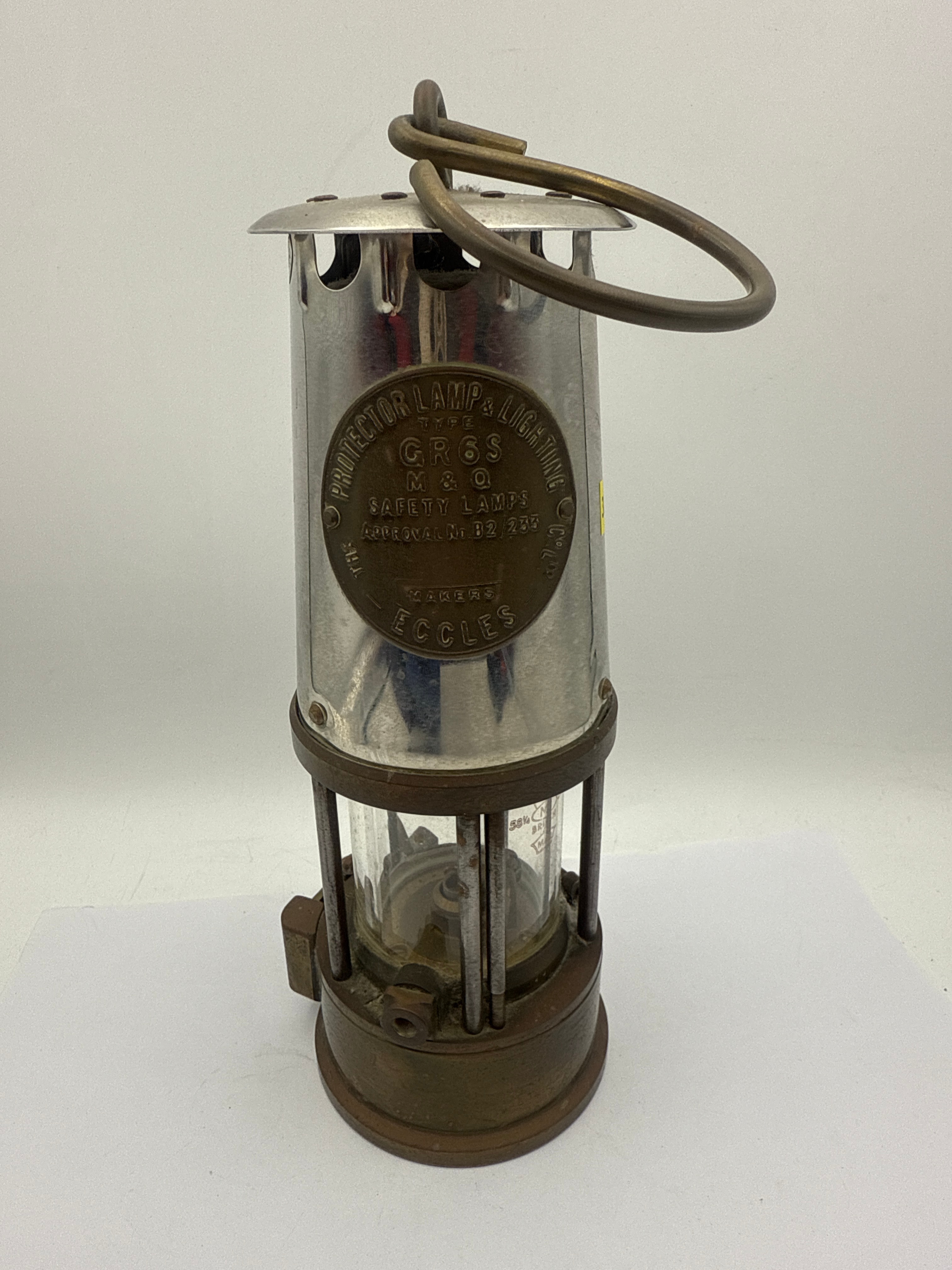 A Protector Lamp & Lighting Co. Eccles Type GR6S Miners Safety Lamp. The lamp is constructed predominantly from polished silver-toned metal, likely chrome-plated brass or steel, for the main body. The base, internal mechanisms, and top carrying ring are formed from darker, patinated brass or bronze. It features a clear glass cylindrical section to protect the flame. A prominent circular brass plaque on the side is inscribed with “PROTECTOR LAMP & LIGHTING Co Ltd”, “TYPE GR6S”, “M & Q SAFETY LAMPS”, “APPROVAL No. B2/235”, and “MAKERS ECCLES”. Faint, partially illegible numerical and textual markings are also visible on the glass.