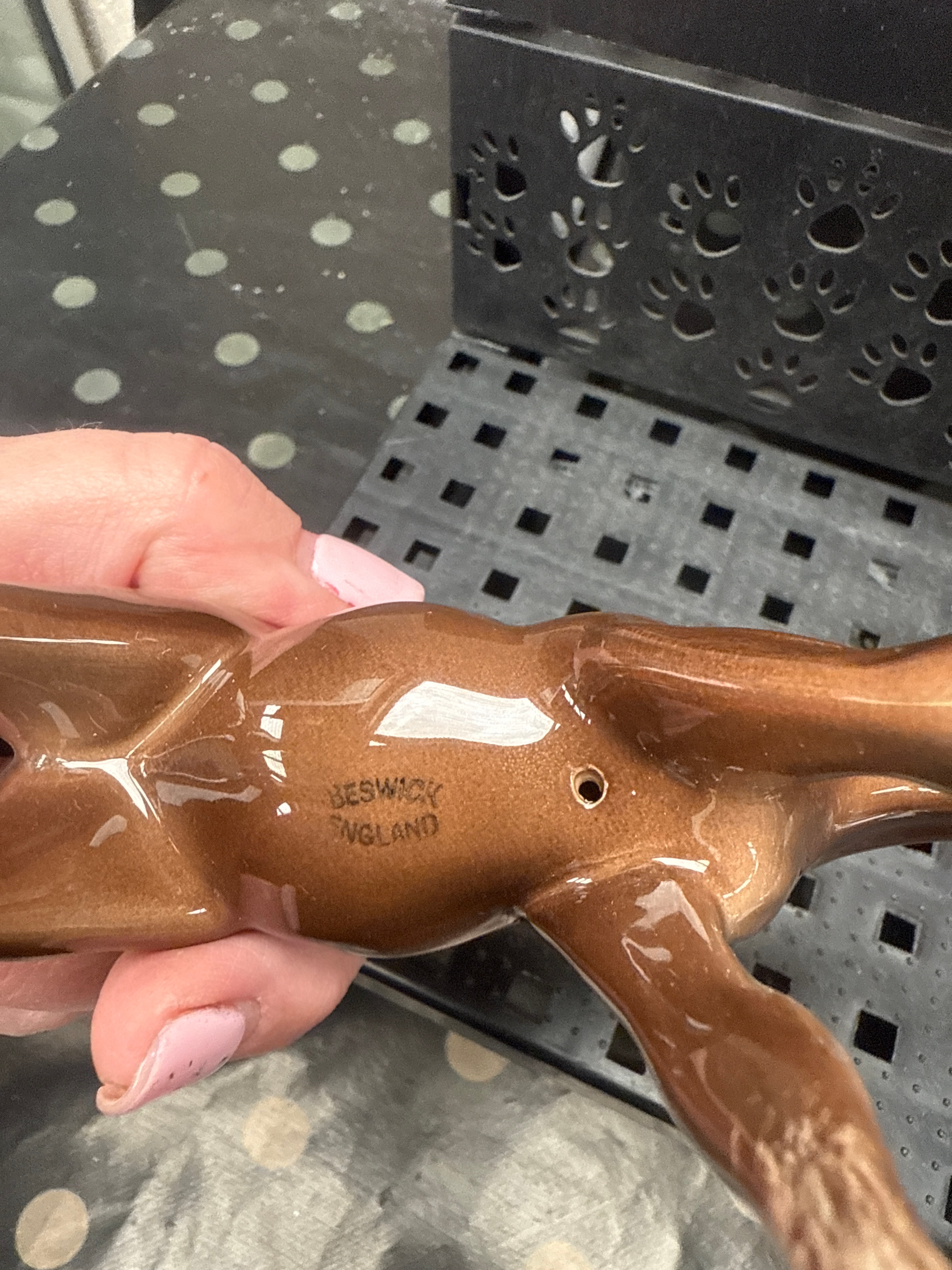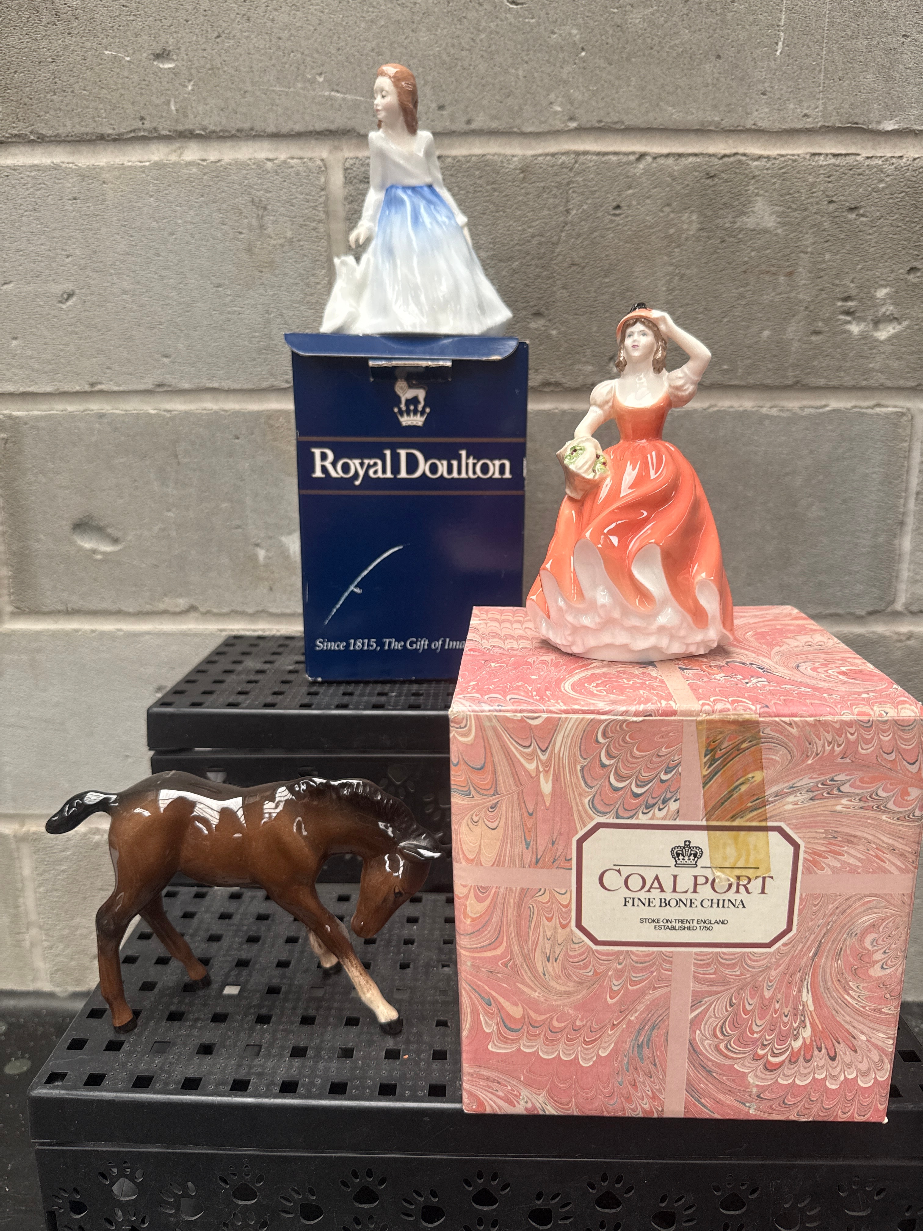 A group of three ceramic figurines. The first depicts a standing female in a white and blue dress, presented with its original blue cardboard box marked “ROYAL DOULTON Since 1815, The Gift of…”. The second figurine, also a standing female, wears an orange and white dress and is presented with its original pink marbled cardboard box labeled “COALPORT FINE BONE CHINA EST. 1750 ENGLAND”. The third item is a brown glazed ceramic figurine of a foal or young horse, with “BESWICK ENGLAND” embossed on its underside.