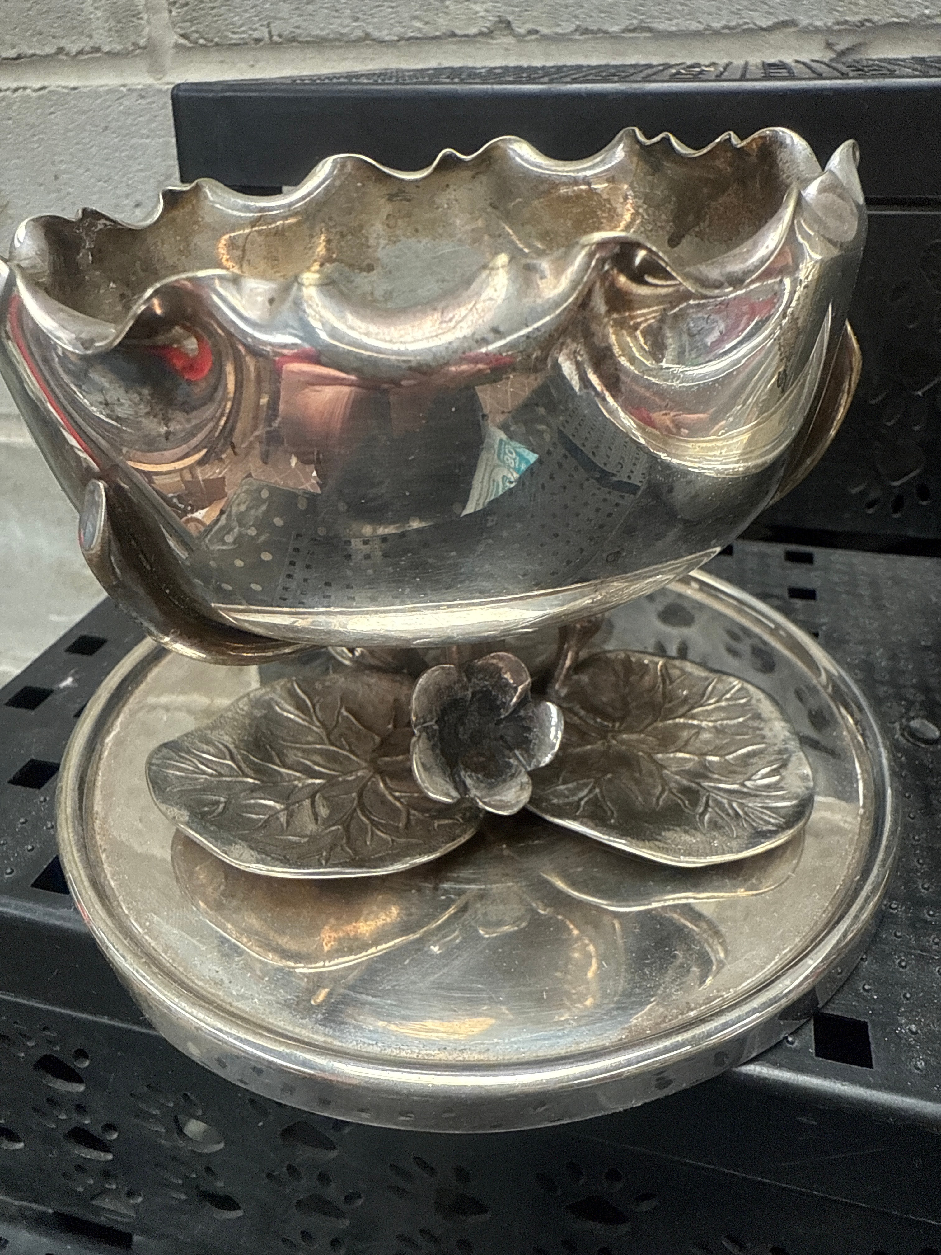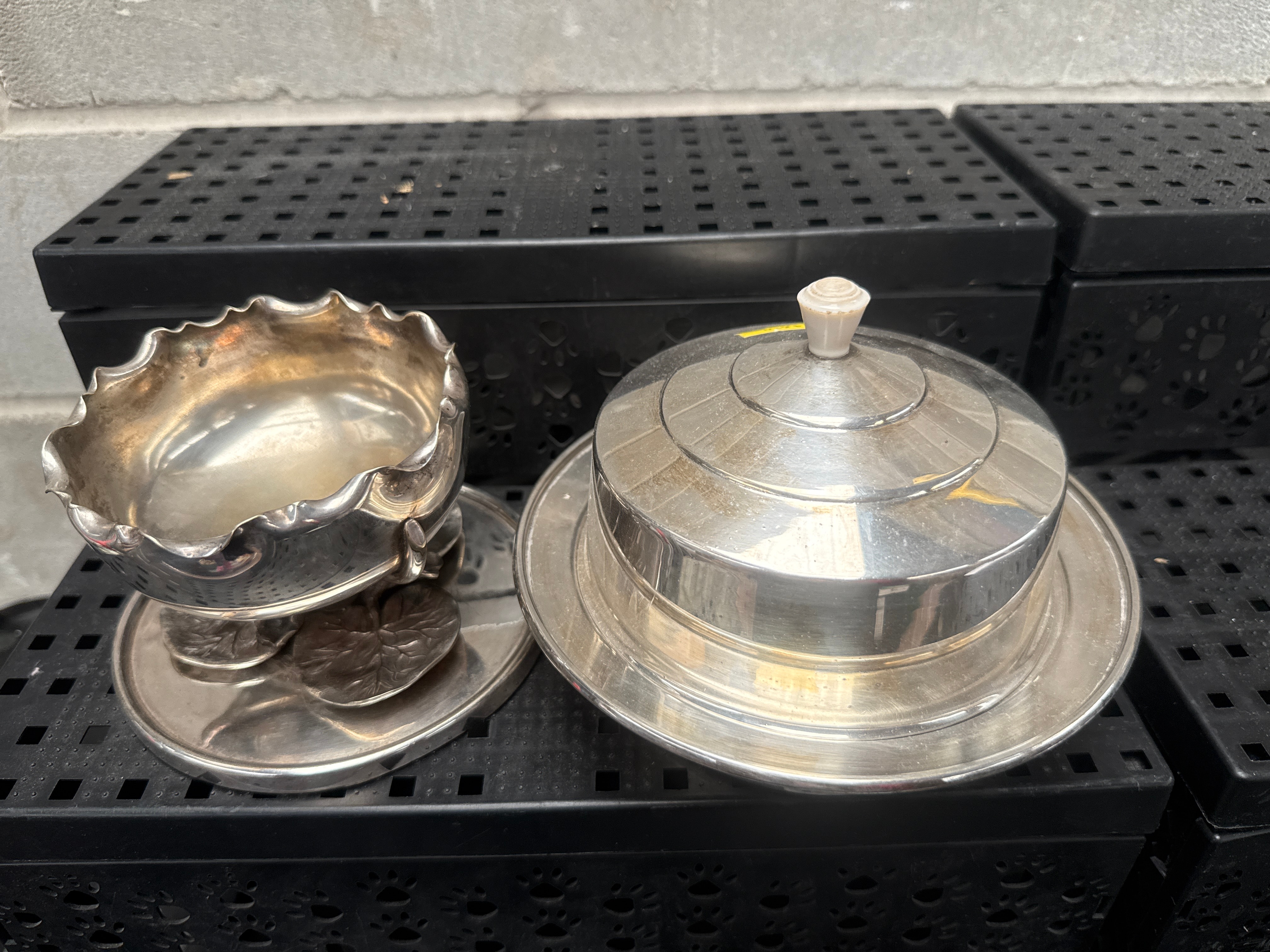 This group of silver-plated metalware comprises a decorative fluted bowl with a wavy rim, supported by a stand featuring naturalistic leaf and flower motifs, presented on a small round tray. Also included is a lidded serving dish, topped with a cream-colored finial, accompanied by a separate, plain round platter. The organic design elements of the bowl and stand suggest an Art Nouveau or early 20th-century influence. No manufacturer’s marks or discernible text are visible.