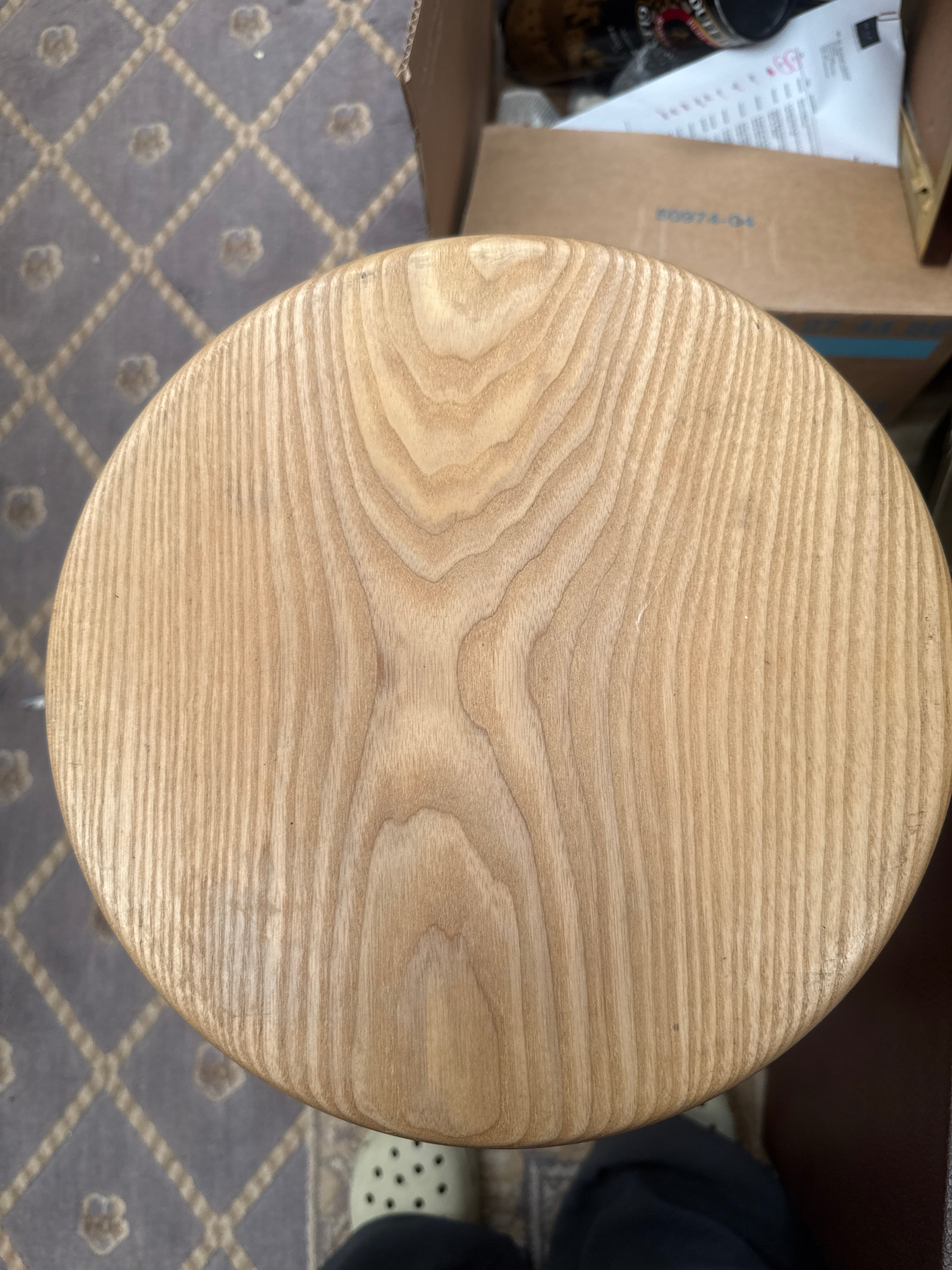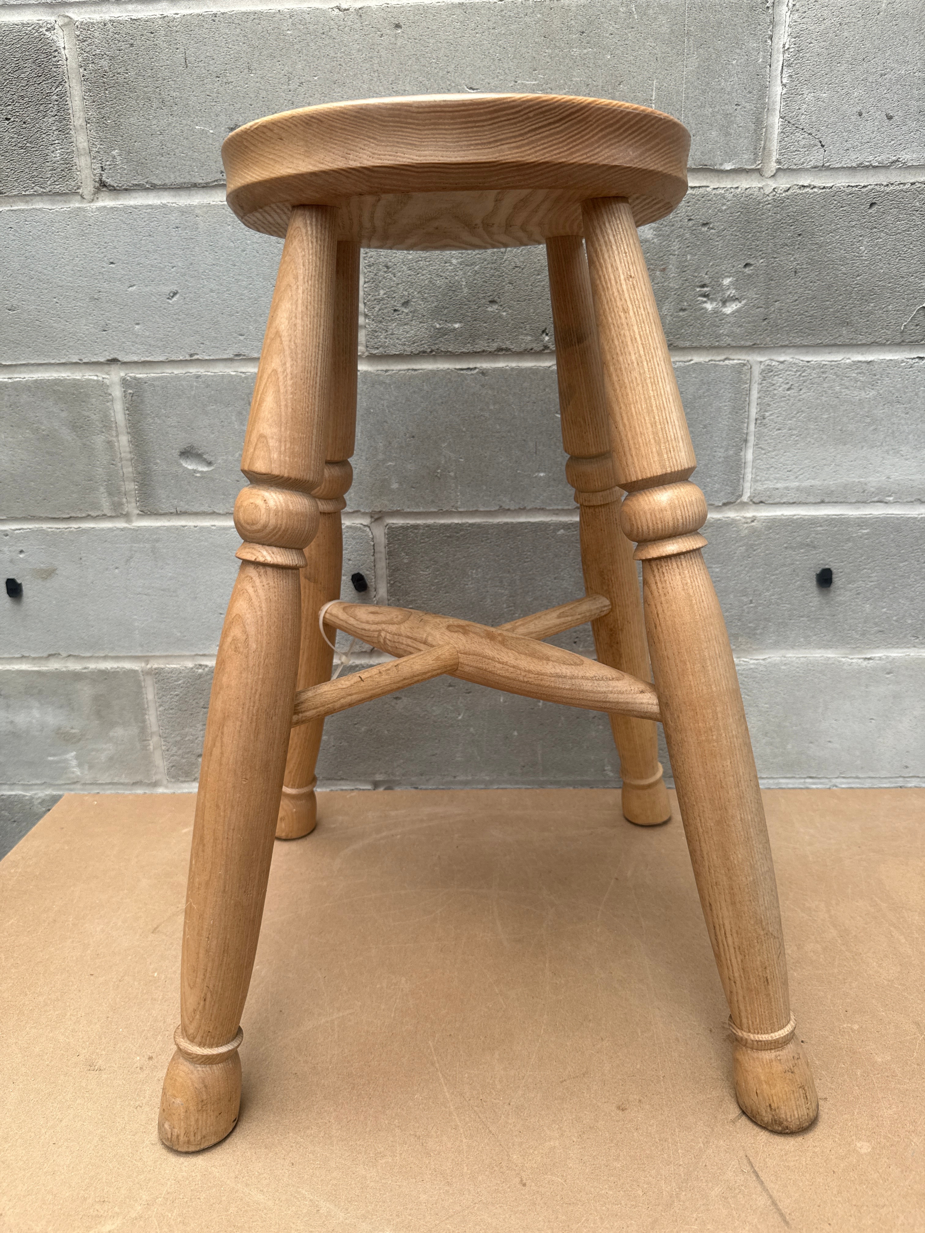 An antique Windsor-style wooden stool, featuring a round, flat seat and four turned legs connected by an X-shaped stretcher. The wood exhibits prominent grain patterns, characteristic of pine or a similar species, and appears to have a natural or clear finish. The design style is traditional or rustic.