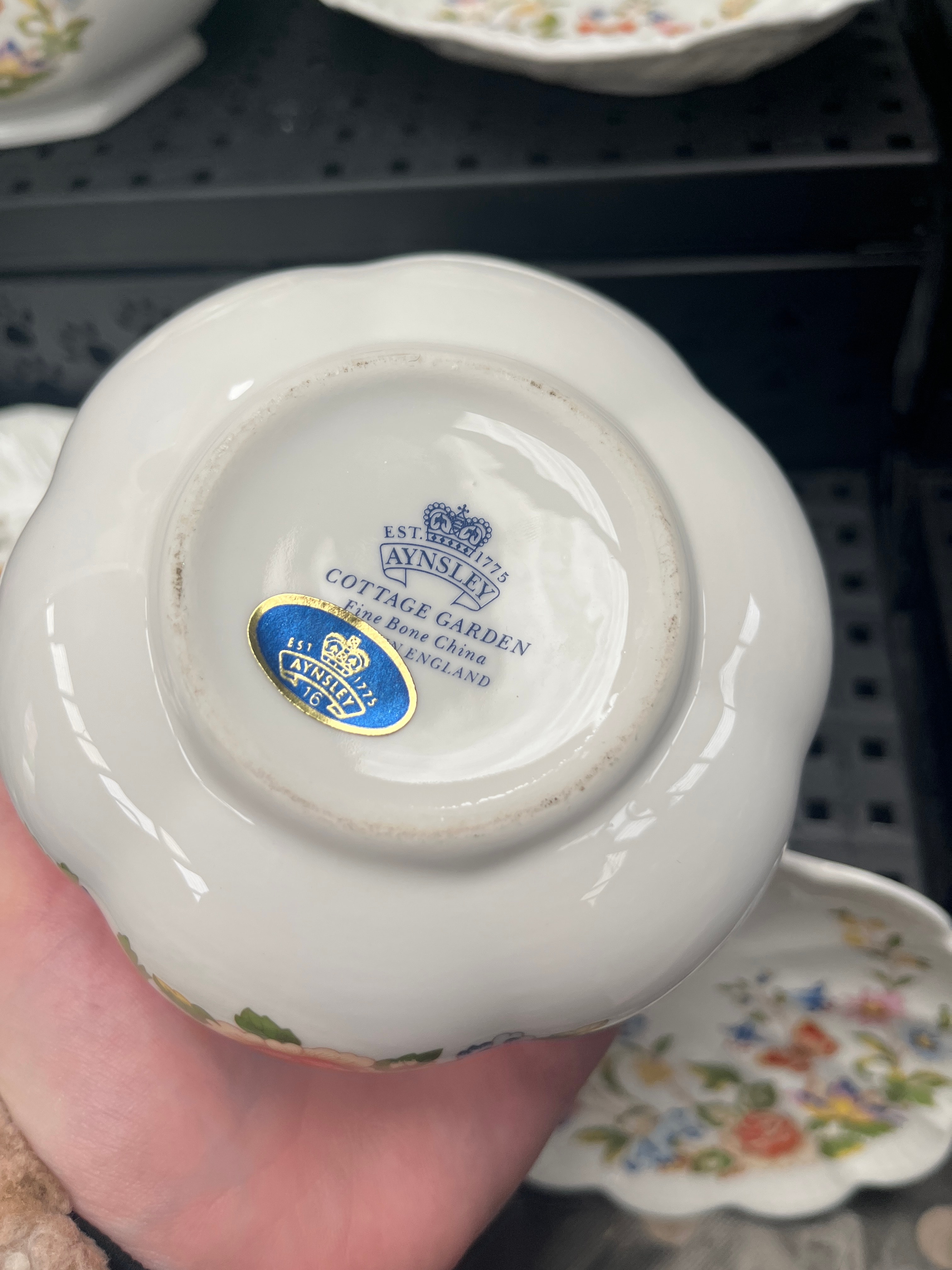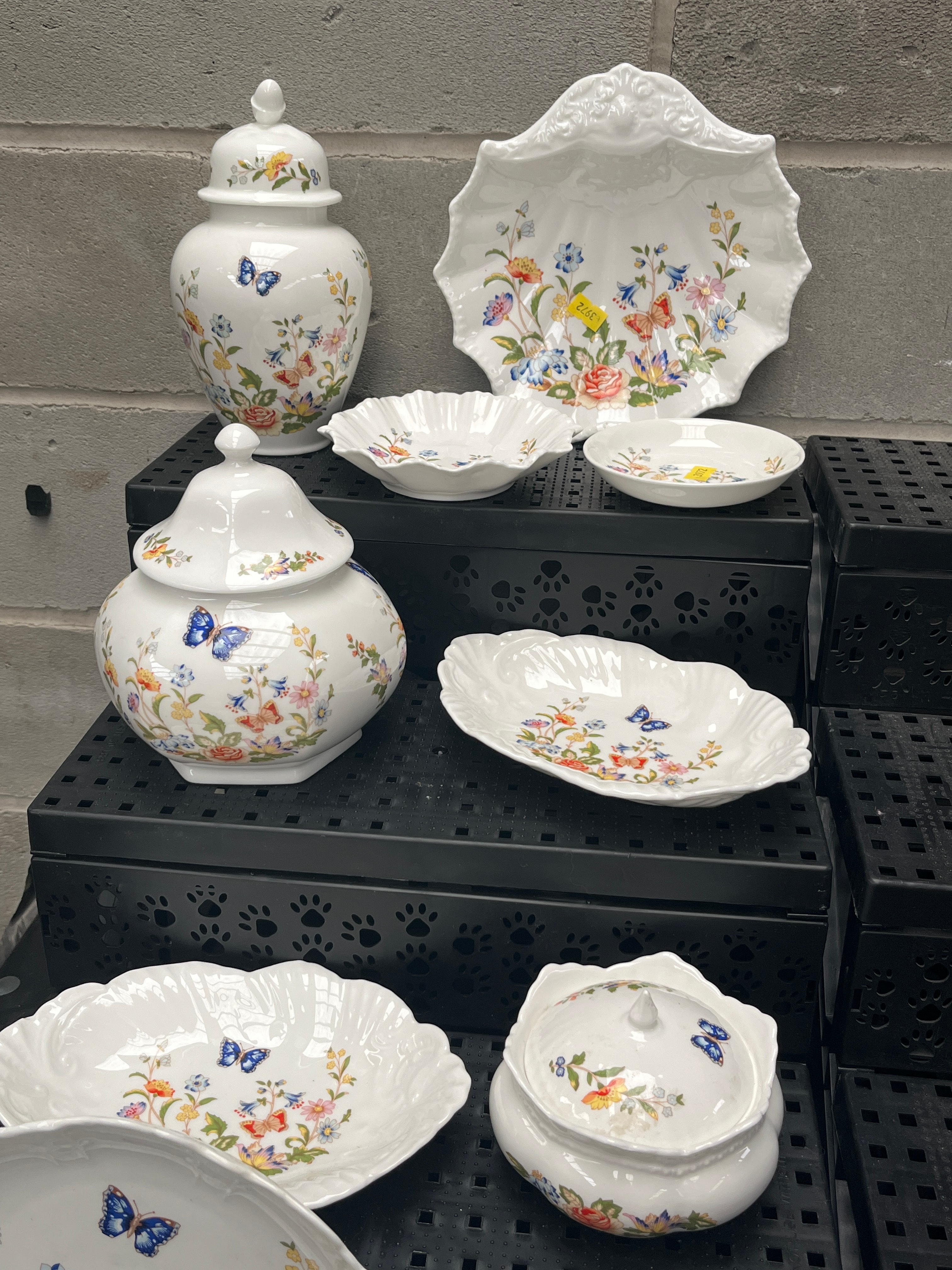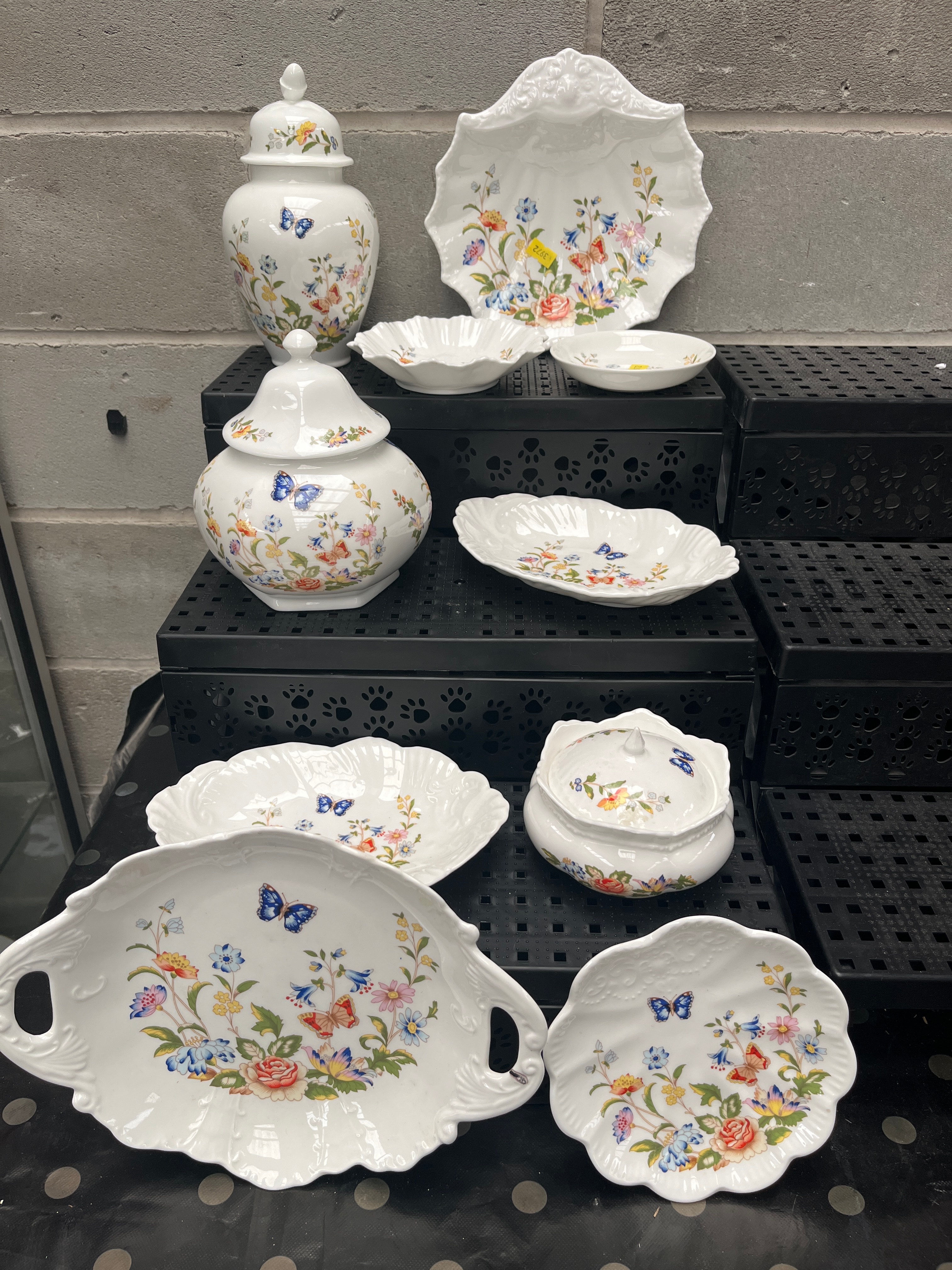 A Collection of Aynsley ‘Cottage Garden’ Fine Bone China Tableware, comprising eleven pieces. This group includes two lidded urn-shaped vessels, a large scalloped-edge decorative plate, a lidded tureen, two medium fluted bowls, two small dishes, and three oblong serving dishes, one with handles. Each item is adorned with a vibrant ‘Cottage Garden’ floral and butterfly motif. The style is traditional with prominent scalloped and fluted edges. Each piece bears a visible backstamp identifying the material as ‘AYNSLEY Fine Bone China,’ ‘EST. 1775,’ and ‘MADE IN ENGLAND,’ also displaying a crown logo.