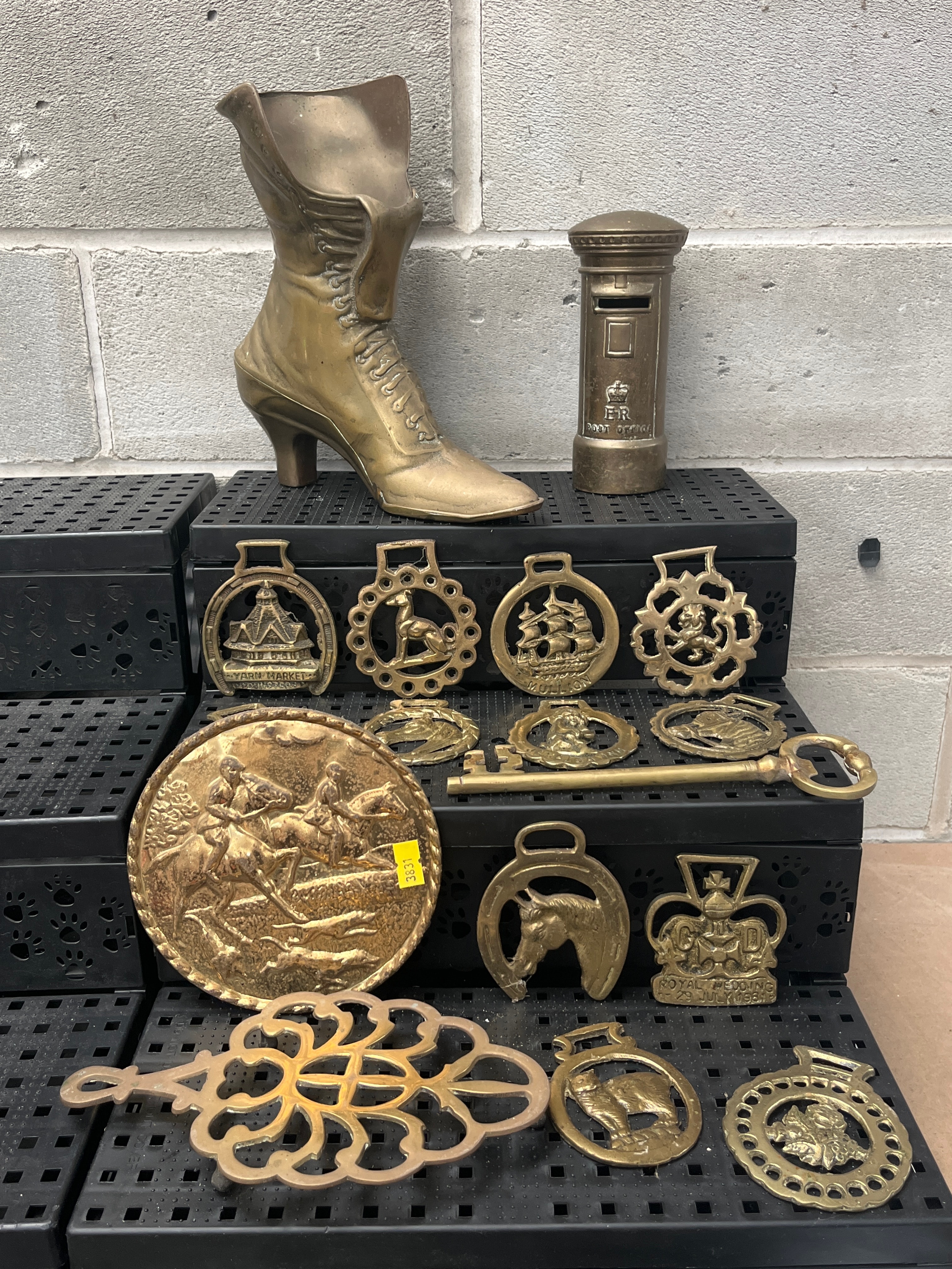 A collection of seventeen decorative brass items, primarily featuring styles evocative of the late Victorian or Edwardian periods. Key objects include a large, high-heeled ladies’ boot ornament and a miniature ‘POST OFFICE’ pillar box bearing the ‘ER’ royal cypher. The collection also features a large circular plaque depicting a hunting scene with horses and riders, a decorative skeleton key, and an openwork trivet. The remaining twelve pieces are smaller brass ornaments, many styled as traditional horse brasses, displaying diverse motifs such as horses, deer, ships, and floral patterns. Visible inscriptions on these include ‘ALDEBURGH, ‘ ‘ROYAL POST, ‘ and ‘THE ROYAL FOREST, ‘ with one also showing the royal crest and ‘DIEU ET MON DROIT’ (God and my right).