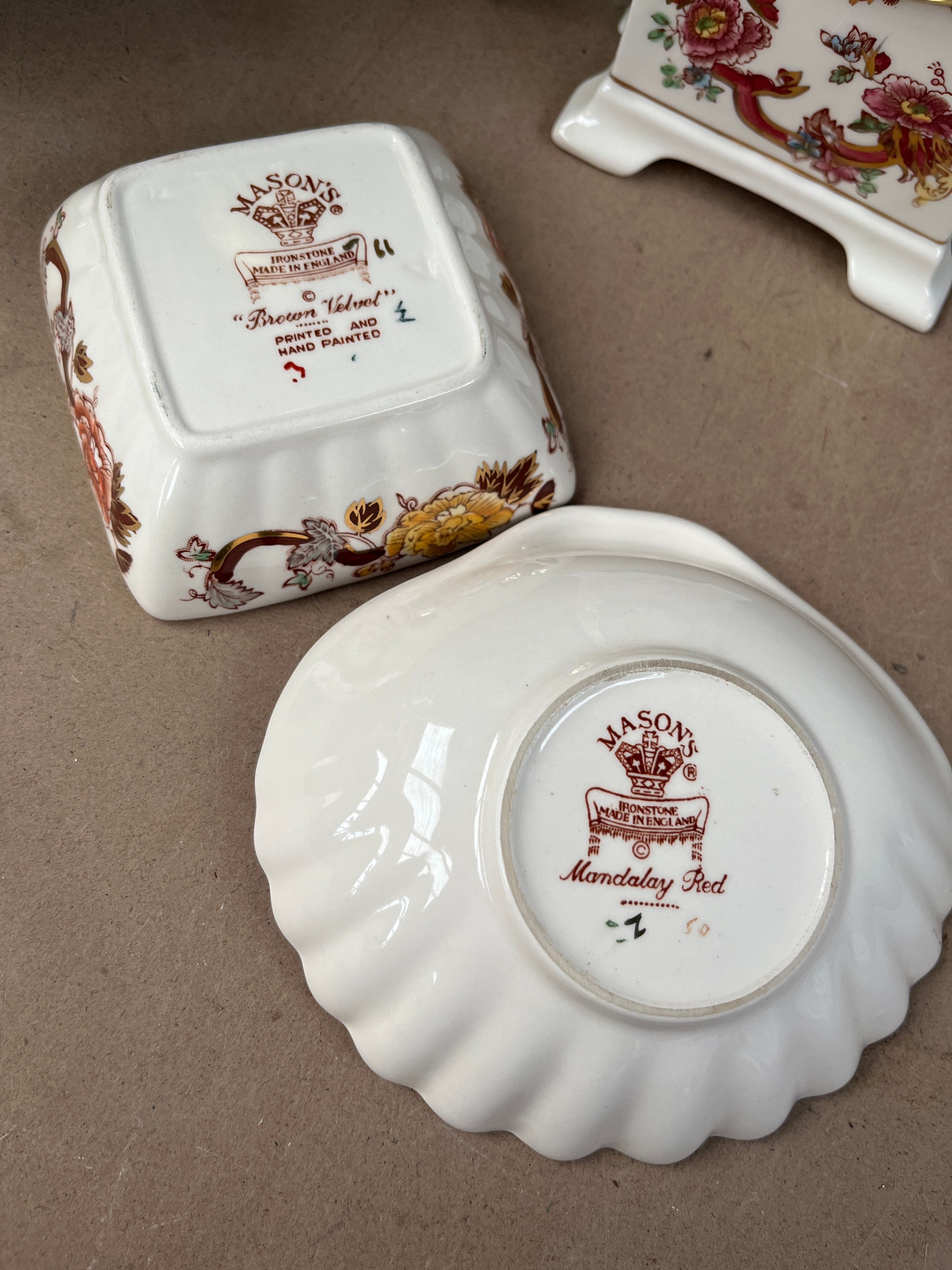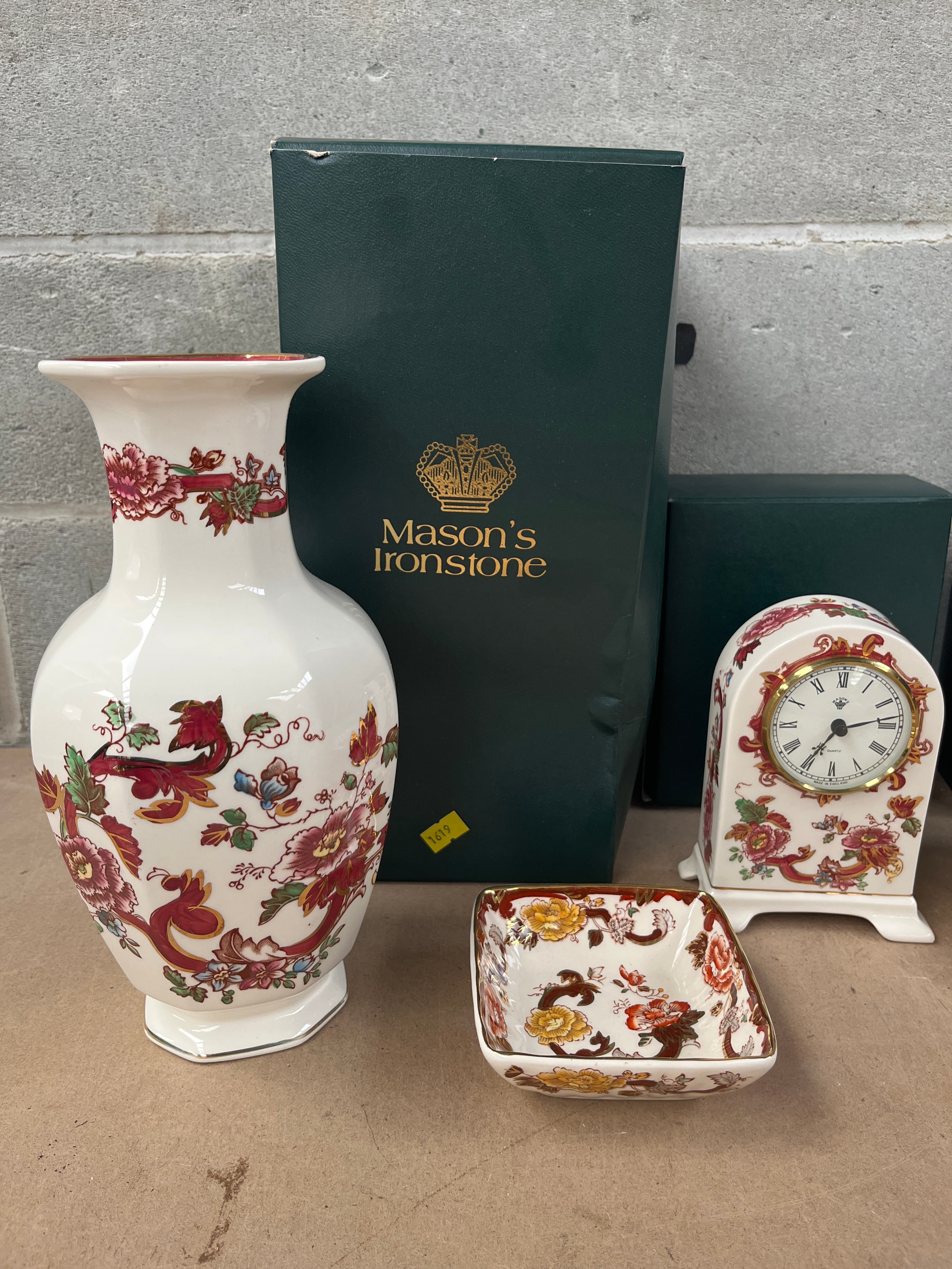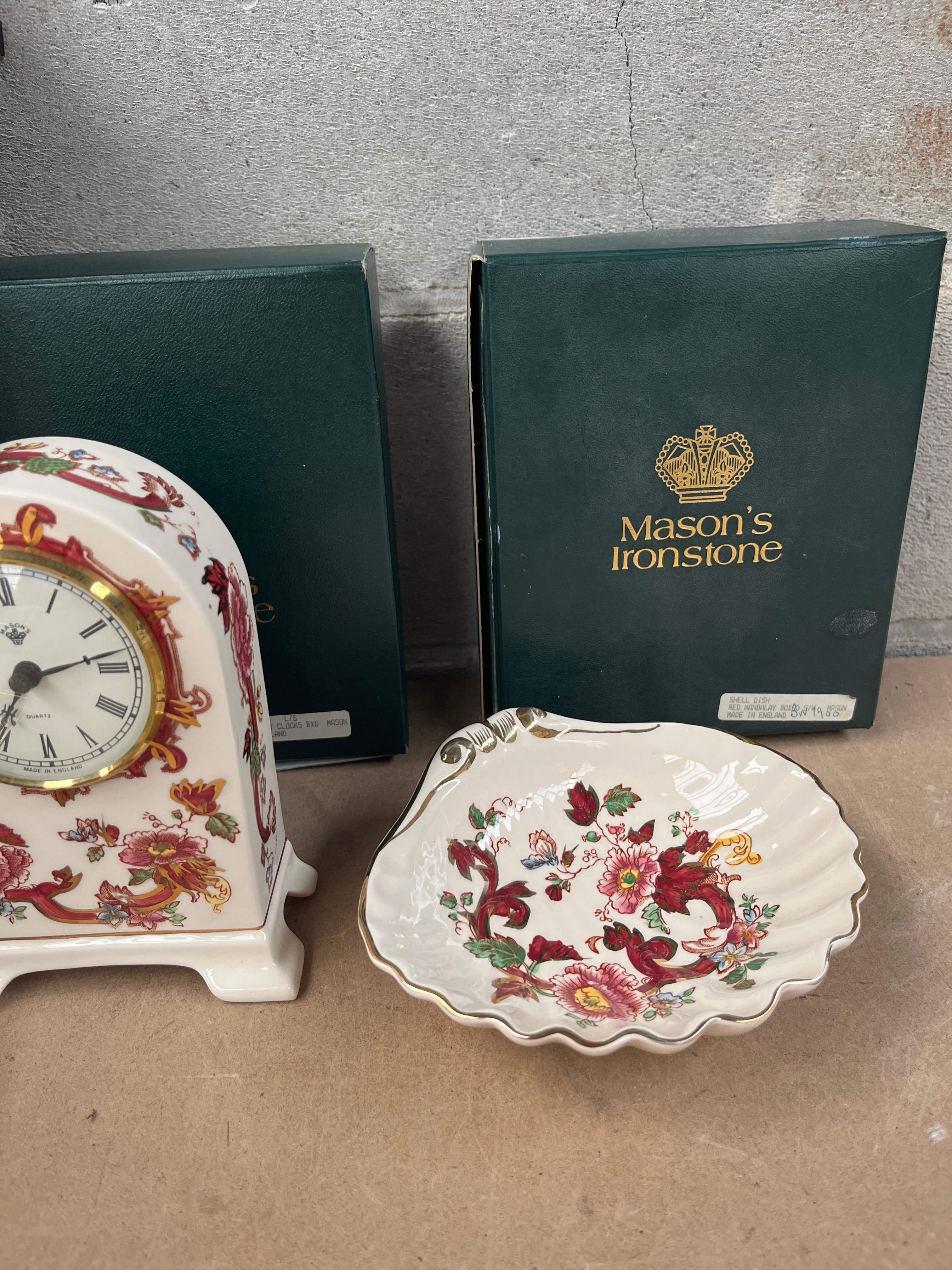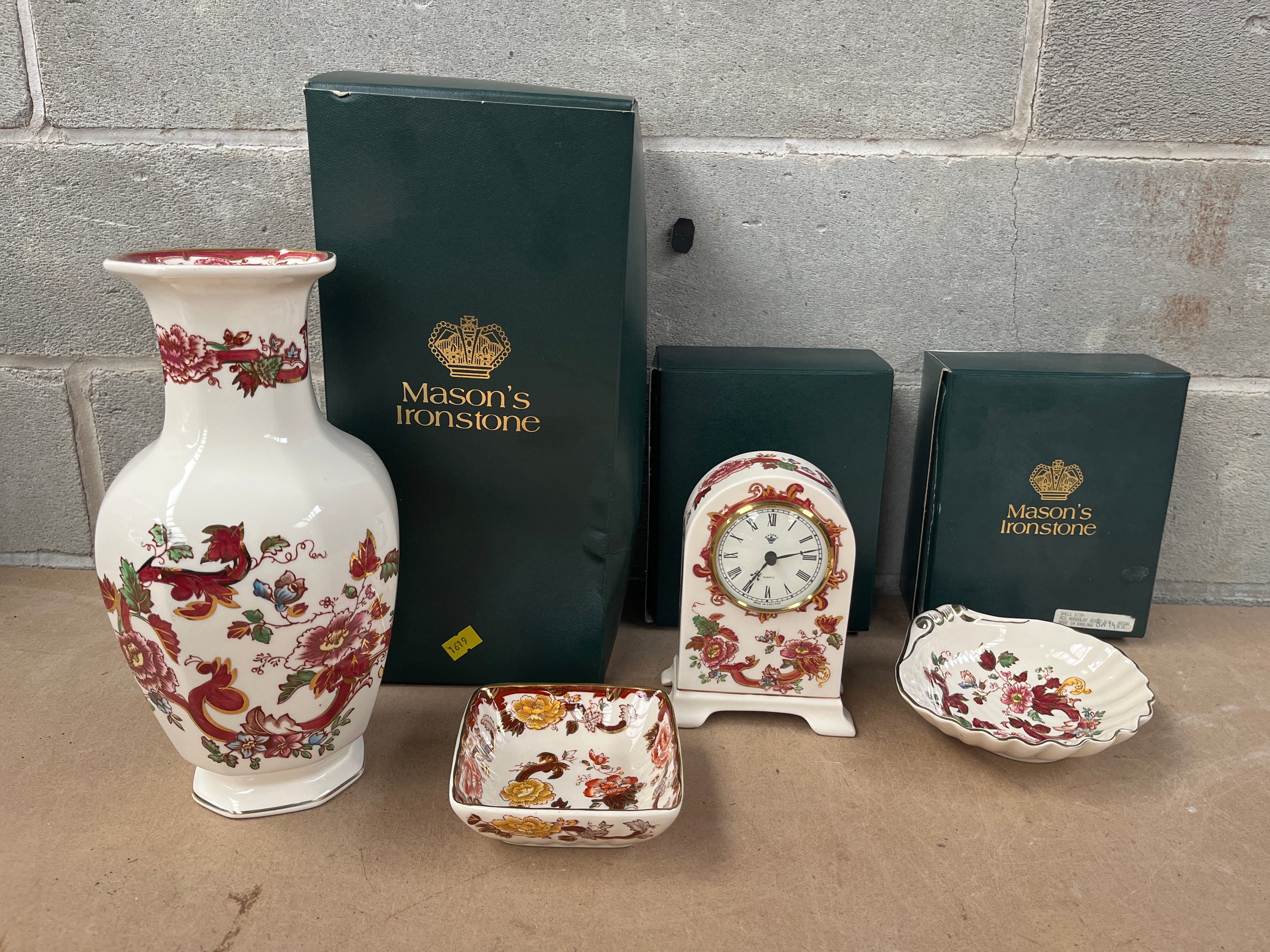 A collection of Mason’s Ironstone ceramic wares, primarily in the ‘Mandalay Red’ pattern, comprising a tall vase, a small arch-top quartz clock, a square fluted bowl, and a shell-shaped dish. All four ceramic pieces are consistently decorated with an ornate multi-colored floral and scroll pattern, primarily featuring red, pink, yellow, and green tones on a cream-white ground, accented with gold rims. The undersides of the square bowl and shell dish are clearly marked “Mason’s Ironstone” with a crown logo and “MADE IN ENGLAND”. The square bowl’s pattern is identified as “Brown Velvet,” and the shell dish’s as “Mandalay Red,” both noting they are “PRINTED AND HAND PAINTED.” The clock features a white dial with Roman numerals and “QUARTZ” visible. Accompanied by three dark green storage boxes, also branded “Mason’s Ironstone.”