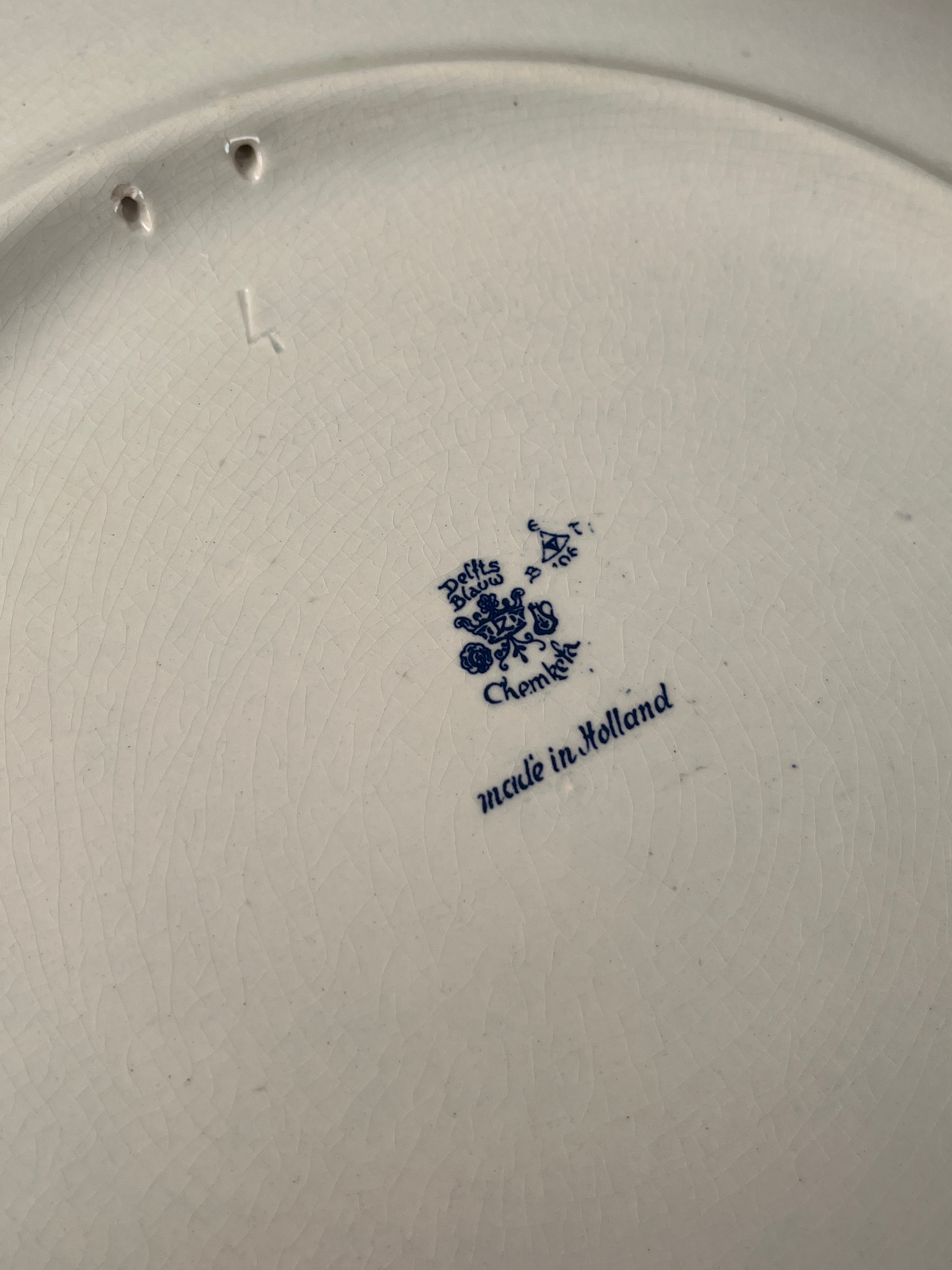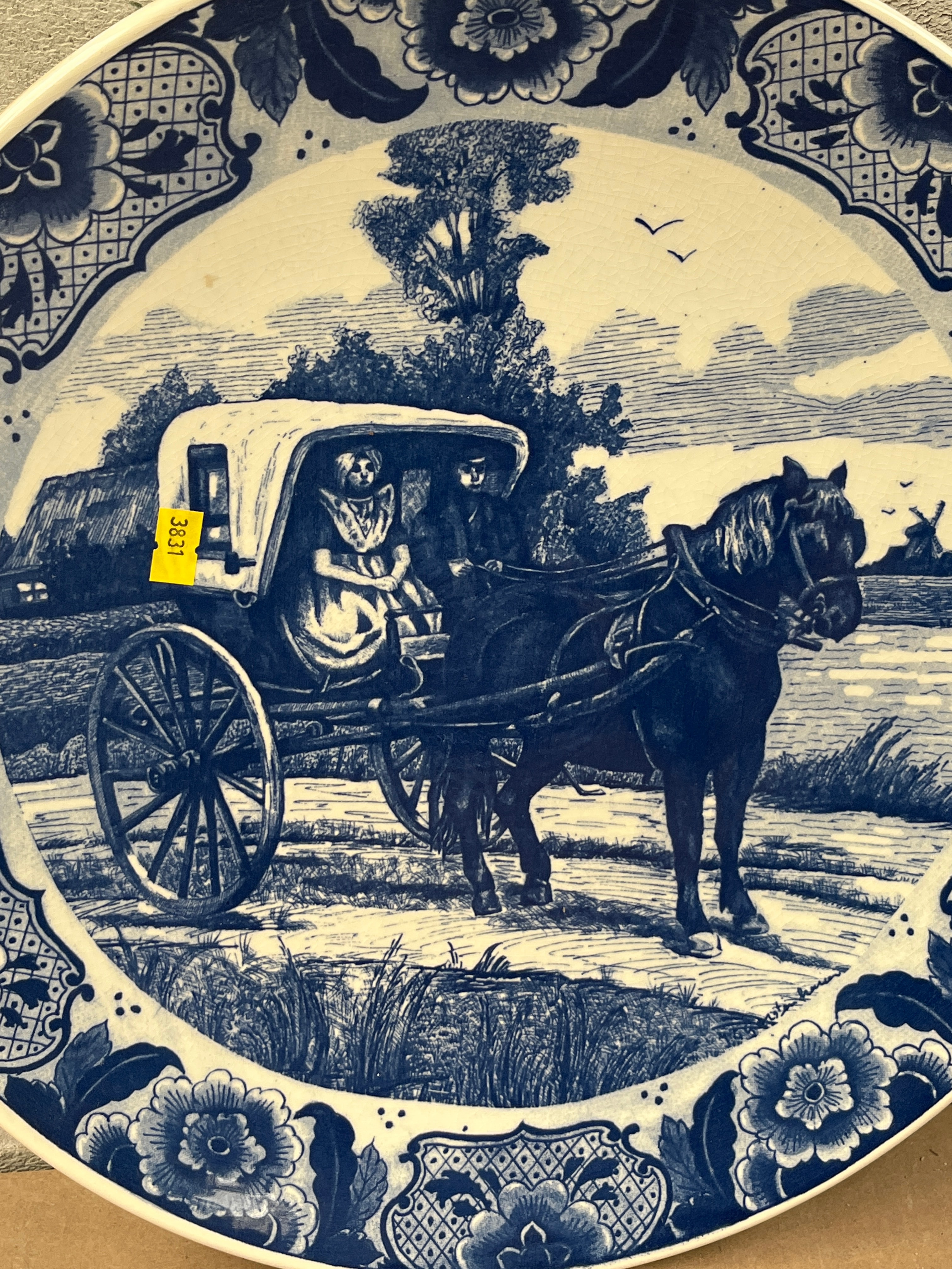 A Chemkefa Delft Blue hand-painted decorative glazed ceramic plate or wall charger. The central motif depicts a traditional Dutch genre scene with a horse-drawn carriage containing two figures, set against a landscape with a thatched building, trees, birds, and windmills. The scene is bordered by an ornate floral and geometric pattern. The reverse bears the marks "Delfts Blauw", a crown or crest-like maker’s mark, "Chemke", and "made in Holland". Three small holes are present on the back, likely for hanging.