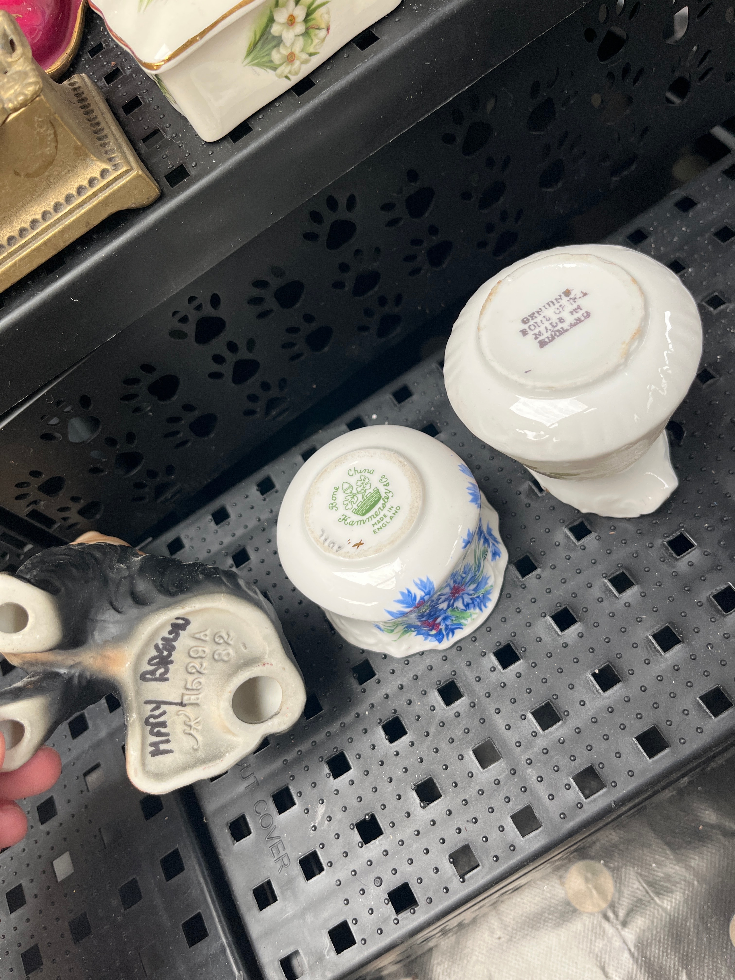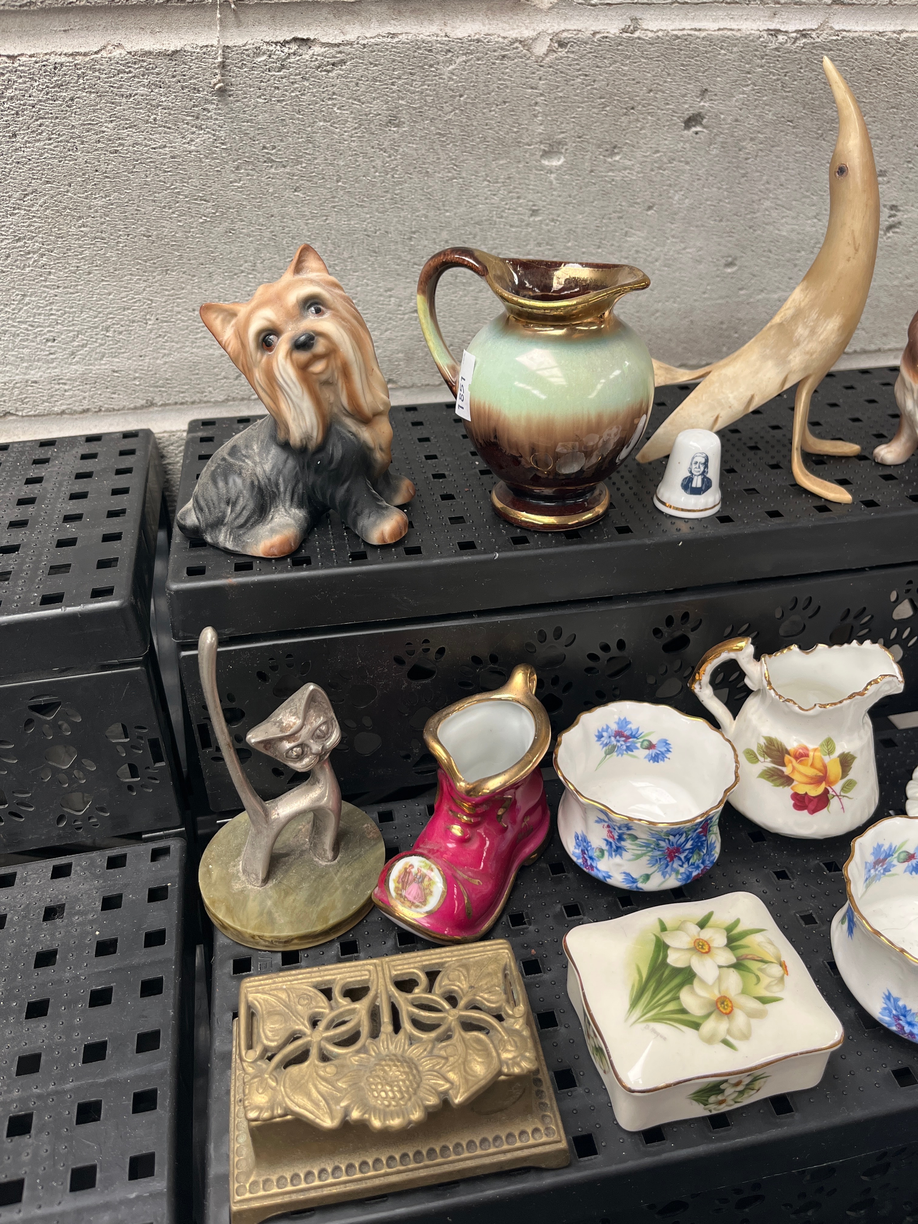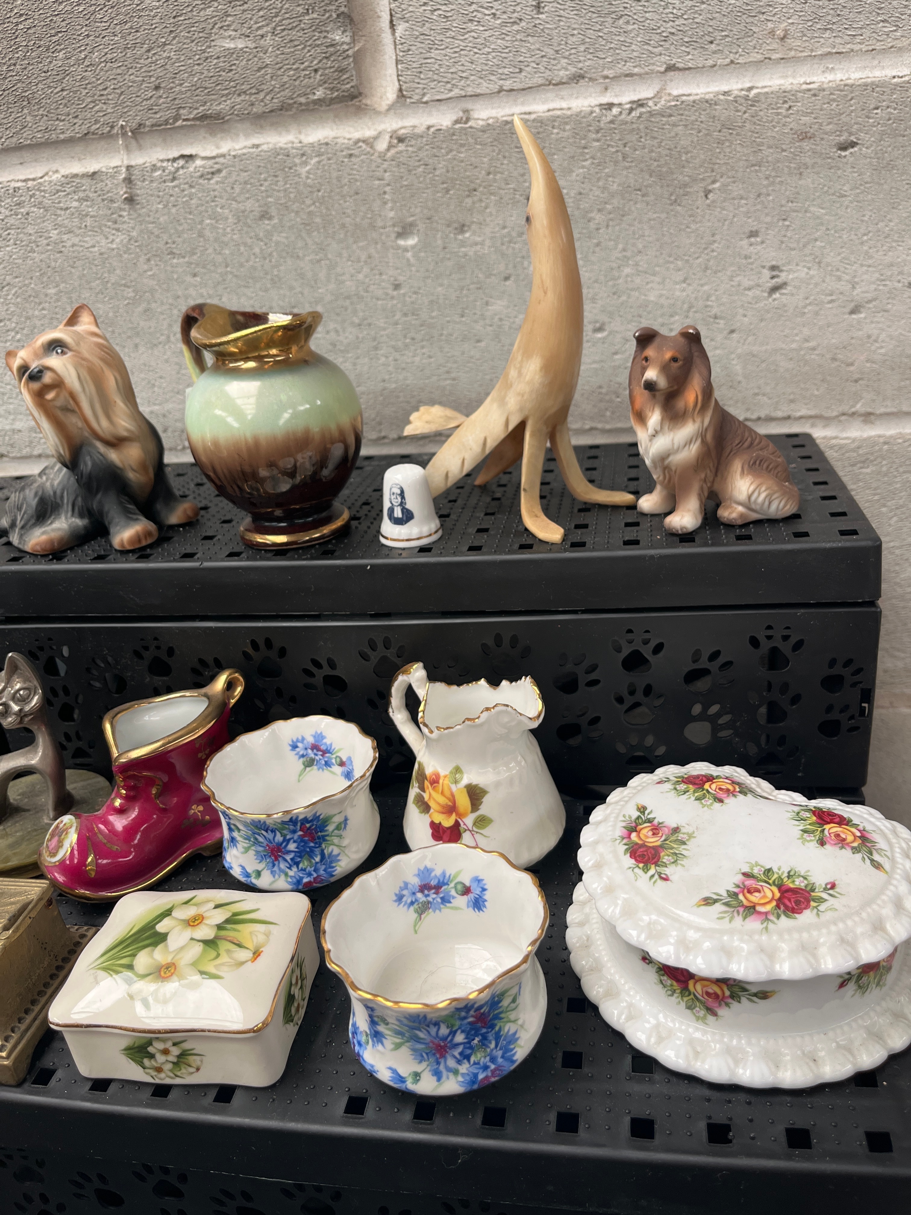 This lot comprises 14 assorted decorative items, primarily crafted from porcelain or ceramic, supplemented by pieces in metal and carved wood or bone. The collection includes five animal-themed figurines, specifically identified as a hand-painted Yorkshire Terrier marked “Mary Aragon 1982” on the base, a Rough Collie, a silver-toned cat, and an abstract bird-like form. The grouping also features various miniature vessels and trinket boxes, including a brown and green glazed ceramic jug with gilt accents, a pink miniature ceramic boot figurine, a heart-shaped ceramic box adorned with rose motifs, and a rectangular ceramic box decorated with narcissus motifs. Further items include a small ceramic creamer, two floral-patterned cups (one marked “Bone China by Harmondsworth England,” and the other bearing Japanese characters translating to “Ueda Pottery”), a small thimble featuring a portrait, and a rectangular brass or bronze box with a relief floral design.