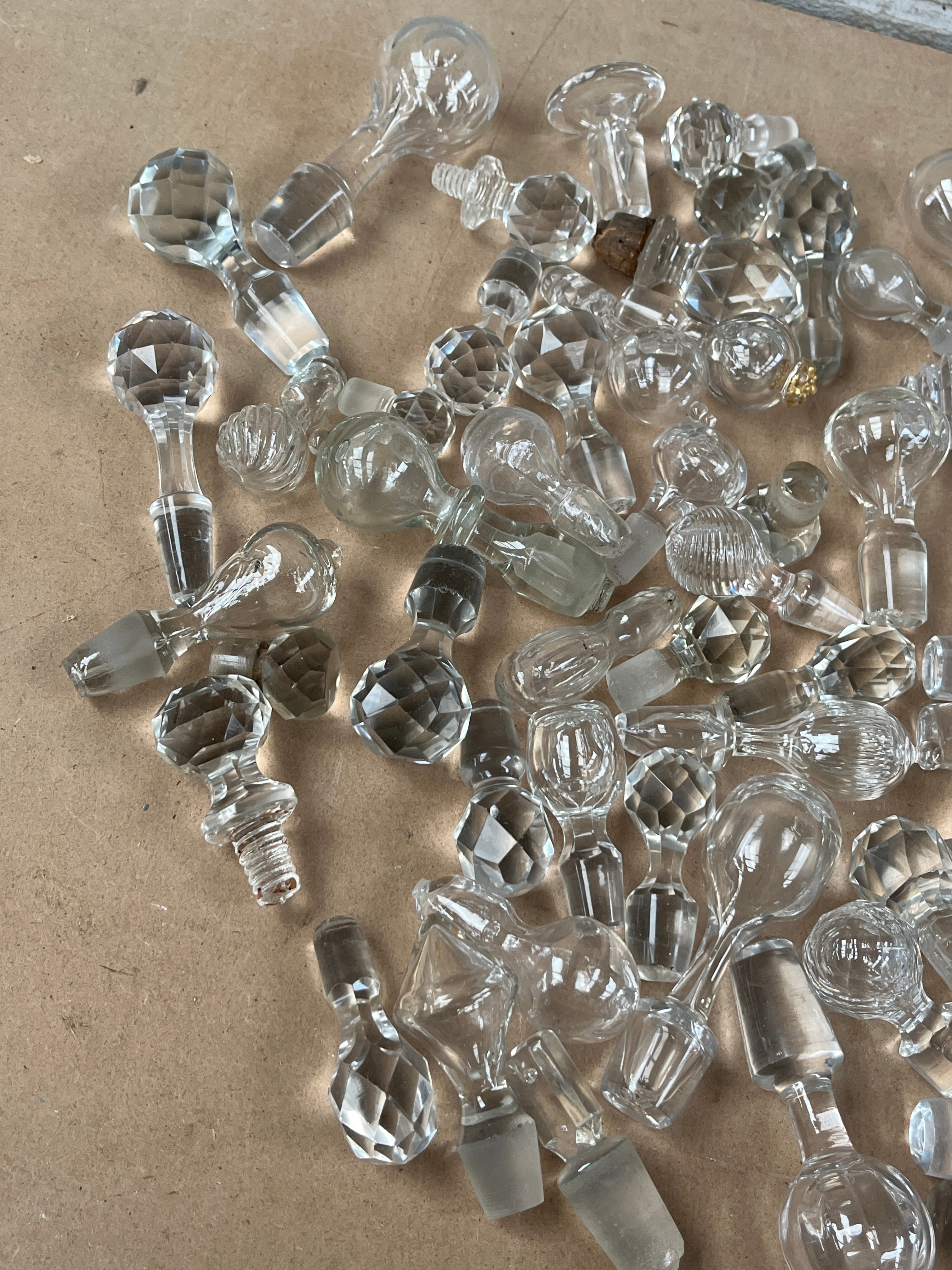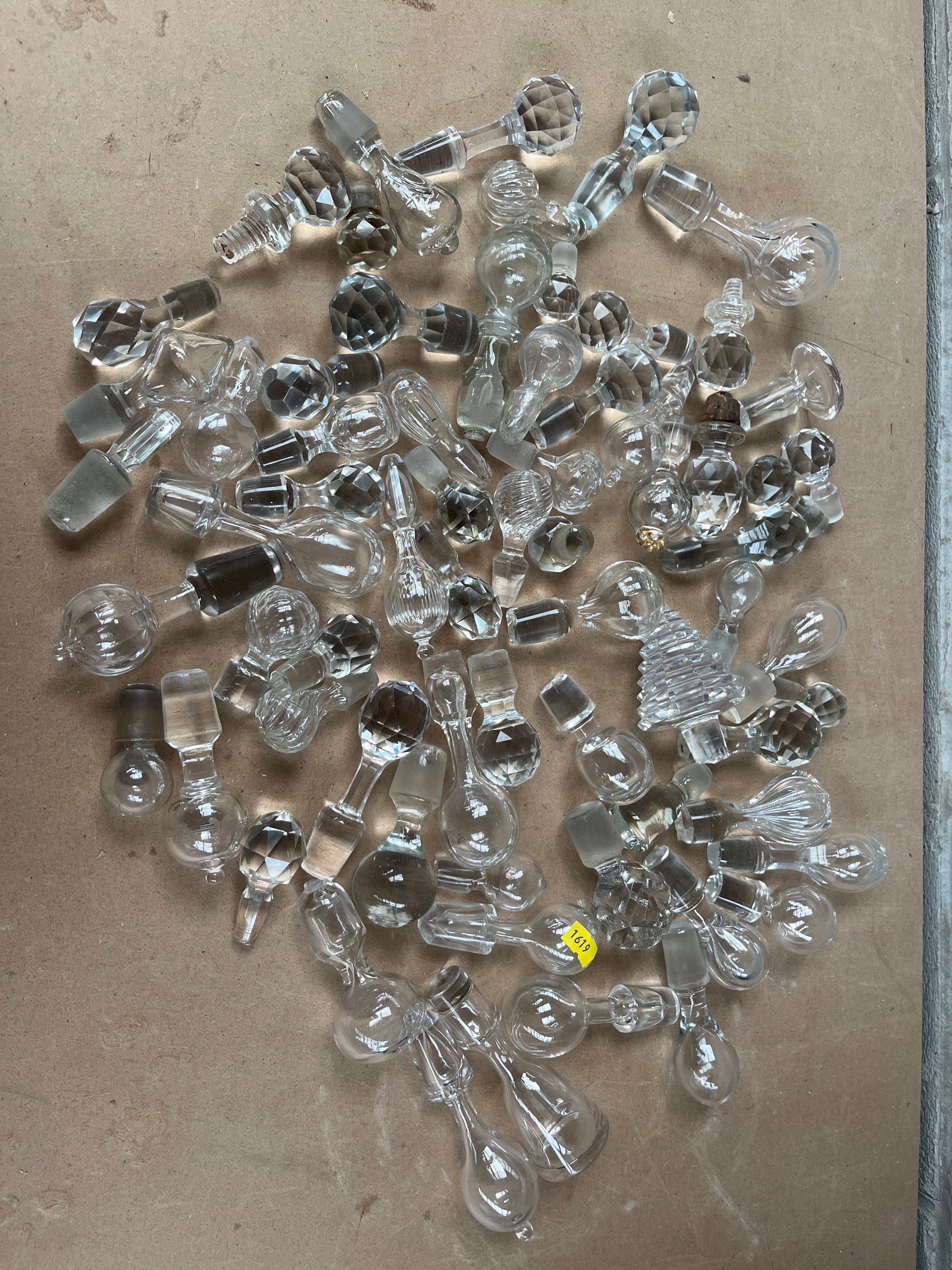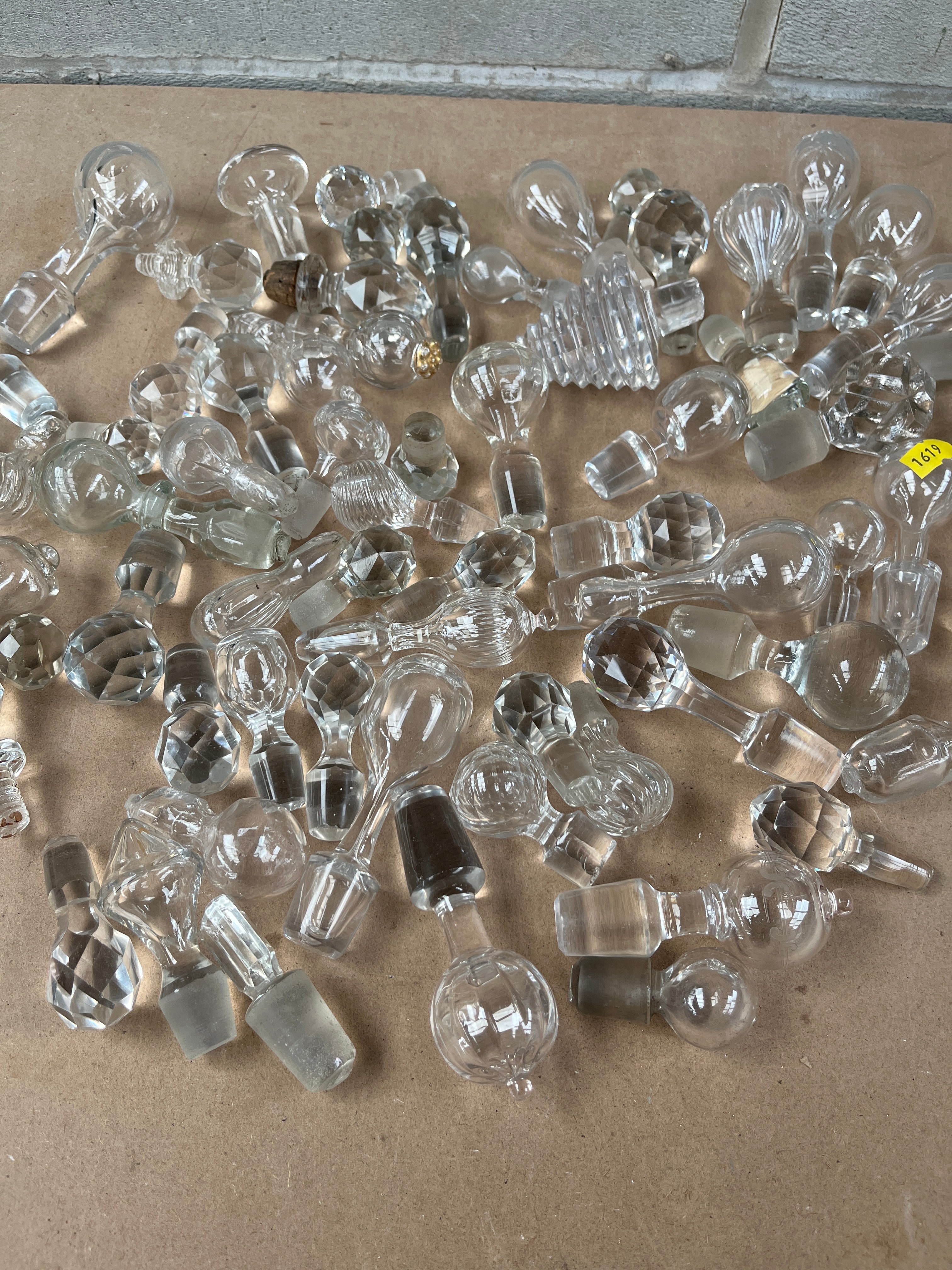 A substantial collection of approximately 70-100 clear glass and crystal bottle or decanter stoppers, displaying a wide variety of designs. Styles range from faceted spherical, pyramidal, and multi-sided forms to smooth, teardrop, mushroom, fluted, and ribbed shapes, suggesting an eclectic assortment accumulated over various periods. The material is predominantly clear glass, with many pieces exhibiting the characteristics of cut crystal due to their faceting and brilliance. Several stoppers feature ground glass shanks, while others retain remnants of cork. A yellow sticker bearing the number “1619” is visible on one stopper.