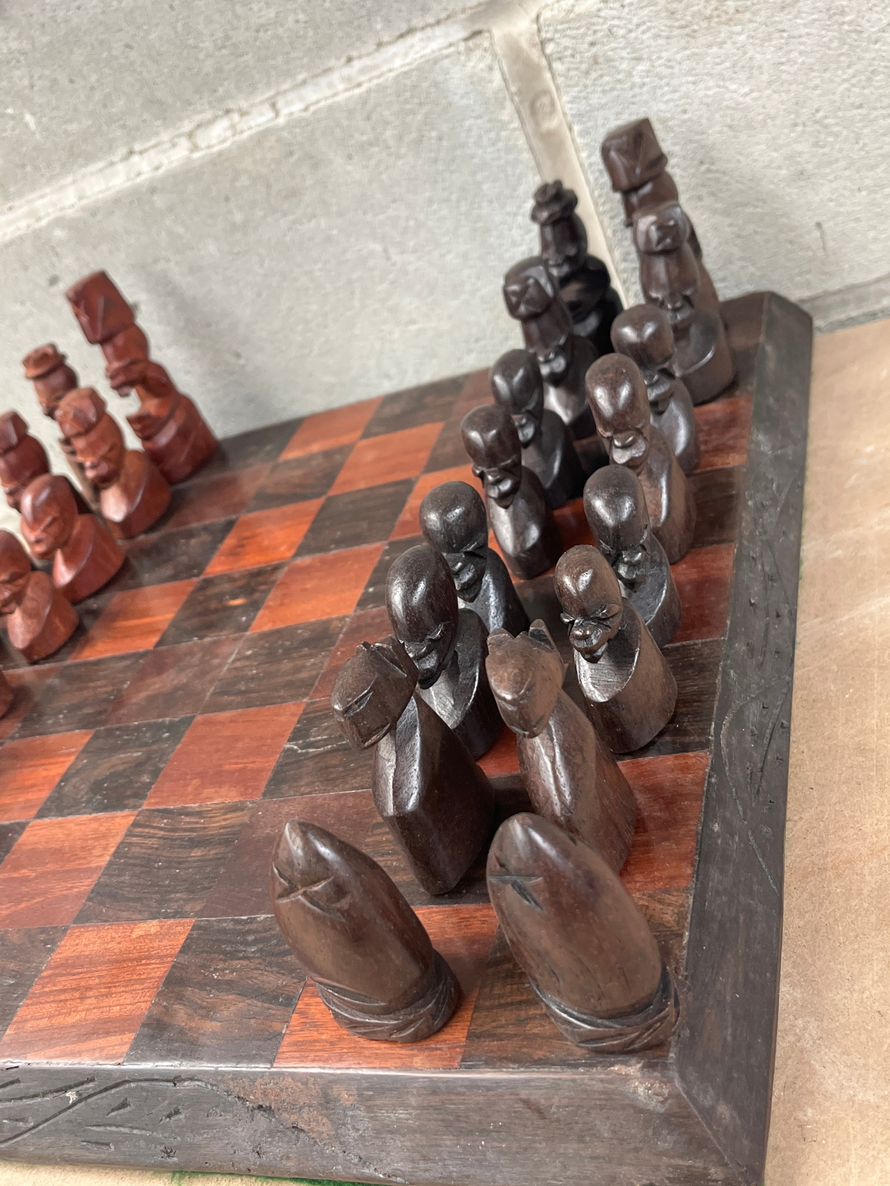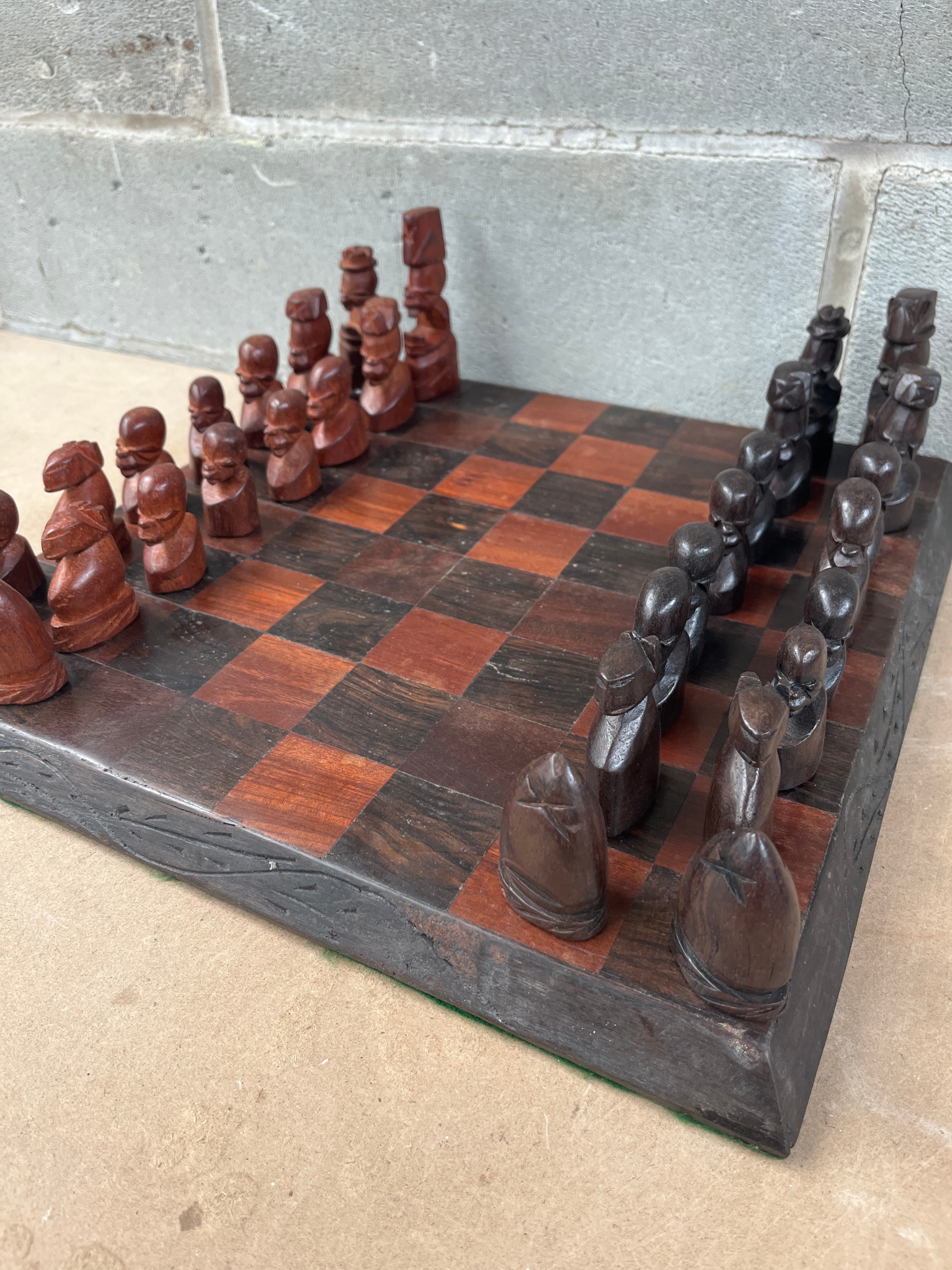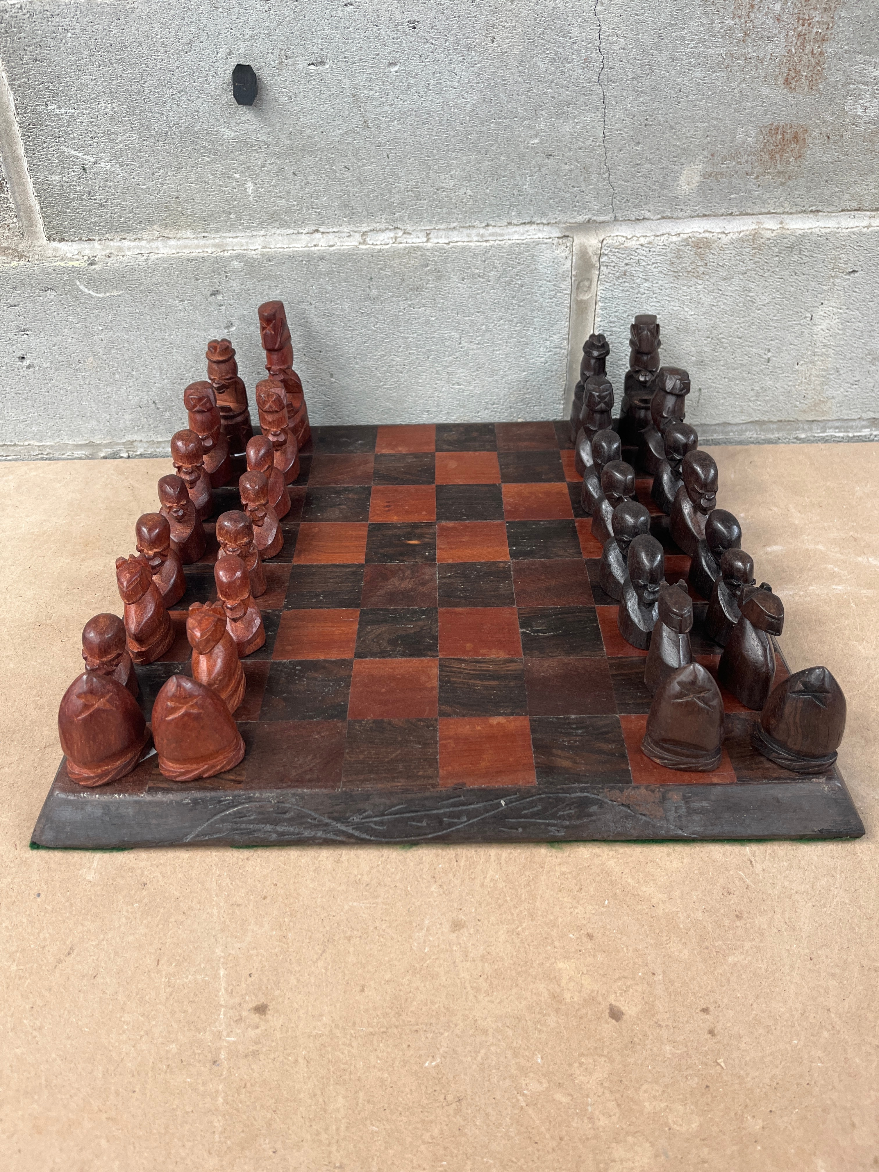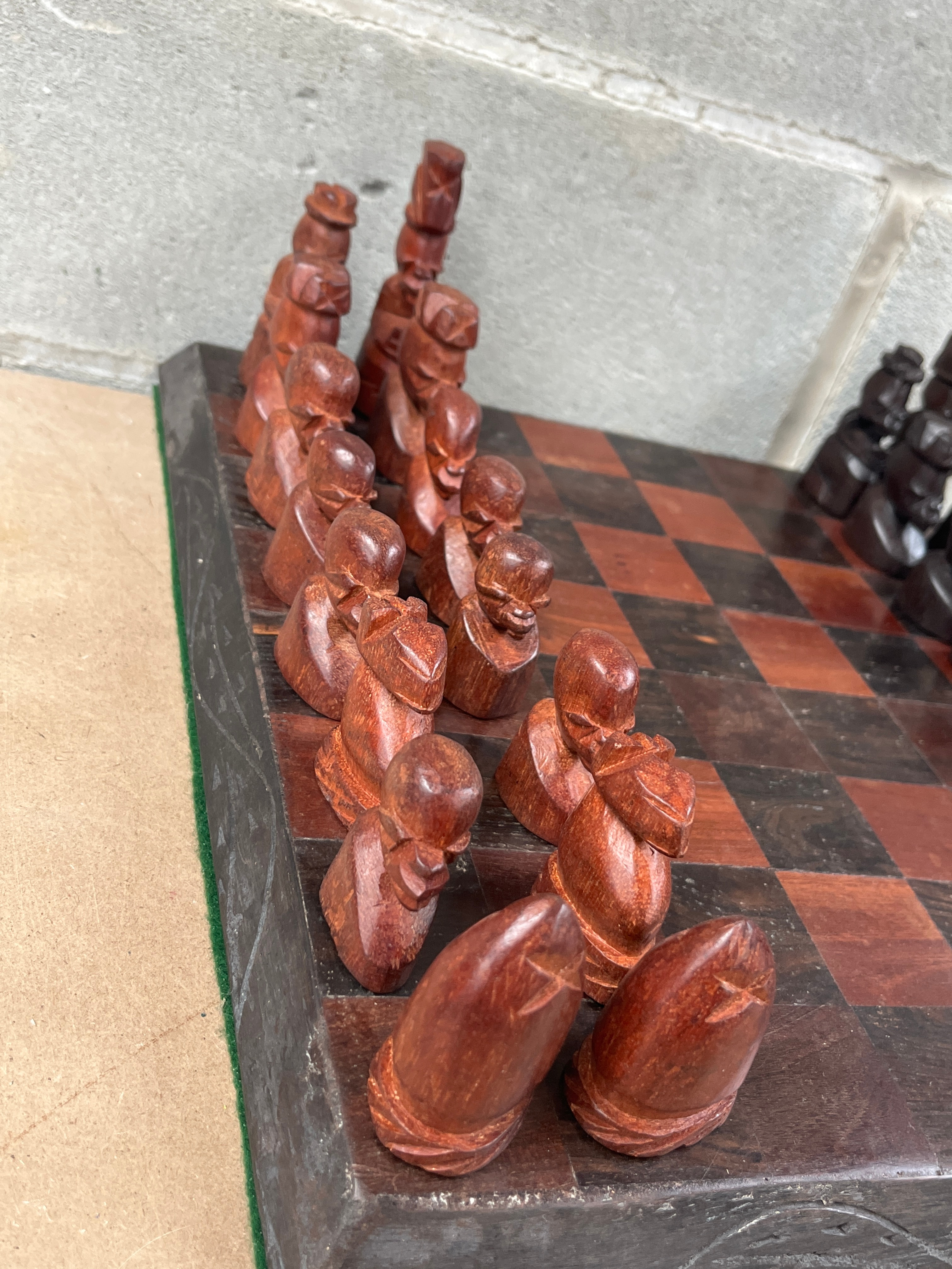 A complete wooden chess set, comprising an inlaid chessboard and two sets of hand-carved figural pieces. The board features contrasting dark and reddish-brown wood squares, surrounded by a dark, carved border, with a green felt-like material visible along the underside edge. The two sets of pieces are crafted from contrasting wood tones, one dark brown and the other reddish-brown, depicting stylized human-like figures in a non-Staunton style. No visible text or markings are present on the board or pieces.