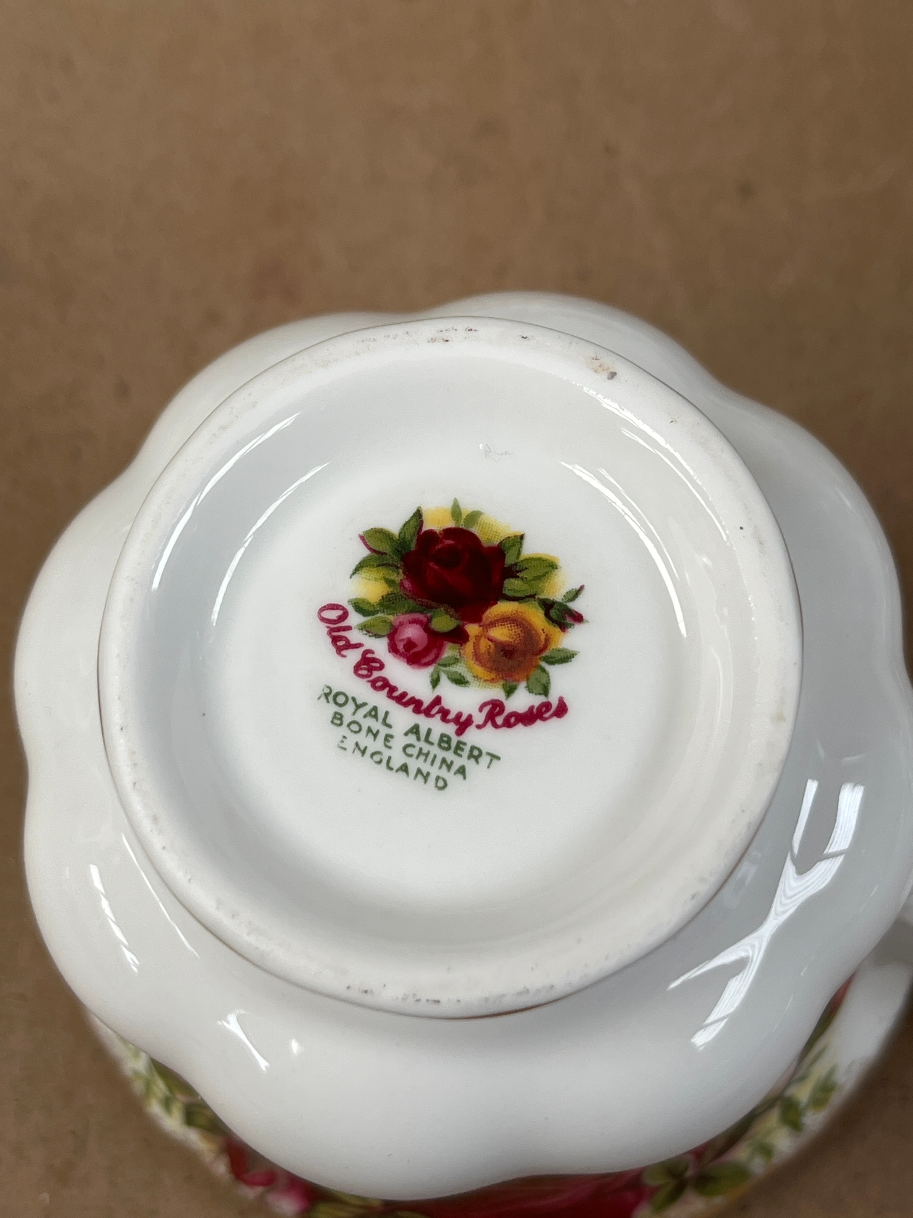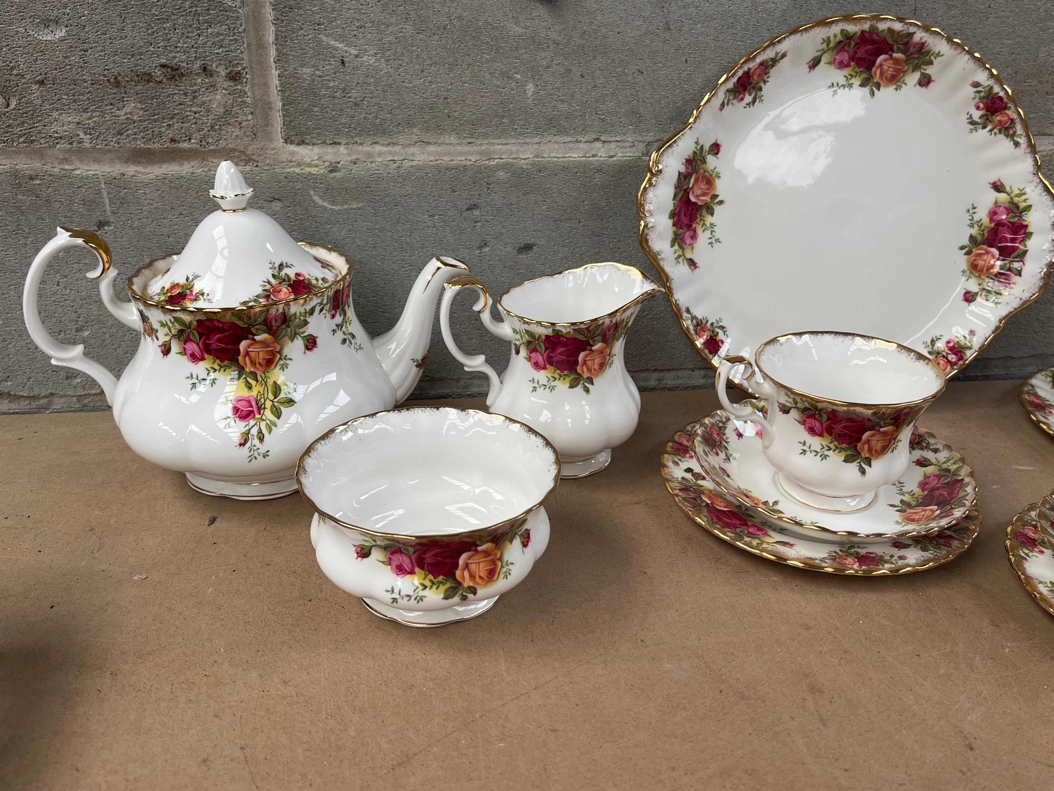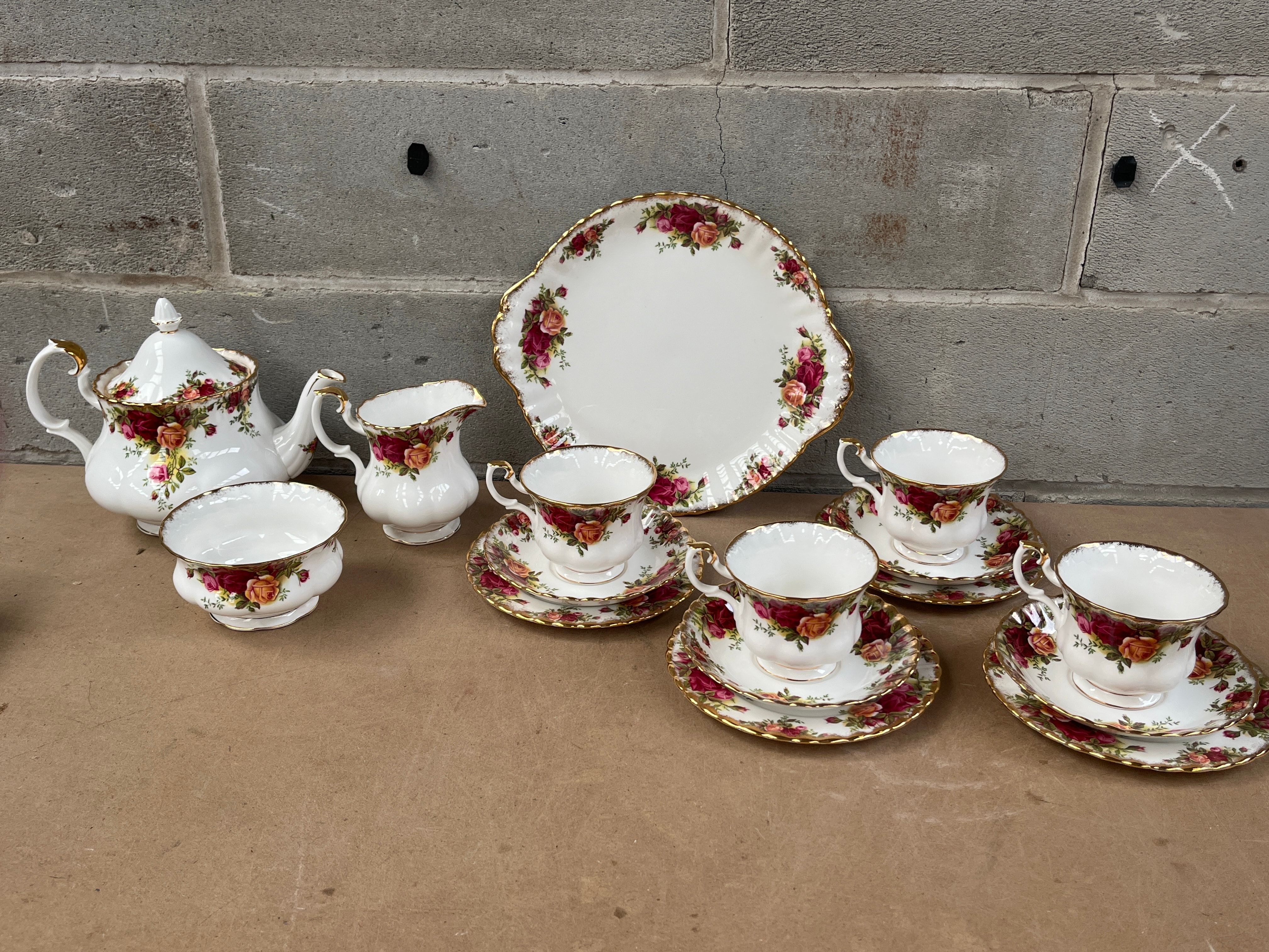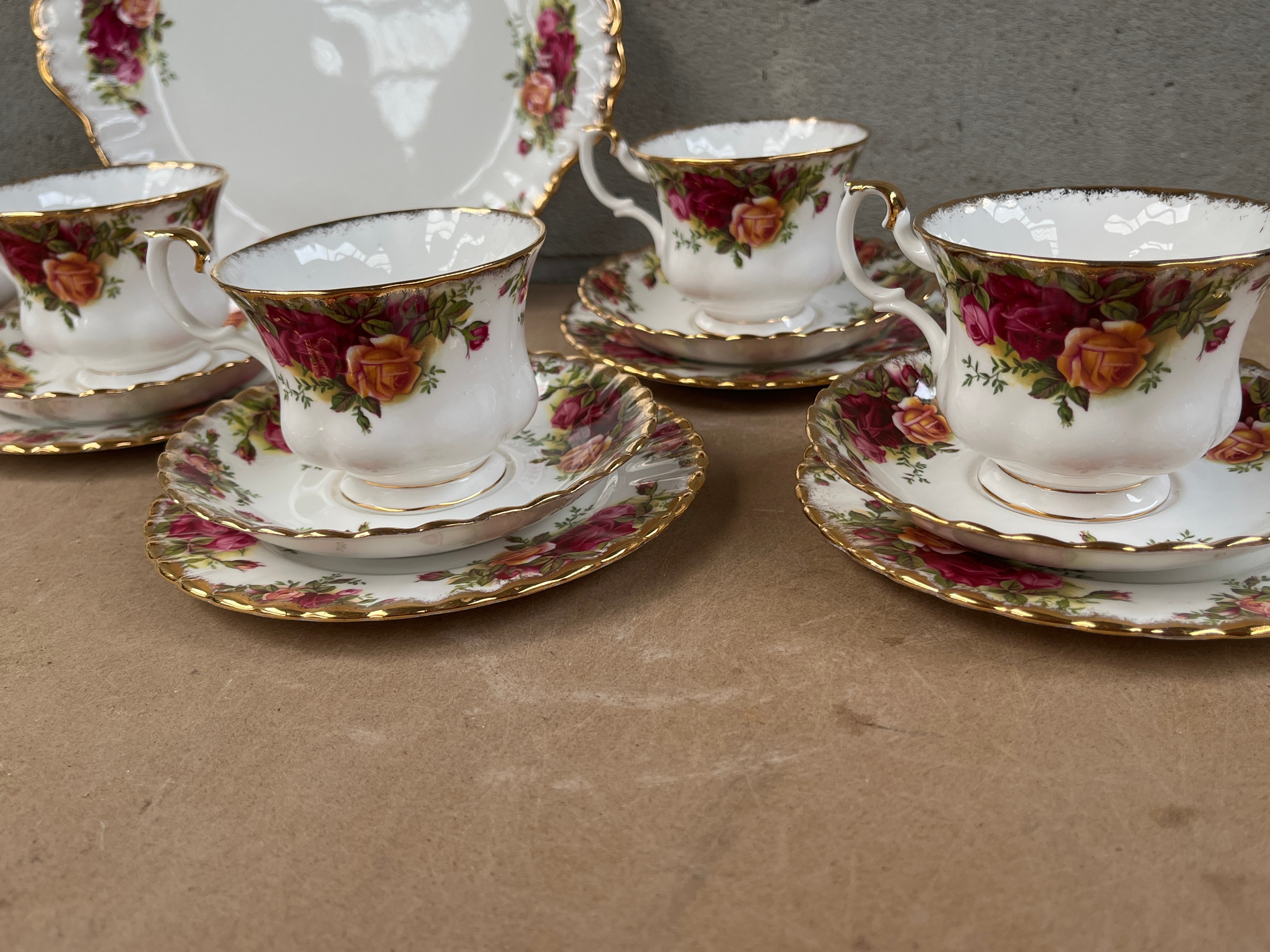 A 16-piece Royal Albert ‘Old Country Roses’ tea set, crafted from white bone china tableware. The set features the prominent “Old Country Roses” floral pattern, displaying clusters of red, pink, and yellow roses against green foliage. The collection includes a lidded teapot, a creamer, an open sugar bowl, four teacups, four saucers, and a large ruffled-edge serving plate. All items are adorned with scalloped rims and extensive gold gilding. A visible backstamp reads “Old Country Roses”, “ROYAL ALBERT BONE CHINA ENGLAND”.