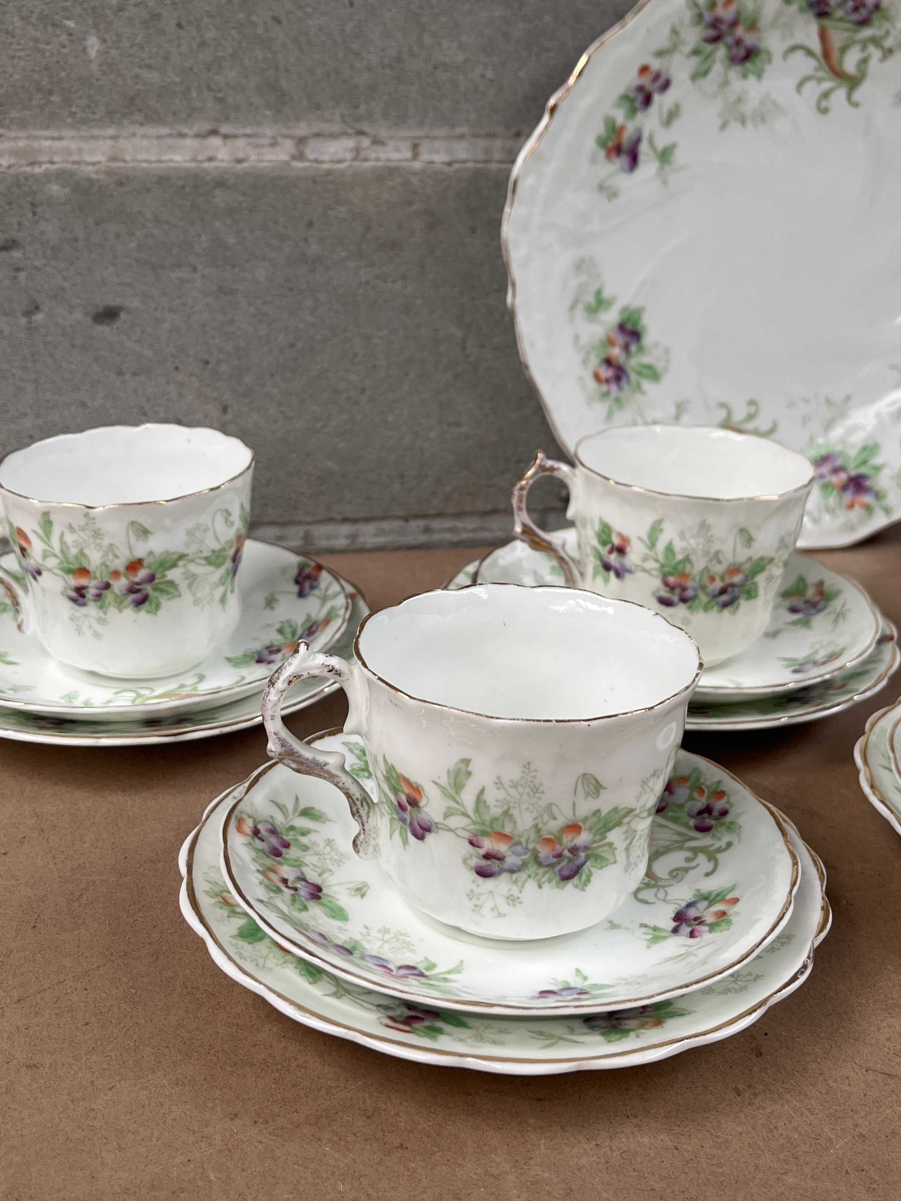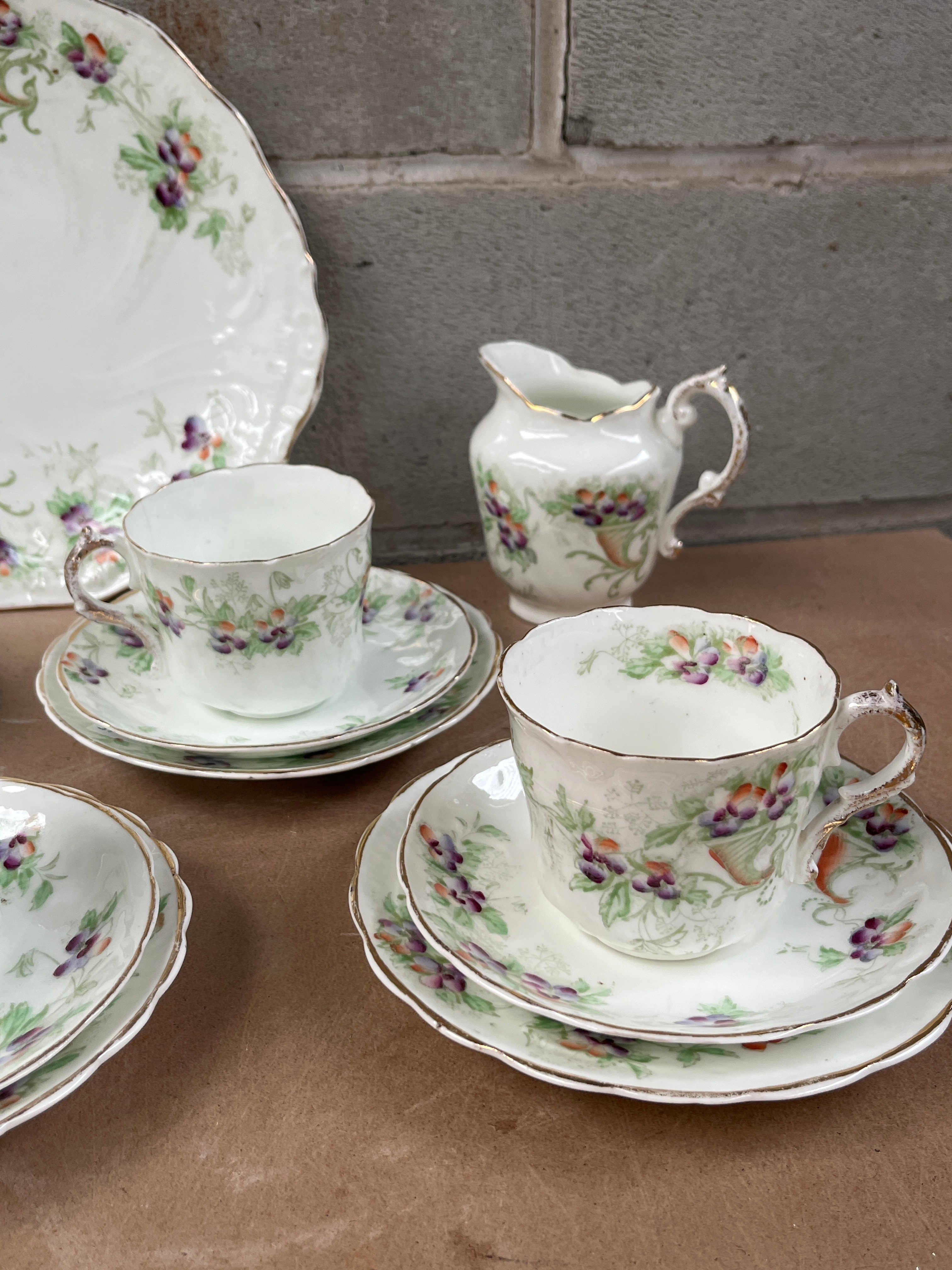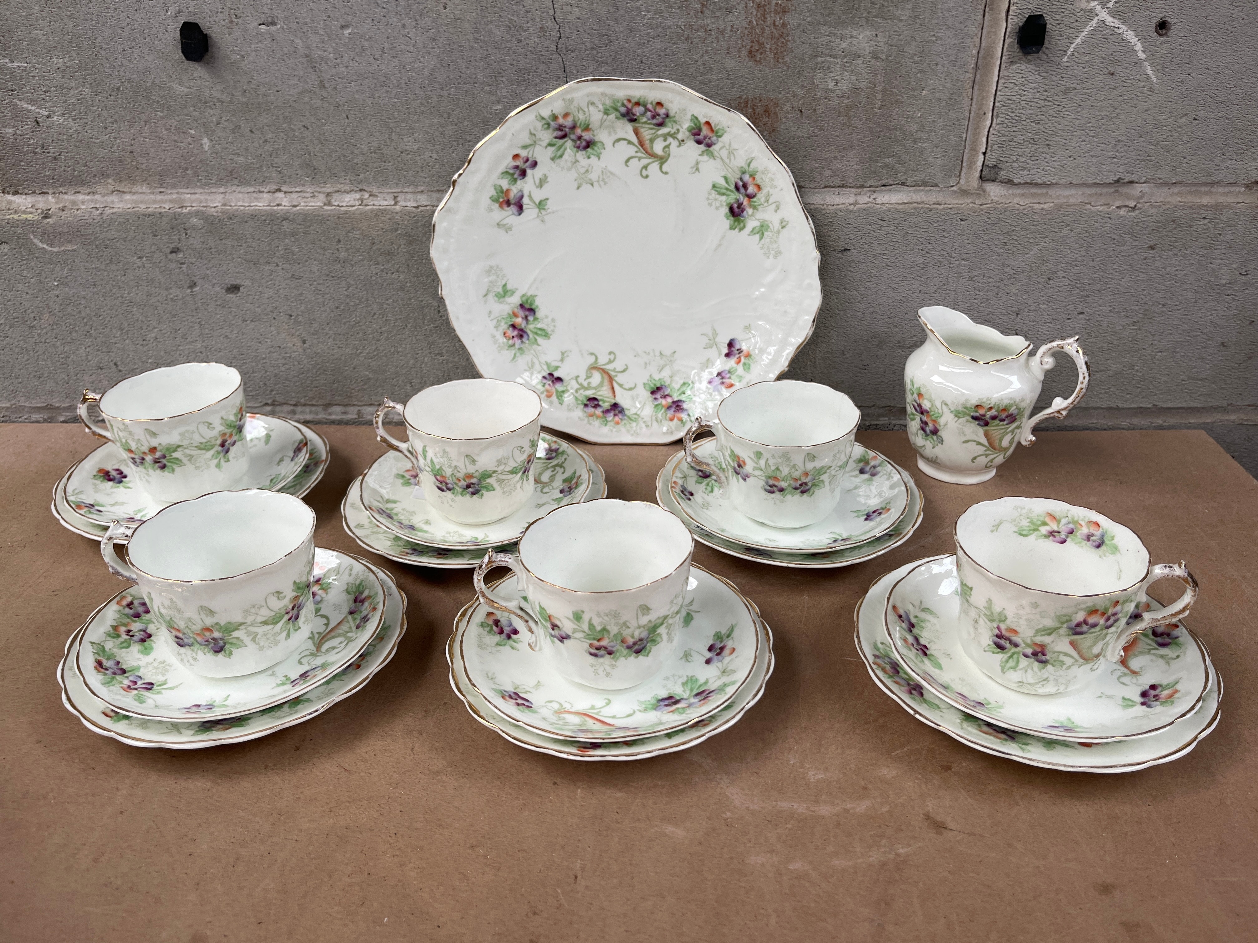 A Royal Albert “Moss Rose” seventeen-piece tea service, comprising five teacups, five saucers, five side plates, one larger scalloped-edge serving plate, and one creamer/milk jug. Each piece features a white ground decorated with a scattered floral pattern of purple and green blossoms and accompanying foliage. Gilt accents are present on all rims and cup/creamer handles. The style is traditional/vintage. No manufacturer’s marks or text are discernible.