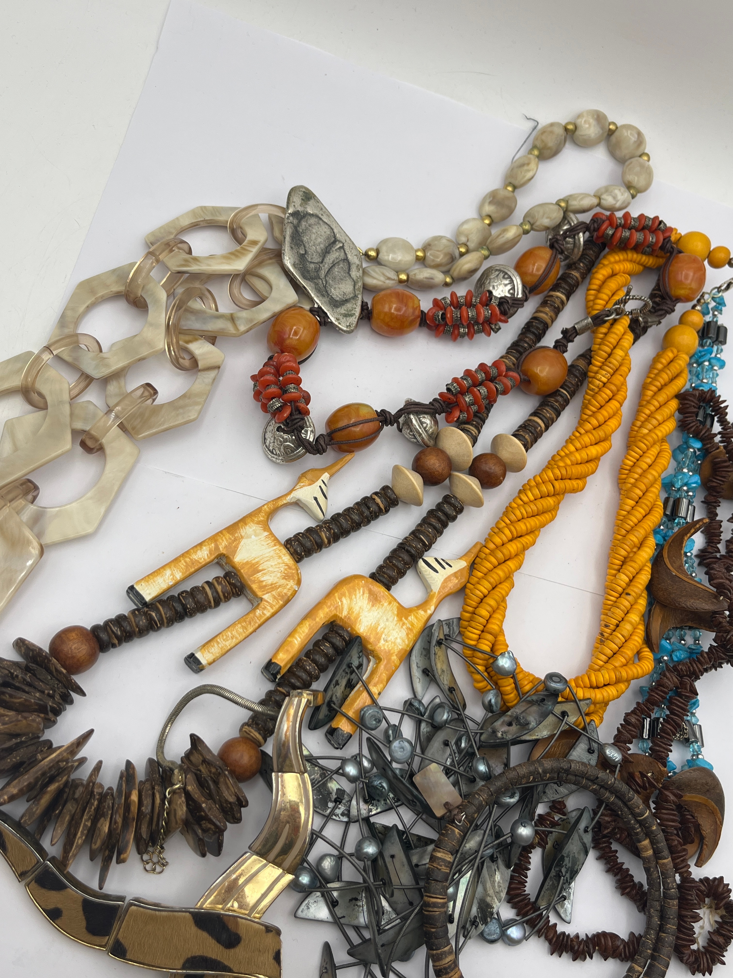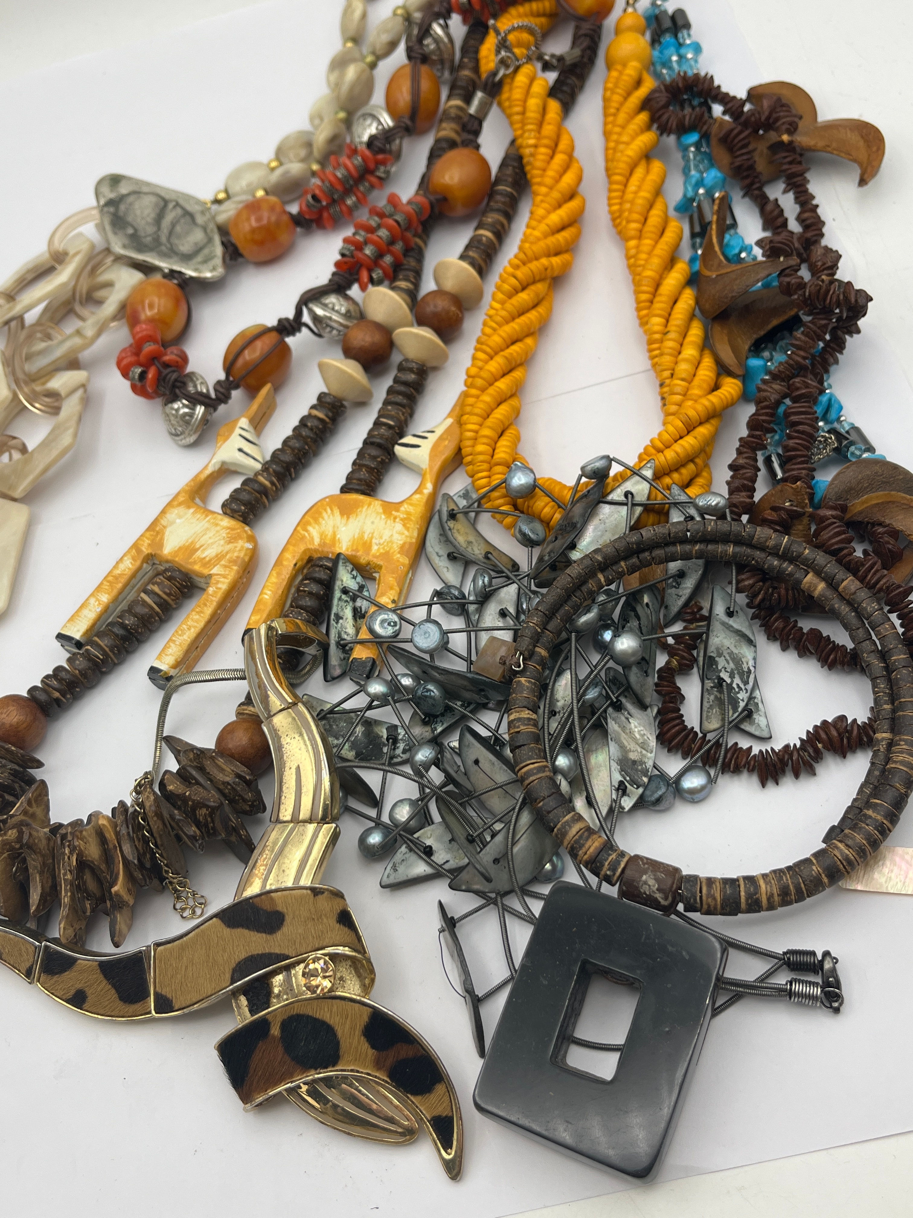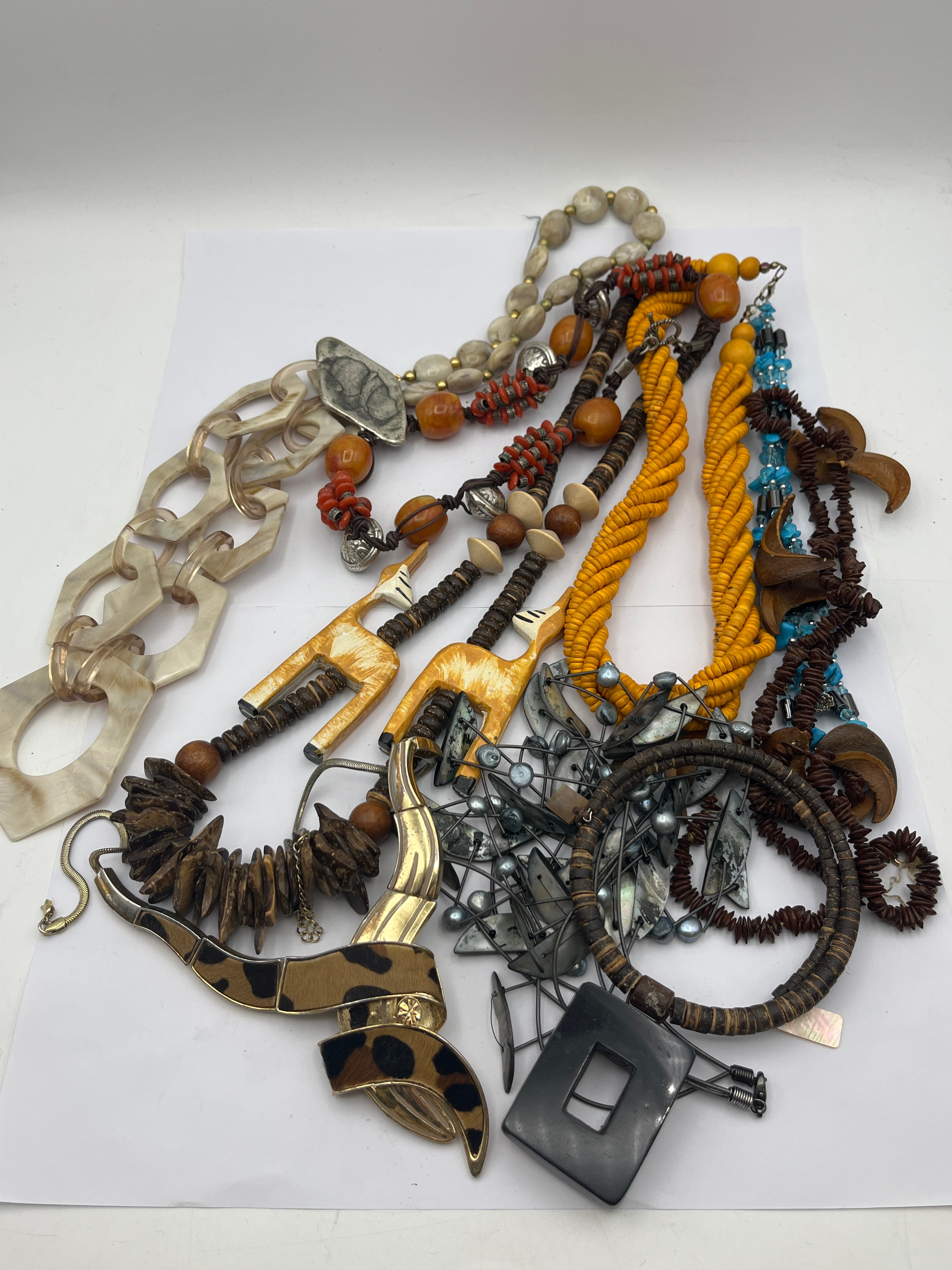 This lot presents a diverse collection of fashion and costume jewelry, primarily necklaces and bracelets, exhibiting a range of styles from ethnic-inspired and organic designs to contemporary chunky and minimalist forms. Materials include natural elements such as wood, various types of shell (mother-of-pearl, dark textured shell), and carved bone or resin (notably, giraffe pendants), alongside man-made components like acrylic or resin beads (opaque cream, amber-toned, black, turquoise-like), braided textile cord (yellow), and base metal findings. Specific pieces include a necklace with large cream-colored acrylic links, multiple multi-strand beaded necklaces, two necklaces featuring carved giraffe-head pendants, and a wide cuff bracelet adorned with leopard-print fabric and a metallic accent featuring an unidentifiable stylized double-G motif.