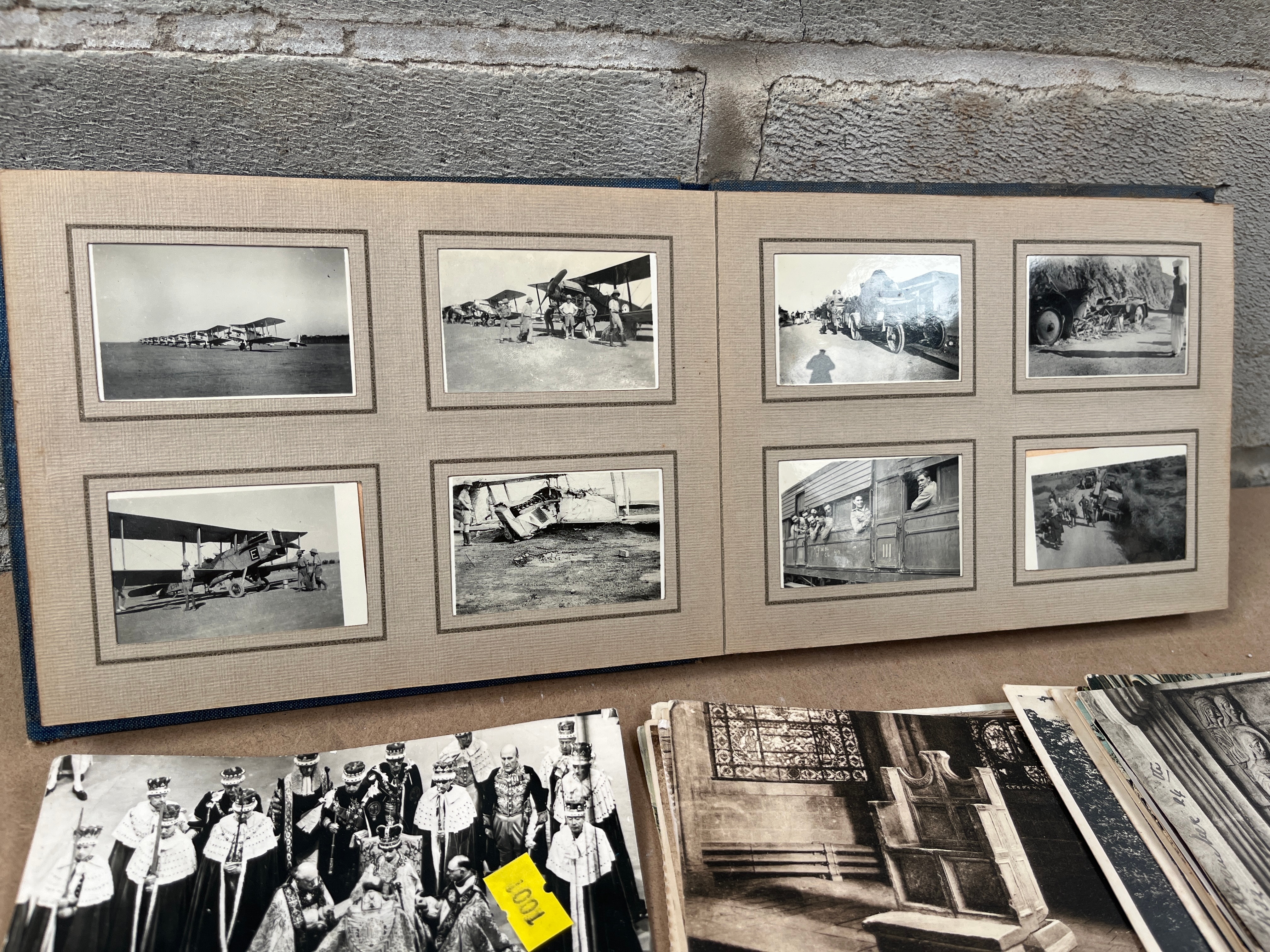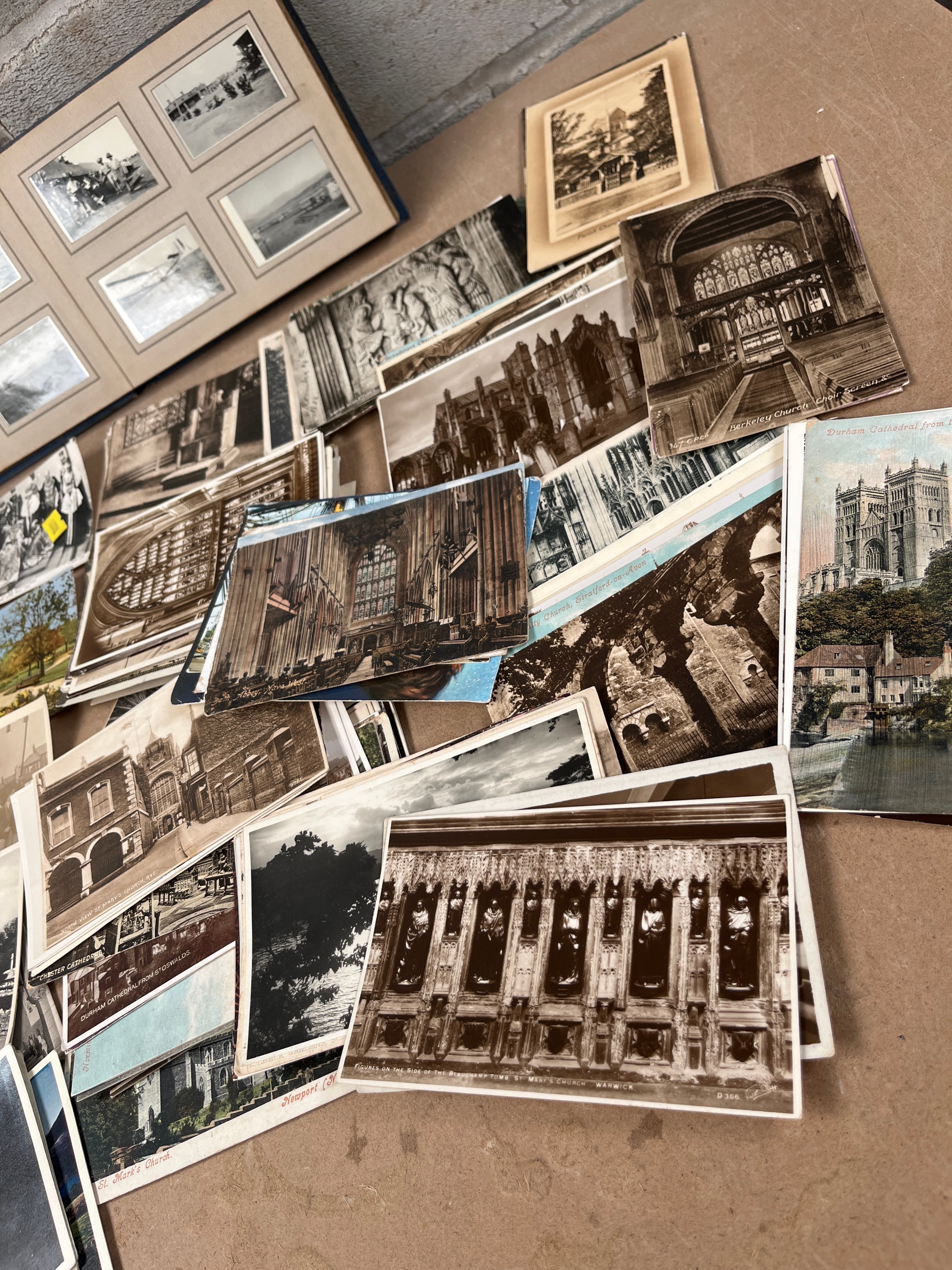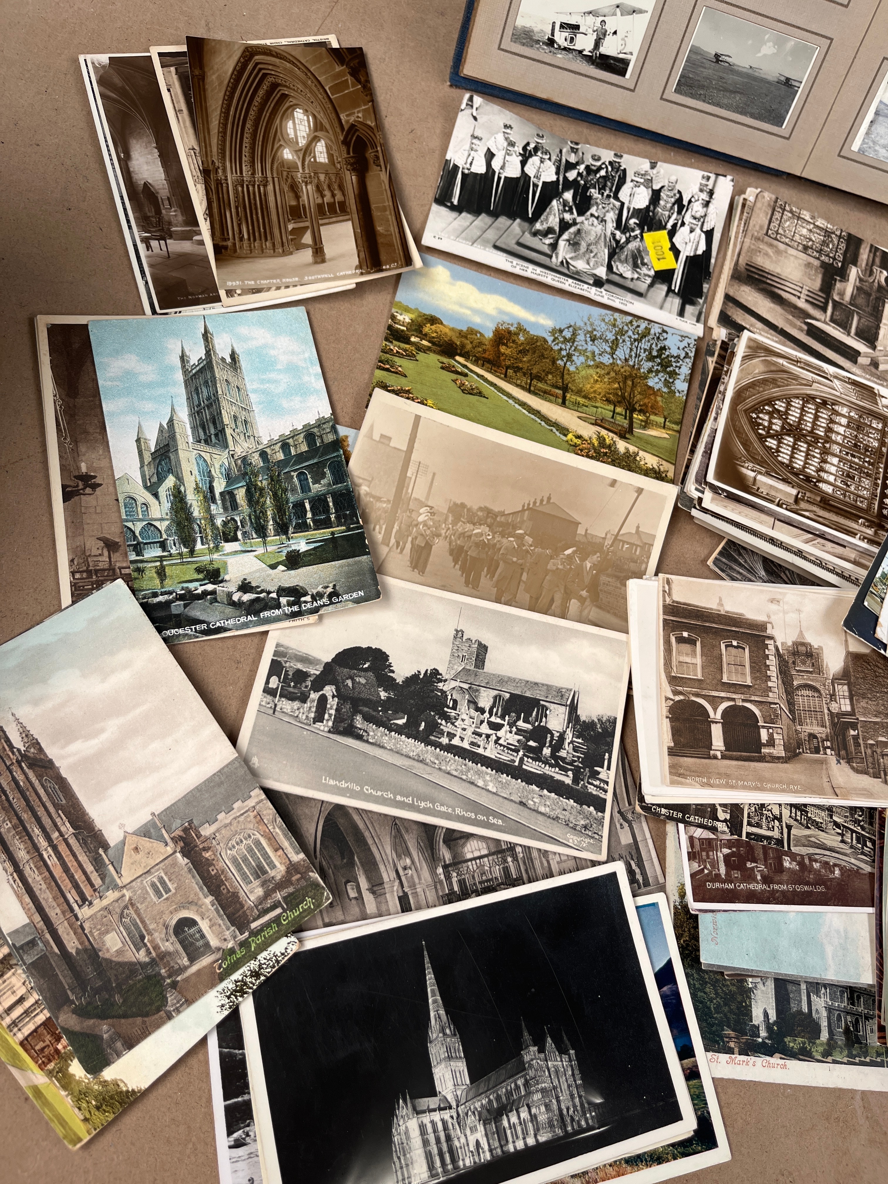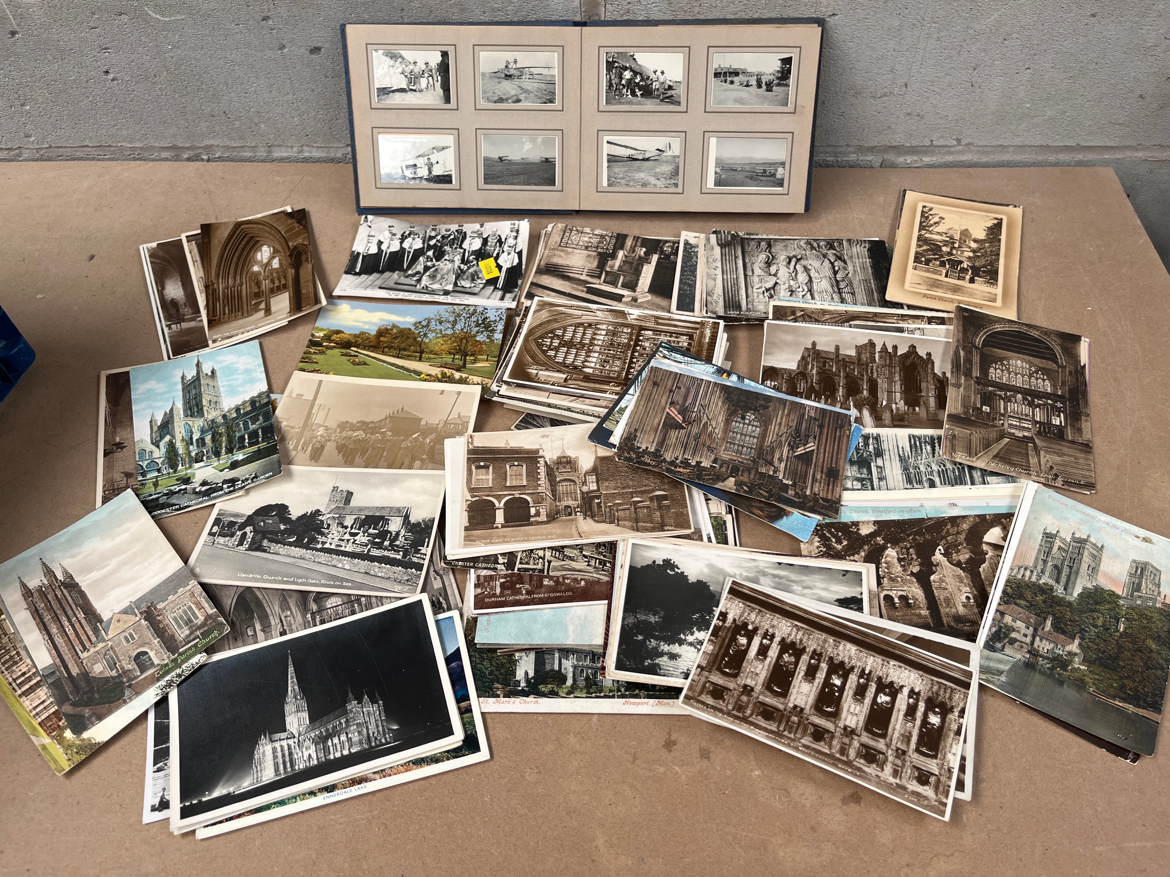 A substantial collection of vintage postcards and photographic prints, accompanied by a hardbound photo album. The postcards, primarily sepia-toned, black and white, and some hand-colored, depict a wide range of British landmarks, including numerous cathedrals such as Gloucester, Durham, Salisbury, and Winchester, along with historic buildings and street scenes. Visible captions include “Gloucester Cathedral from Dean’s Garden” and “Llandudno Church and Llyr Gate, Wales, on Sea.” The album contains a series of black and white photographs featuring early 20th-century subjects such as biplanes, early motor vehicles, and formal group gatherings. Notable captions within the album include “The Coronation Procession (The Indian Princes)” and a reference to “The Queen’s Visit, June 1913,” firmly dating the collection to the early to mid-20th century. The items are composed of period paper and cardstock for the prints and a fabric-covered board for the album.