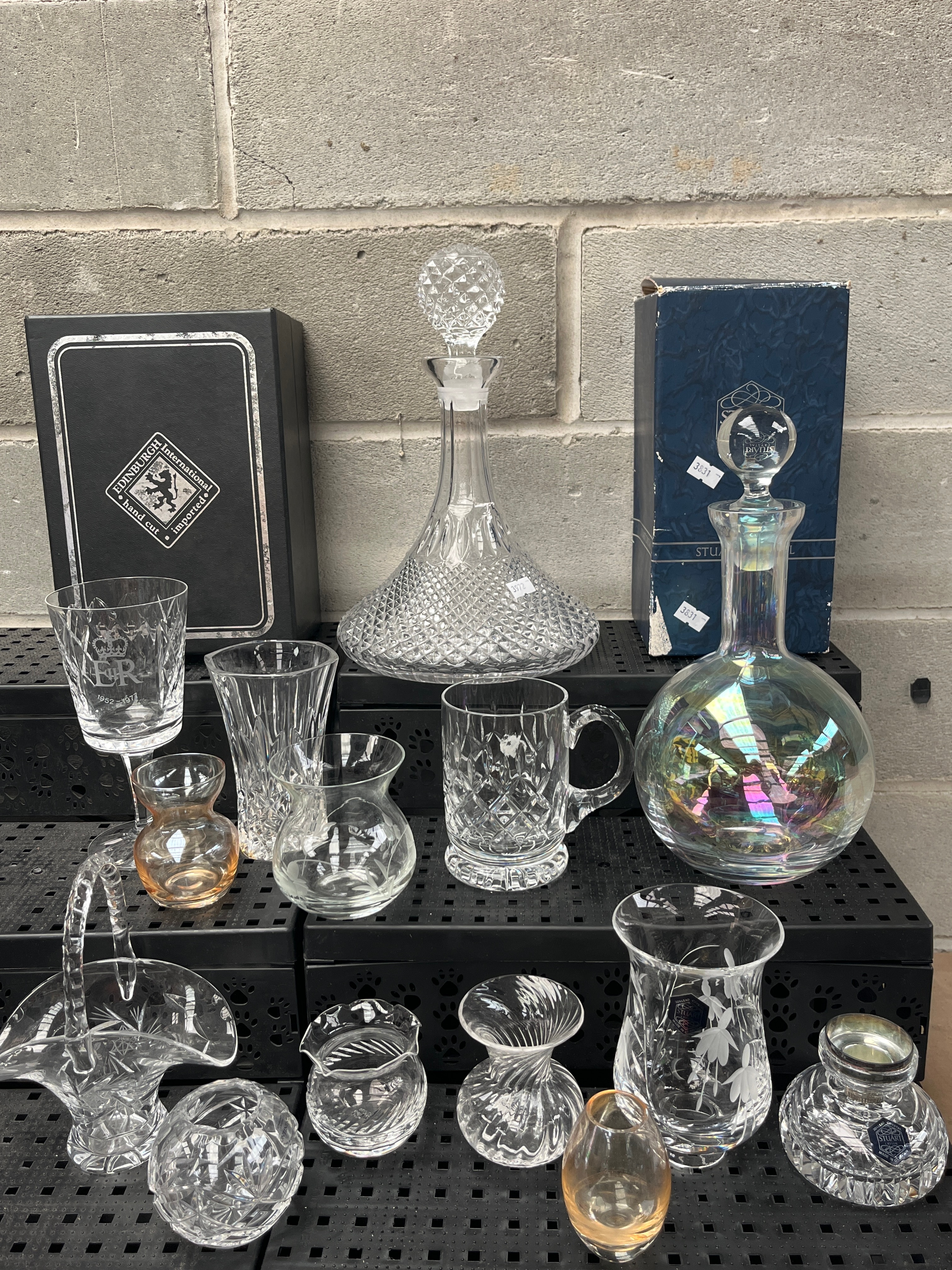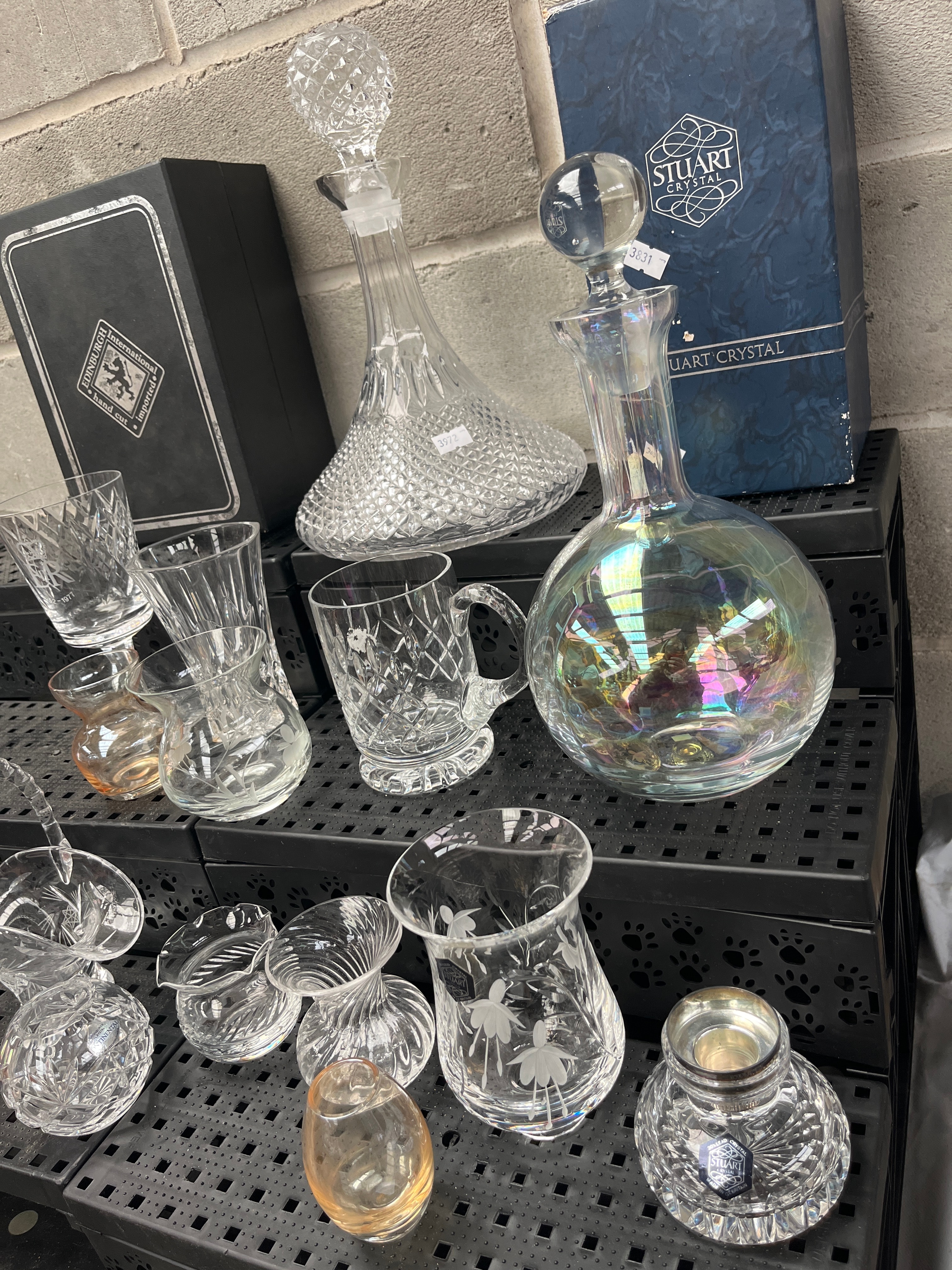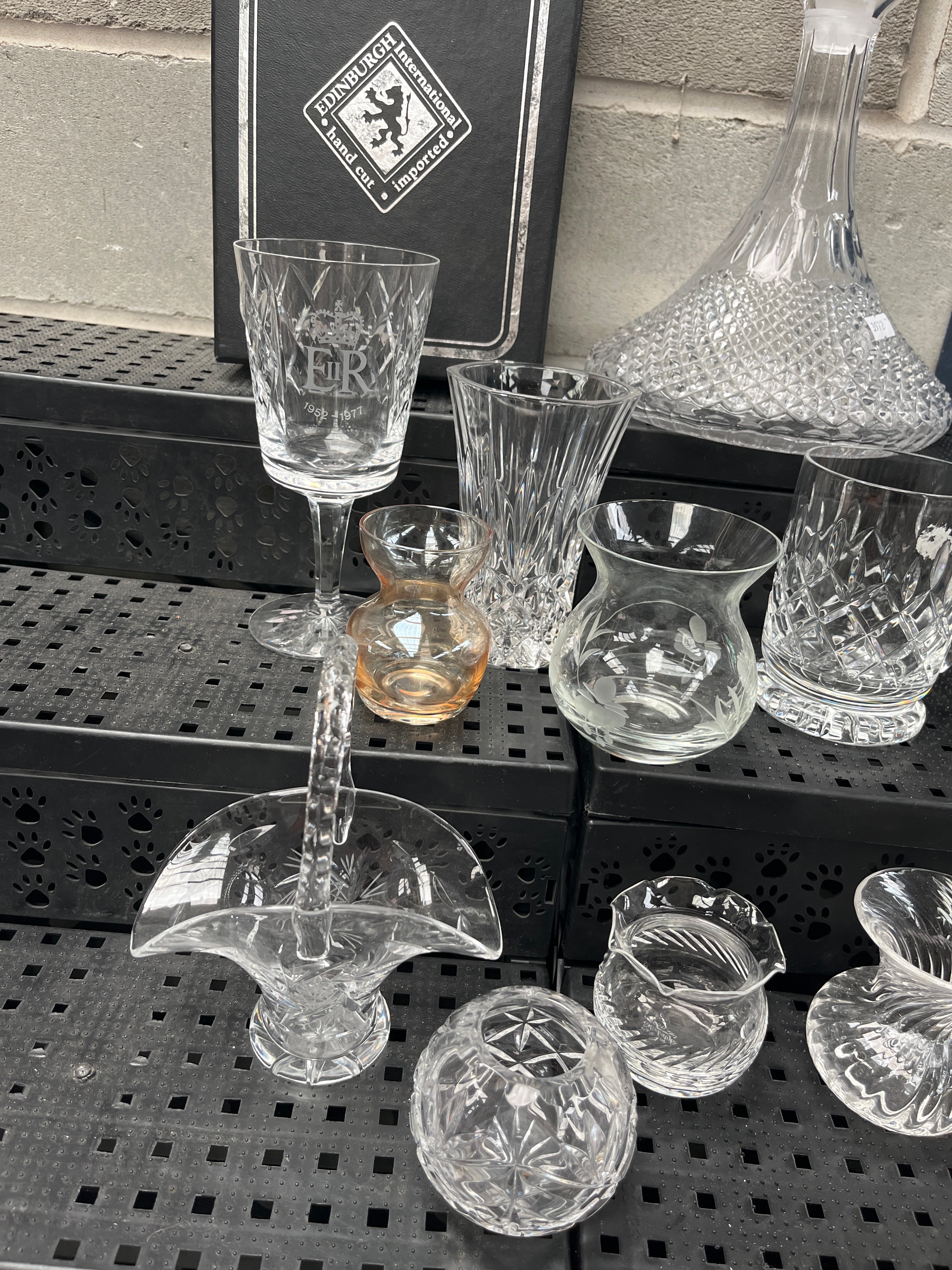 A varied collection of approximately eighteen pieces of clear and cut glassware, likely lead crystal. This group includes a diamond-cut decanter with a faceted stopper, identified through web intelligence as a ‘Diamond Cut Ships Decanter’, alongside an iridescent and globular decanter with a spherical stopper. The collection further comprises several tumblers, vases, handled mugs, a basket, and various smaller decorative items. Visible branding includes ‘STUART CRYSTAL’ on a blue box and ‘EDINBURGH International hand cut Imported’ with a lion rampant crest on a black box. A stemmed goblet is etched ‘ER 1953-1977’. Etched floral and geometric patterns are present on some pieces, and small stickers indicate ‘MADE IN SLOVAKIA’ and ‘MADE IN ITALY’ on select items.