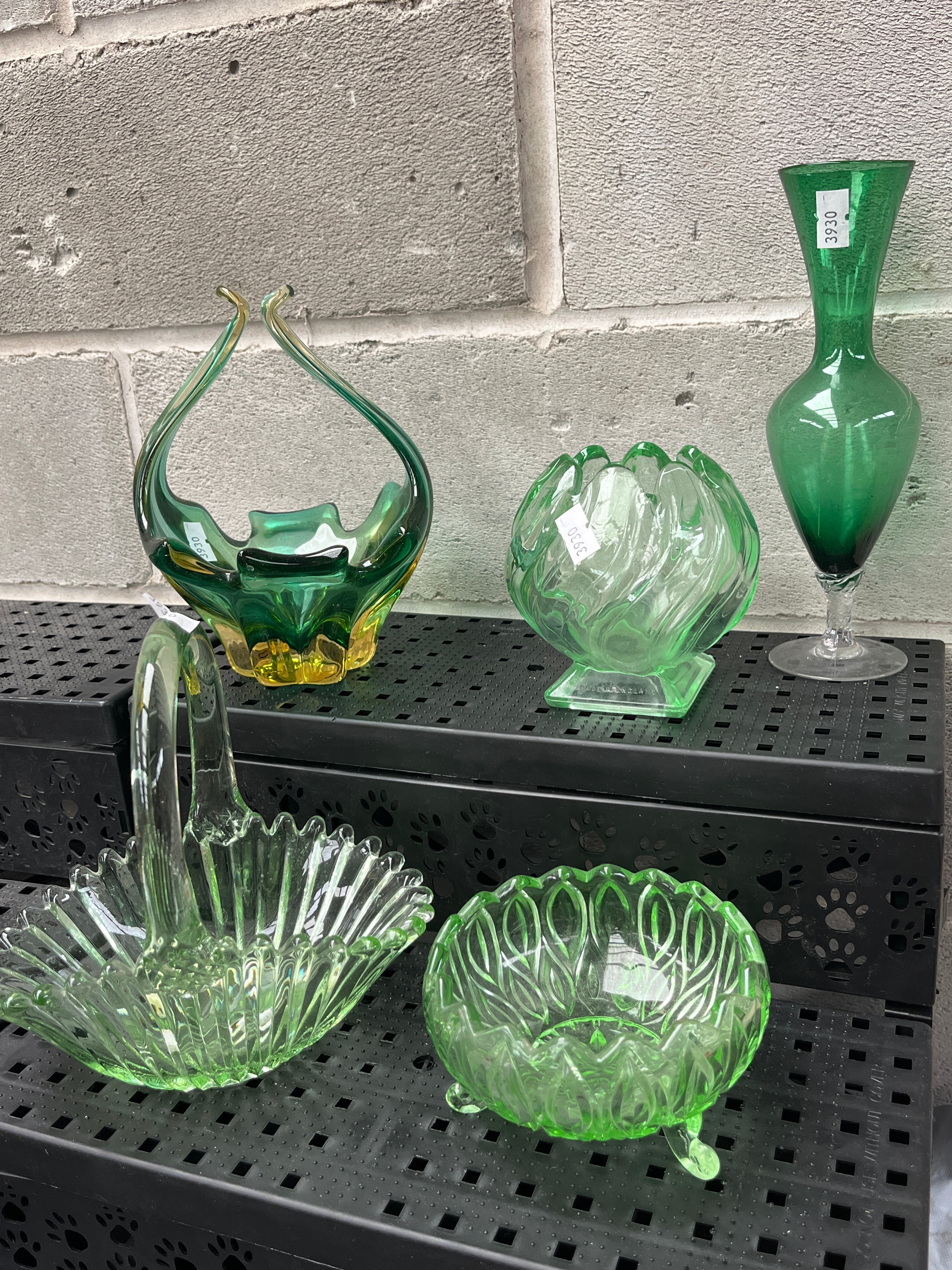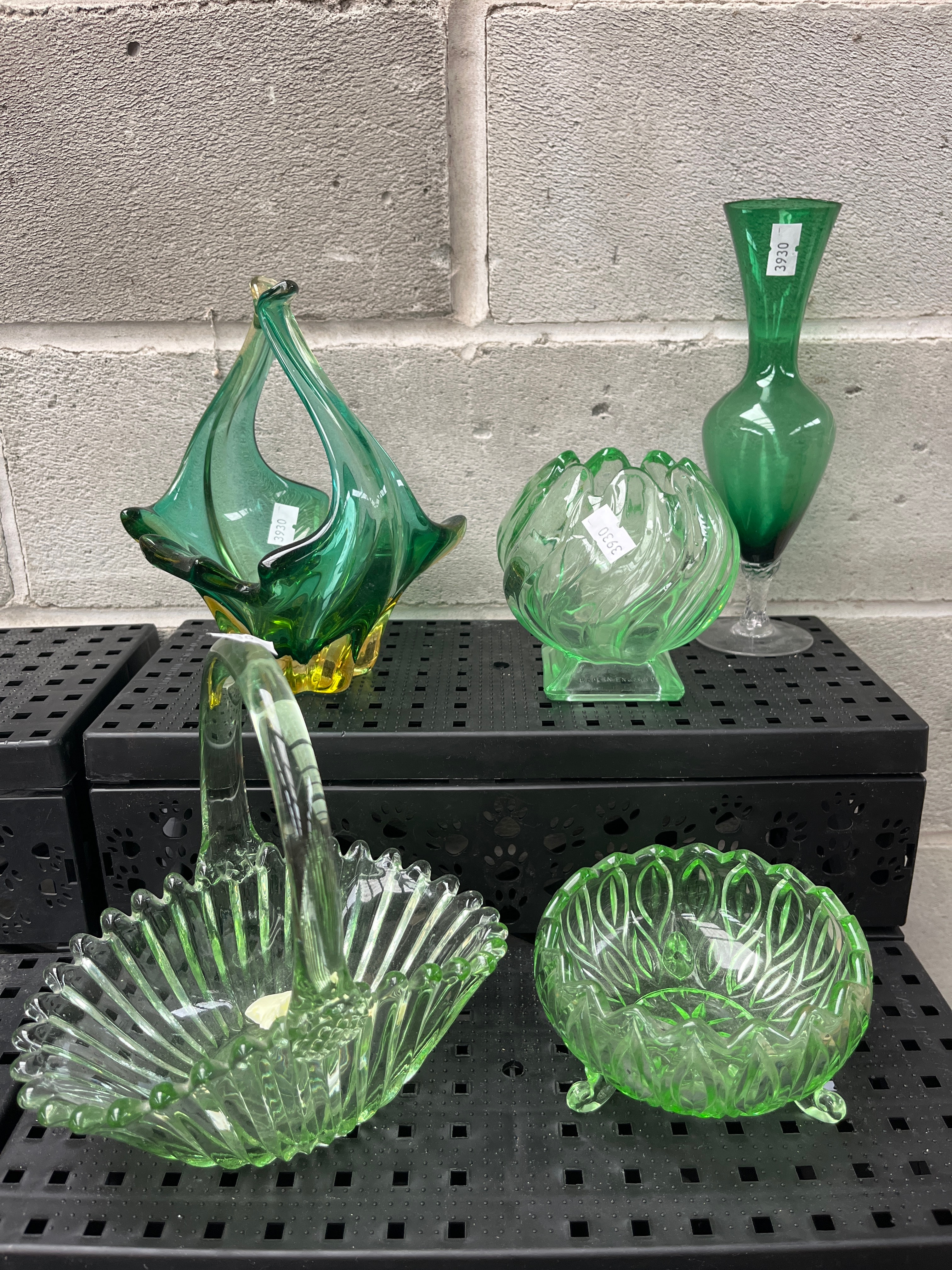 A Fenton Green Vulcan Basket with a twisted handle, featuring a ruffled edge and radiating ribbed pattern. Also included are a dark green and yellow/amber art glass vase or basket with an organic, looping form; a light green scalloped bowl or dish on a square base, bearing a ‘895’ sticker; a tall, slender dark green vase on a clear stemmed foot, bearing a ‘3930’ sticker; and a footed light green bowl with a scalloped rim and molded leaf-like pattern. The lighter green pieces display a distinctive hue often associated with Vaseline or uranium glass.