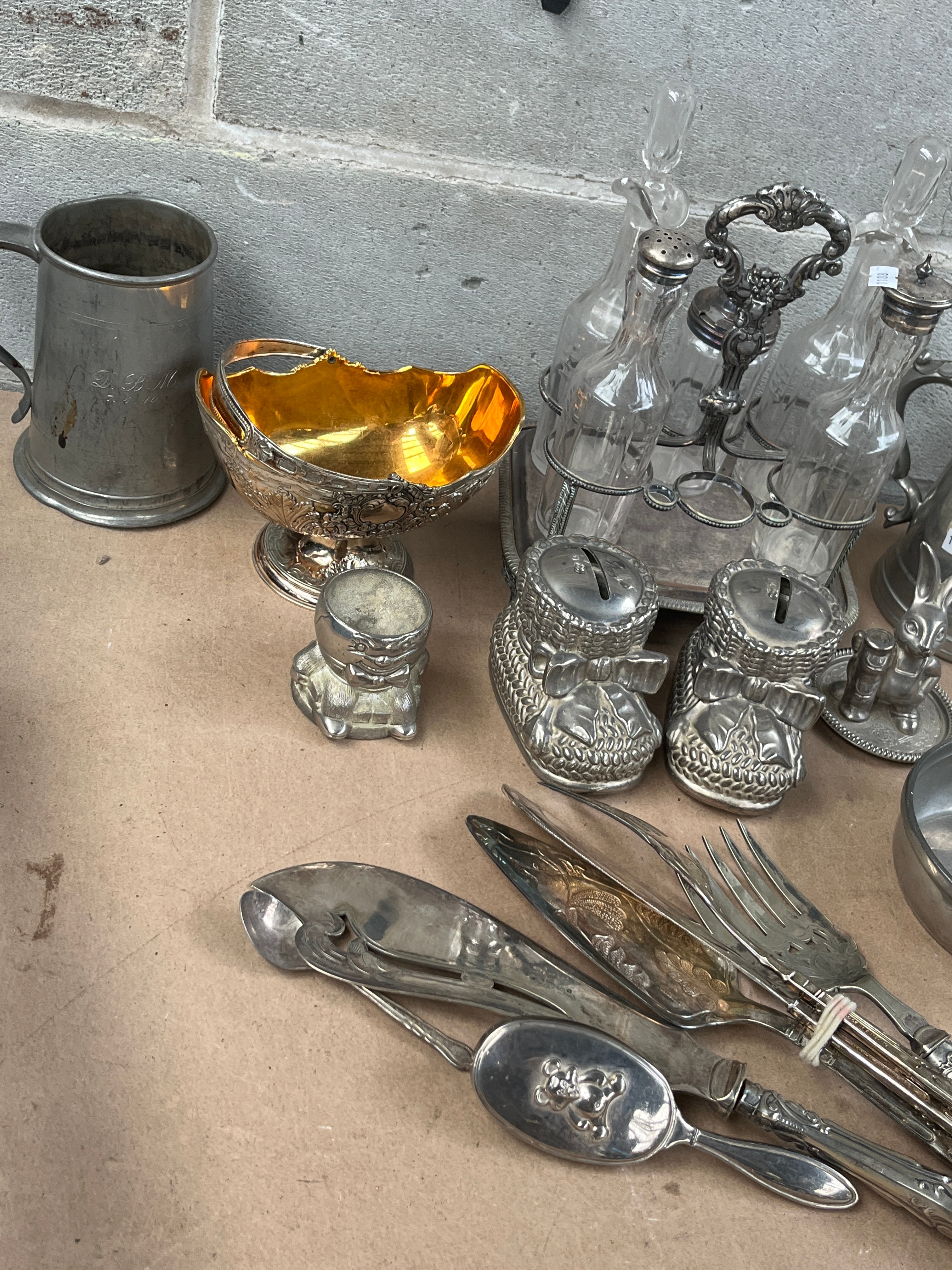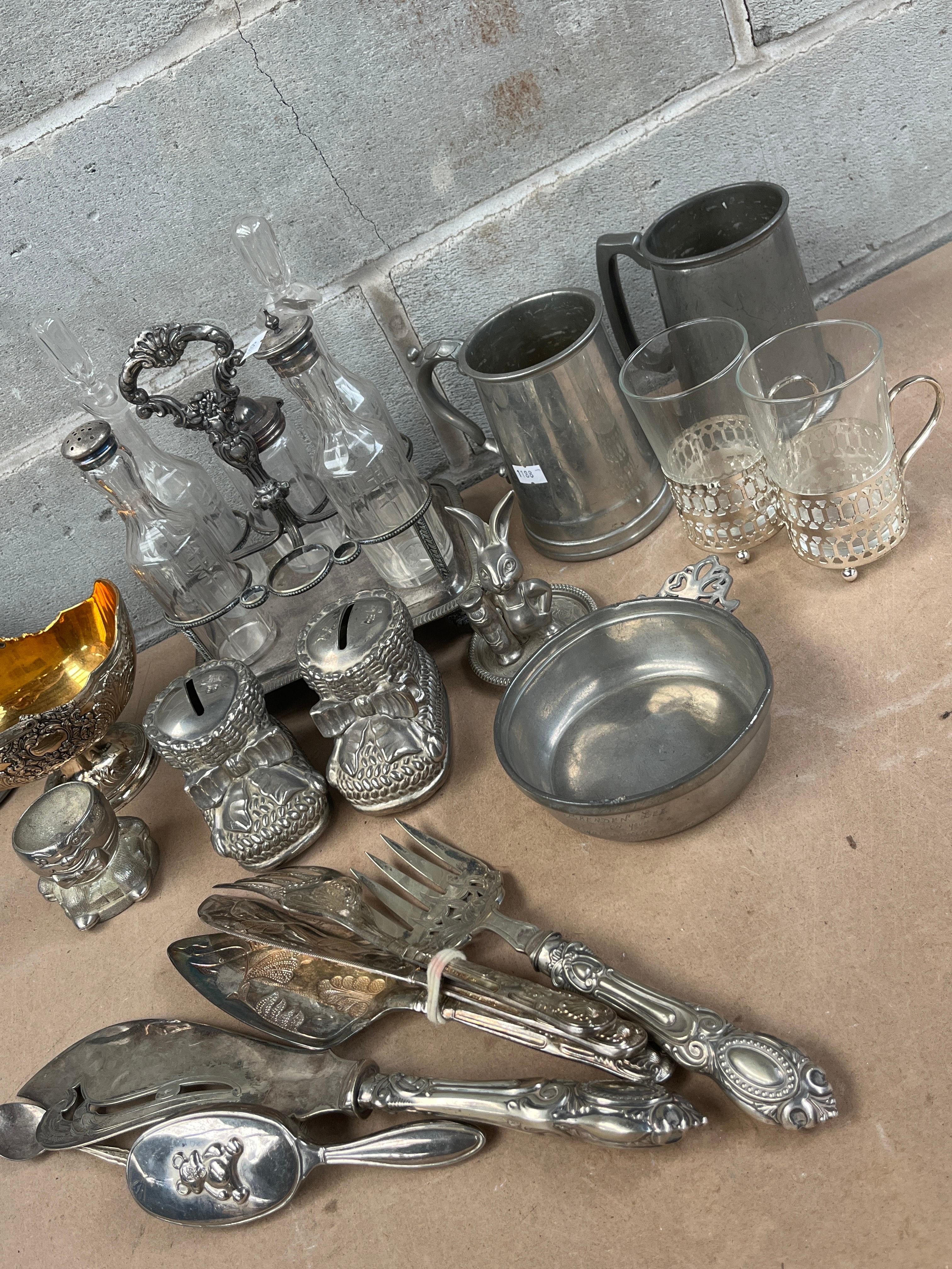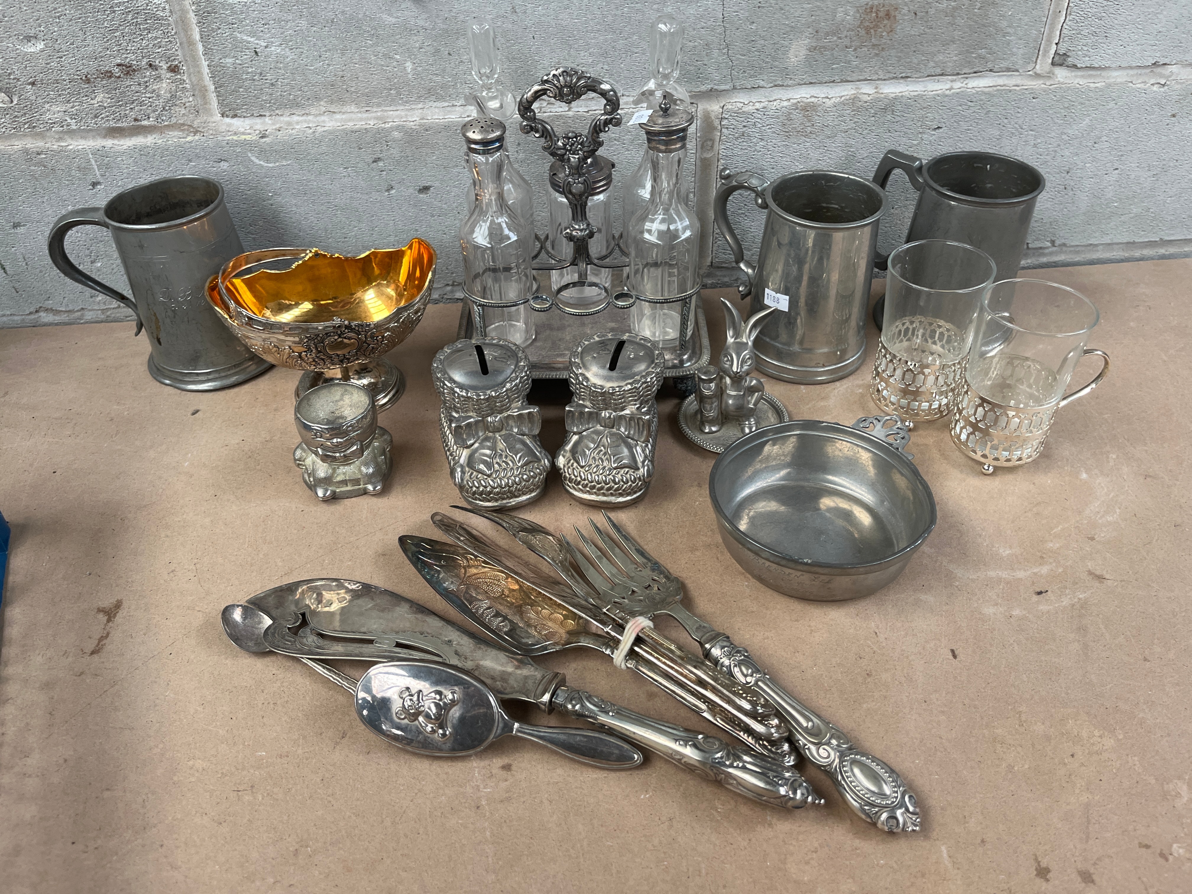 A collection of late 19th to early 20th-century domestic and serving items, crafted from silver-colored metal, likely silverplate, pewter, or potentially sterling silver. The assemblage includes an ornate cruet set with a decorative stand holding multiple glass bottles, a selection of similarly styled flatware (forks, spoons, knives), several plain metal tankards, a footed metal bowl with an ornate exterior and a gilded interior, a simpler shallow metal bowl, and various condiment vessels such as a pair of novelty baby boot-shaped shakers and a smaller footed shaker. Also present are two glass mugs with pierced metal holders. One tankard bears a small white sticker marked “8.00.”