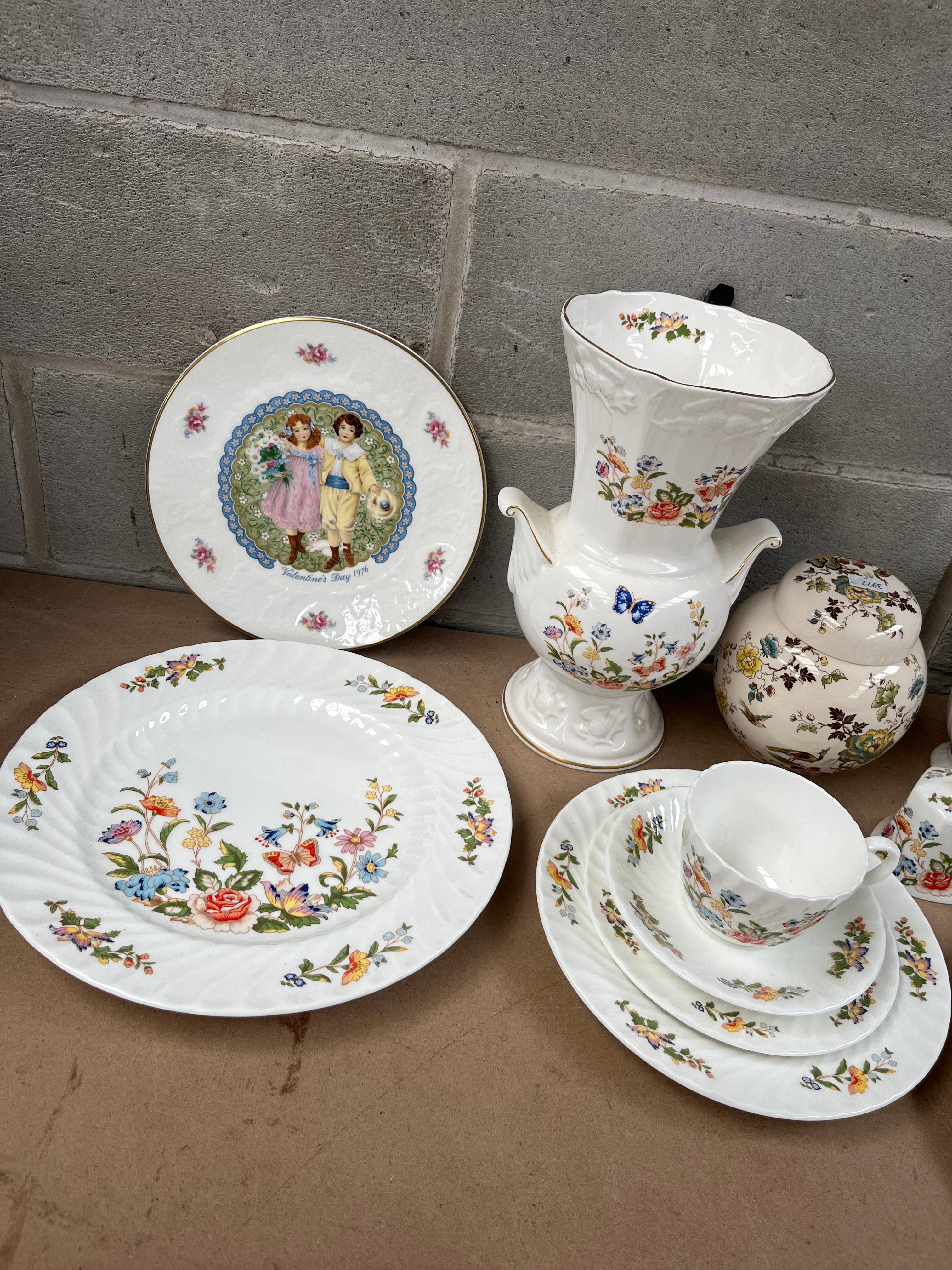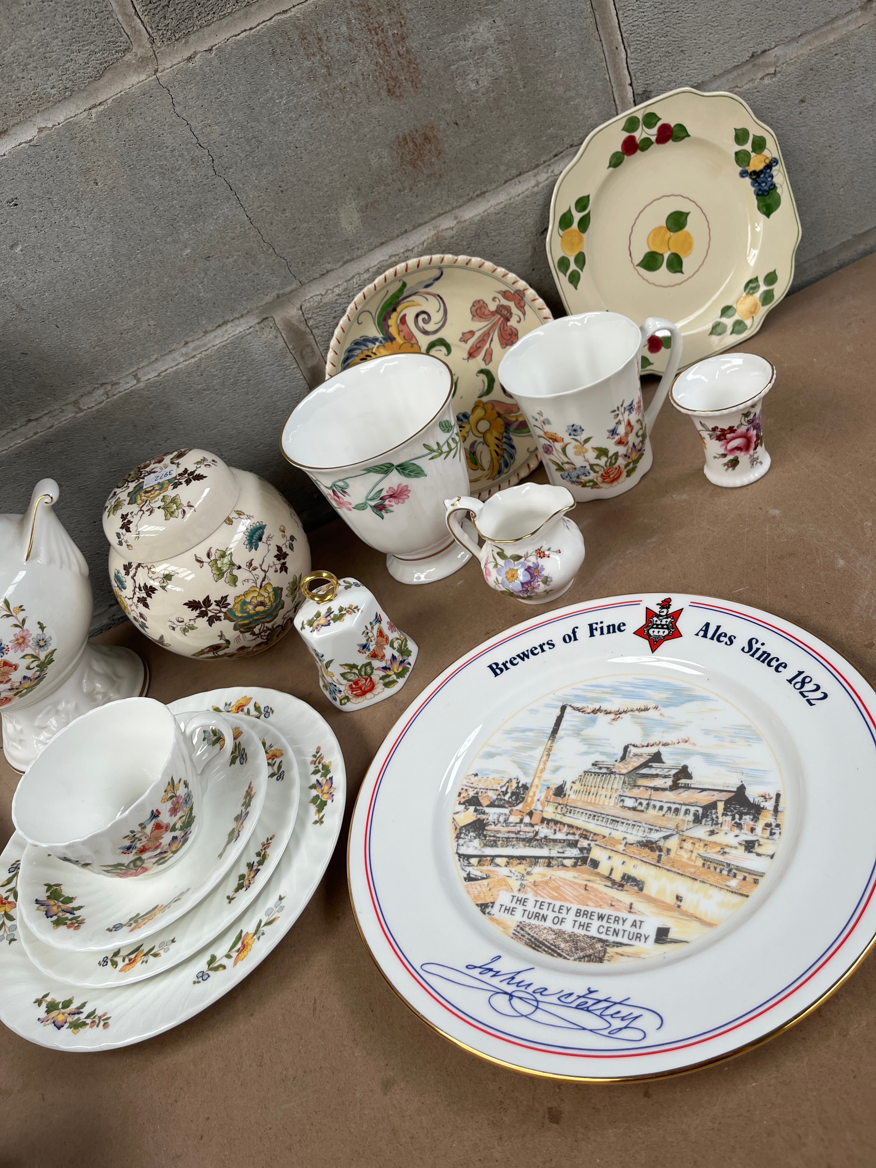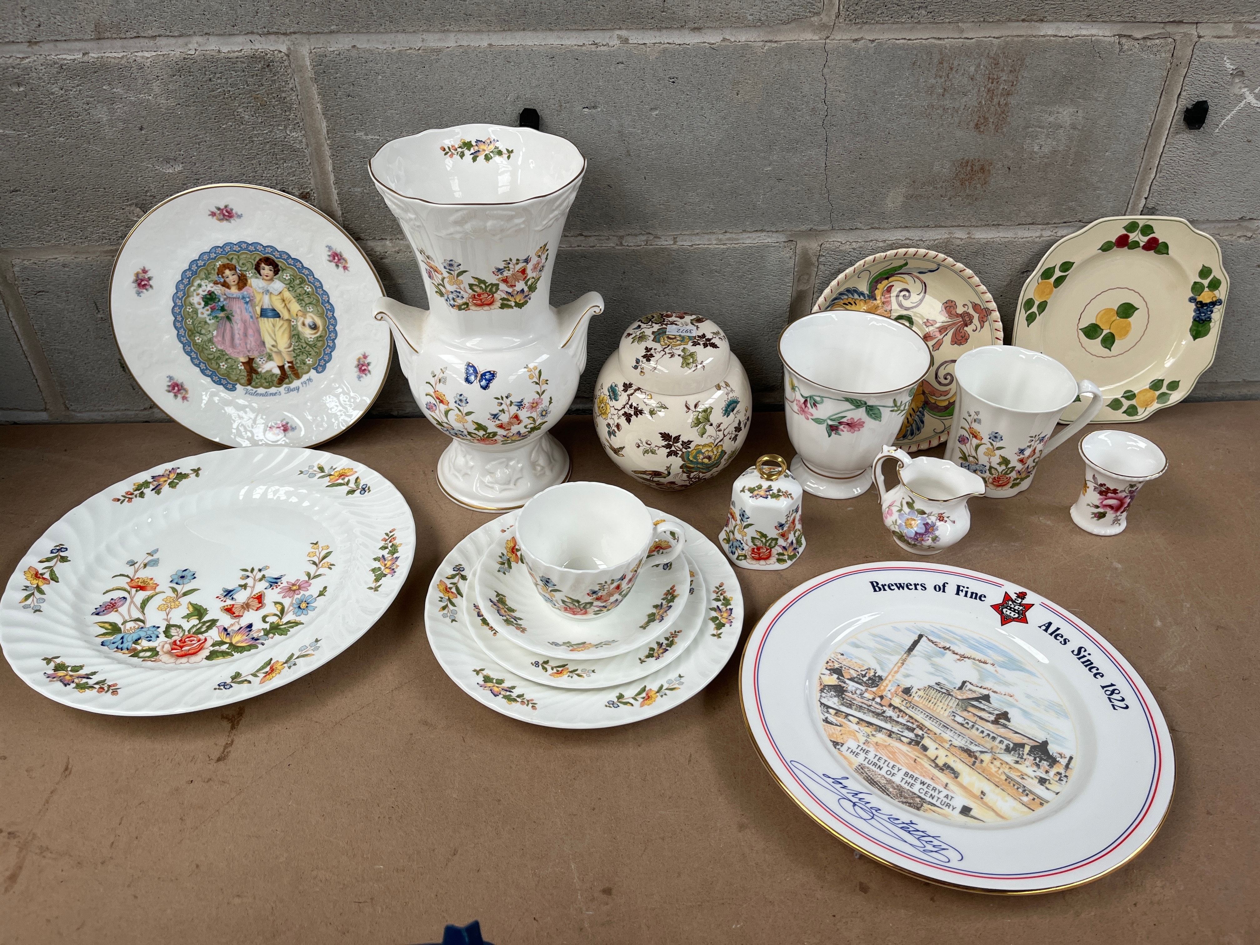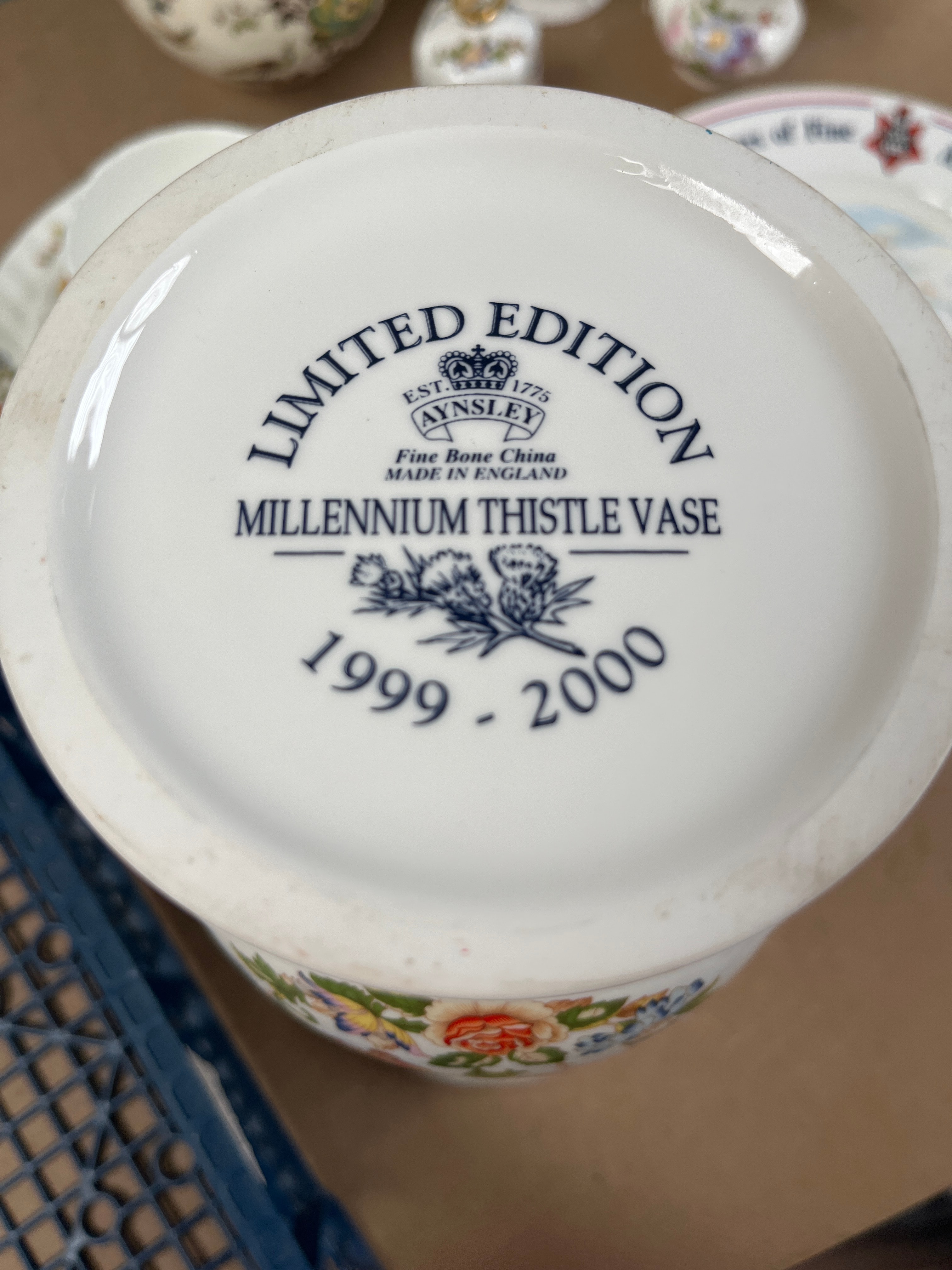 A Aynsley Limited Edition Millennium Thistle Vase, crafted from fine bone china, made in England and dated 1999-2000. This diverse collection predominantly comprises porcelain and fine bone china items, many exhibiting the characteristic floral motifs associated with Aynsley’s ‘Cottage Garden’ pattern, as suggested by web intelligence. The lot includes various plates, a tea set (comprising a cup and saucers), a faceted vase, a lidded jar, a creamer, a sugar bowl, mugs, and small ornamental pieces. Further notable items include a commemorative plate depicting ‘THE TETLEY BREWERY AT THE TURN OF THE CENTURY,’ stating ‘BREWERS OF FINE Ales Since 1822,’ and bearing an apparent signature ‘Arthur Tetley,’ alongside another plate marked ‘Sunday Morning 1978.’ The decorative style across the collection is characterized by diverse floral motifs and illustrative scenes.