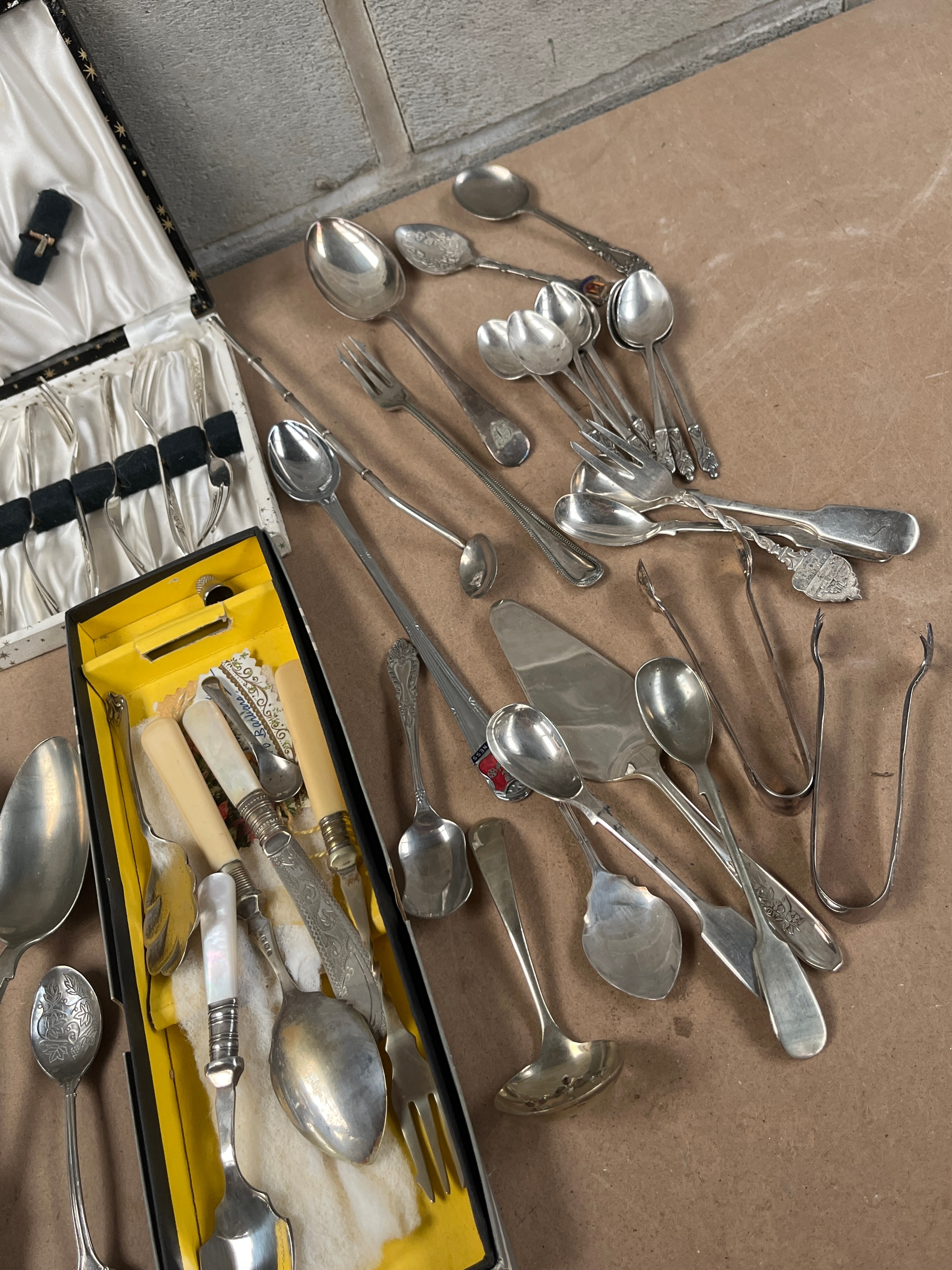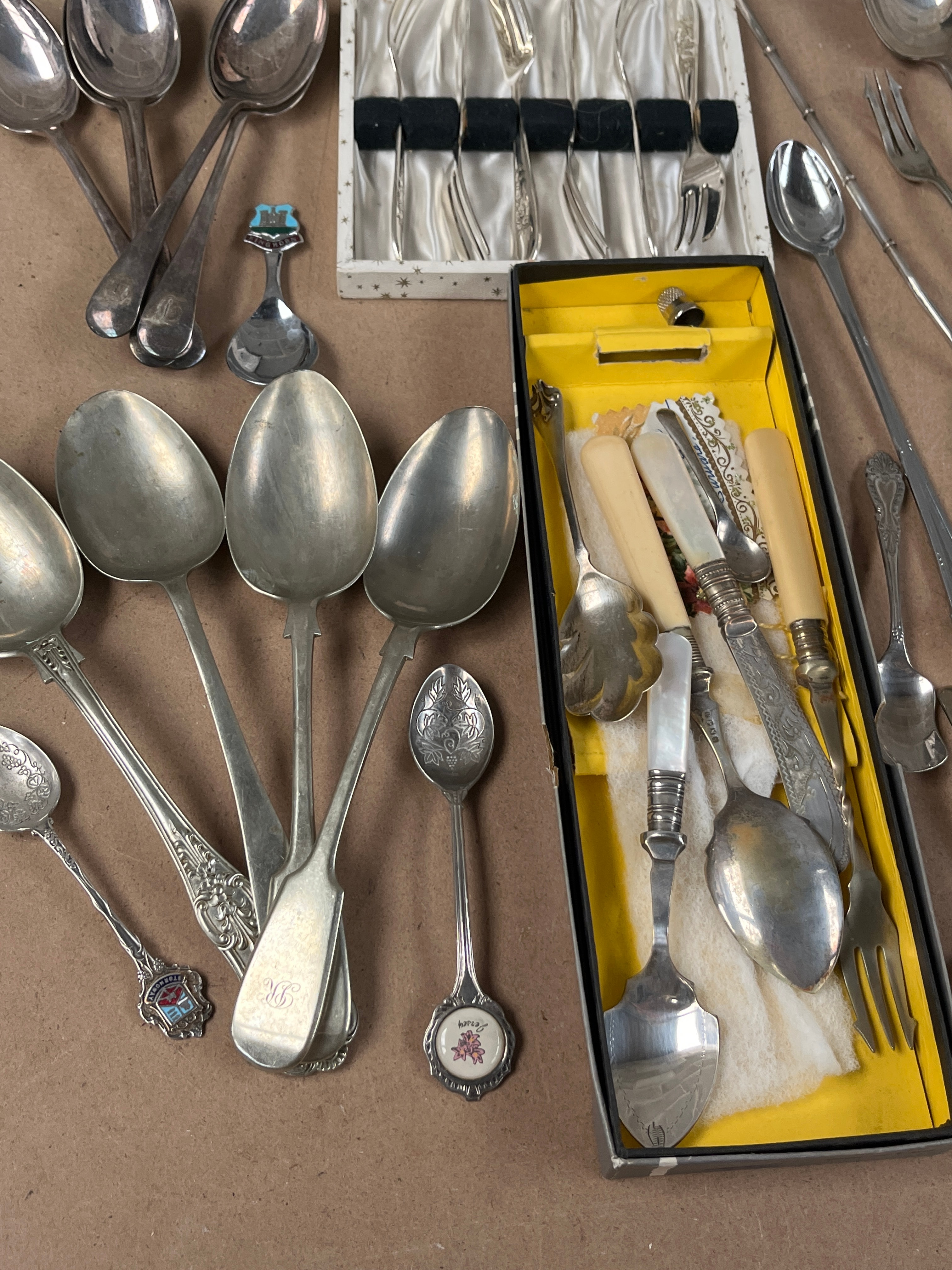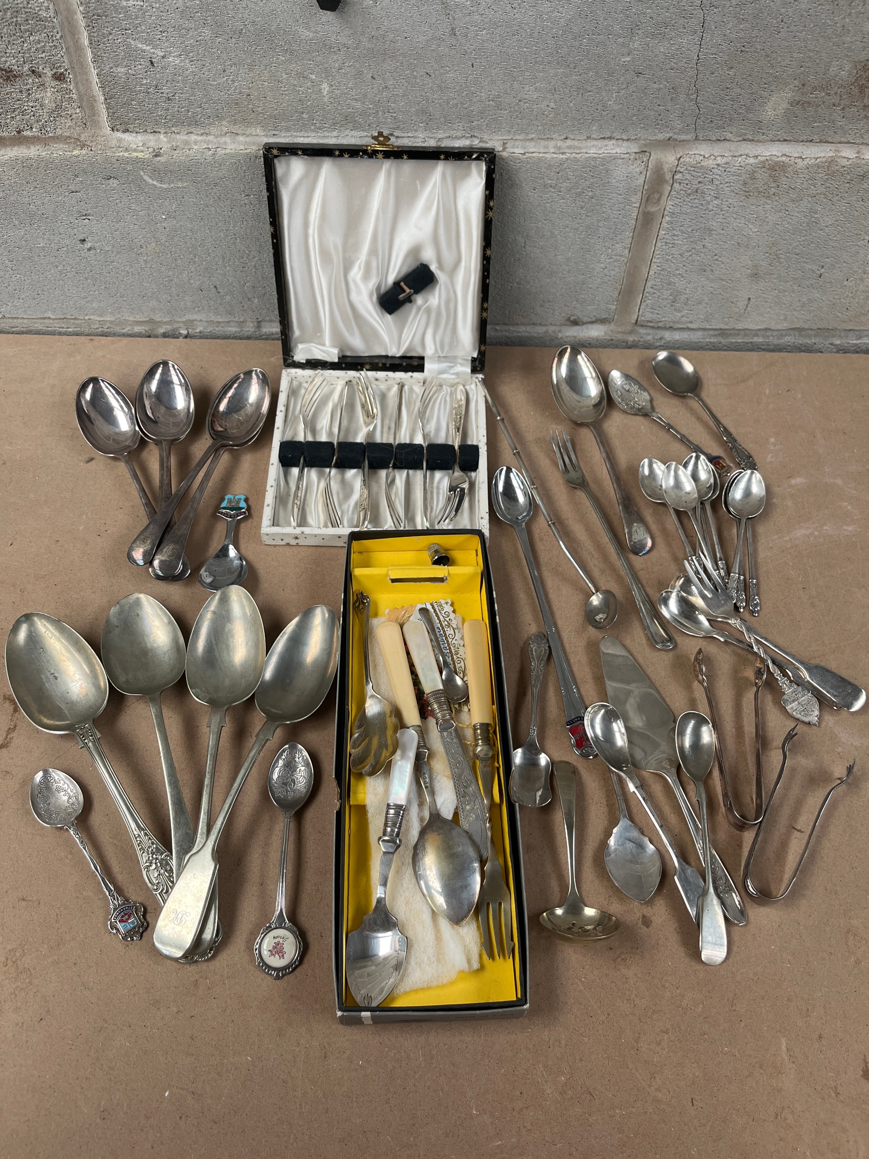 A varied assortment of flatware and serving utensils, primarily crafted from a silver-toned metal, likely silver plate, with some pieces potentially sterling. The collection exhibits a range of styles, from simple spoons and forks to more decorative items. Many pieces feature handles of cream-colored material, possibly bone or ivory, and mother-of-pearl. The lot includes two cased sets: one is a small, black-cased set of six uniform utensils, possibly forks or small spoons, presented in a white satin-lined interior; the other is a larger, partially open black box with a yellow interior tray holding a mix of more ornate serving pieces, including knives with cream handles and decorative forks. Among the loose items, a variety of spoons, forks, serving ladles, and tongs are present. One small souvenir spoon clearly displays the word “HAPPY” above a floral design, with additional initials below.