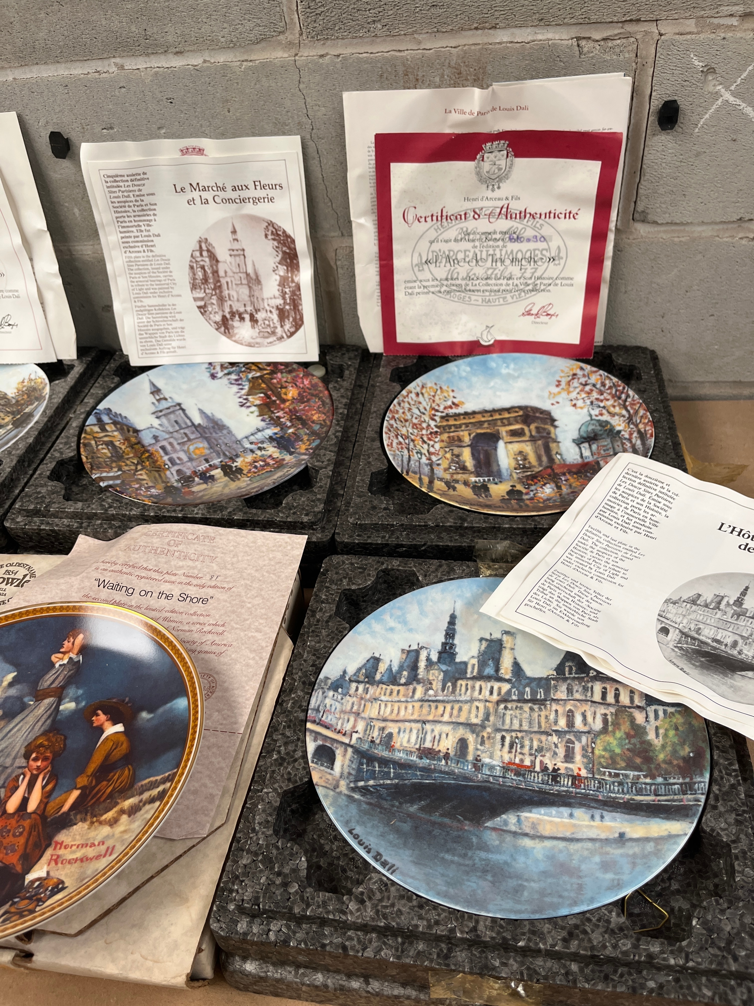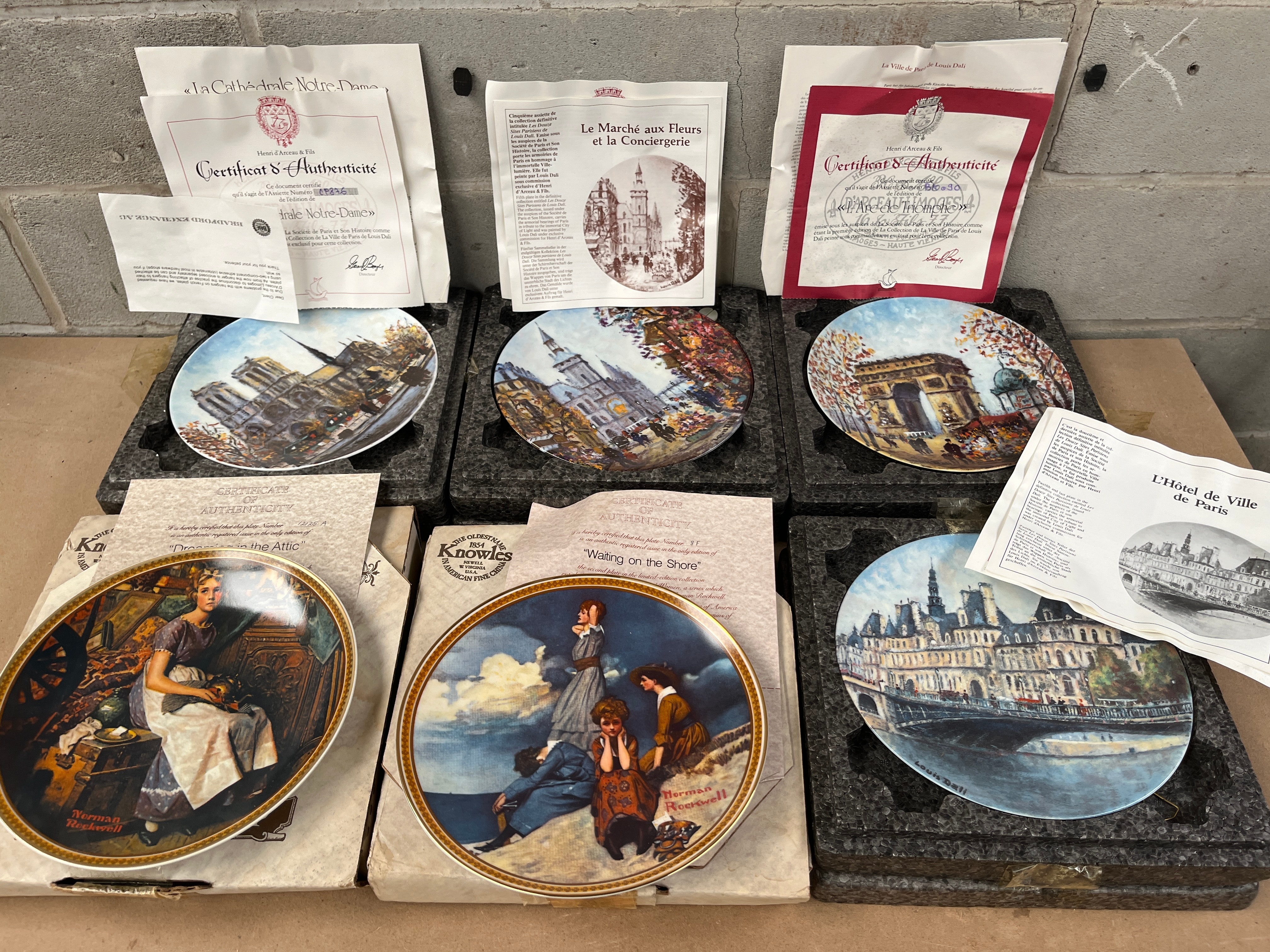 A collection of six collector’s plates. Two plates, signed “Norman Rockwell,” are titled “Dreaming in the Attic” and “Waiting on the Shore,” manufactured by Knowles (or Edwin M. Knowles) and accompanied by Certificates of Authenticity. The remaining four plates depict iconic Parisian landmarks: “La Cathédrale Notre-Dame,” “Le Marché aux Fleurs et la Conciergerie,” “L’Arc de Triomphe,” and “L’Hôtel de Ville de Paris.” These plates are also accompanied by Certificates of Authenticity, some bearing the mark of The Hamilton Collection. Each plate is presented in its original styrofoam packaging with accompanying paperwork. Likely ceramic or porcelain, suggesting a late 20th to early 21st-century production period.