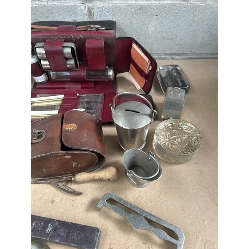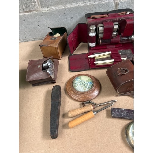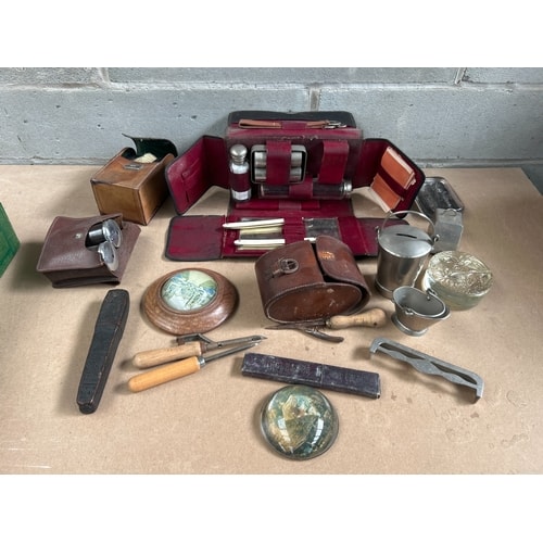 A vintage men’s chromium plated grooming set housed in a dark leather travel or vanity case with a vibrant red interior, equipped with multiple metal-topped bottles and grooming instruments. Accompanying items include two smaller leather cases, one housing binoculars and another oval-shaped with a buckle, plus a rectangular box with a green lining. The assortment also features various metalware: a cylindrical coin bank, a decorative embossed lidded box, a small bucket, trays, and shaped implements. Further elements consist of a round wooden base presenting a domed map or image under glass, a similar standalone paperweight, tools with wooden handles, and a dark carved rectangular object. Materials observed include leather, various silver-tone metals, wood, and glass.