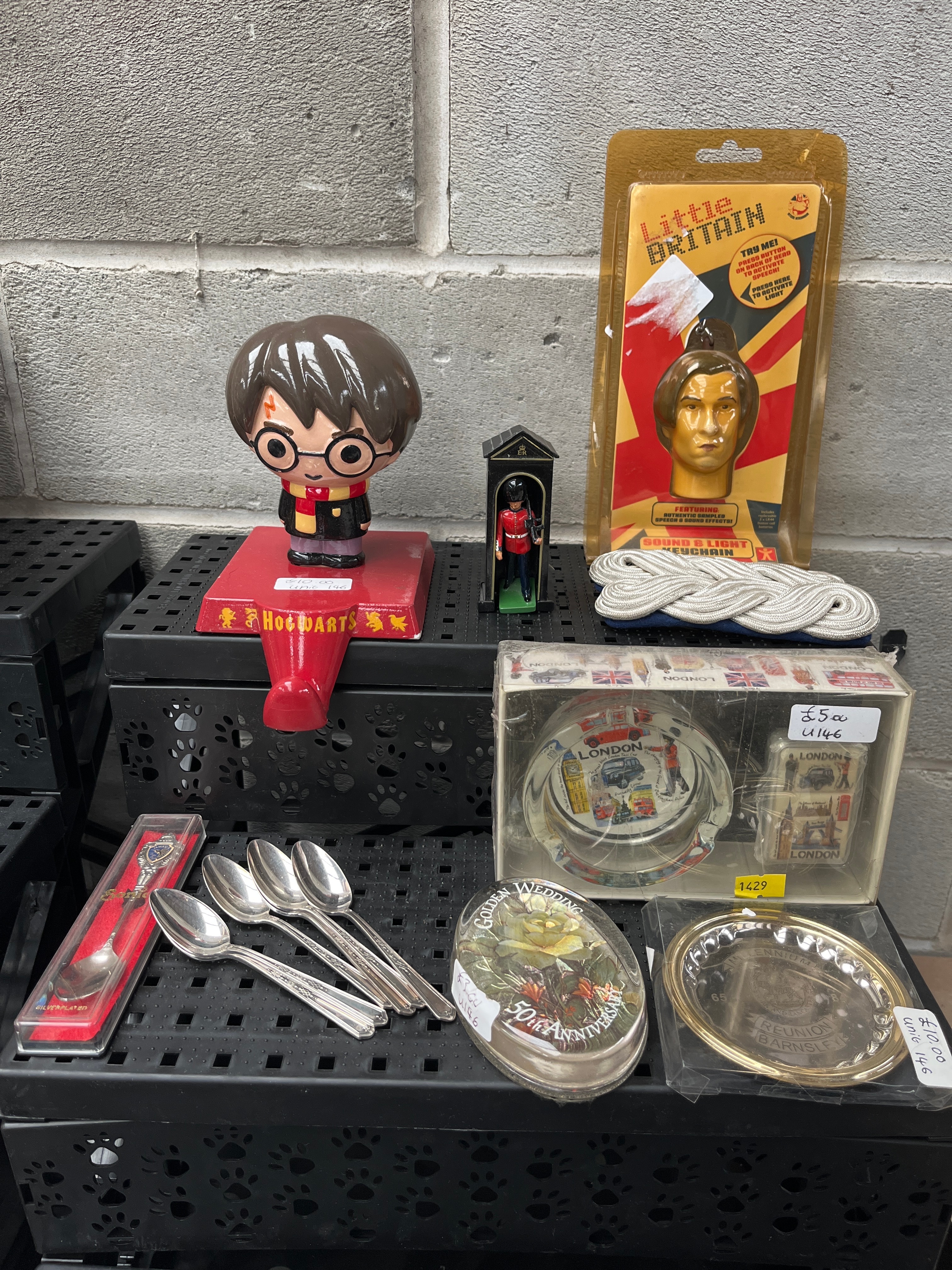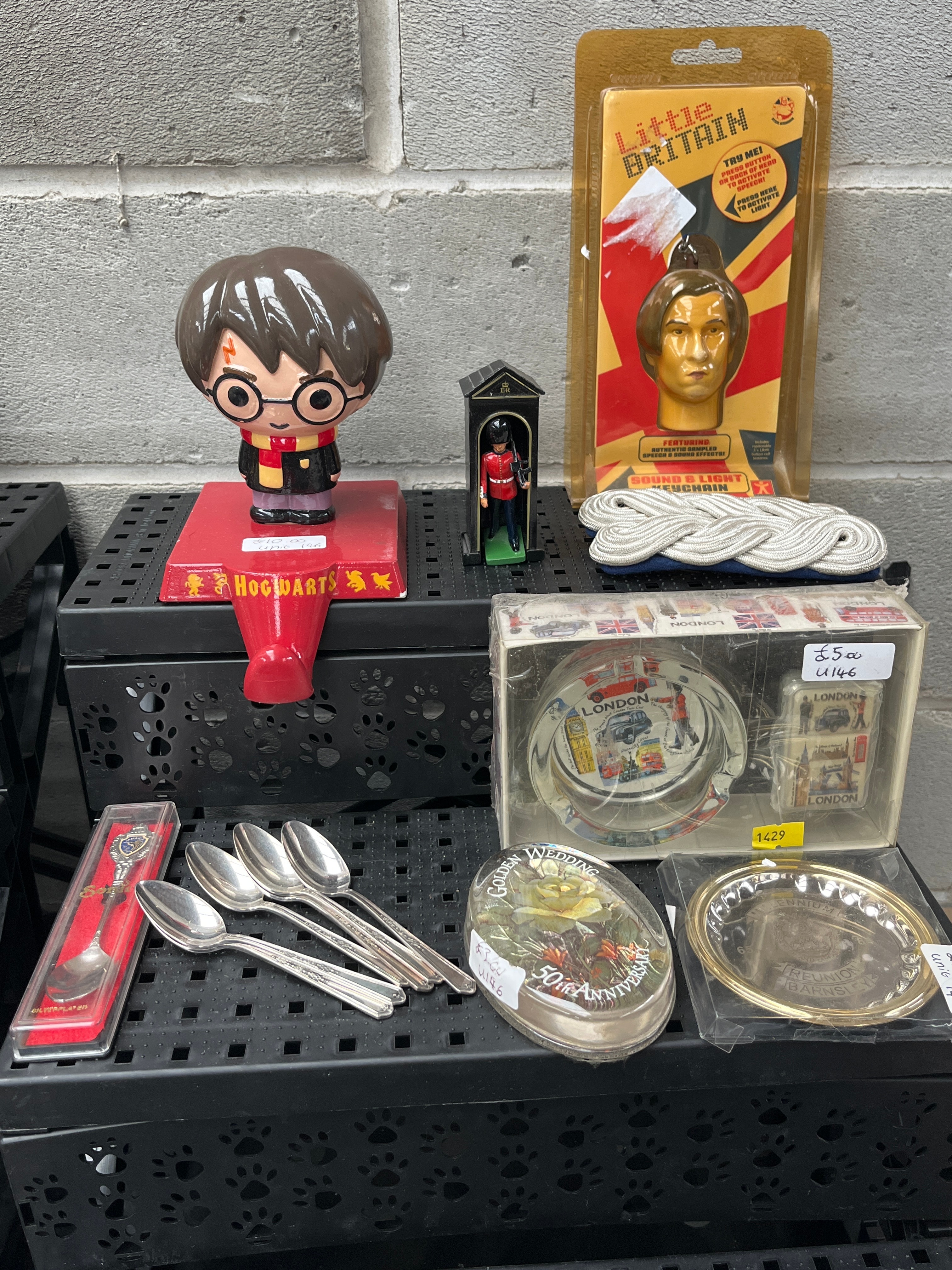 A varied collection of modern souvenir and novelty items, primarily themed around British culture and popular franchises, presented in various materials including ceramic, plastic, and mixed metals. Key items include a ceramic Harry Potter bobblehead on a red stand marked “HOGWARTS,” a miniature Queen’s Guard figurine in a sentry box, and a blister-packaged “Little Britain” talking novelty featuring a golden head. Also present are a coiled white rope, a set of four silver-tone spoons, a boxed set of “LONDON” themed coasters and a matching lighter, an oval commemorative tin marked “50th Anniversary,” and a small brass-tone plate inscribed “THE TOWER OF LONDON YEOMAN WARDER.”