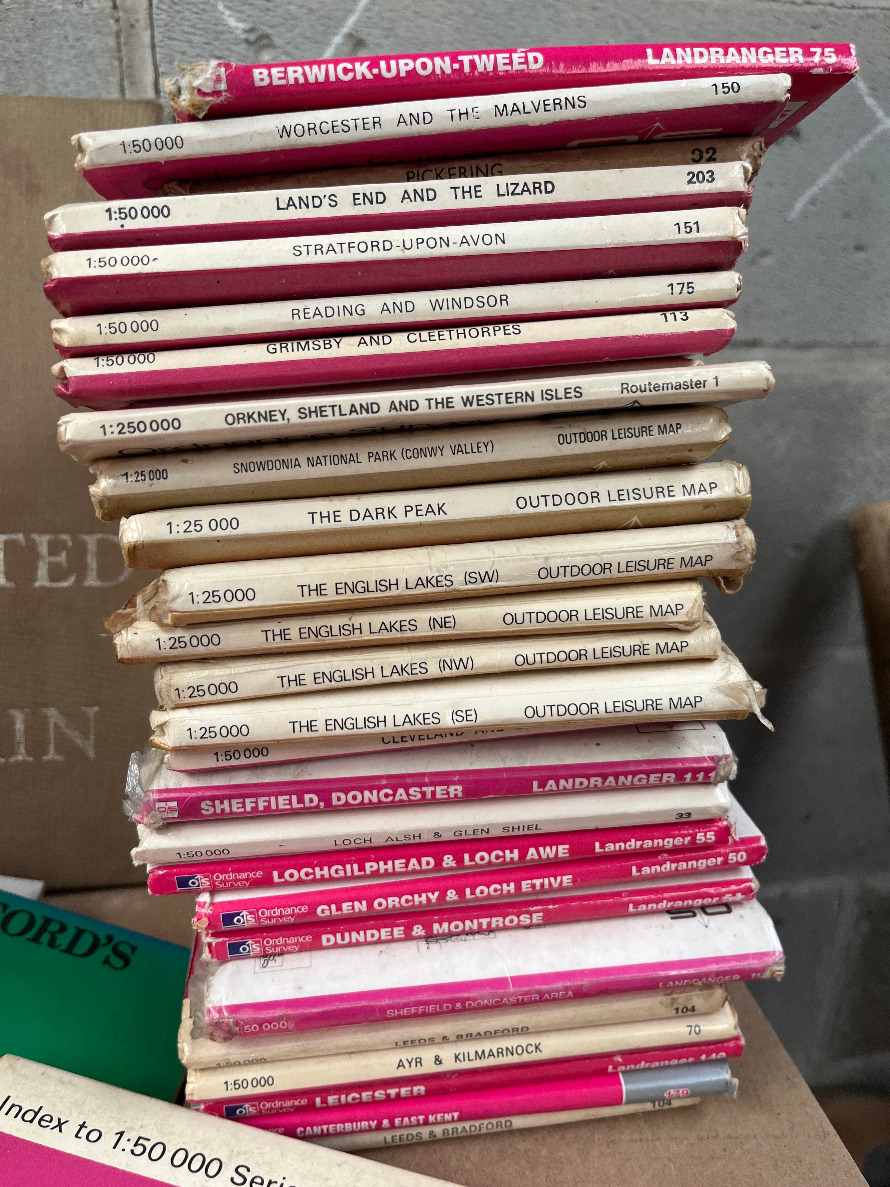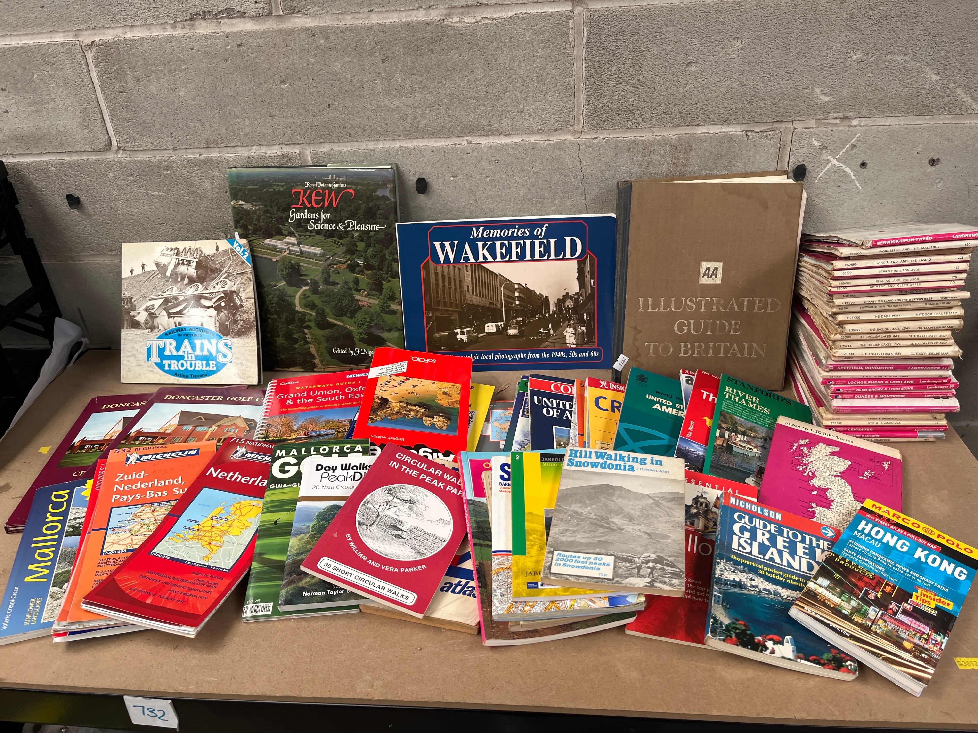 A collection of approximately 50-70 books, guides, and folded maps, predominantly in paperback format with some hardcovers. The subjects focus heavily on travel, leisure, and local history, particularly within the United Kingdom. Visible titles include “AA Illustrated Guide to Britain,” “Memories of Wakefield,” and “Trains in Trouble.” A significant portion consists of “Ordnance Survey Landranger” and “Outdoor Leisure Maps” covering various British regions, such as the English Lakes, Snowdonia, and the Scottish Highlands, alongside specific towns. The collection also features international travel guides for destinations including Mallorca, Greece, Hong Kong, and the Netherlands (e.g., “Michelin Guide to ZUID-NEDERLAND, PAYS-BAS”). The publications span from the mid-20th century to more contemporary examples.