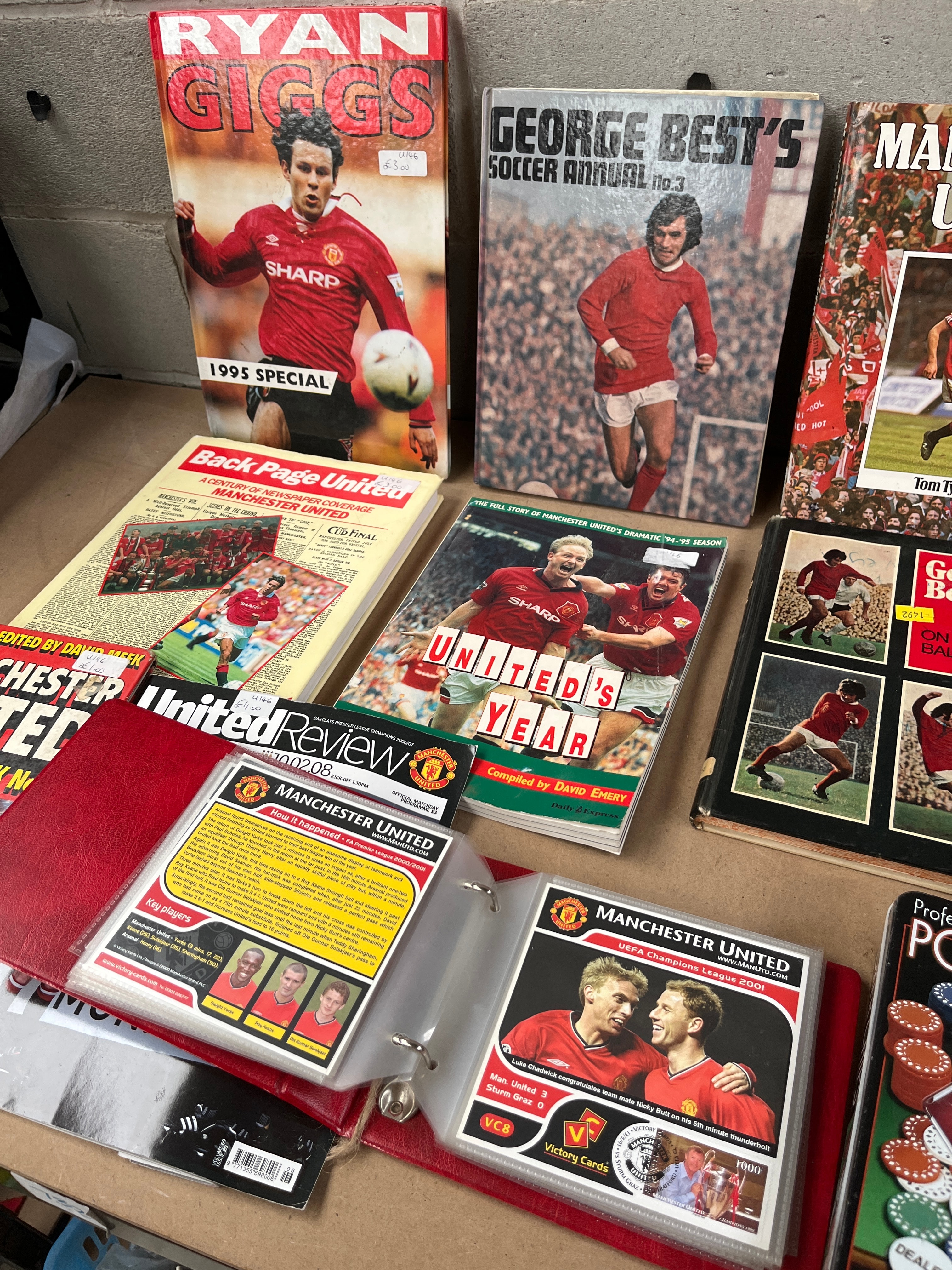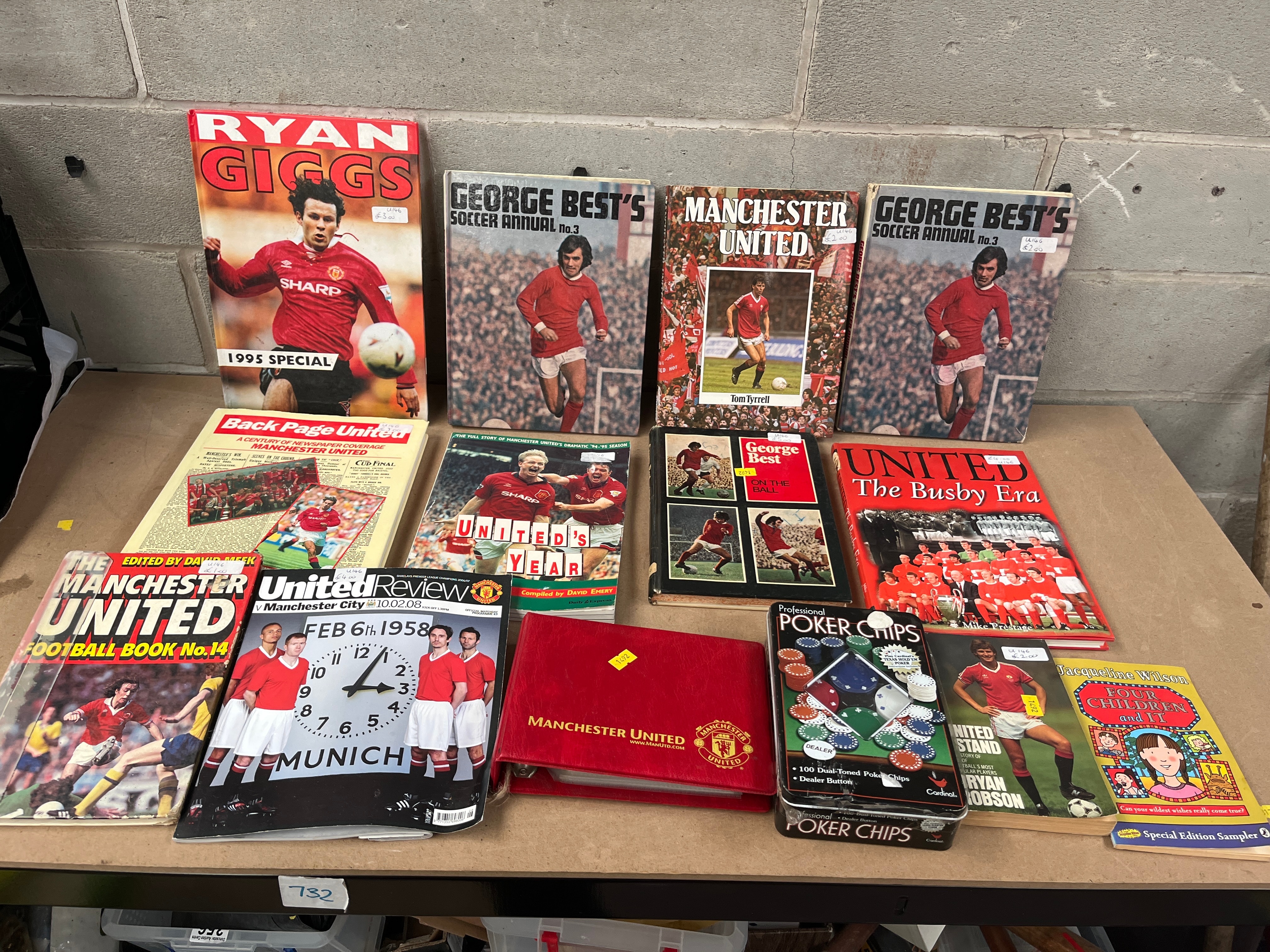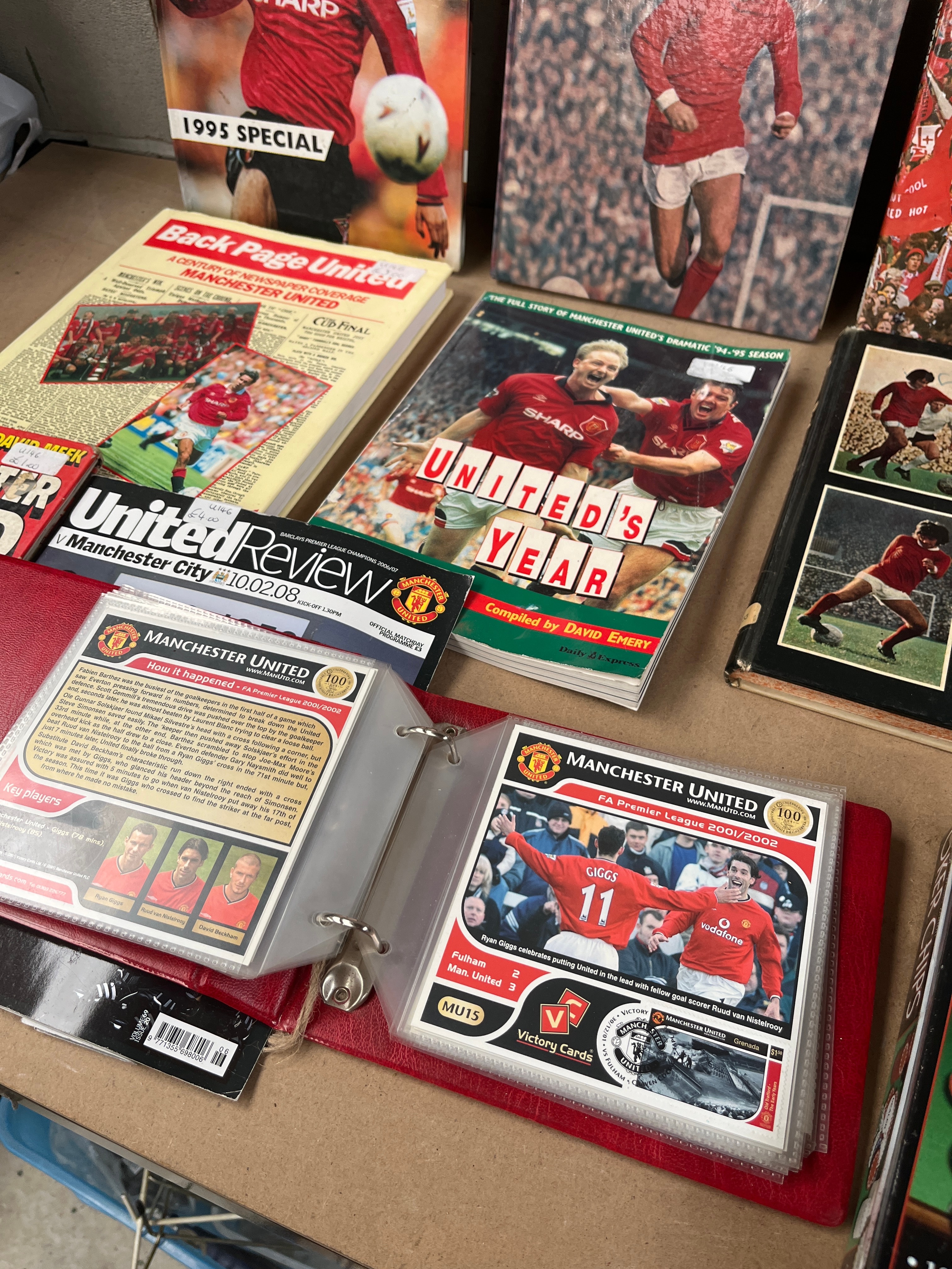 This lot comprises a collection of Manchester United football memorabilia, primarily consisting of various books, annuals, and magazines spanning from the 1970s to the 2000s. Notable titles include “Ryan Giggs 1995 Special,” “George Best’s Soccer Annual No. 3,” “United’s Year,” “Back Page United,” and “UNITED The Busby Era.” Also present is a “Manchester United Review” matchday program dated 10.02.08, commemorating the Munich Air Disaster on “Feb 6th 1958.” The collection further includes a red faux-leather ring binder containing clear plastic sleeves with Manchester United football trading cards and commemorative pages, such as “Premier League 2001/2002.” A small red book with a Manchester United crest and a “Professional POKER CHIPS” tin featuring club iconography and “MANCHESTER UNITED STAND Ryan Robson” text are also part of the lot. The items are constructed from paper, cardboard, plastic, and metal.