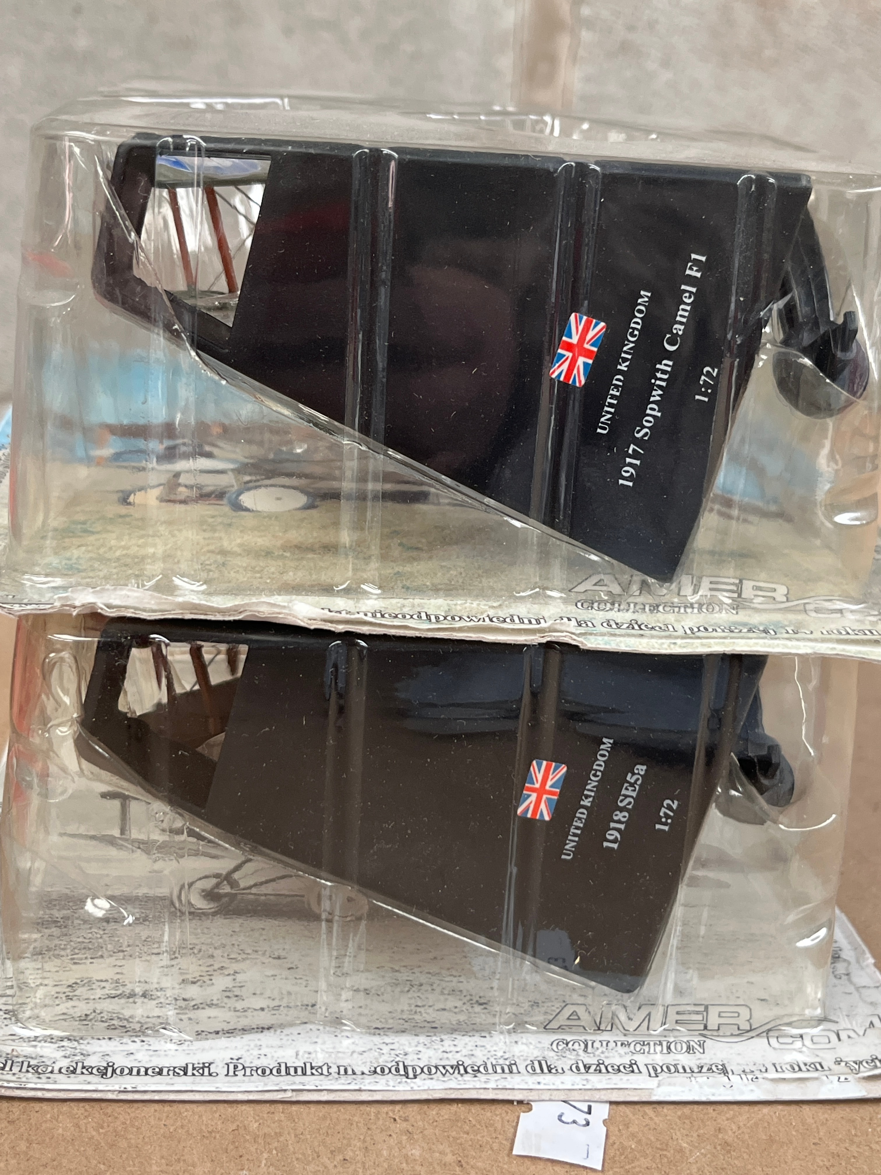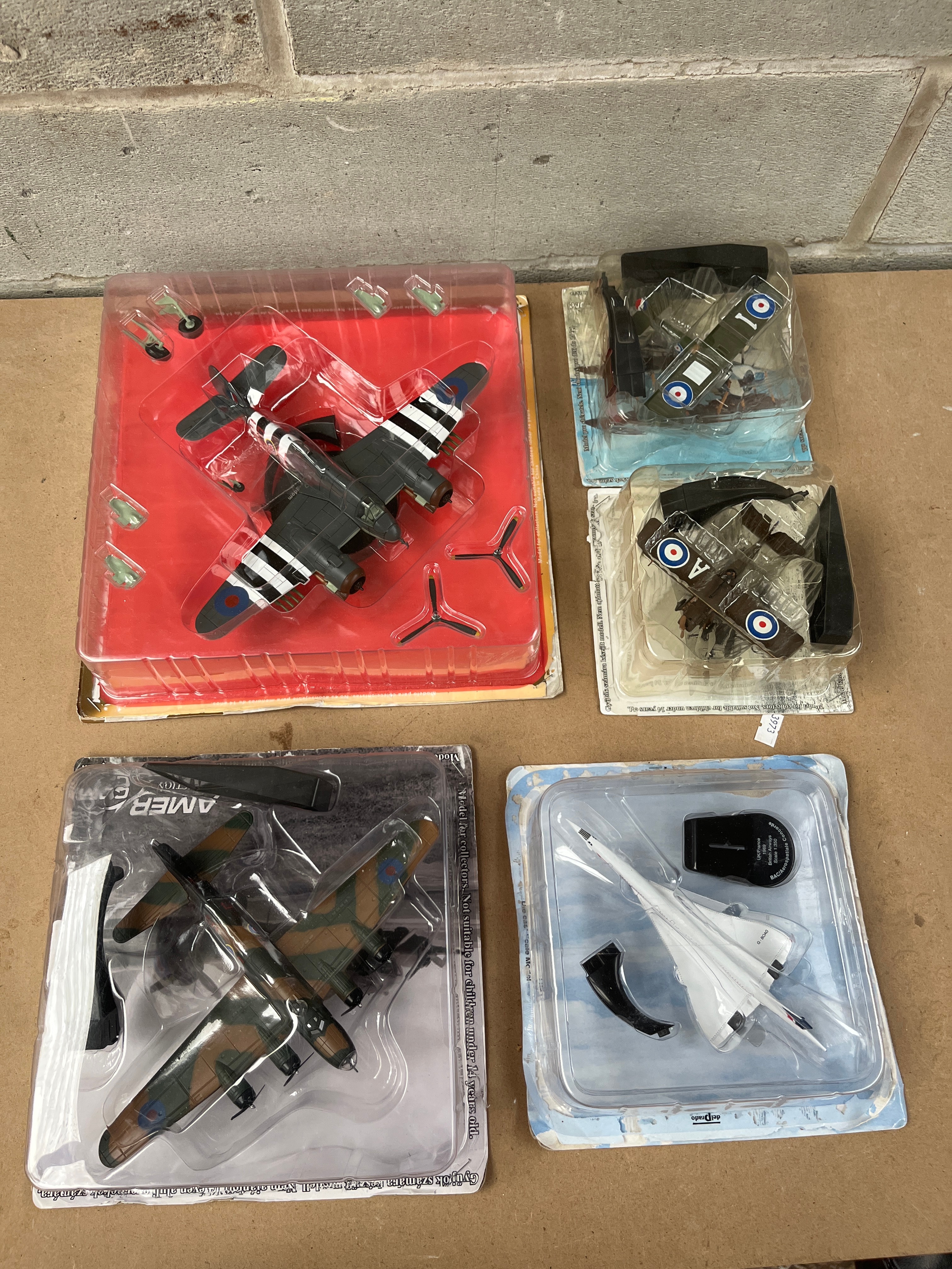 A collection of six die-cast model aircraft, each presented in its original sealed clear plastic blister packaging with cardboard backing. The collection comprises a diverse range of aviation periods and types. Identified models include a 1917 Sopwith Camel F1 and a 1918 SE.5a, both marked “UNITED KINGDOM” and at a 1:72 scale, representing World War I-era biplanes. One multi-engine propeller-driven aircraft is identified through web intelligence as a Bristol Beaufighter, likely from the World War II or post-war eras. The collection also includes two additional single-engine propeller-driven aircraft from similar periods, and one modern white supersonic passenger jet, identified as a Concorde at a 1:400 scale. Several packages bear the “AMER COLLECTION” branding. The models are constructed from die-cast metal and plastic.
