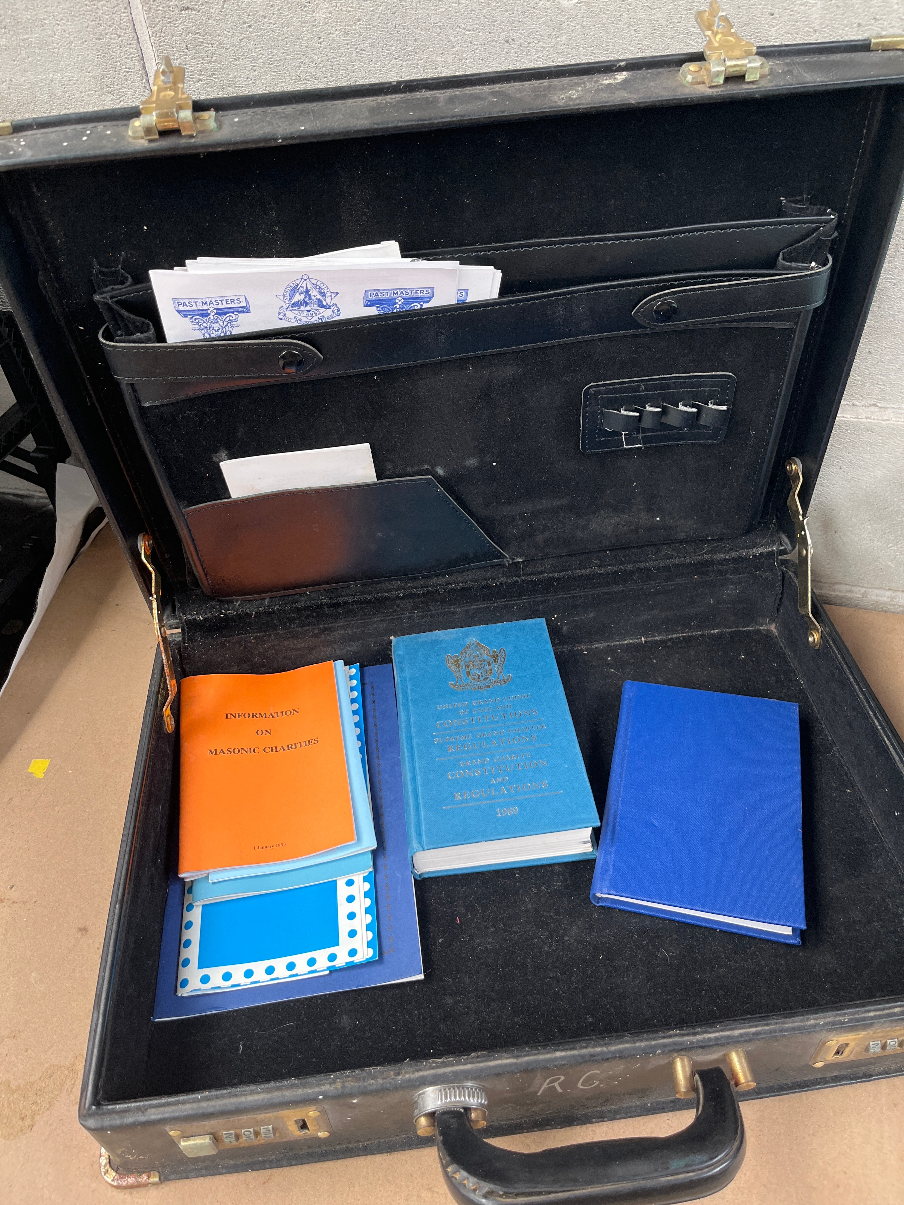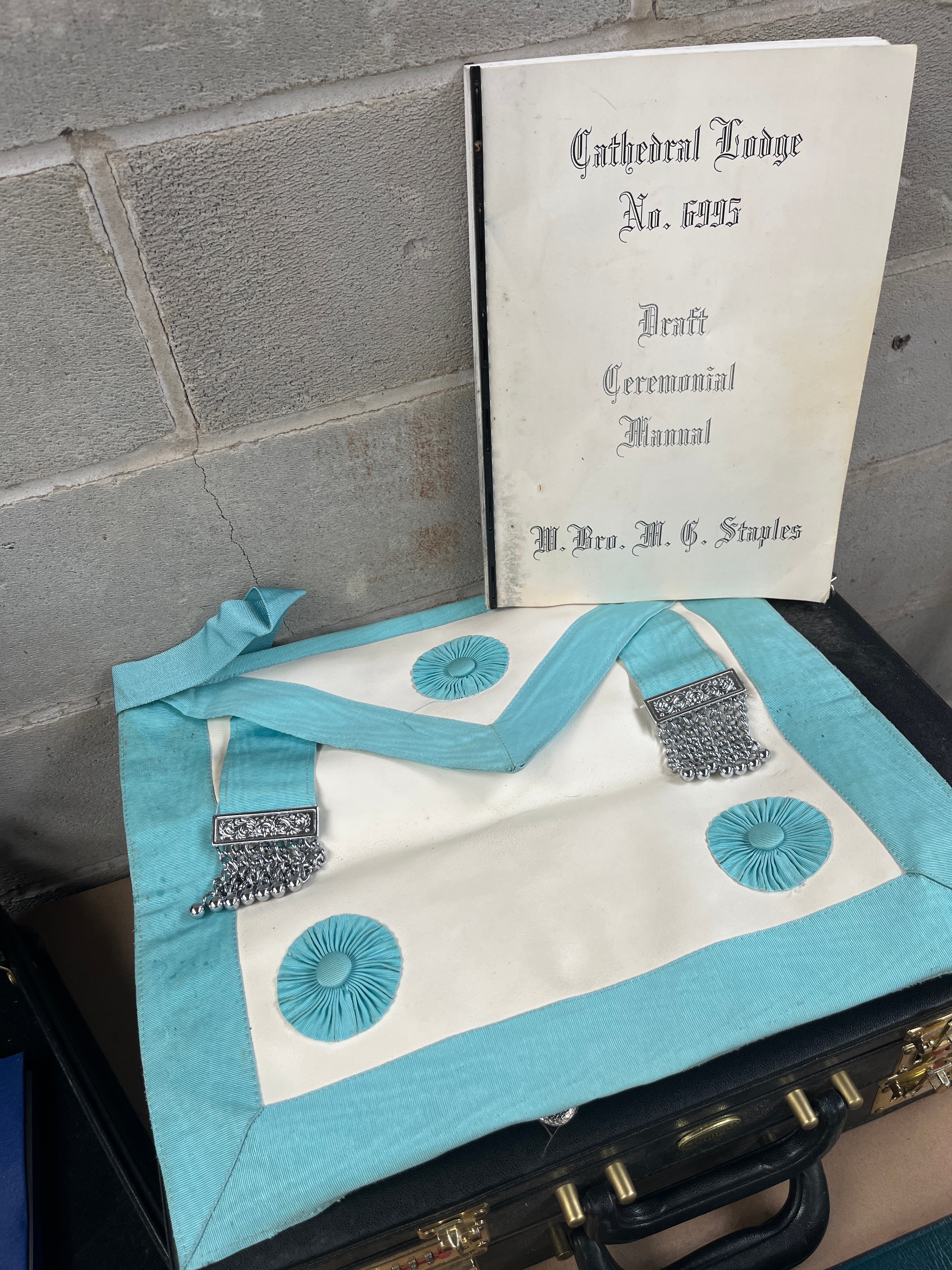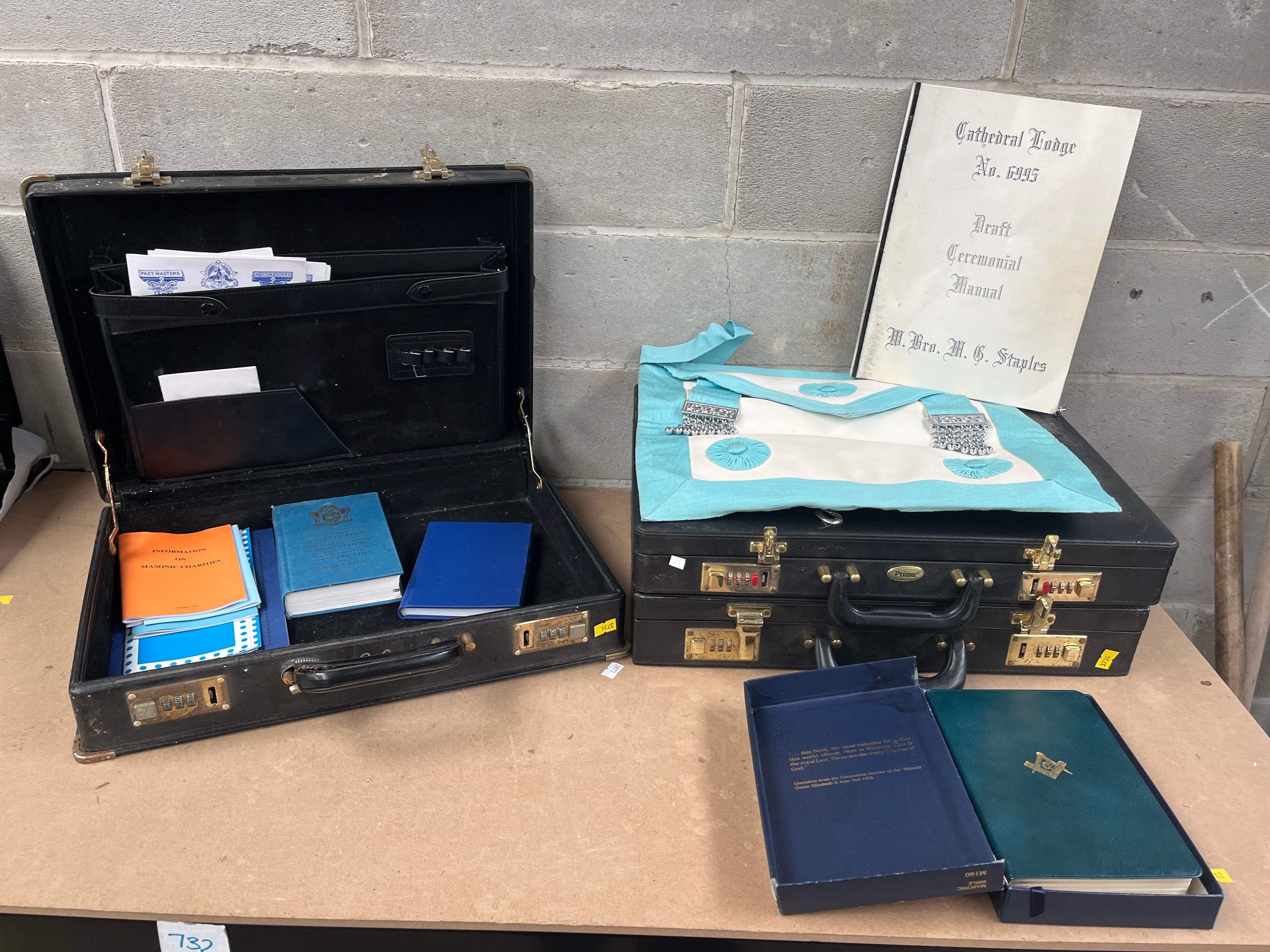 A collection of Masonic-related items, including three dark-colored briefcases, two closed and one open, all featuring combination locks. The open briefcase contains an orange booklet titled “INFORMATION ON MASONIC CHARITIES 1 January 2005” and a blue book marked “GRAND LODGE OF SCOTLAND CONSTITUTION AND LAWS 2000”, alongside papers displaying “PAST MASTERS” and “RG” handwritten on the case’s handle. Positioned near the closed briefcases is a white and light blue fabric ceremonial apron adorned with decorative silver-tone metal clasps. Also present is a white softcover manual titled “Cathedral Lodge No. 6915 Draft Ceremonial Manual W. Bro. M. G. Staples”. A dark blue slipcase containing a book, both marked “GRAND LODGE OF SCOTLAND CONSTITUTION AND LAWS”, completes the lot. The briefcases appear to be constructed from a dark material, likely bonded leather or leatherette.