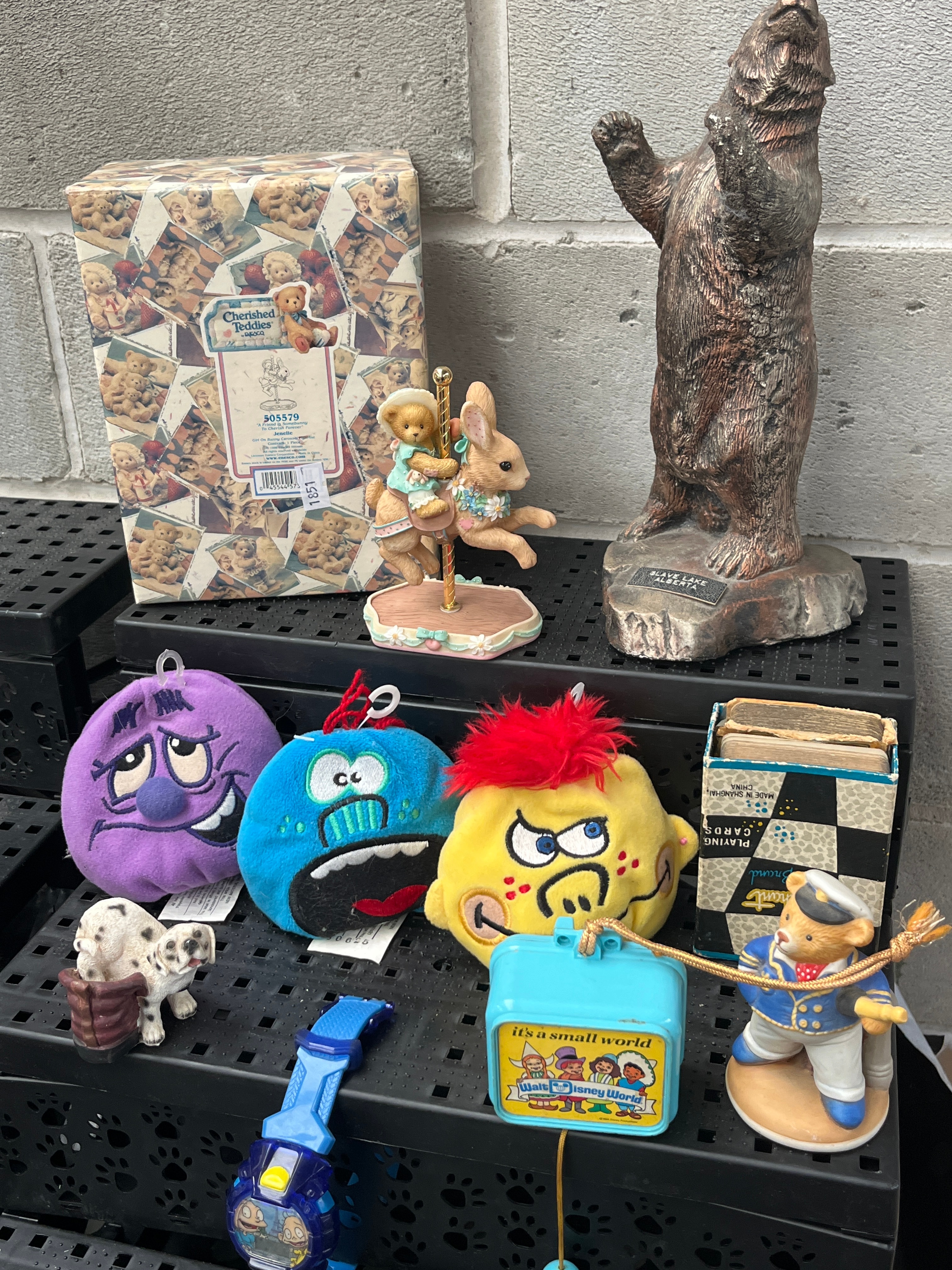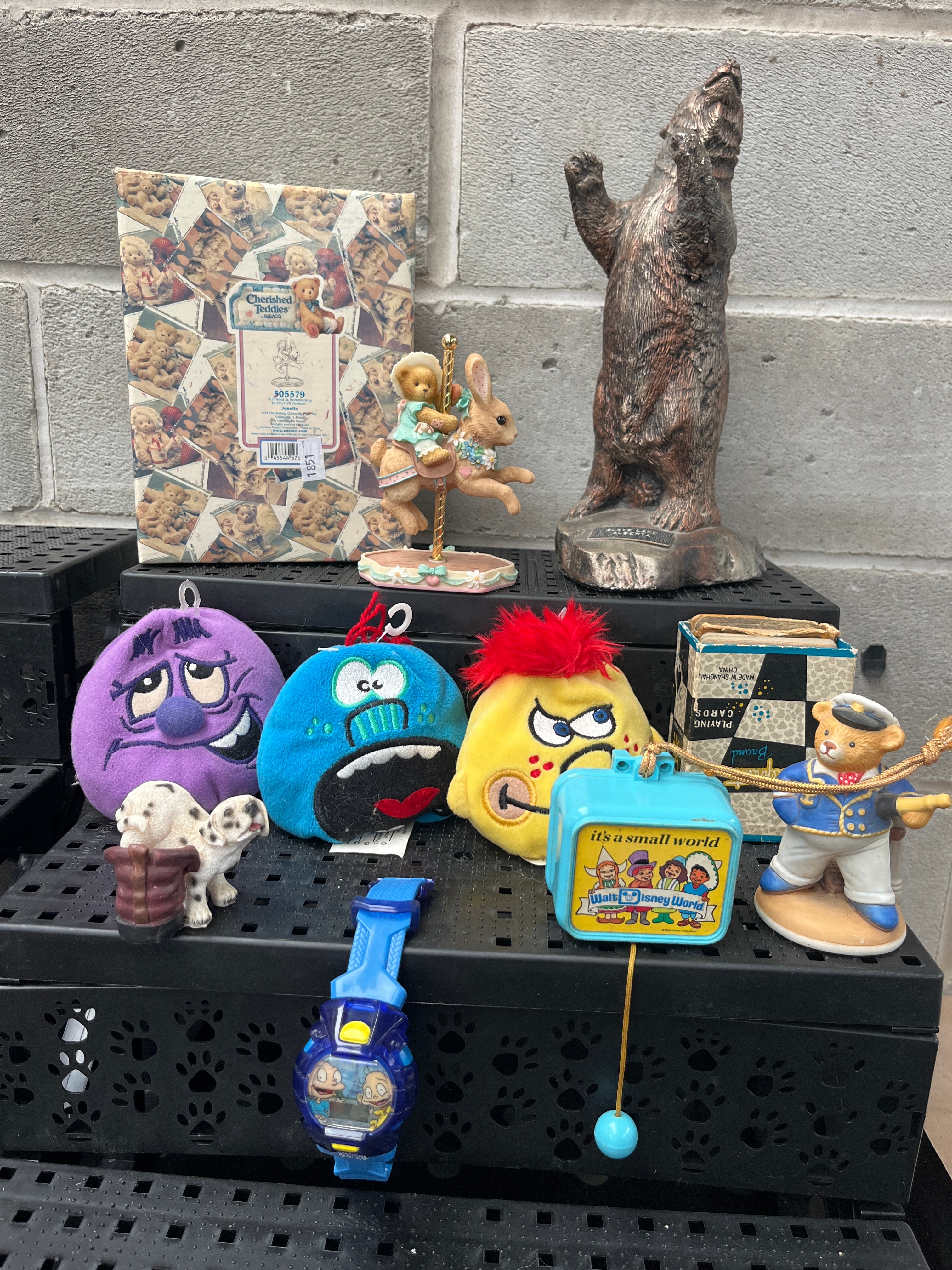 A collection of decorative and novelty items, primarily crafted from mixed materials including ceramic, resin, plush fabric, plastic, and paper. The lot includes several “Silly Slammers” beanbag plush toys, identified through web intelligence. Also present is a “Cherished Teddies” brand box displaying item number 505570, a bronze-toned bear sculpture inscribed “DAVID LATH” and “Made in USA”, a blue plastic “it’s a small world” item marked “DISNEY” and “© DISNEY Hong Kong”, a Disney character wristwatch, various figurines including a teddy bear riding a rabbit, a Dalmatian dog, and a bear in a naval uniform, alongside a small box of “PLAYING CARDS”.
