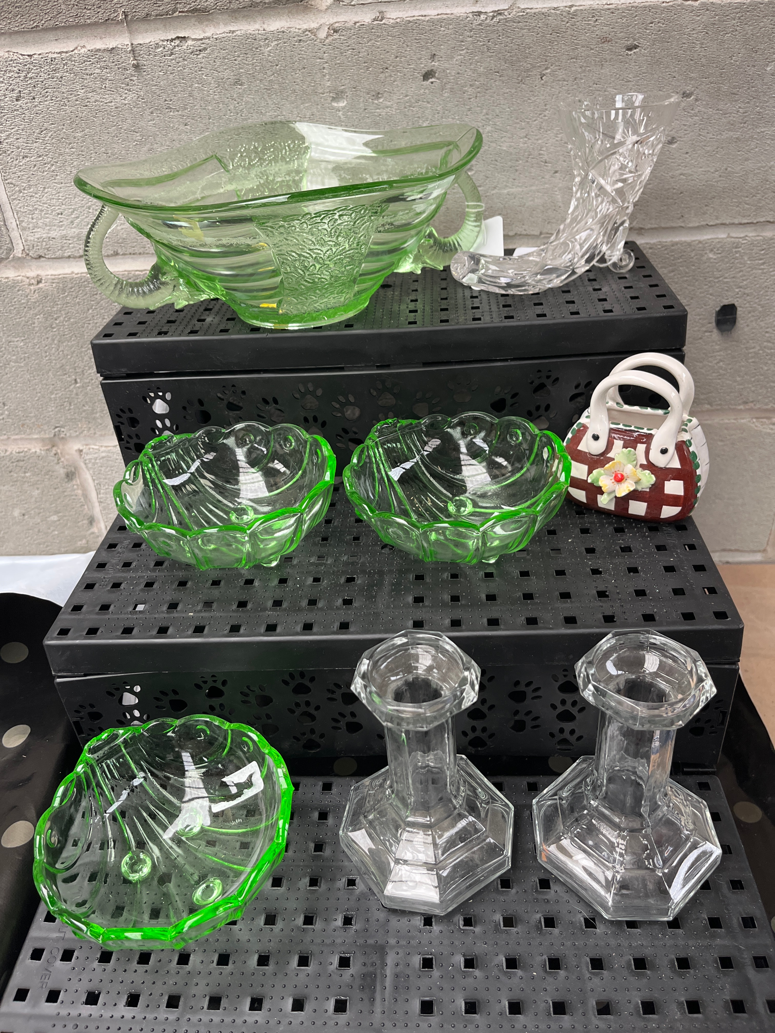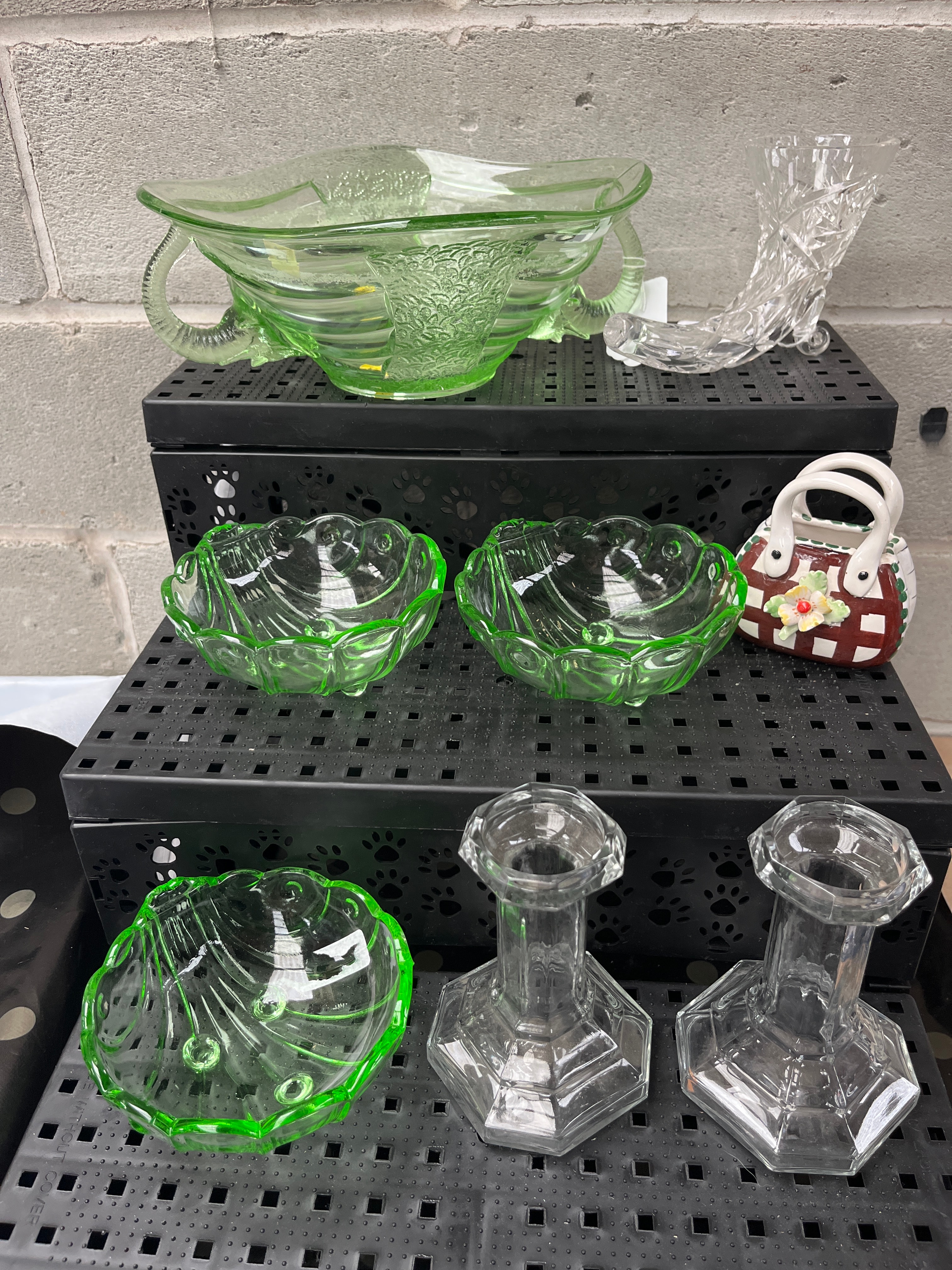 A collection of nine decorative objects, comprising a large DC Jenkins ‘Ocean Wave’ pattern light green translucent molded glass handled bowl with an embossed floral pattern, paired with a clear molded glass novelty slipper. The grouping also includes three small clear glass scallop-edged bowls, each featuring a bright green rim, alongside a small ceramic novelty purse in brown with white handles and floral accents. The collection is completed by a pair of clear molded glass candlestick holders with hexagonal bases.