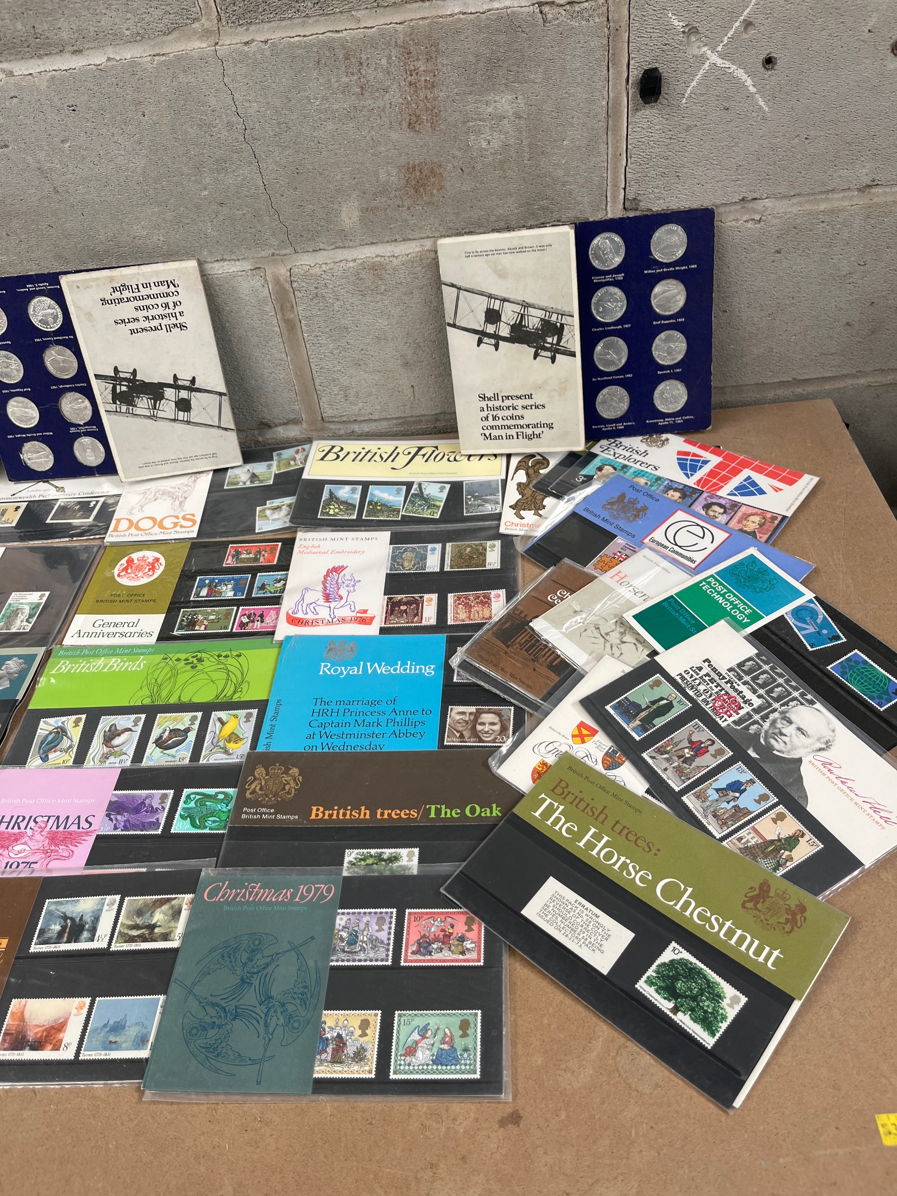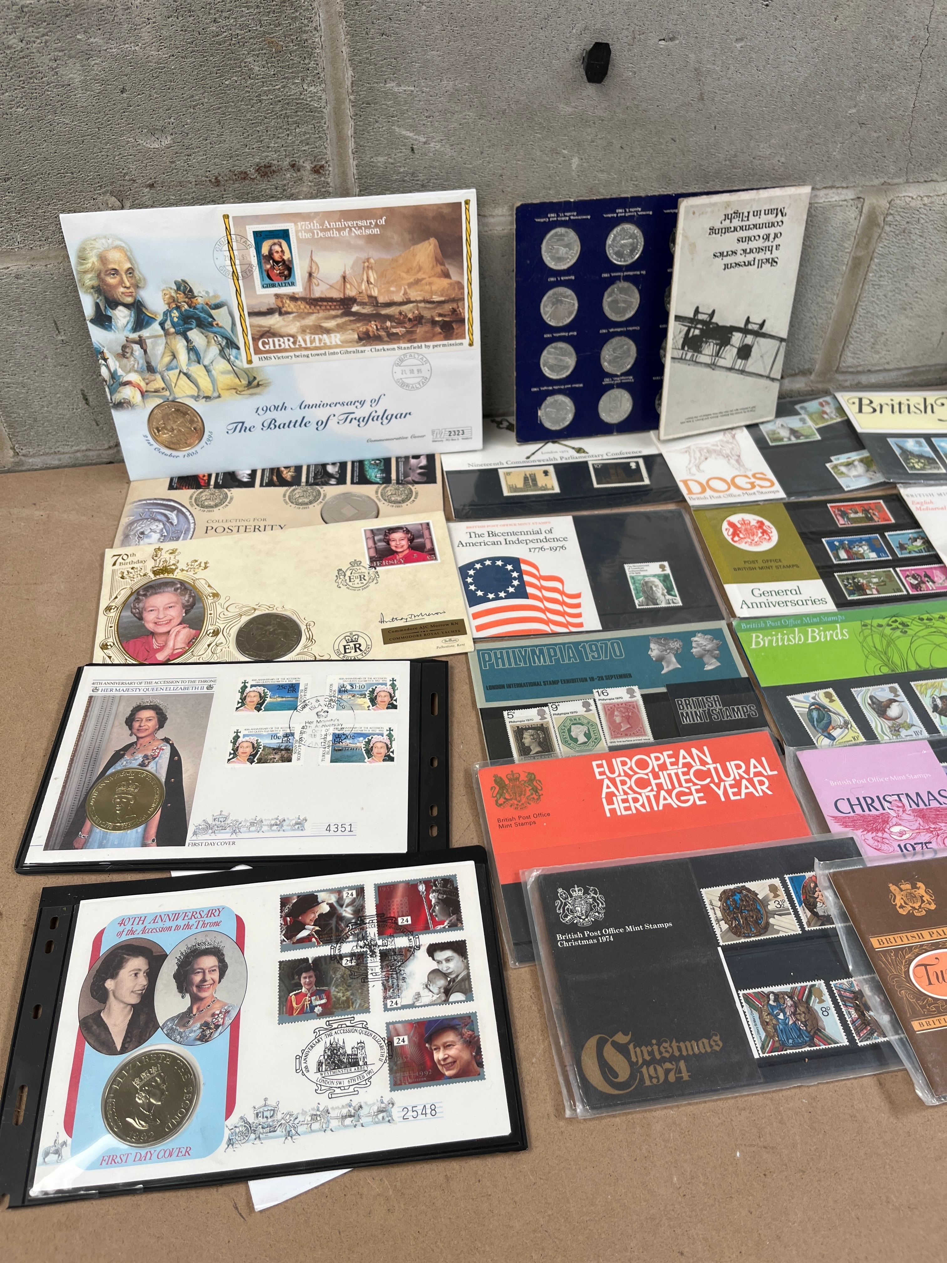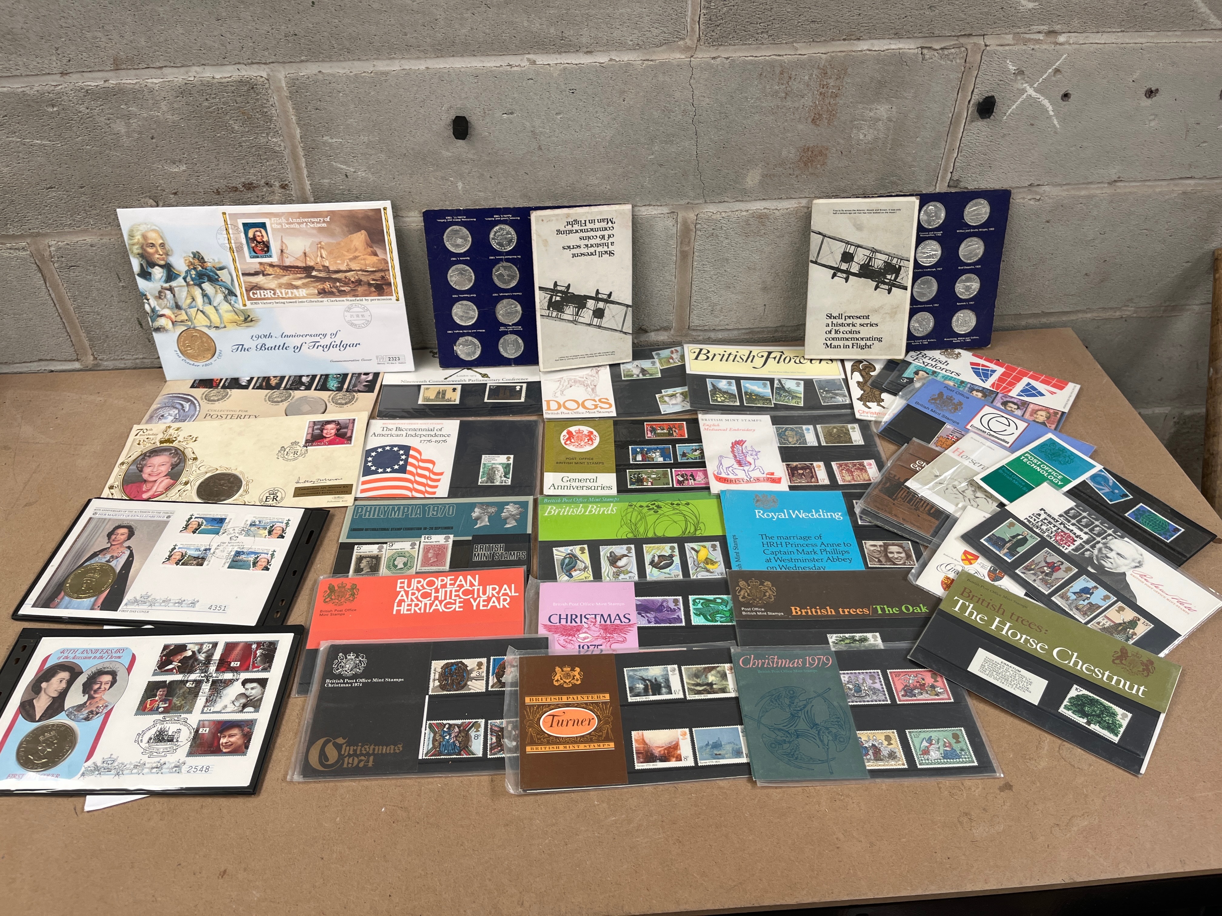 This collection comprises a variety of philatelic and numismatic items, predominantly British, dating from the mid-to-late 20th century. It features numerous mint stamp sets, first day covers, and presentation packs, often accompanied by coins. The items are housed in protective plastic sleeves and cardboard folders. Visible themes and titles include “60th Anniversary of The Battle of Trafalgar,” “Gibraltar,” “Man In Flight,” “British Flowers,” “DOGS,” “General Anniversaries,” “British Birds,” “The Bicentennial of American Independence 1776-1976,” “PHILATELIA 1970,” “Royal Wedding” (specifically for Princess Anne’s 1973 marriage), “Christmas 1974” and “1979,” “EUROPEAN ARCHITECTURAL HERITAGE YEAR,” “British trees” (Oak, Horse Chestnut), and “Turner.” Textual markings such as “4351” and “2548” are present on some covers.