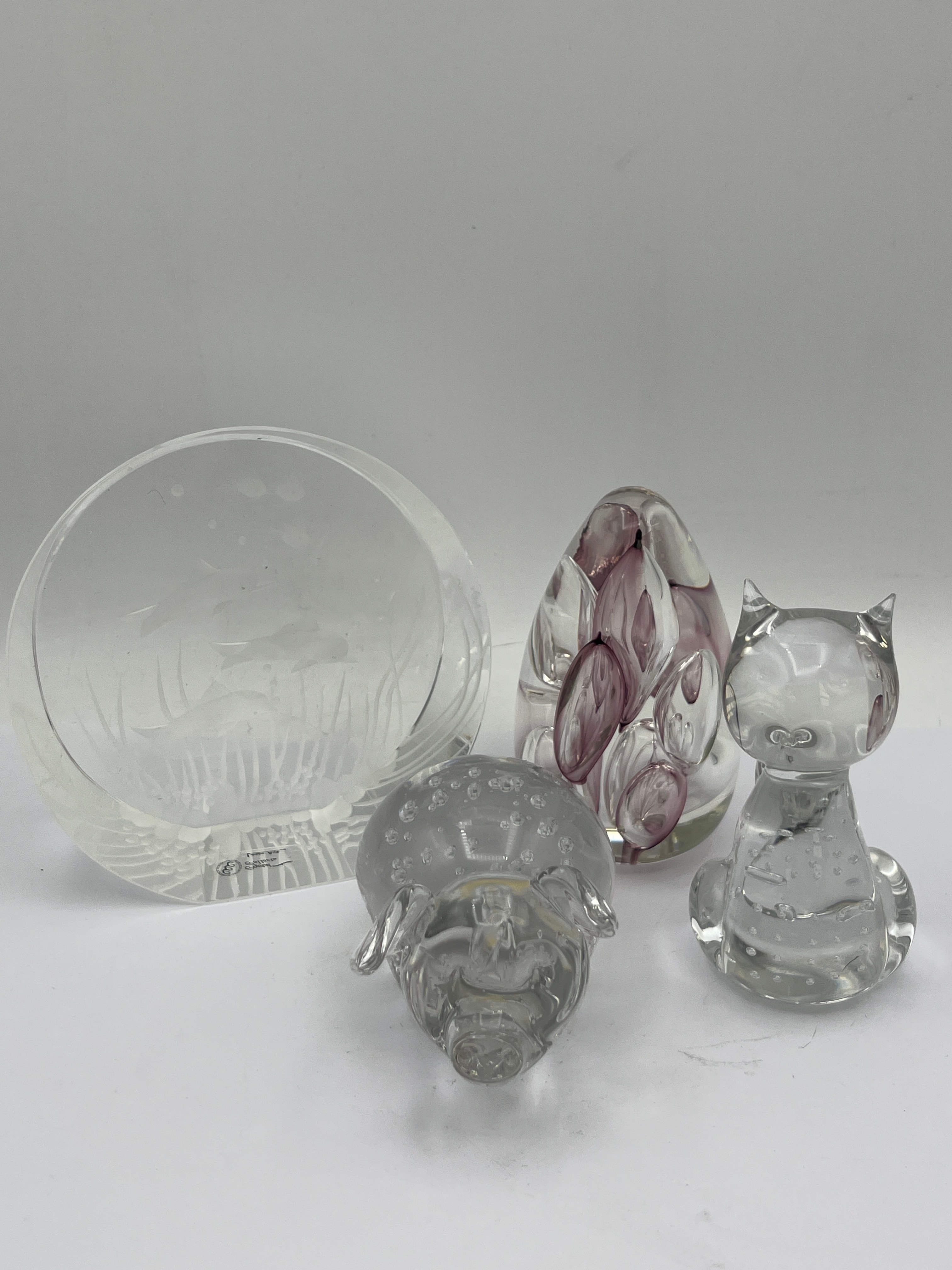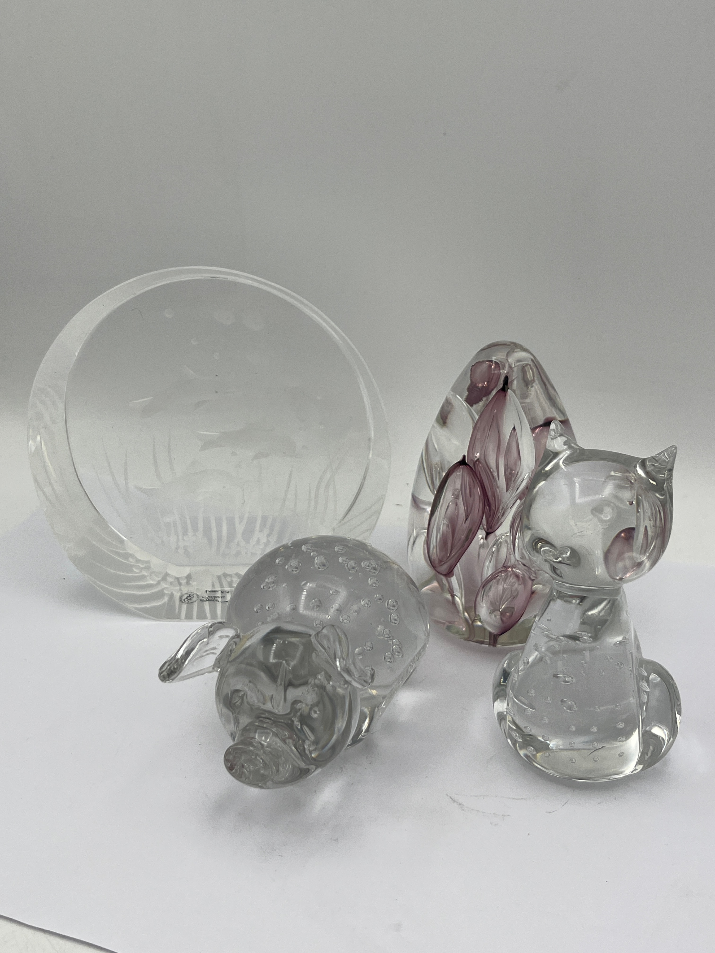 A collection of four contemporary decorative glass objects. Comprising a circular clear glass bowl or dish, etched with an aquatic scene depicting fish and reeds, marked on the base "KOSTA BODA" and "Designed by Bertil Vallien" (Swedish, modern design). Accompanying this are three smaller clear glass figures: a pig figurine with controlled internal bubbles, an ovoid sculpture or paperweight with abstract internal purple/pink inclusions, and a sitting cat figurine also featuring controlled internal bubbles.