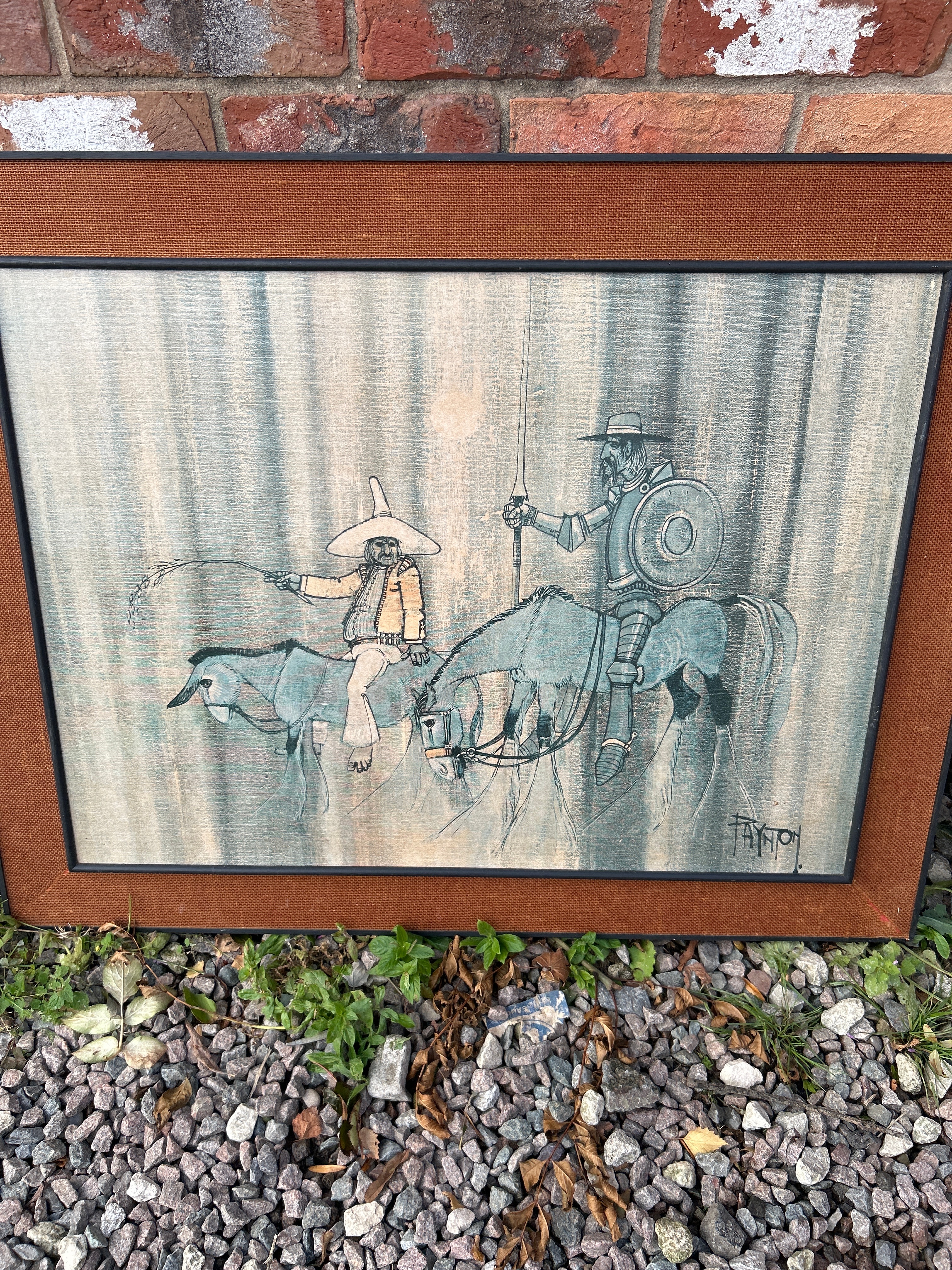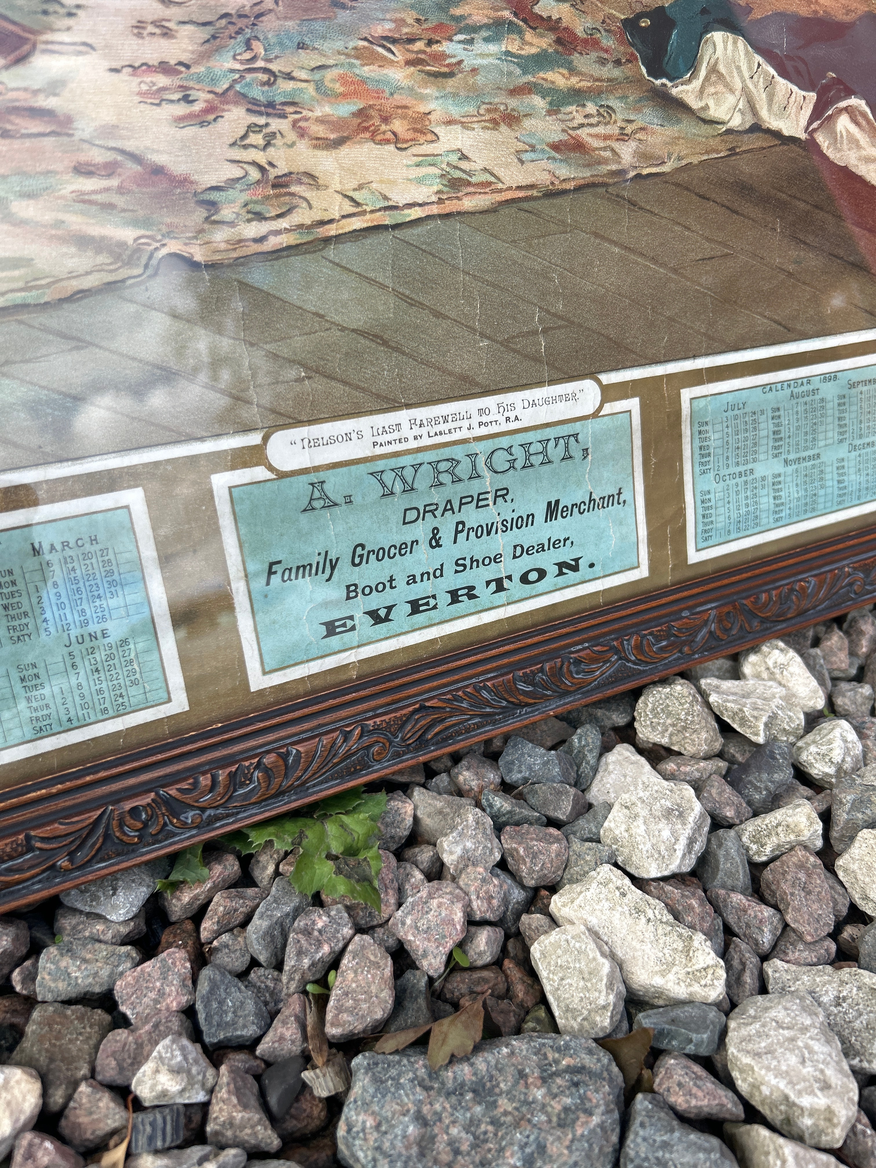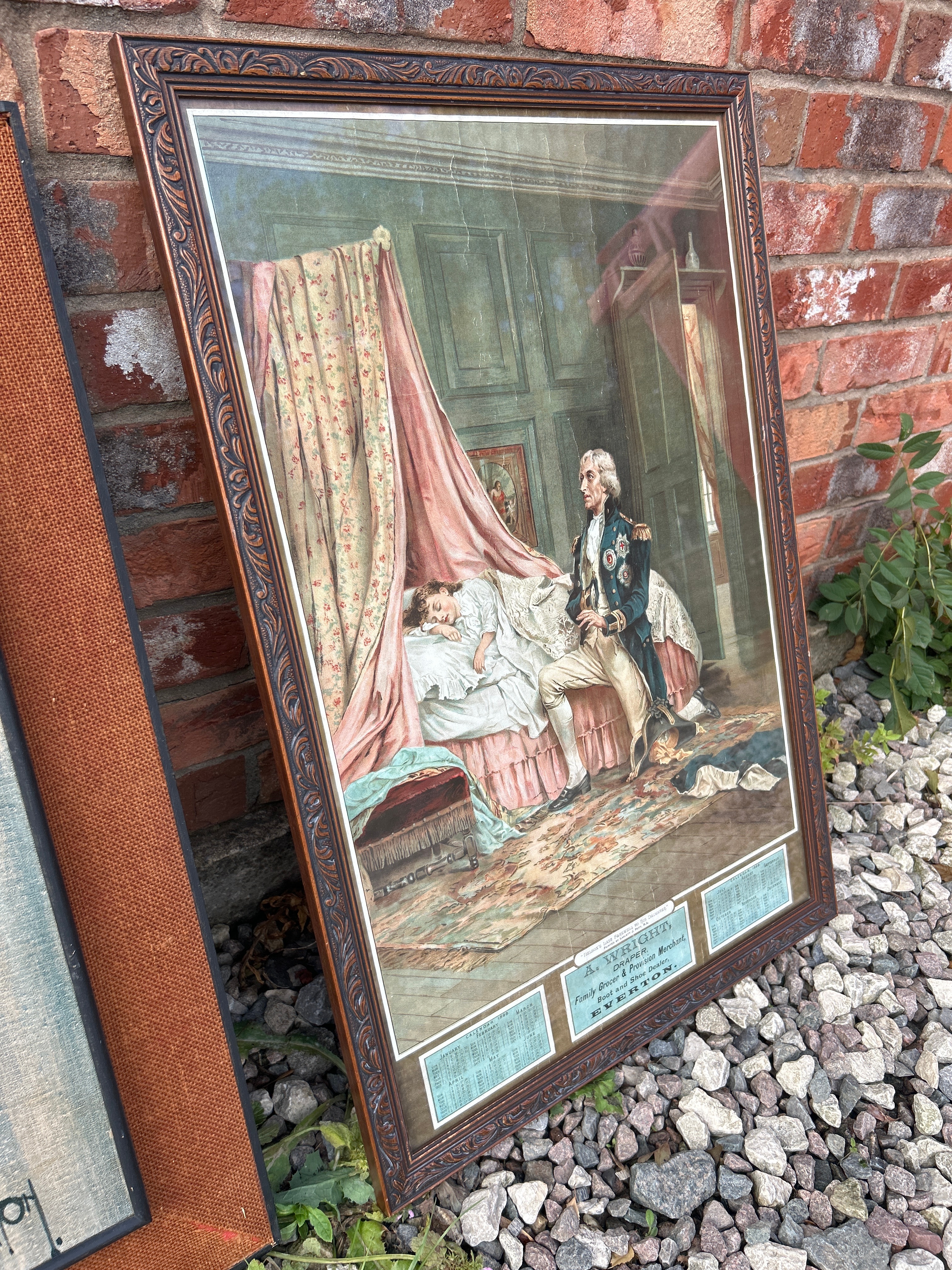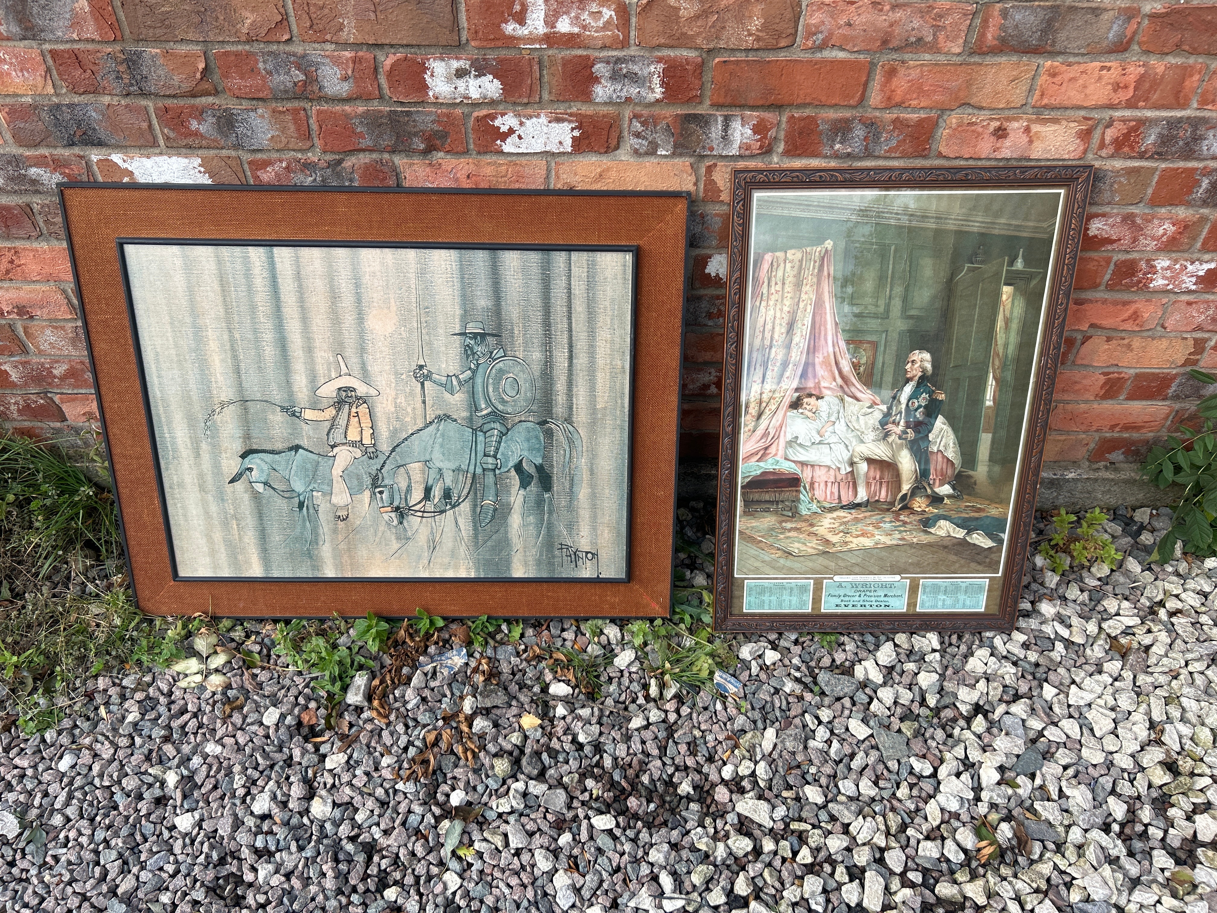 Two framed artworks are presented. The first is a Mid-Century print attributed to Colin Paynton, depicting two figures on horseback and a donkey, evocative of Don Quixote and Sancho Panza. The print is signed “FAYON” in the lower right corner, set within a brown wooden frame with a fabric-like inner border. The second piece is a framed print, titled “NELSON’S LAST FAREWELL TO HIS DAUGHTER,” noted as “PAINTED BY LASLETT J. POTT, R.A.” This print also functions as an advertisement for “A: WRIGHT, DRAPER, Family Grocer & Provision Merchant, Boot and Shoe Dealer, EVERTON,” and prominently features calendars for 1899. It is housed in an ornate dark wooden frame with a decorative border, under glass.