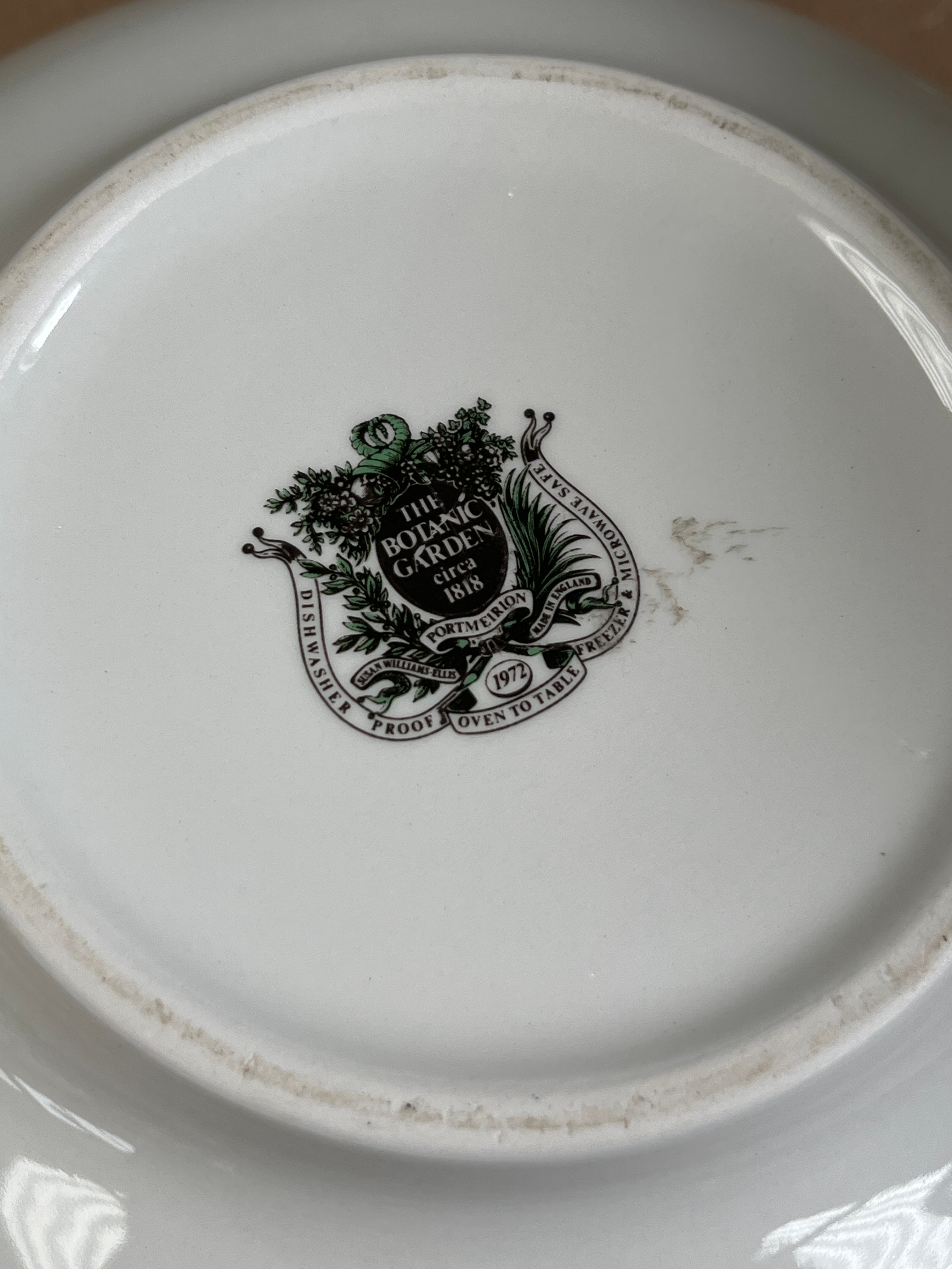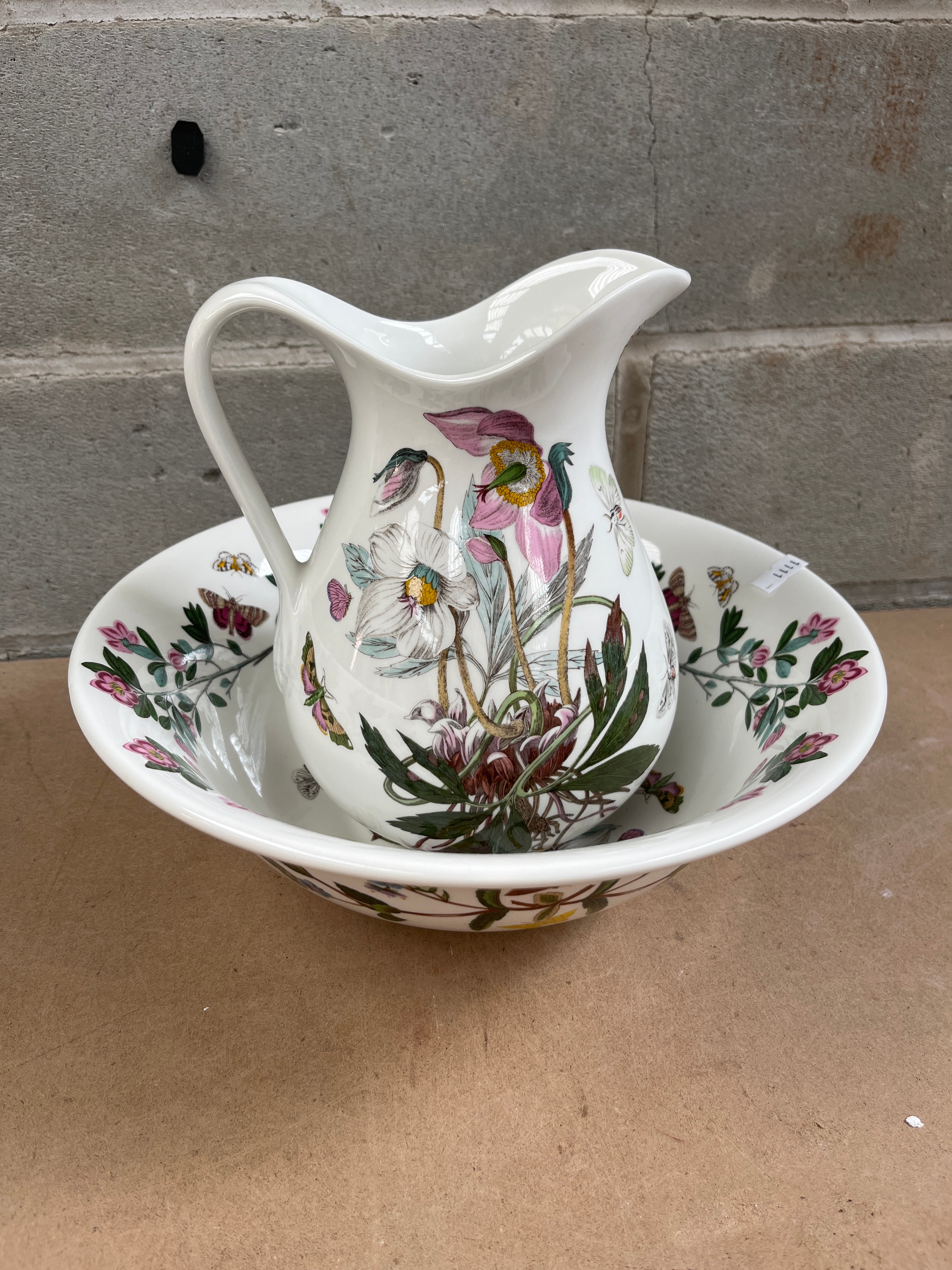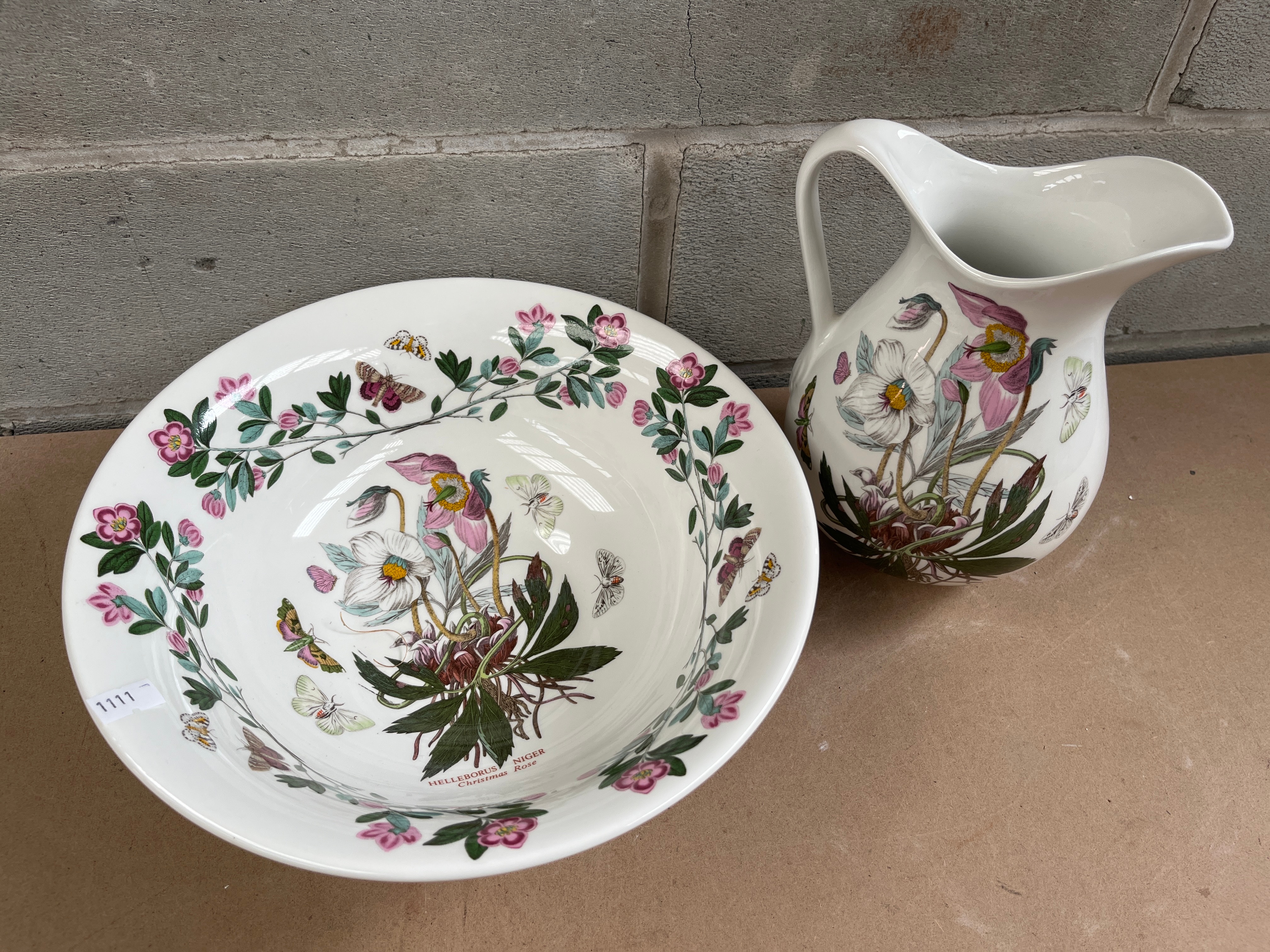 A Portmeirion ‘Botanic Garden’ ‘Christmas Rose’ pitcher and basin set, crafted from white ceramic, likely porcelain. The set is adorned with vibrant, detailed, and naturalistic botanical illustrations featuring “HELLEBORUS NIGER” (Black Hellebore or Christmas Rose) and various butterflies. The basin’s base bears the maker’s mark “THE BOTANIC GARDEN” by “PORTMEIRION, ENGLAND,” designed by “SUSAN WILLIAMS-ELLIS” and dated “1972,” referencing “circa 1818” for the botanical motif. The mark also indicates the items are “MICROWAVE SAFE,” “DISHWASHER PROOF,” “OVEN TO TABLE,” and “FREEZER.”