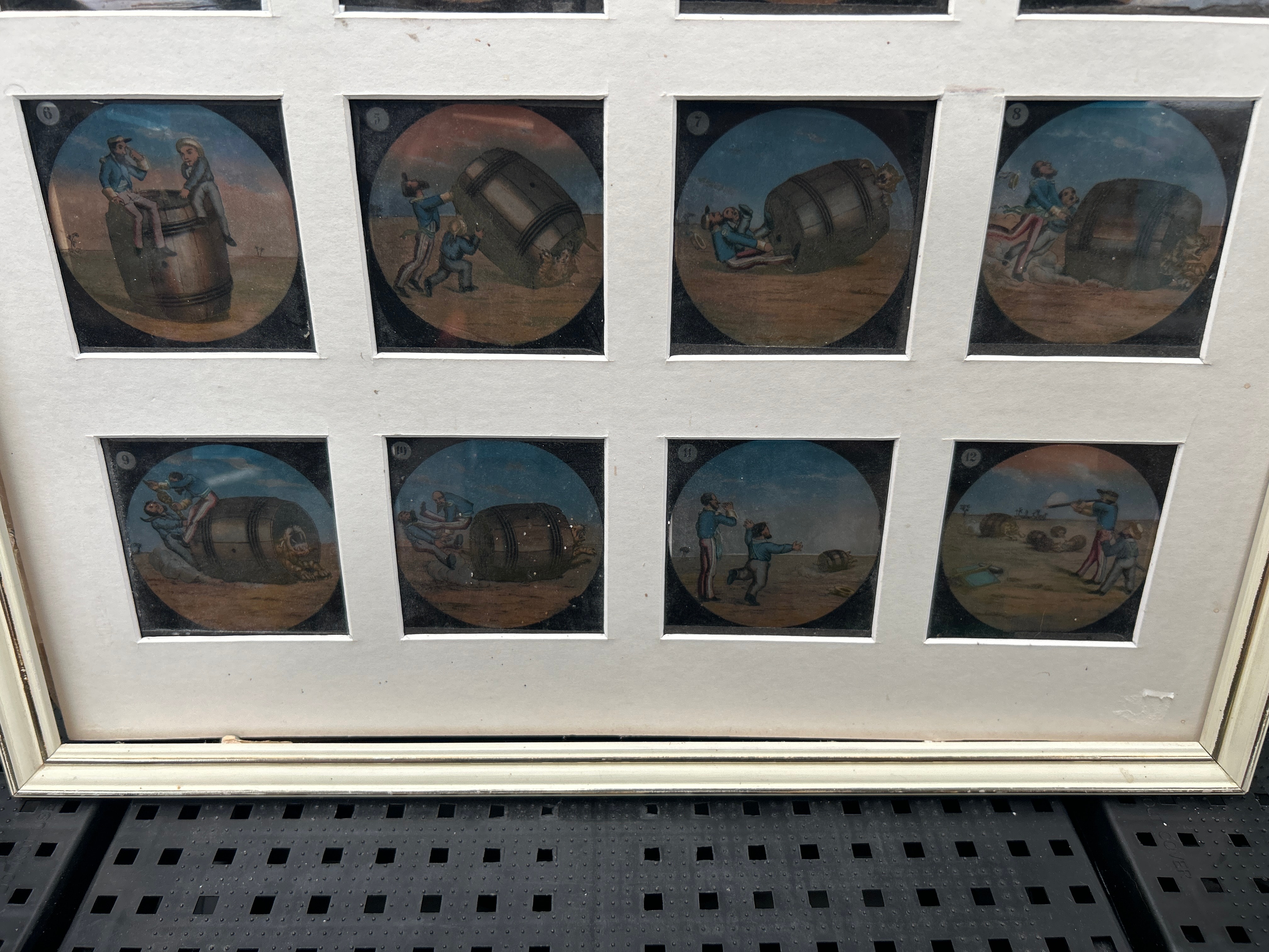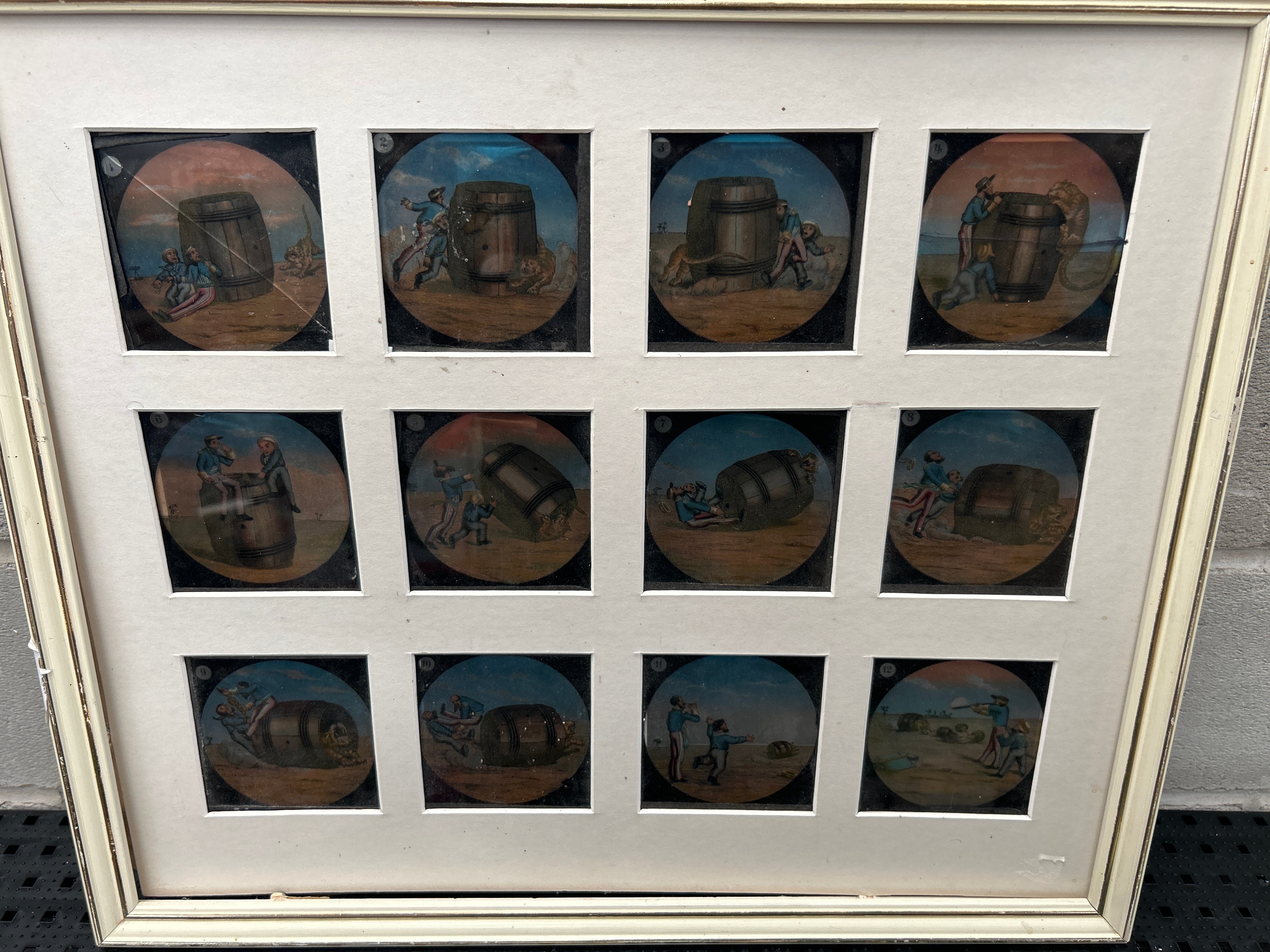 A set of twelve hand-colored glass magic lantern slides, presented in a cream-colored paper mat and an off-white painted wooden frame. Each circular slide is individually numbered from 1 to 12 in the upper left corner and depicts a sequential narrative featuring figures, possibly sailors, in period attire interacting with large barrels in an outdoor setting. The style and subject matter are indicative of the late 19th to early 20th century.