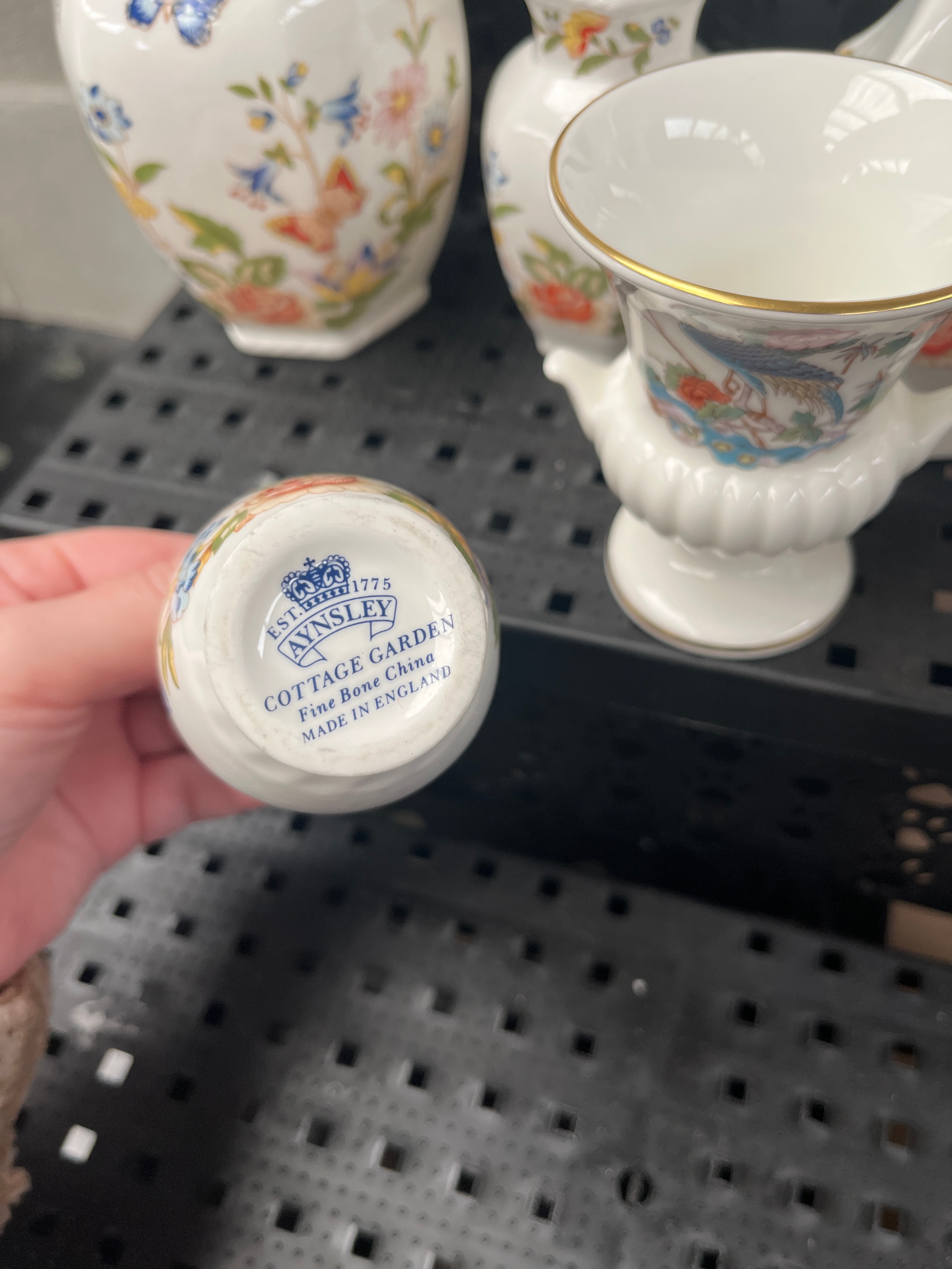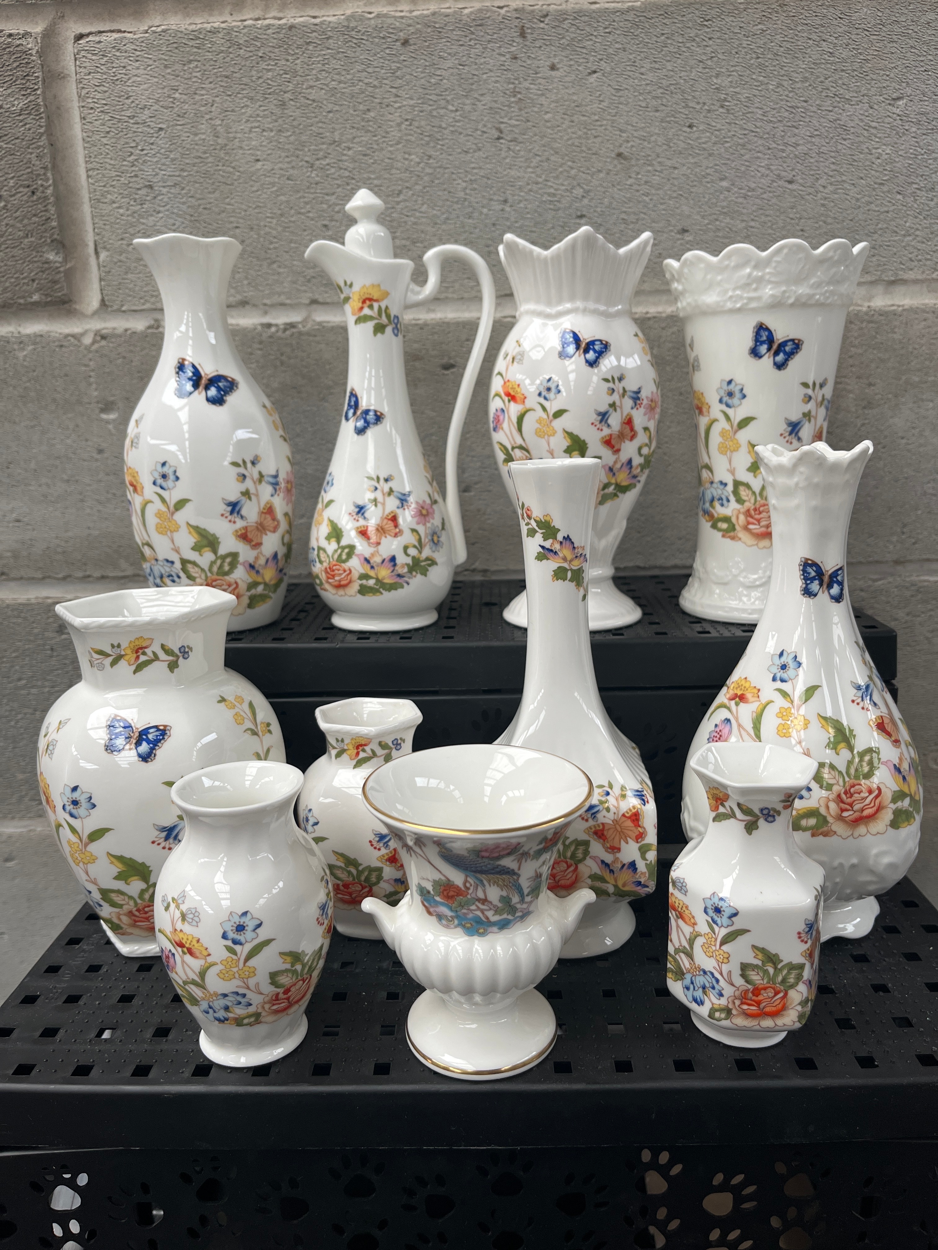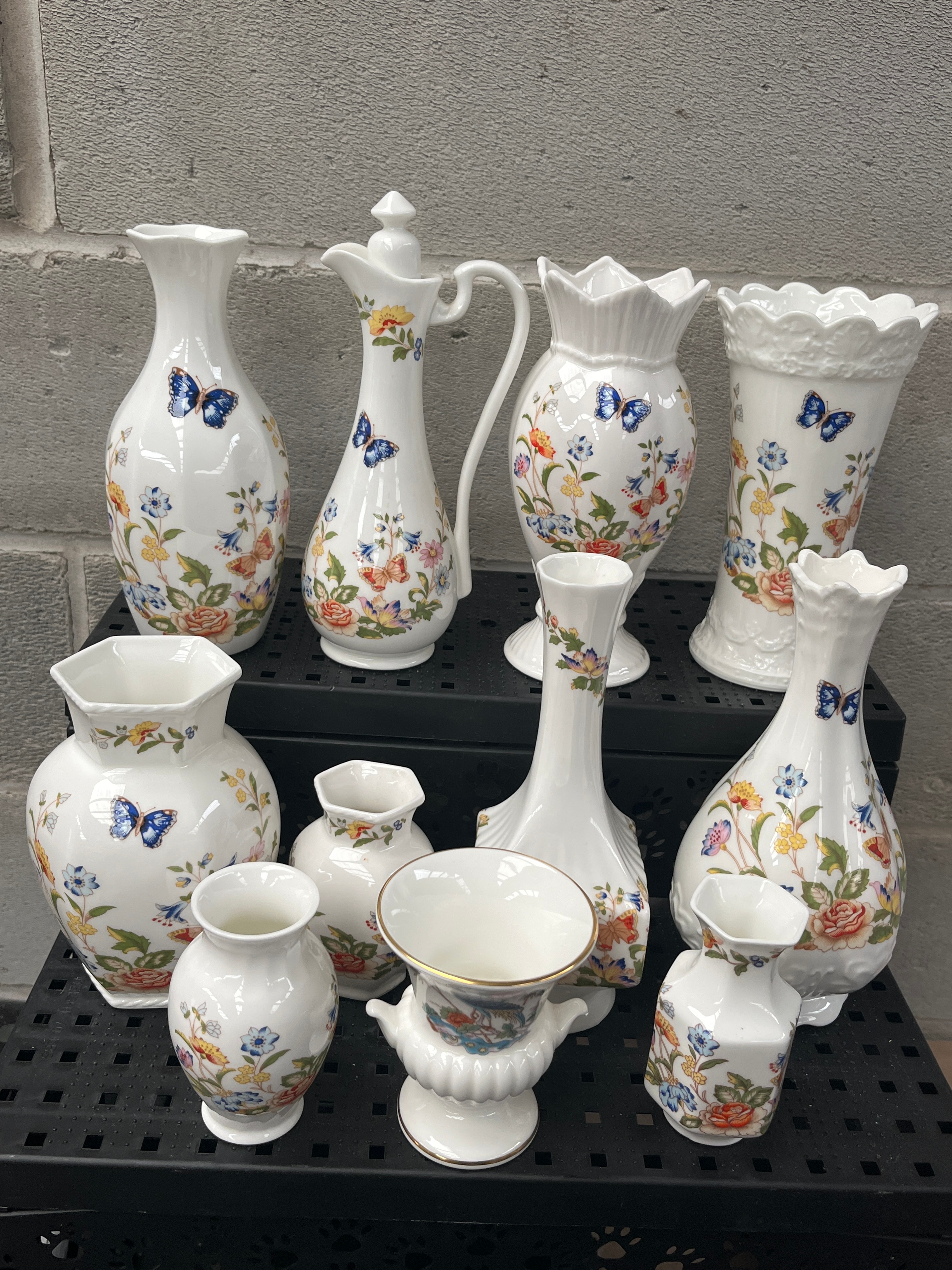A collection of twelve Aynsley ‘Cottage Garden’ fine bone china decorative vessels. The lot comprises primarily miniature to small-sized vases, alongside one handled pitcher and a small footed urn. Each piece is adorned with colorful transfer-printed or hand-painted decoration depicting butterflies and various floral motifs, including roses and wildflowers, presented in a traditional or romantic style. The forms vary, encompassing classic vase shapes with flared or scalloped rims, and a handled pitcher. One item bears a clear base mark identifying it as ‘AYNSLEY,’ ‘EST. 1775,’ ‘COTTAGE GARDEN,’ ‘Fine Bone China,’ and ‘MADE IN ENGLAND,’ indicating the manufacturer and pattern.