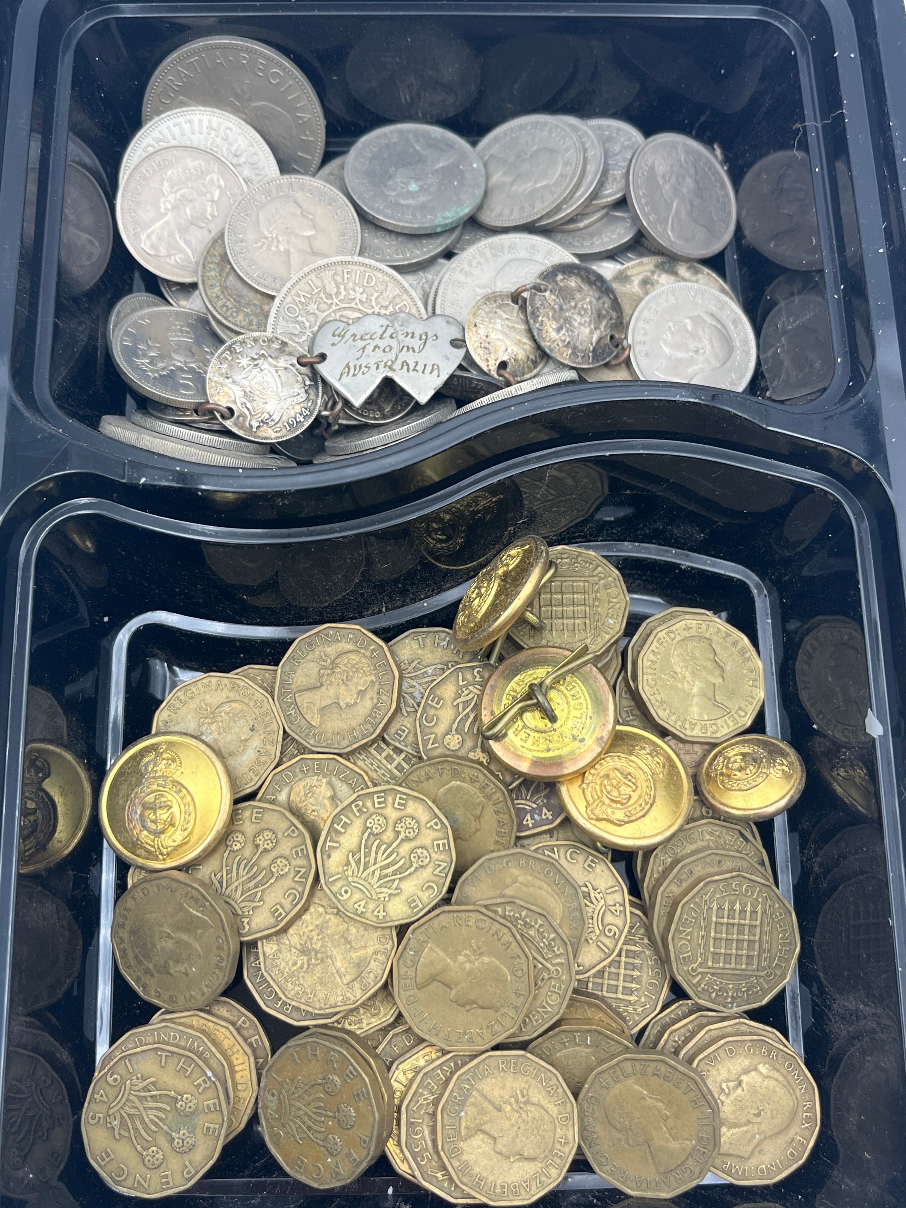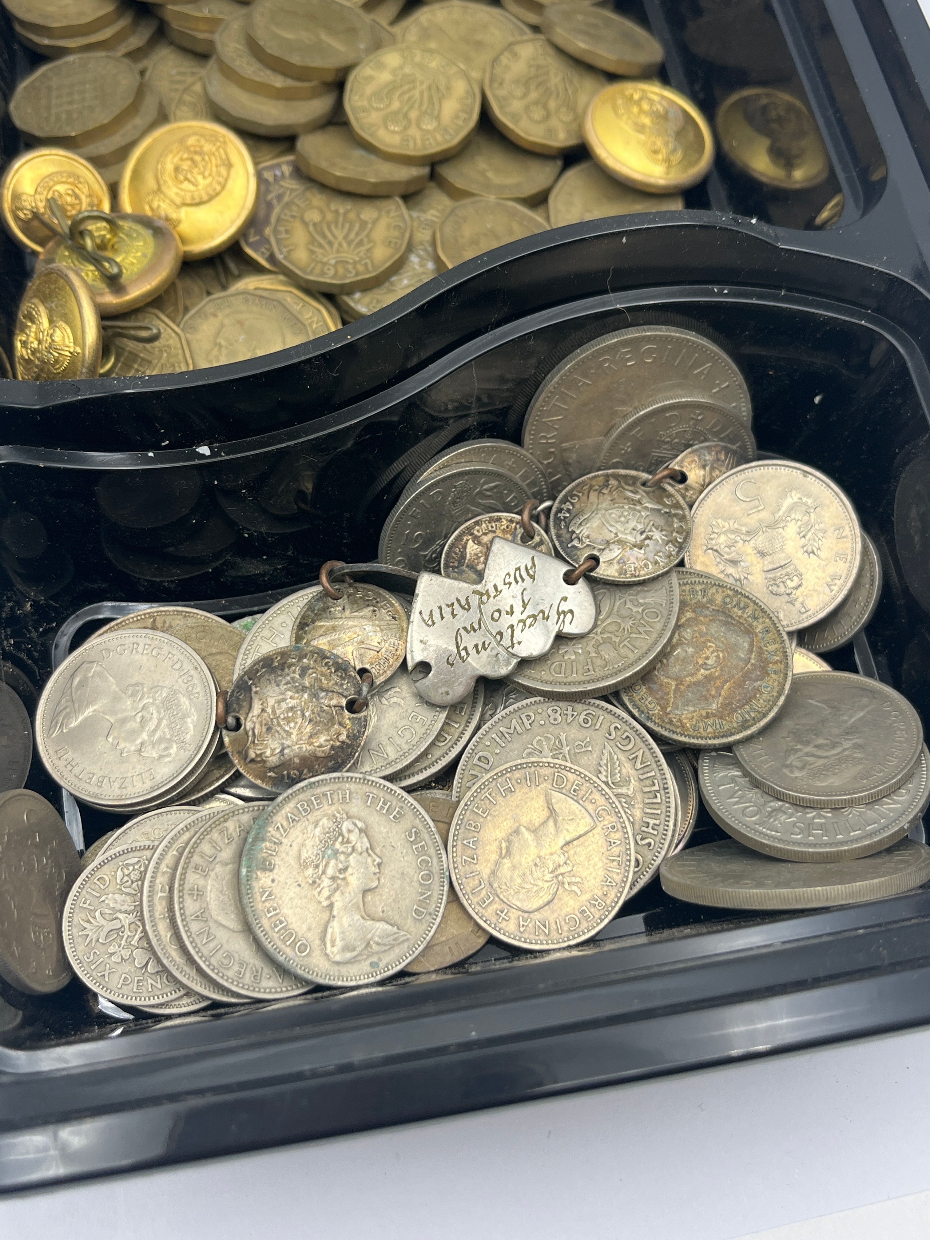 This lot presents a collection of uncirculated and circulated coins alongside several metal buttons, neatly arranged in a black plastic sorting tray with two main compartments. The upper compartment primarily contains silver-toned and some darker base metal coinage, predominantly British, featuring visible profiles of monarchs such as Victoria, George V (with visible text “GEORGIVS V D:G:BRITT:OMN:REX F:D:IND:IMP”), and Elizabeth II (“ELIZABETH II DEI GRATIA REGINA”), indicating a 19th to 20th-century period. A notable heart-shaped metal charm, engraved with “Greetings from Australia,” is attached to a small cluster of these coins. The lower compartment, which includes a separate smaller tray, holds a larger quantity of brass or bronze-toned coins and several brass buttons with shanks. Coins in this section also display British monarchs, including Elizabeth II and George VI (one coin visibly dated 1948), with denominations like “THREE PENCE” and “ONE POUND” visible.