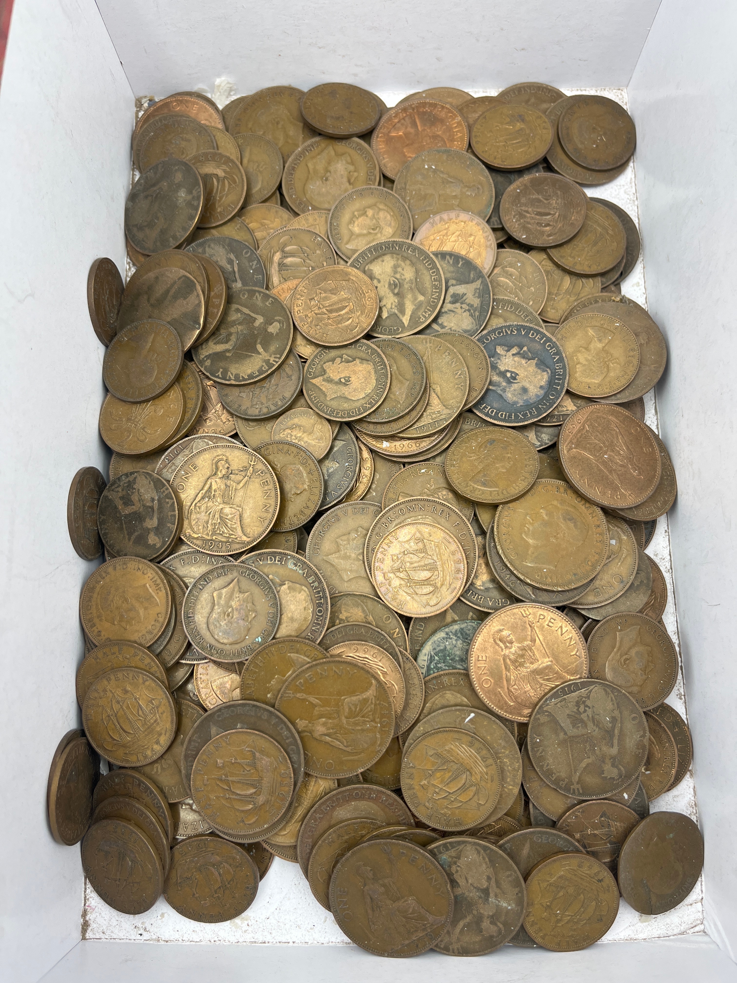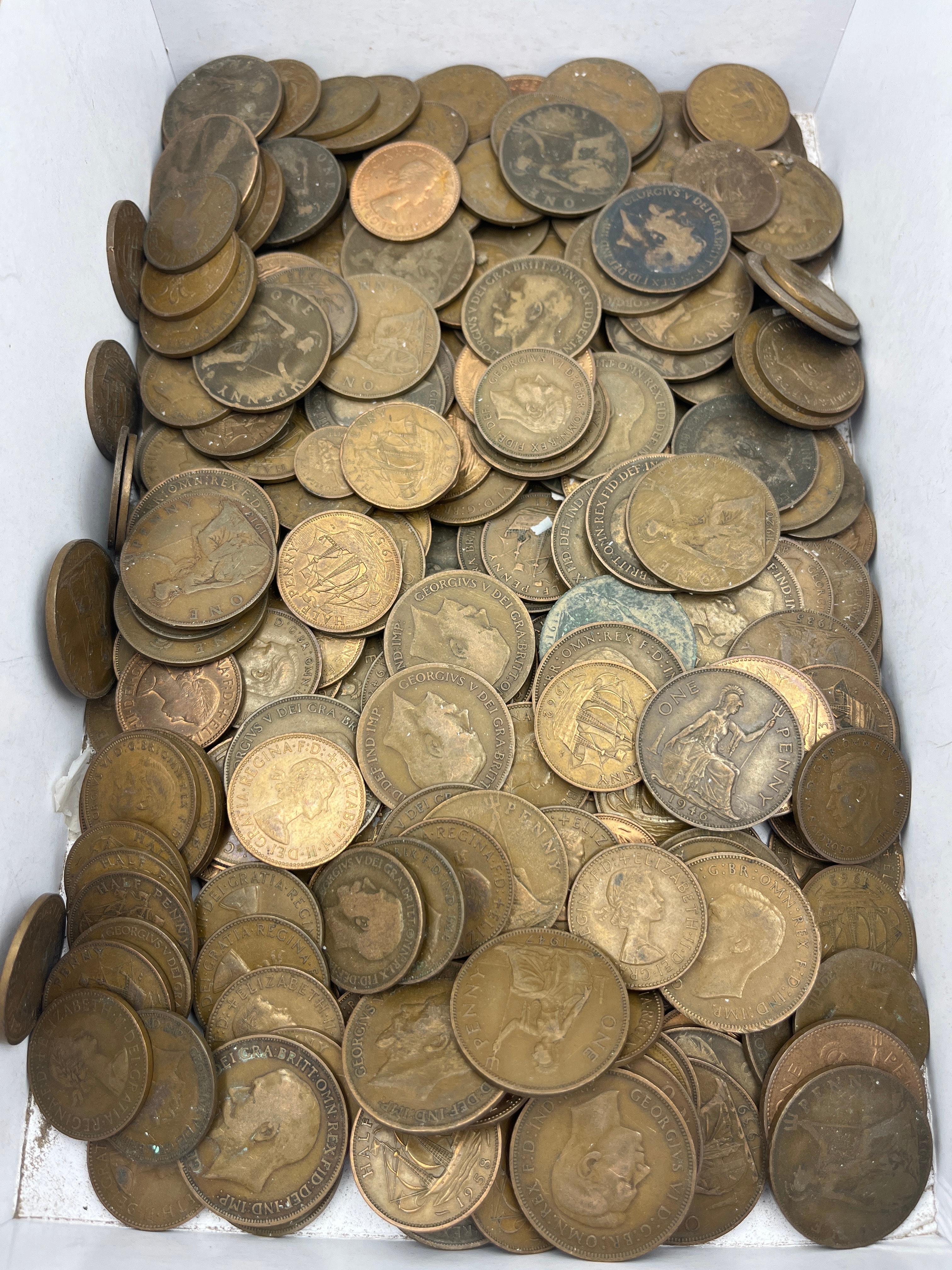 A substantial quantity of assorted British and Commonwealth One Penny coins, contained loosely within a white cardboard box. The collection includes examples from the reigns of Queen Victoria, King Edward VII, and King George V, with visible dates ranging from the late 19th century through the mid-20th century. Many coins feature the denomination ‘ONE PENNY’ on the reverse, often alongside a seated Britannia figure or a ship. Obverse sides display effigies of the respective monarchs, with identifiable Latin legends such as ‘VICTORIA DEI GRA BRITT REG F D’, ‘EDWARDVS VII D G BRITT OMN REX F D IND IMP’, and ‘GEORGIVS V D G BRITT OMN REX F D IND IMP’.