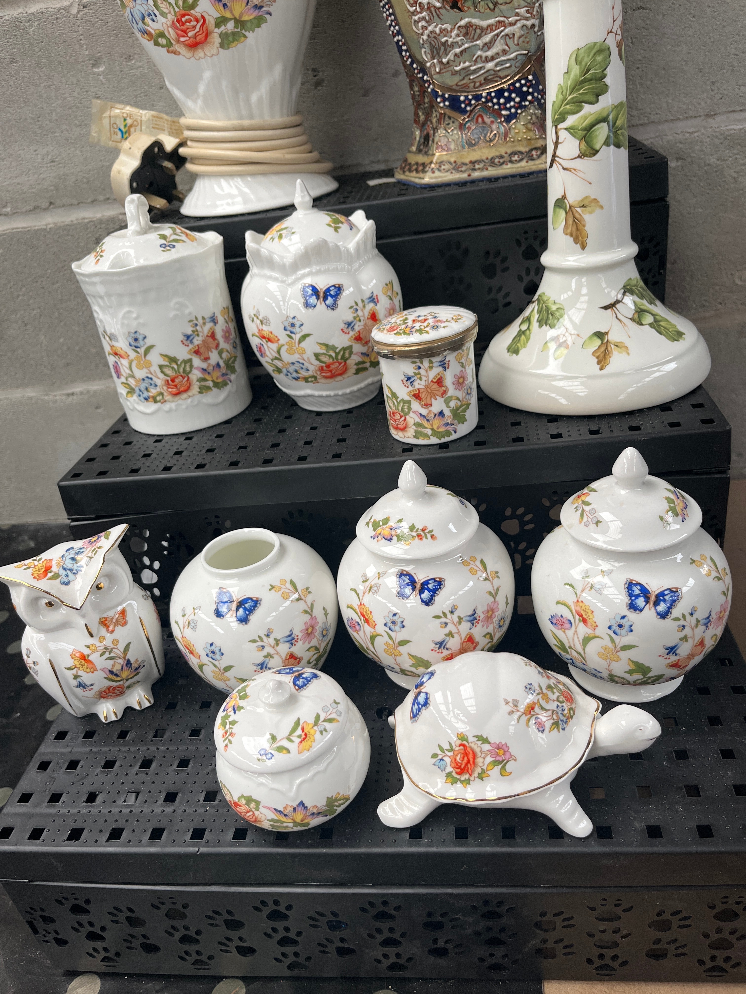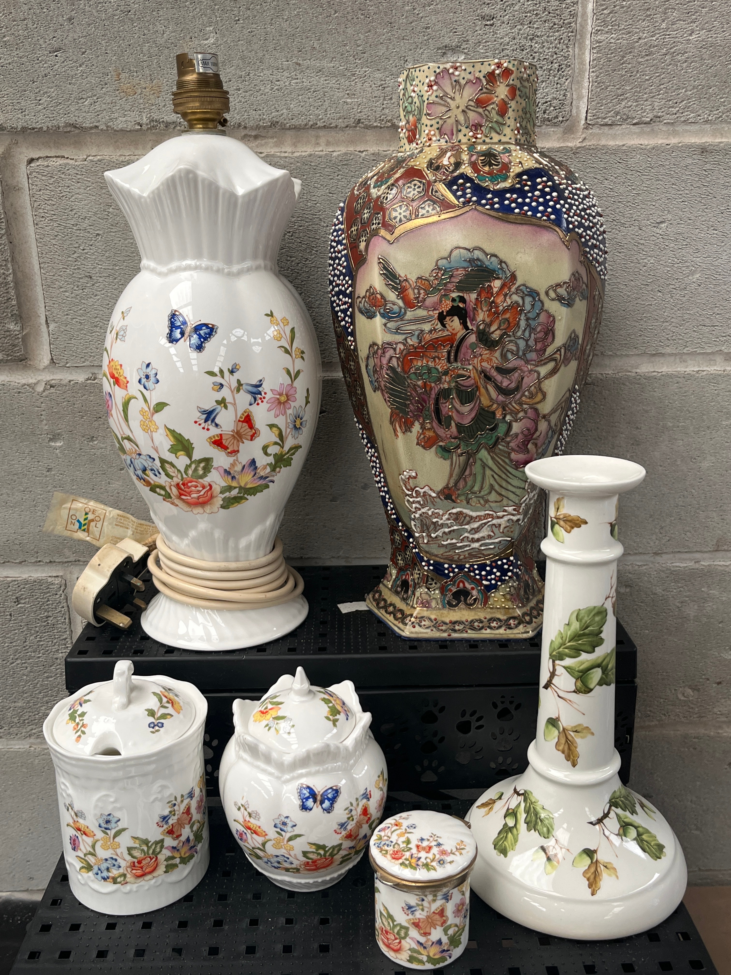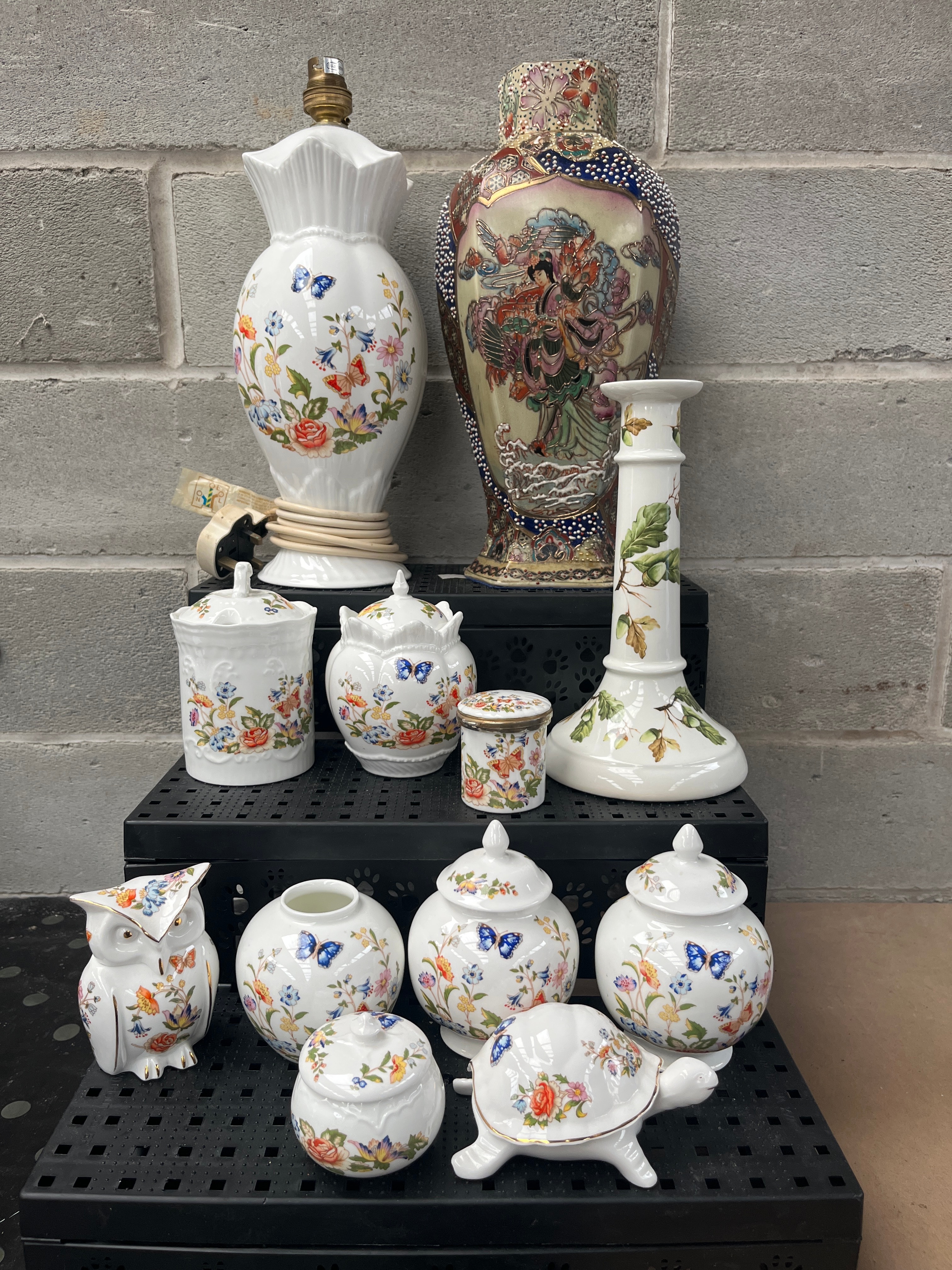 A collection of glazed ceramic items. The majority comprise a cohesive set of Aynsley ‘Cottage Garden’ items, predominantly in white with polychrome enameling, adorned with vibrant floral sprays and blue butterfly motifs. This set includes a fluted lamp base with an attached electrical cord and UK plug, marked ‘MADE IN TAIWAN R.O.C.’, ‘BS 1363’, and ‘CE’; a candlestick; two cylindrical lidded jars; two globular lidded jars; a small lidded box; a small open vase; a stylized owl figurine; and a lidded turtle figurine. Also included is a distinct, large, tall vase or lamp base with a more ornate, multi-figured Asian-inspired design in bold colors, gold accents, and patterned borders.