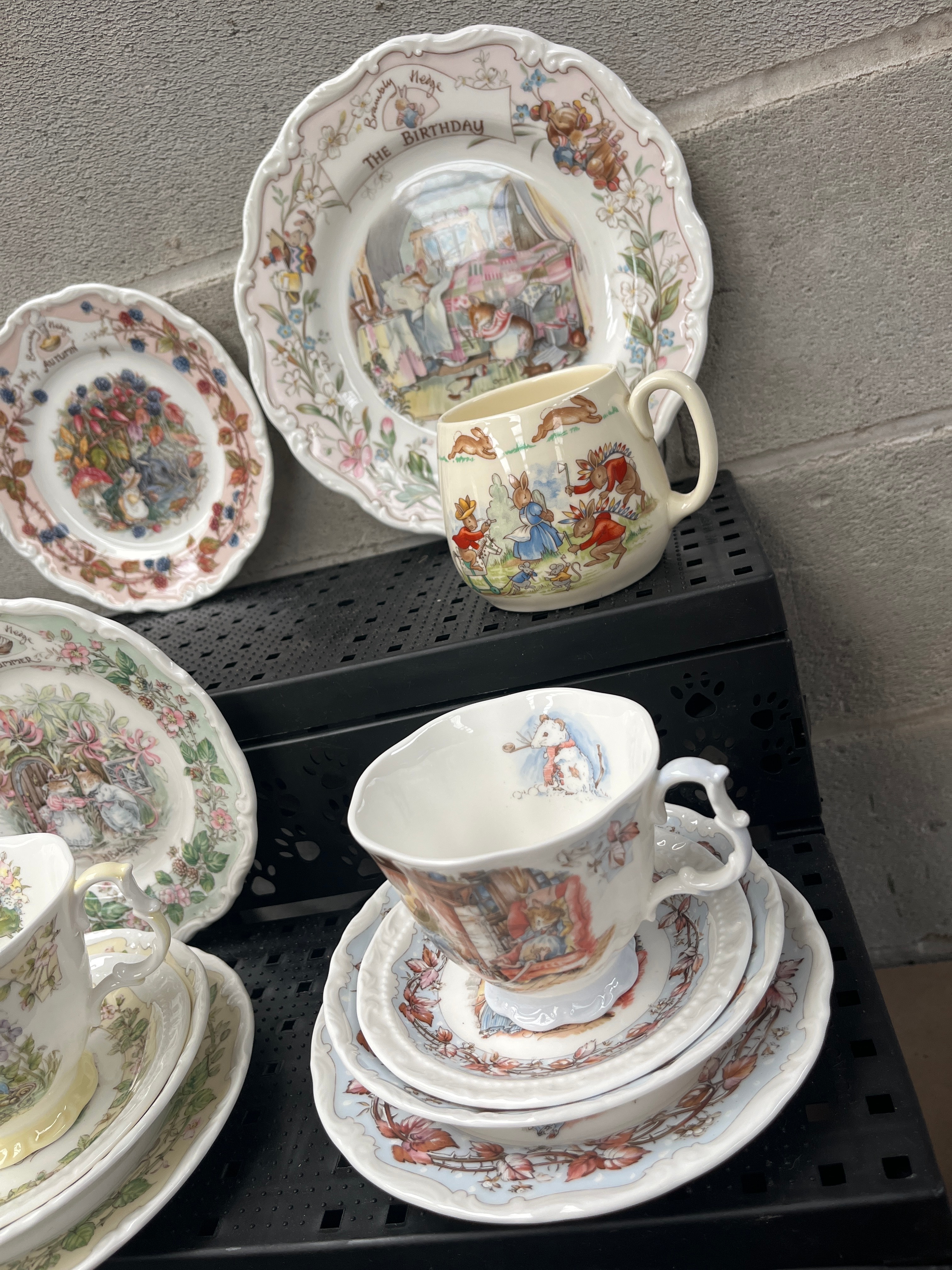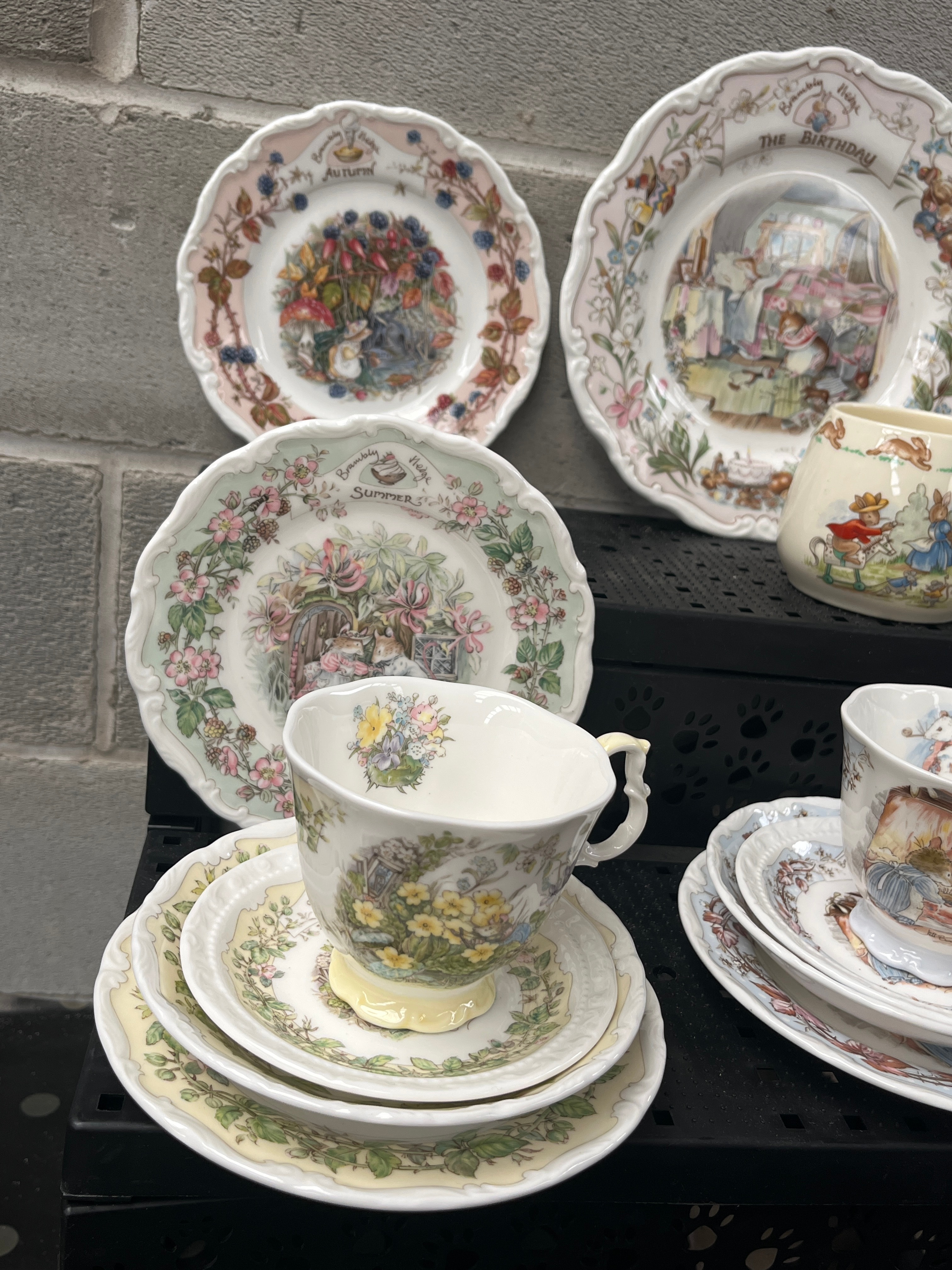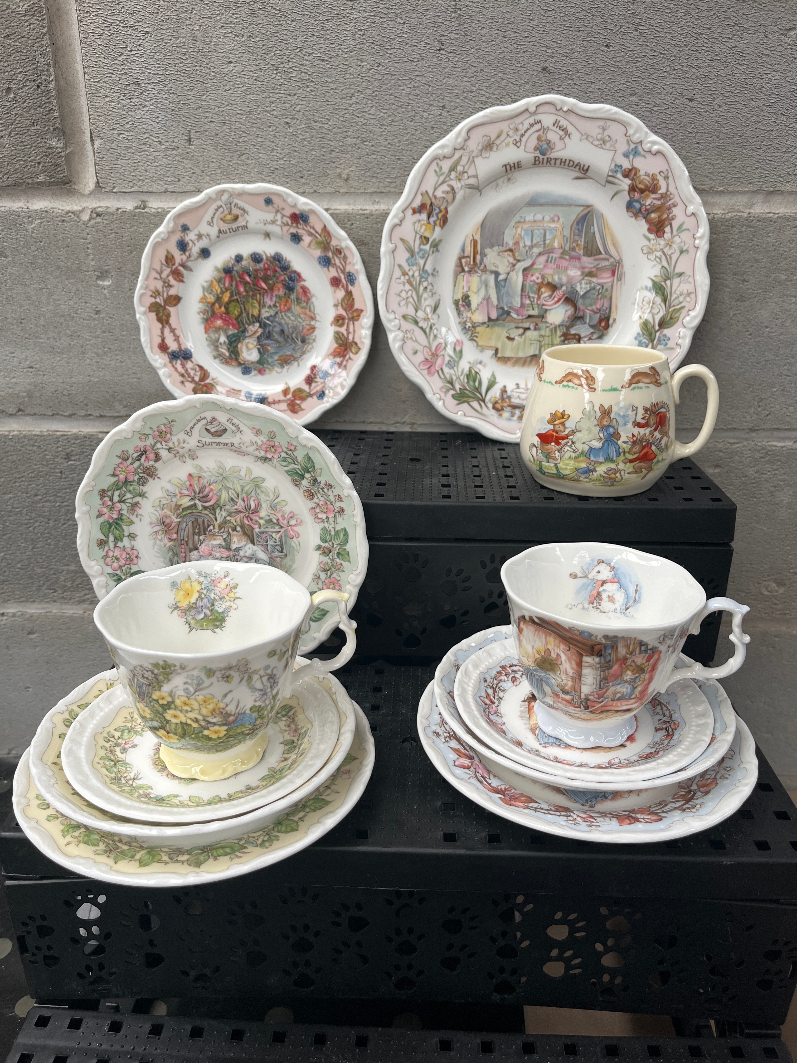 A collection of Royal Doulton Brambly Hedge porcelain tableware. This lot comprises three decorative plates with scalloped edges, centrally illustrated with pastoral or celebratory scenes and floral borders, marked “AUTUMN,” “SUMMER,” and “THE BIRTHDAY.” Also included are two teacups with their matching saucers, and one mug. The mug and one teacup set prominently feature anthropomorphic animal characters consistent with Beatrix Potter figures, while the other teacup set displays an all-over floral design.