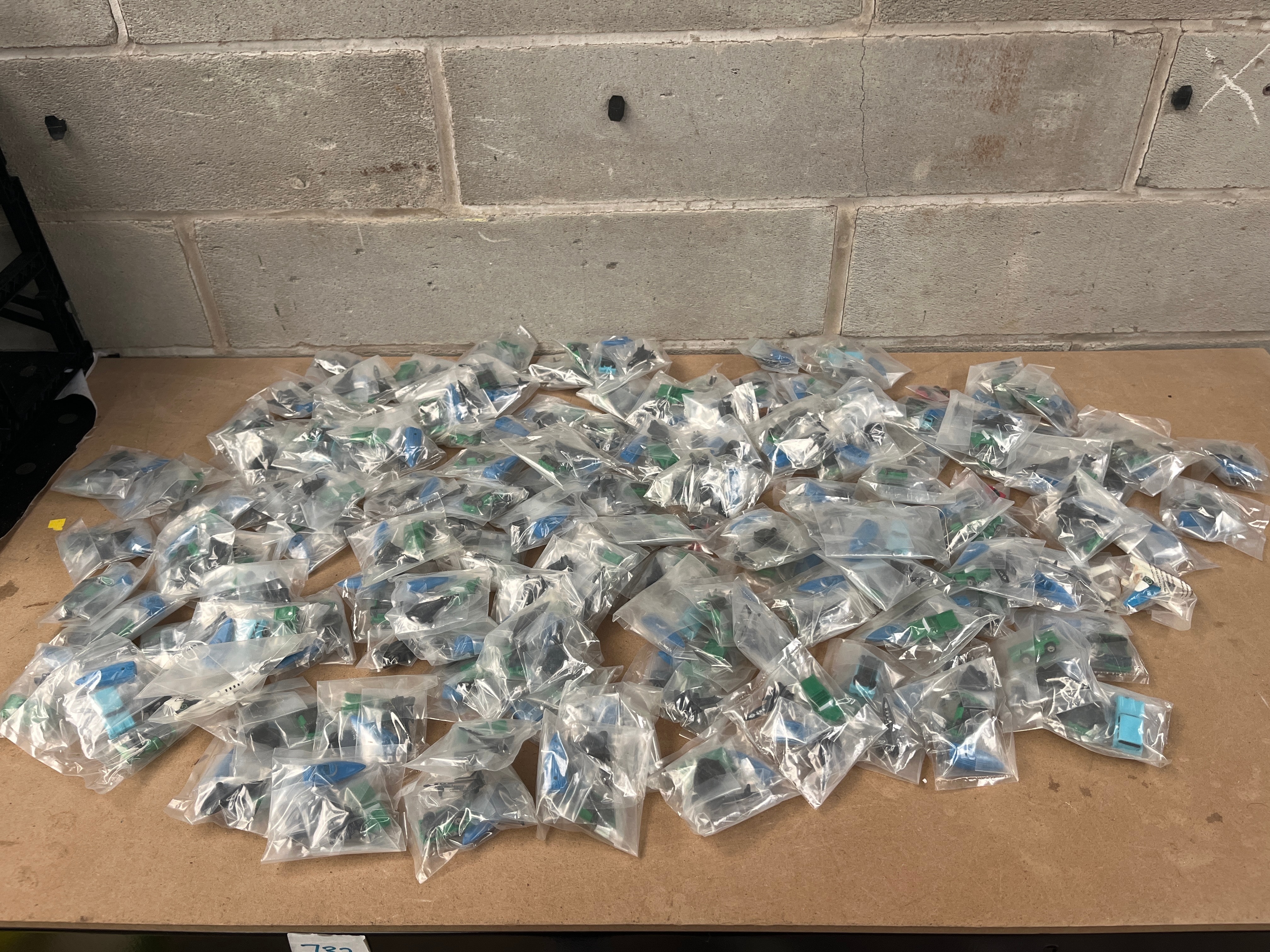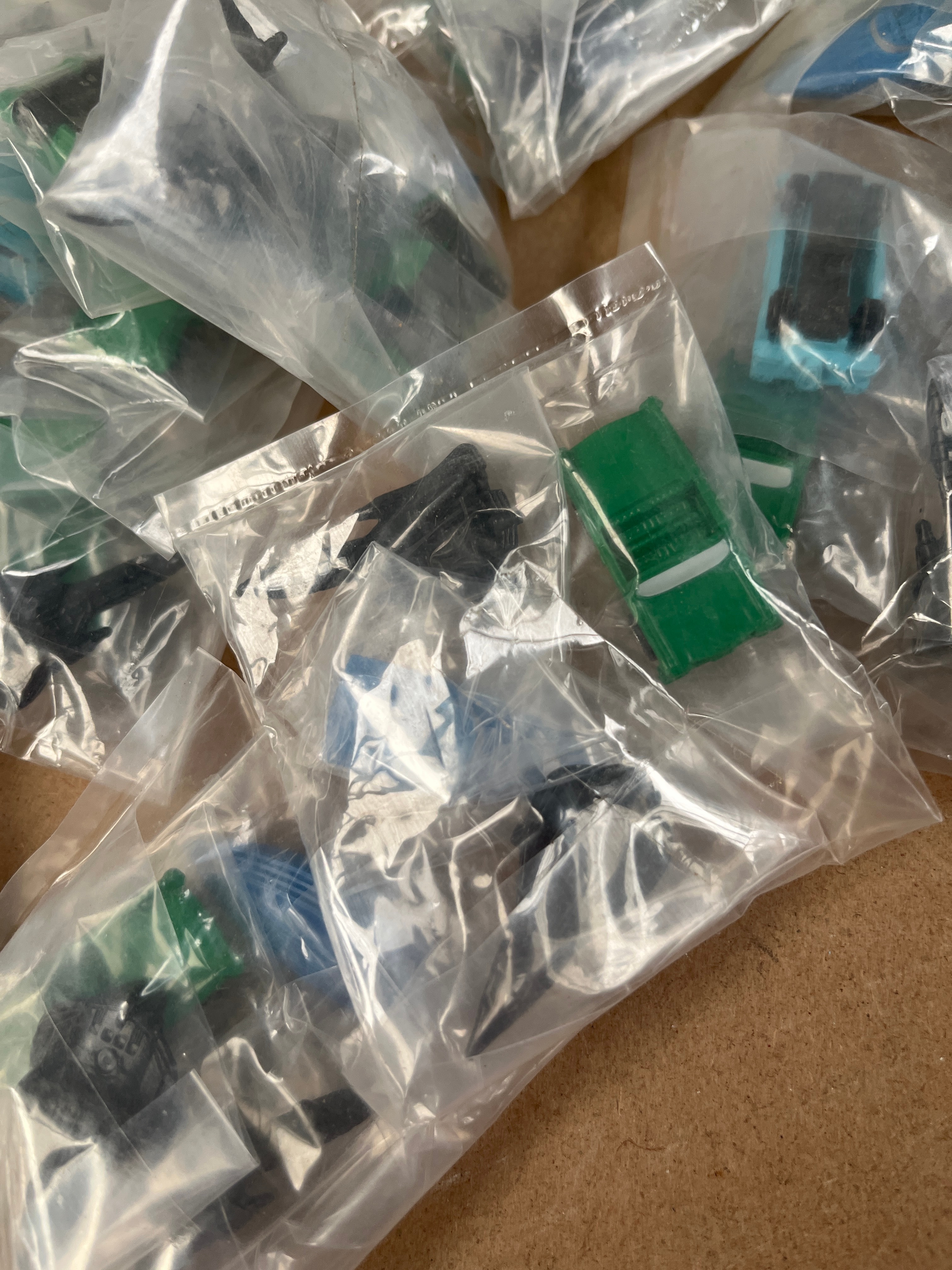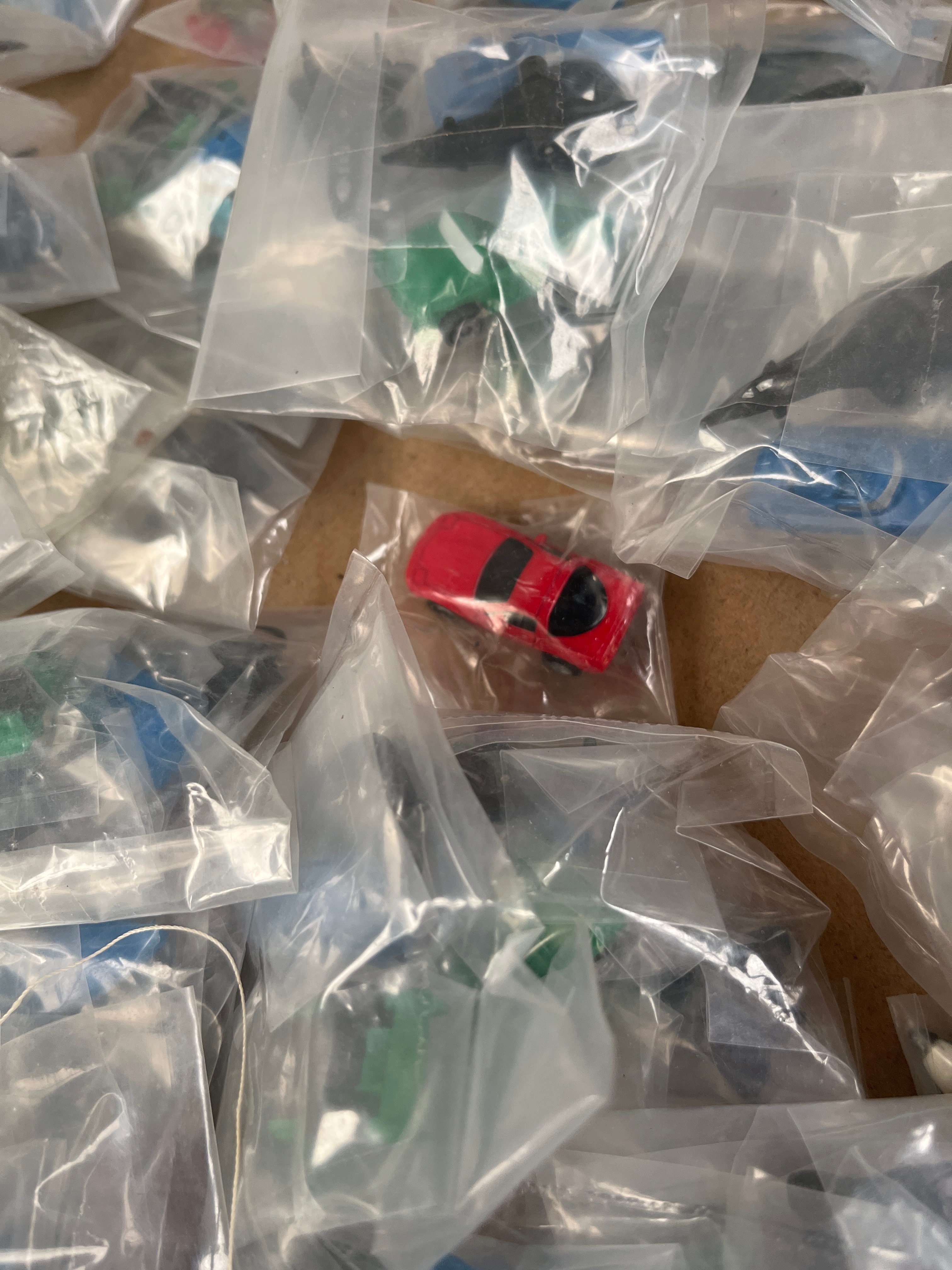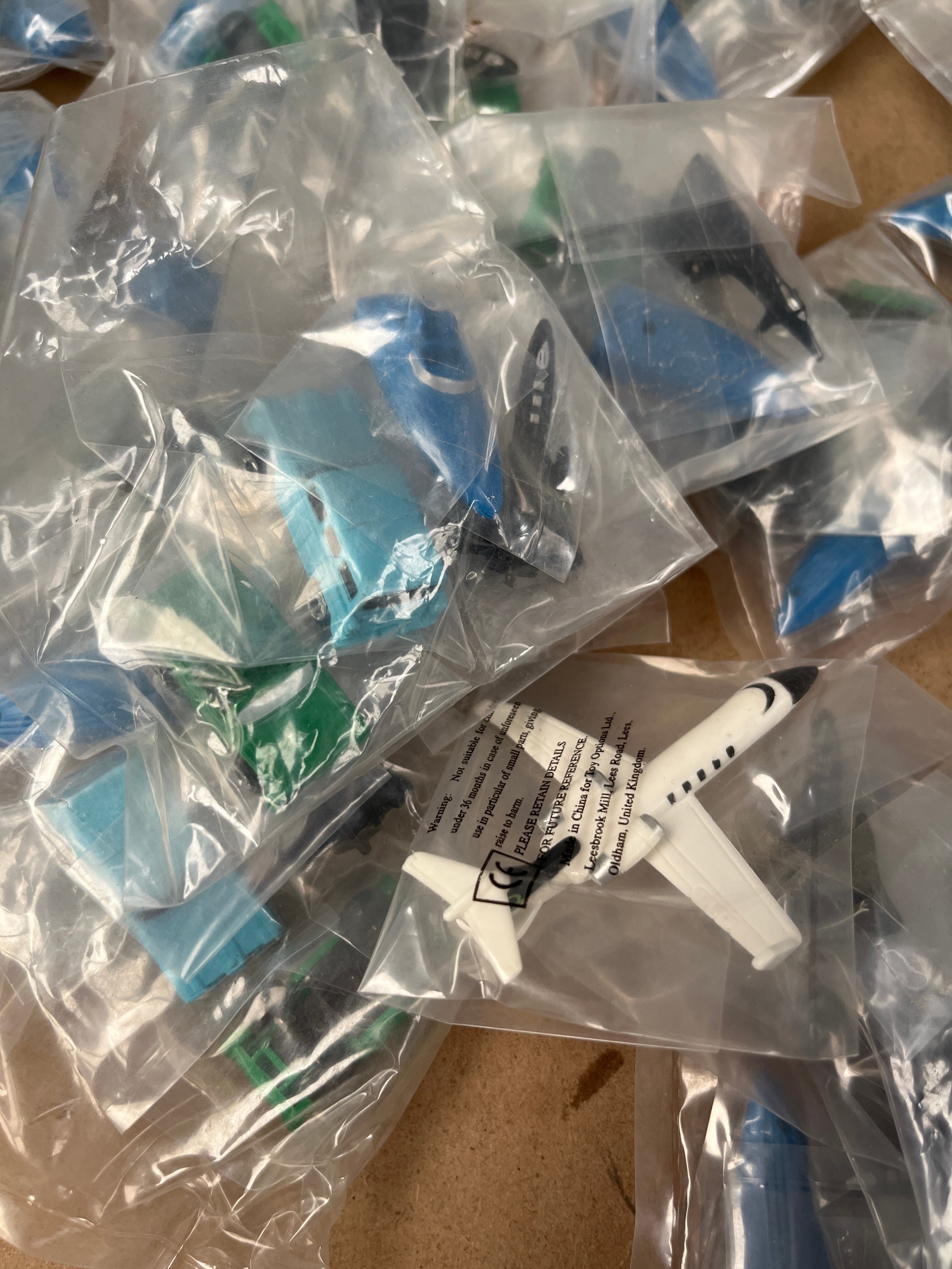 A collection of ‘Classic Miniatures’ toy vehicles, produced by Haydock House. The lot comprises approximately 60-80 individually sealed clear plastic bags, each containing a single small plastic miniature. The items are primarily toy vehicles, including various models of cars in red, green, and blue, alongside at least one white airplane model with black accents. Visible text on the packaging identifies the items as “CLASSIC MINIATURES,” produced by Haydock House, Haydock Mills, Haydock, Lancashire, WA11 9UD, United Kingdom. The packaging also includes a warning: “Not suitable for children under 3 years due to presence of small parts. Choking hazard. For ages 3+. Please retain information for future reference.”