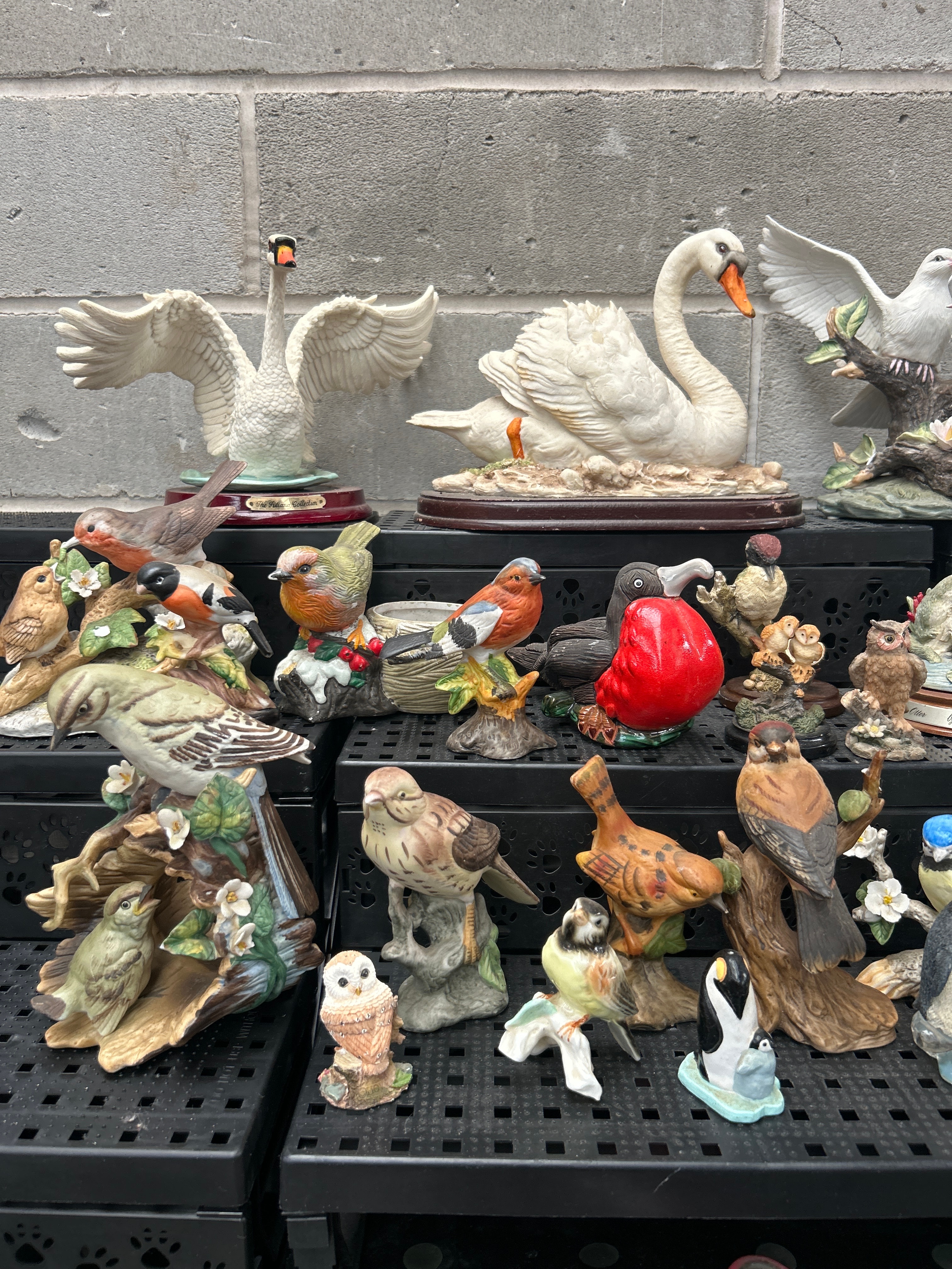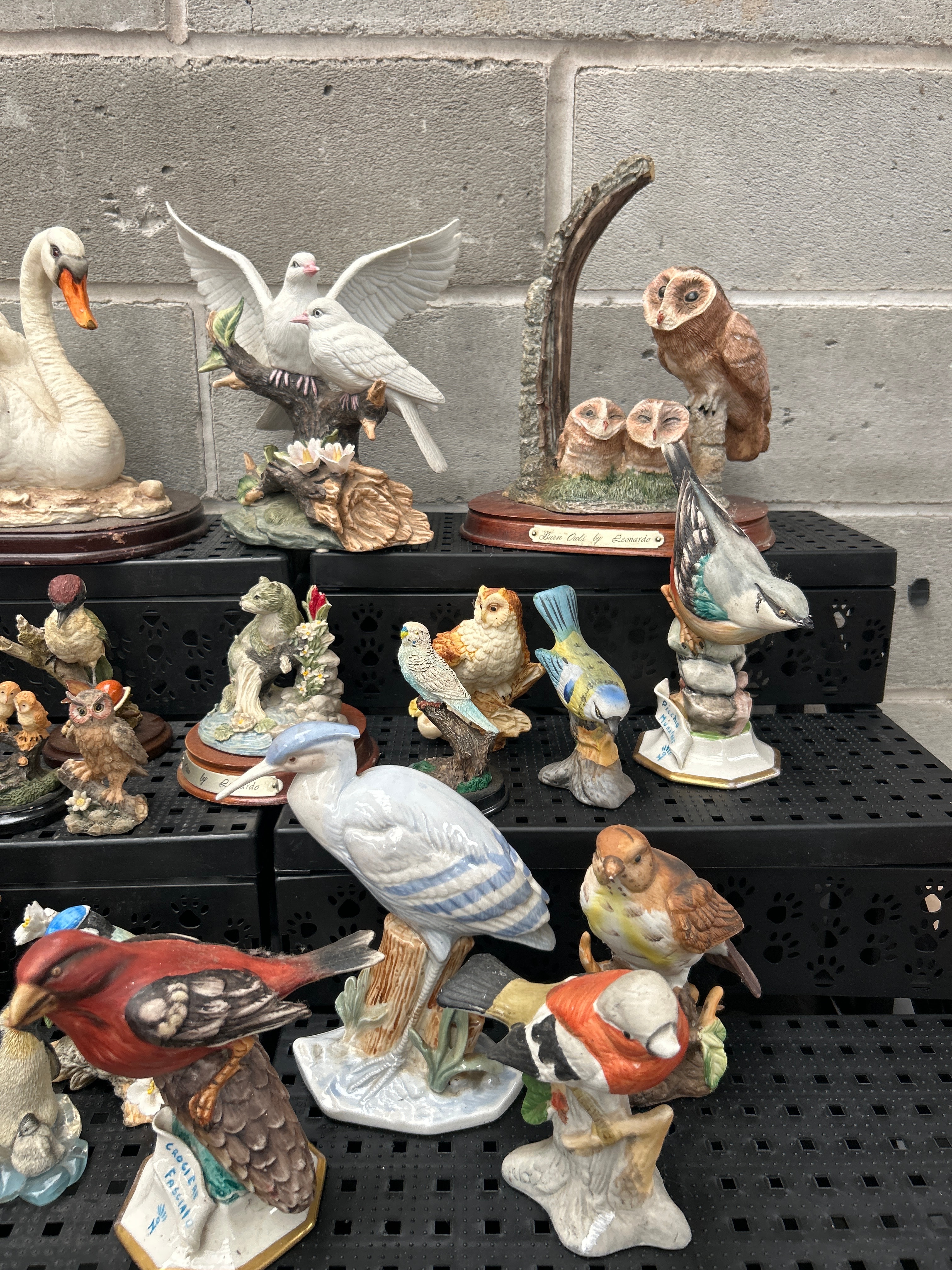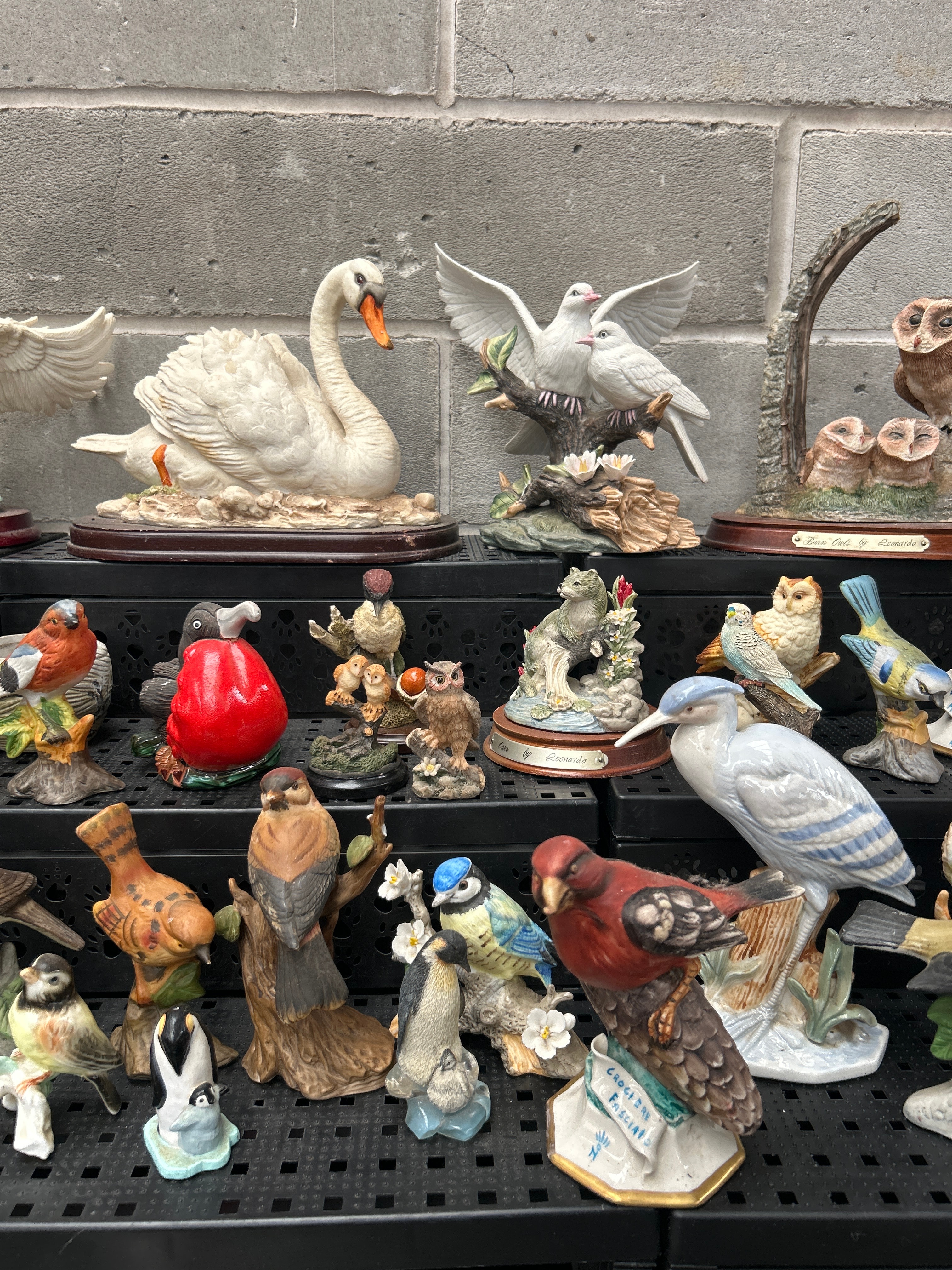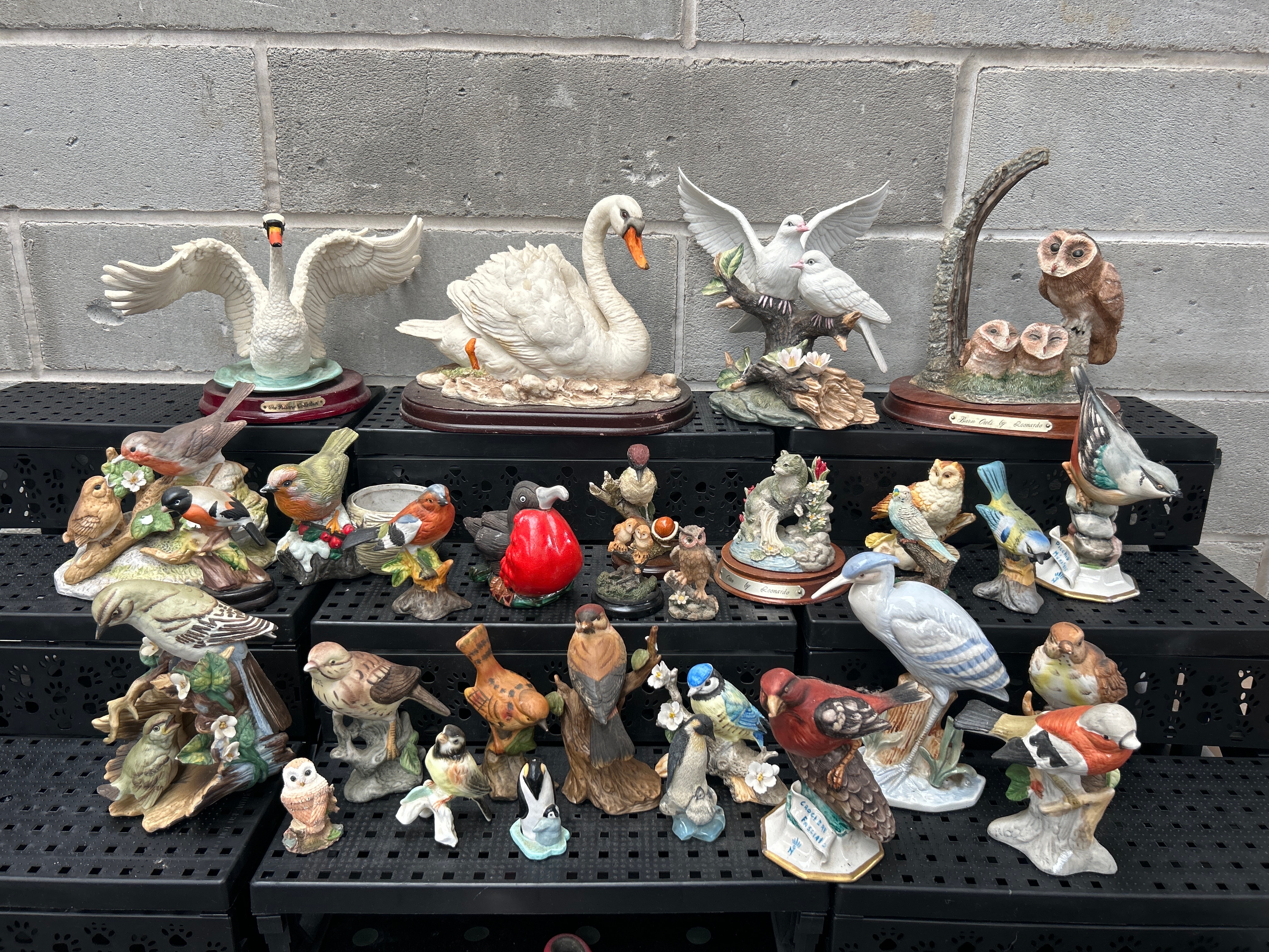 A collection of approximately 50-60 decorative bird figurines, primarily crafted from glazed ceramic or porcelain, with many mounted on wooden bases. The style is naturalistic, depicting a wide variety of bird species including swans, doves, owls, herons, and various smaller passerine birds, often featuring detailed painted elements. Visible markings on the bases include titles such as “Love’s little Treasures,” “Tenderness,” and “Blue Bird of Happiness,” alongside what appear to be artist signatures like “D. Morgan” and brand indicators, possibly “Franklin Mint” or “Franklin Porcelain,” on several pieces. The items align with common decorative collectible production.
