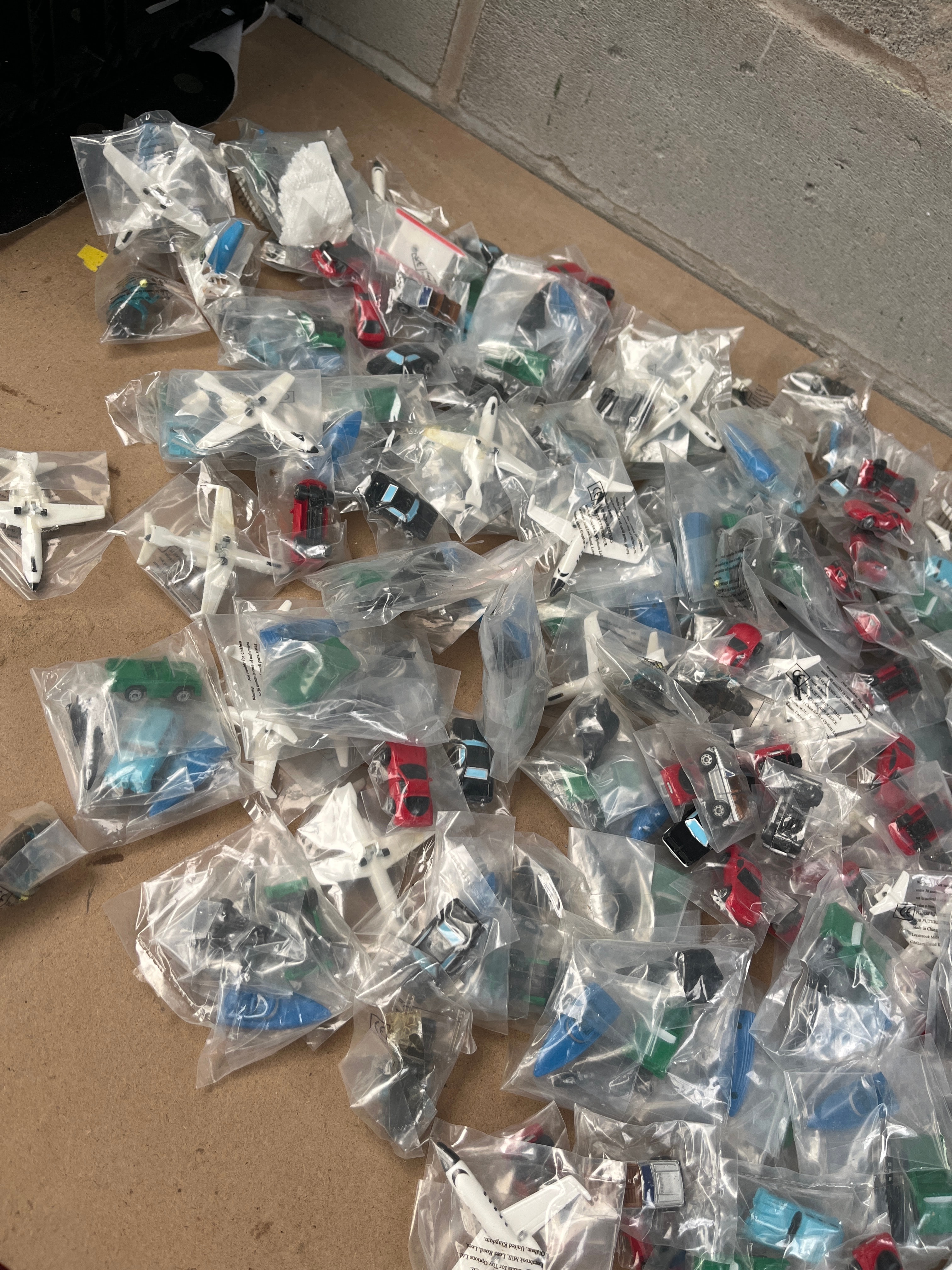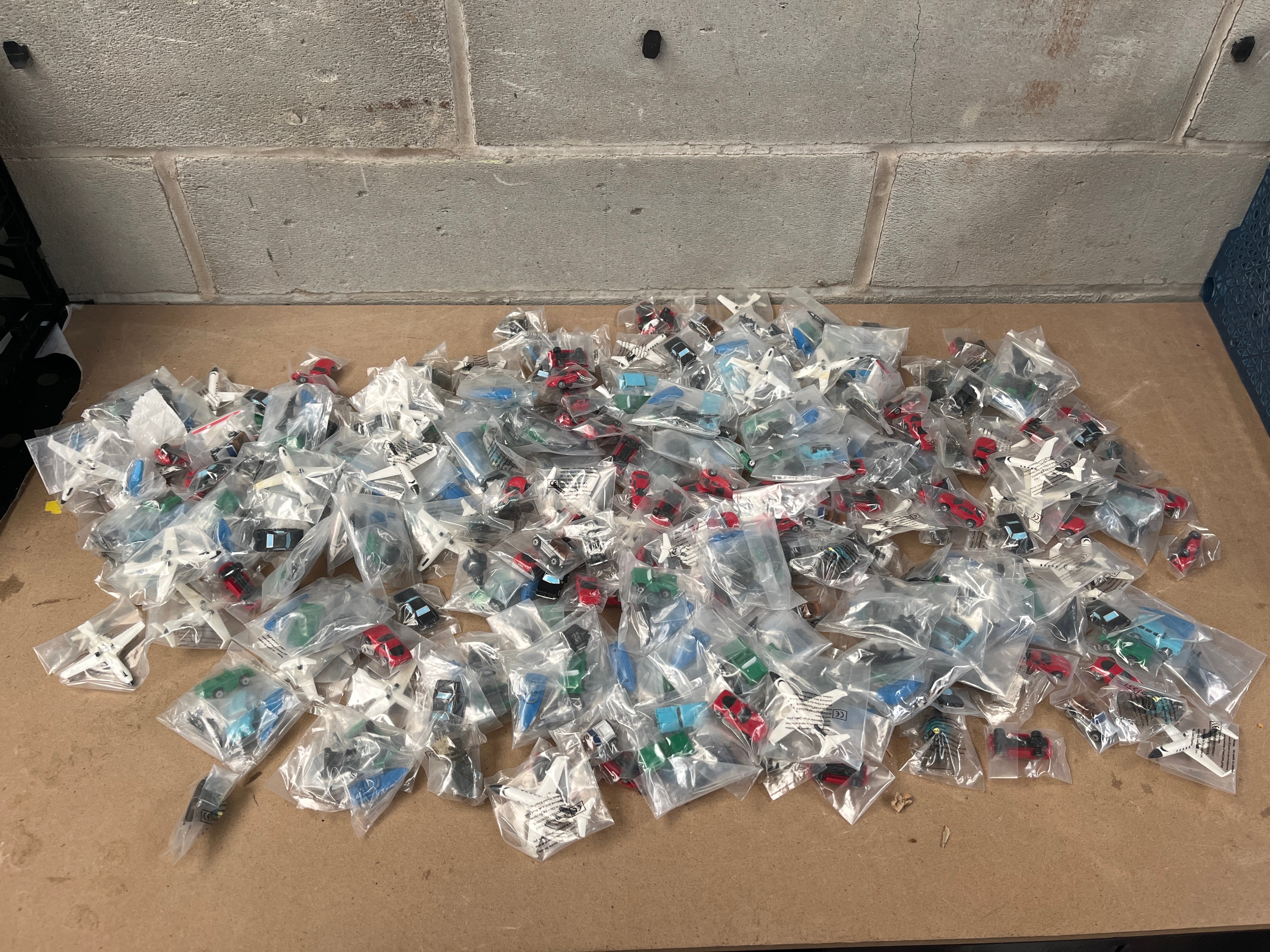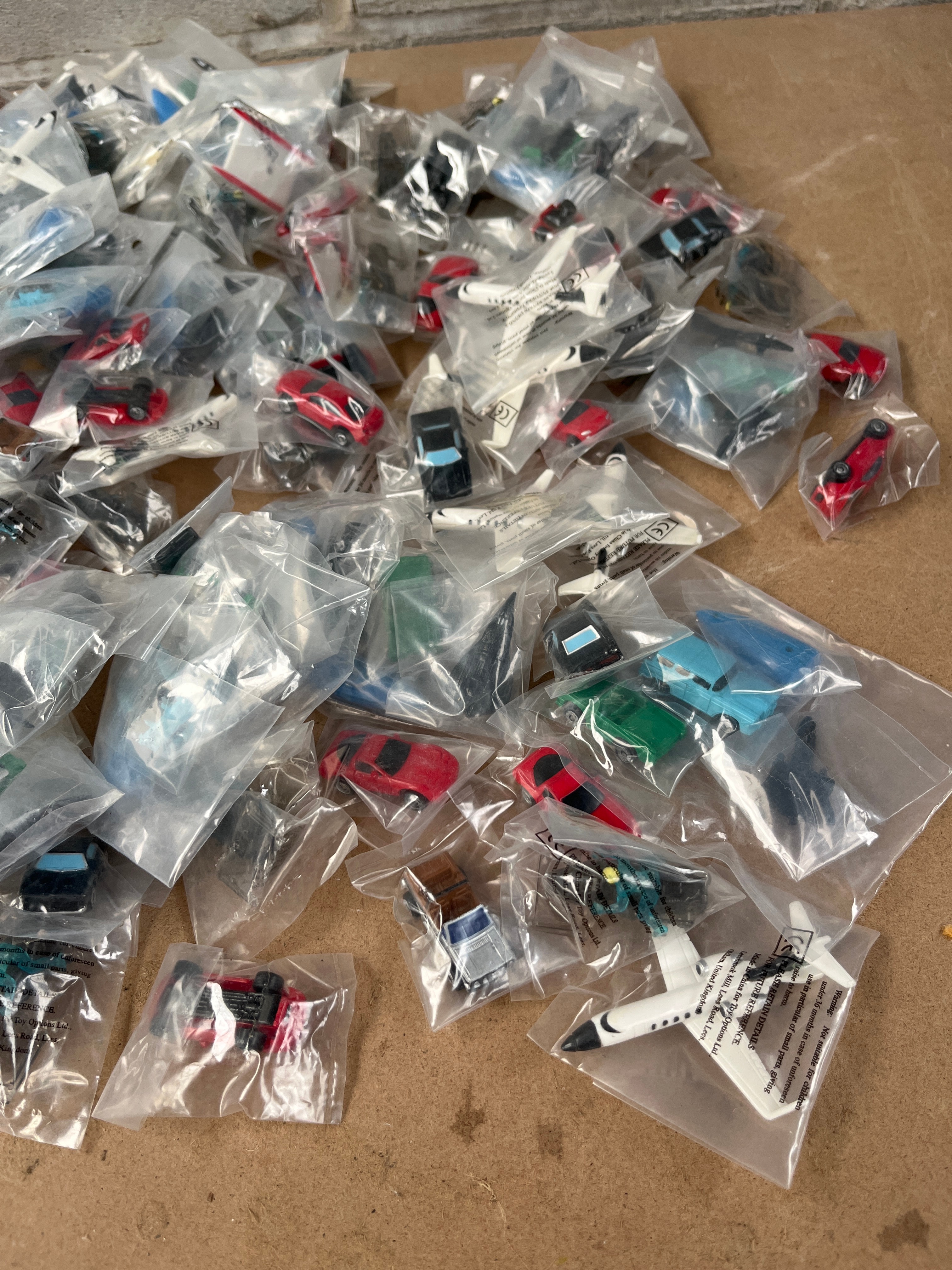 A large collection of 1990s Micro Machines, comprising numerous individually plastic-bagged miniature toy vehicles. The assortment includes cars, airplanes, and helicopters in various colors such as red, blue, green, black, and white. The items are predominantly plastic, consistent with modern mass-produced toys. Many clear plastic bags contain white paper inserts or labels with visible multi-language safety warnings, including English, French (“AVERTISSEMENT! RISQUE D’ÉTOUFFEMENT – Petites pièces. Ne convient pas aux enfants de moins de 3 ans.”), and Spanish (“¡ADVERTENCIA! PELIGRO DE ASFIXIA – Piezas pequeñas. No apto para niños menores de 3 años.”), indicating a “CHOKING HAZARD” for children under three years of age.