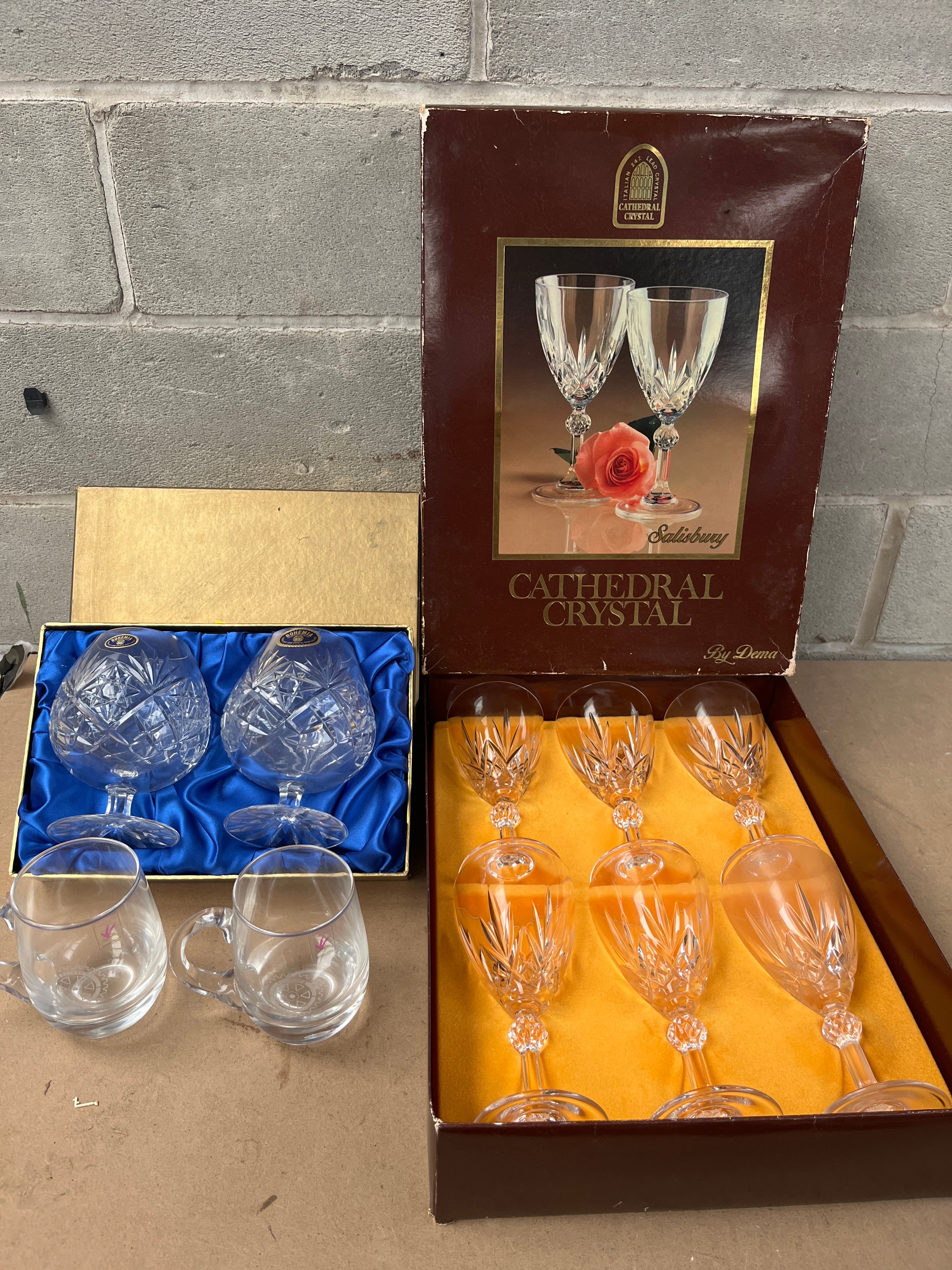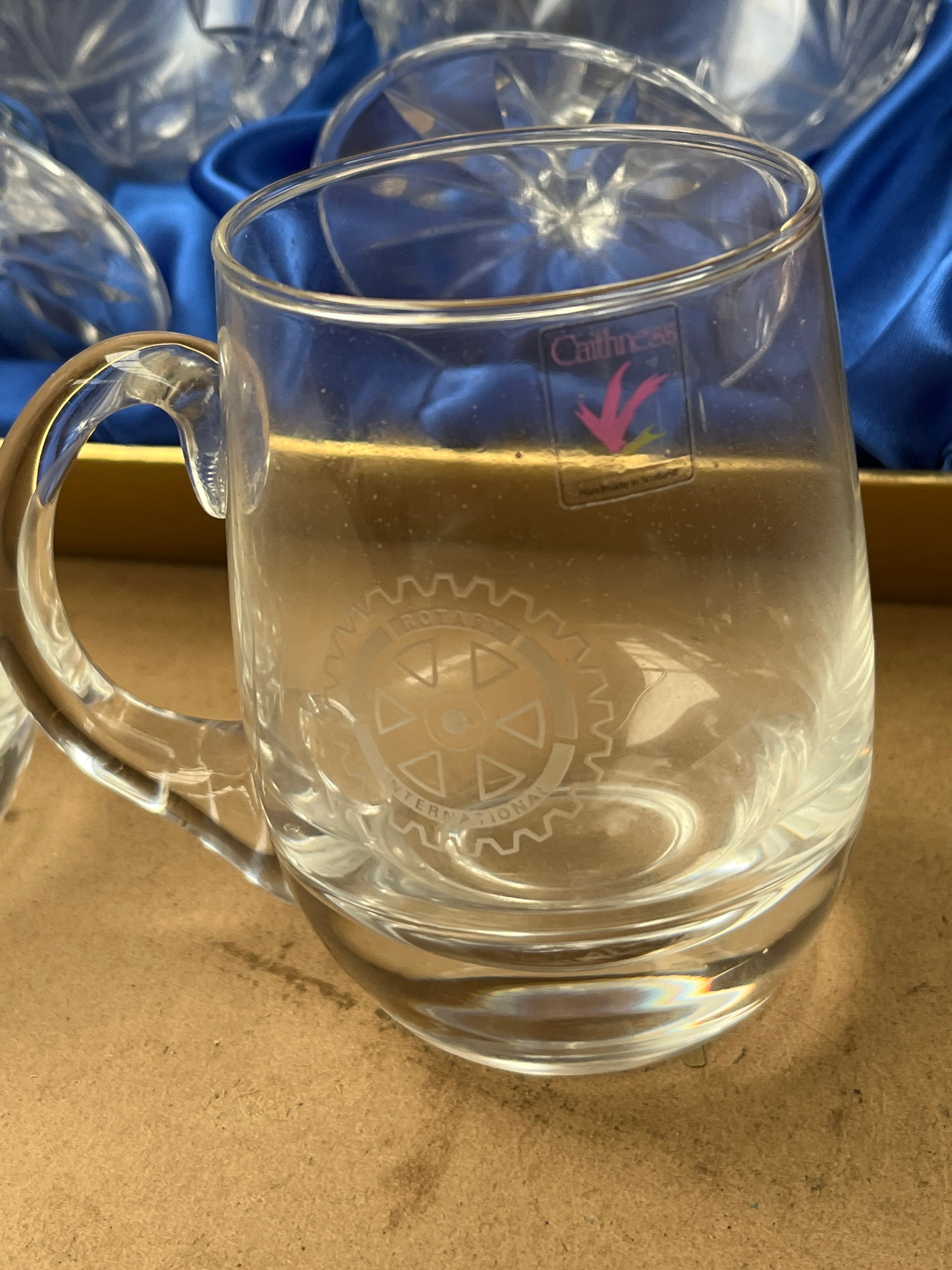A collection of drinking vessels, comprising two clear glass mugs with handles, one bearing a ‘Caithness, Handmade in Scotland’ sticker, both etched with the ‘Rotary International’ cogwheel logo. Also included is a large, unopened box containing six ‘Salisbury Cathedral Crystal by Diana’ cut crystal goblets with faceted stems and bowls, as depicted on the box. A smaller, open gold-lined box holds two additional cut crystal glasses, likely matching the ‘Cathedral Crystal’ style, presented on blue satin.