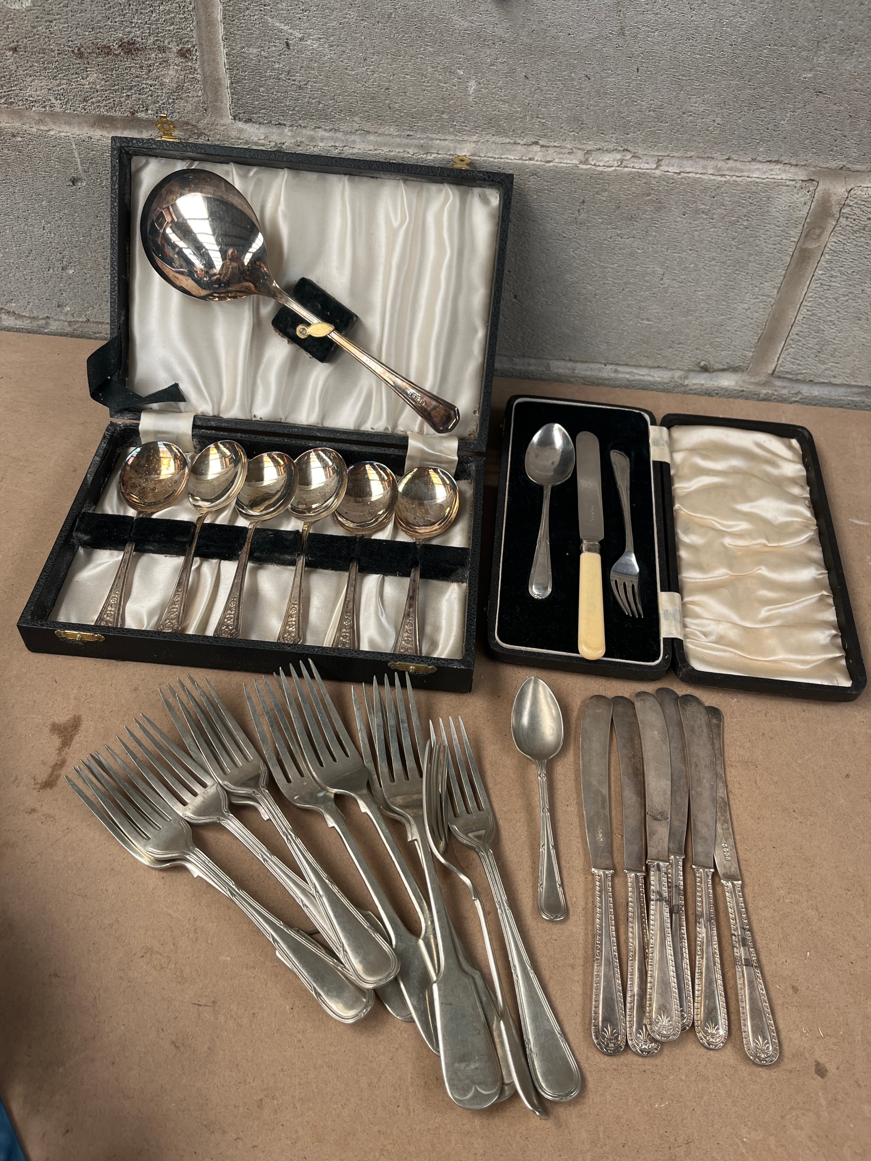 This lot comprises a mixed collection of vintage flatware, primarily crafted from silver-toned metal. Within a larger black velvet-lined presentation box, there is one ornate serving spoon marked “DIRIGOLD” and a set of six matching smaller spoons featuring an elaborate, possibly floral pattern. A smaller black velvet-lined case contains a three-piece set, consisting of a spoon, a fork, and a knife, all with cream or ivory-colored handles and a plainer design, suggesting an Art Deco or mid-century aesthetic. Additionally, a group of loose flatware includes numerous forks and several knives. Some of these items display patterns similar to the ornate spoons found in the larger case. Markings observed include “EPNS” (Electro-Plated Nickel Silver) on some handles, and one loose knife bears a “999” marking.