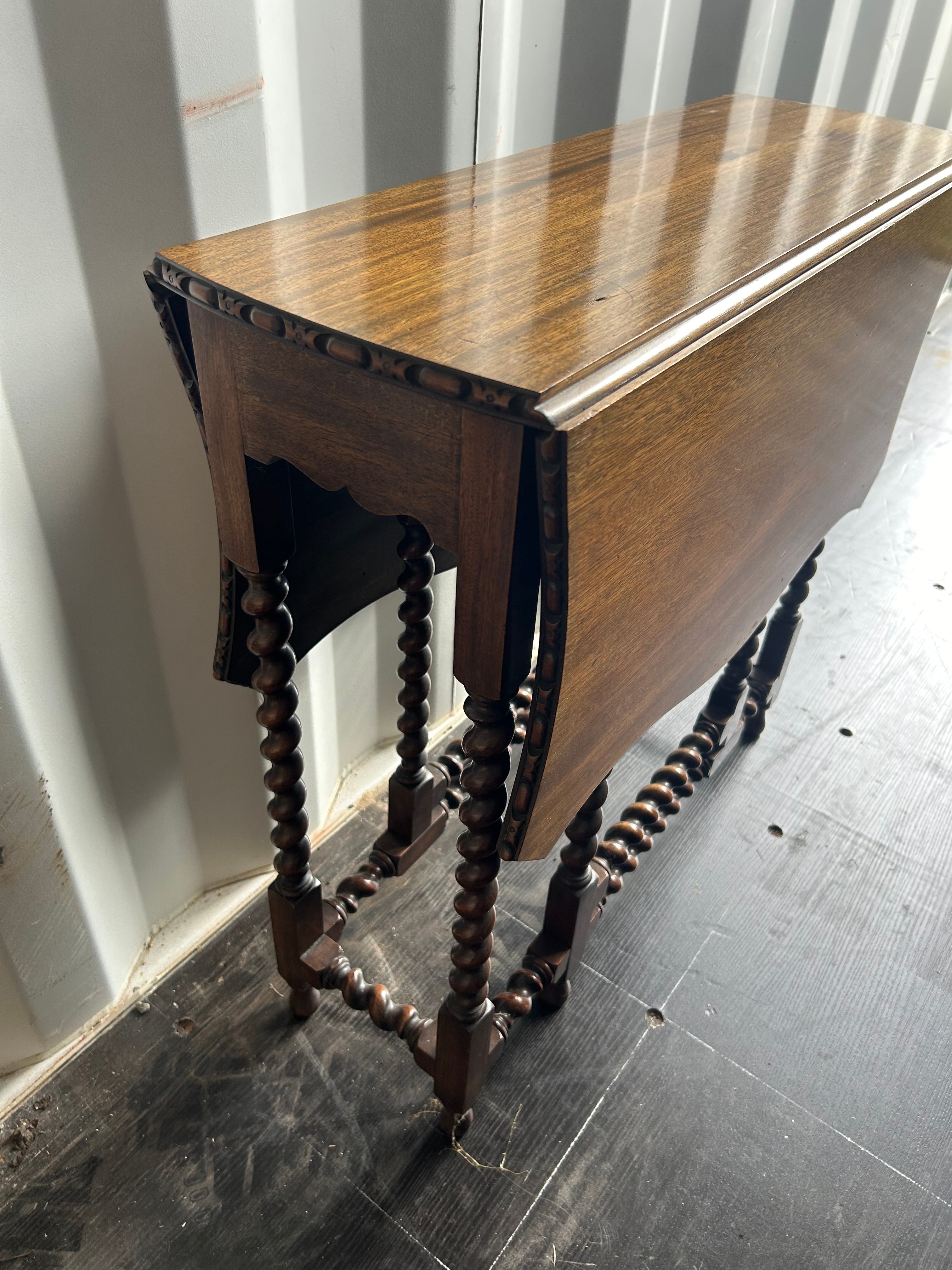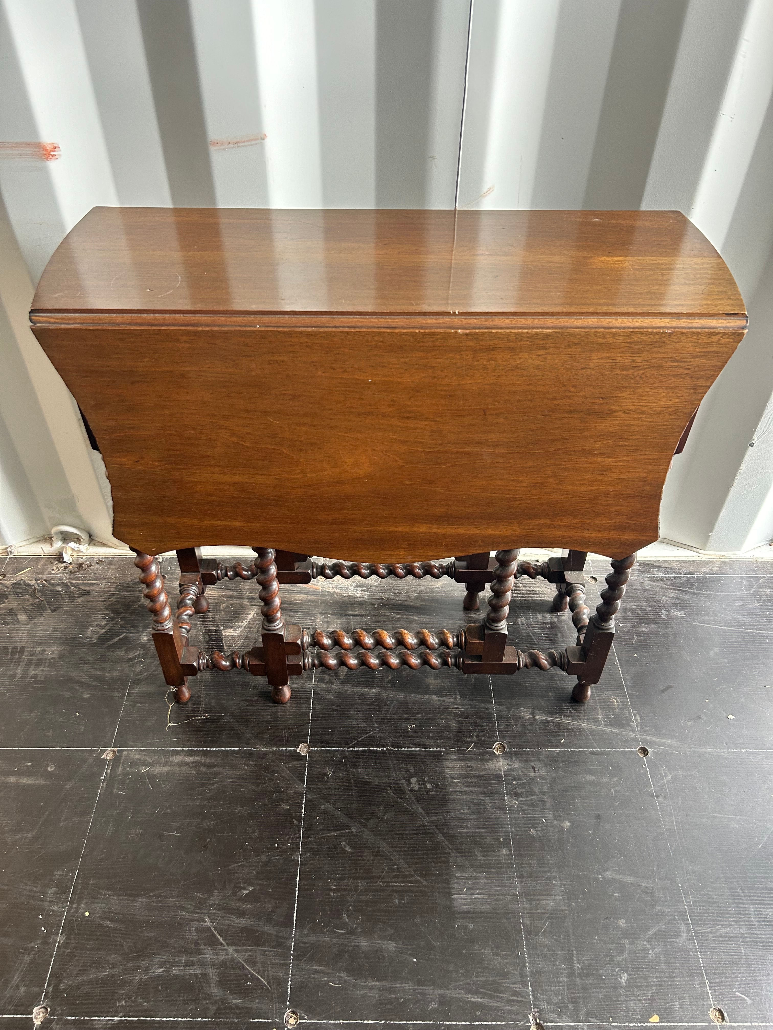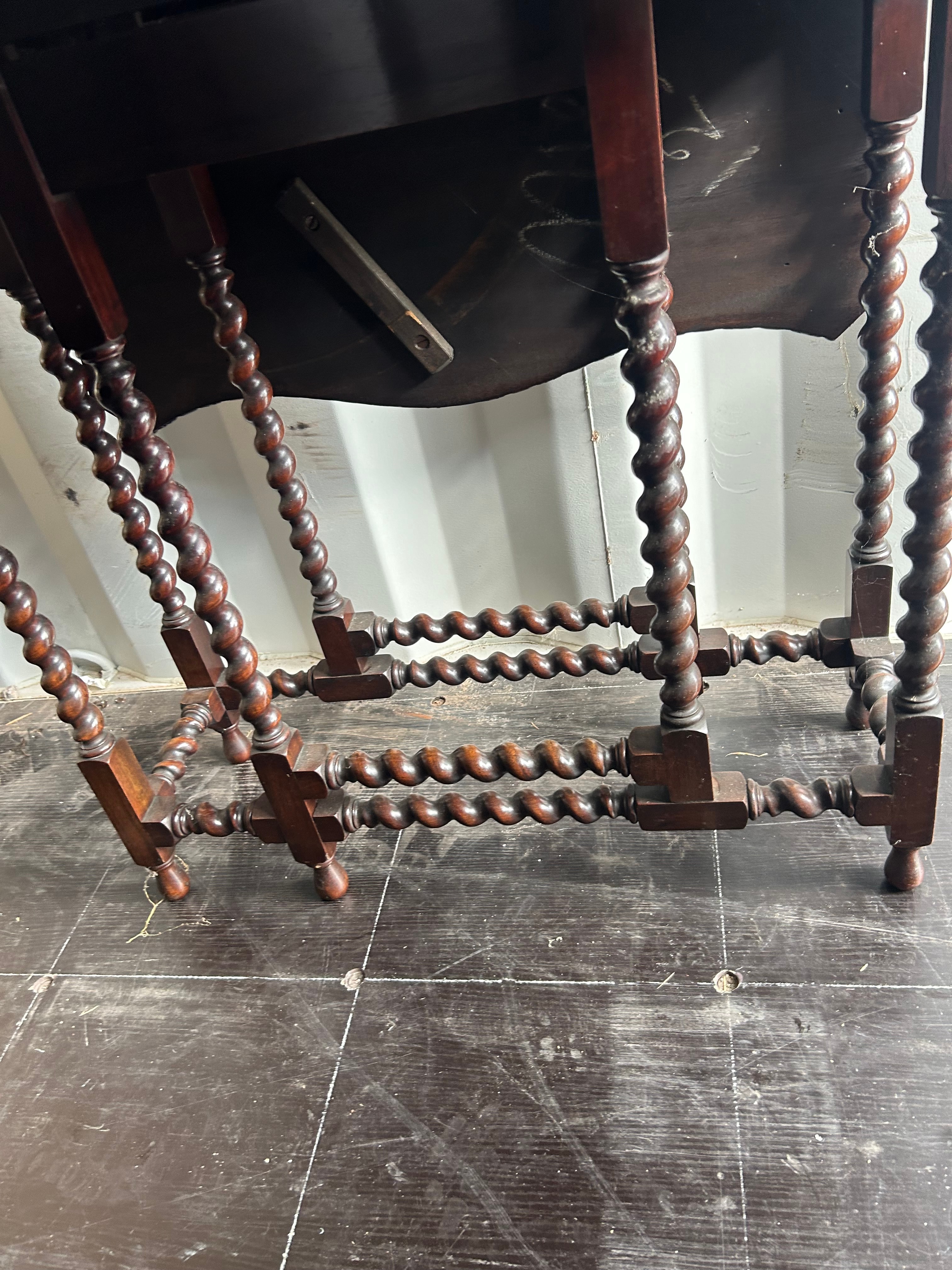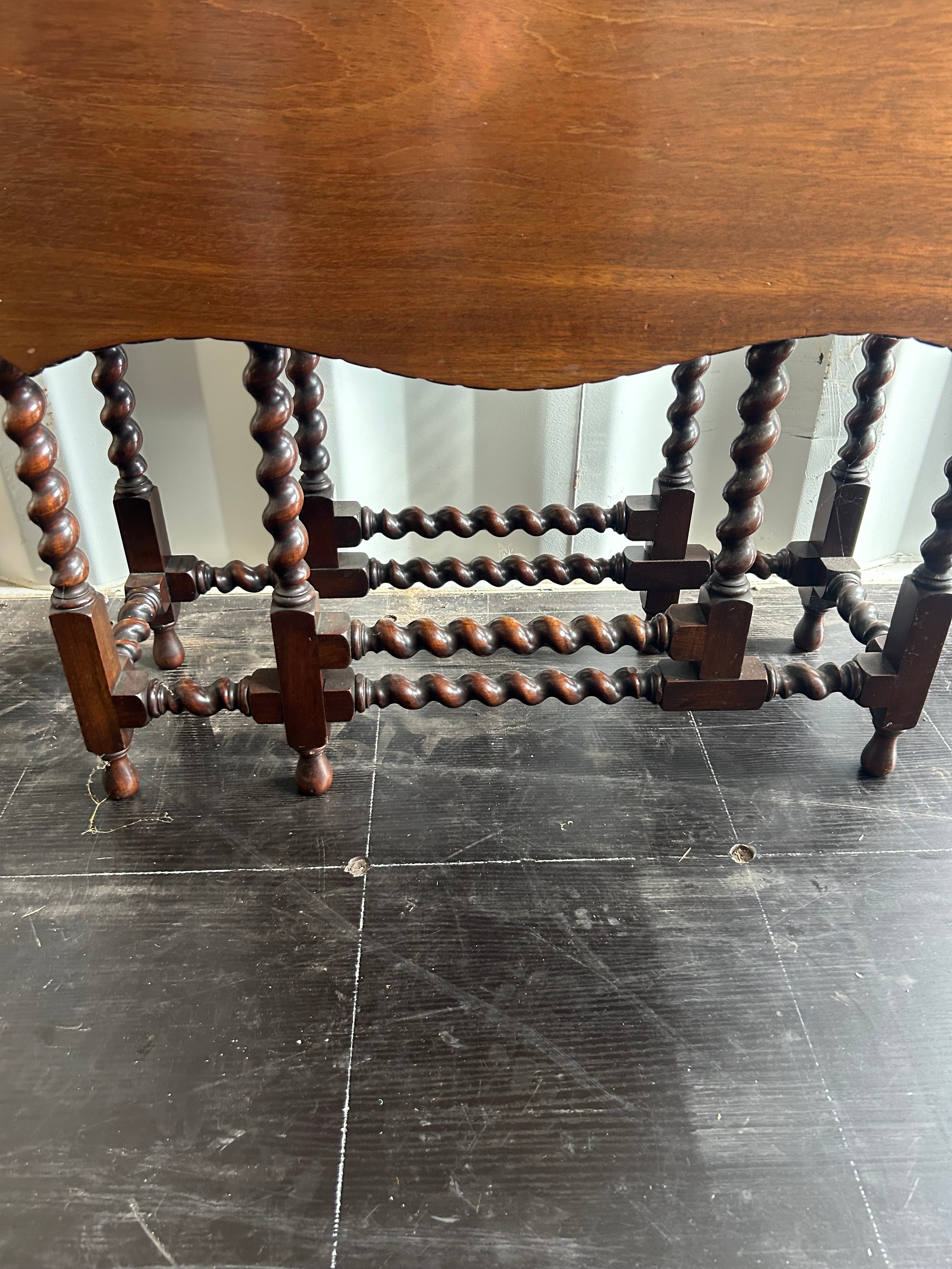 This English Oak Barley Twist Gateleg Drop-Leaf Table dates to circa 1900, reflecting the Jacobean Revival style. The dark wood table features a gate-leg mechanism, supported by multiple barley twist legs and corresponding stretchers. The polished top has two curved drop leaves and exhibits a rich, reddish-brown finish. No identifying text or markings are visible.
