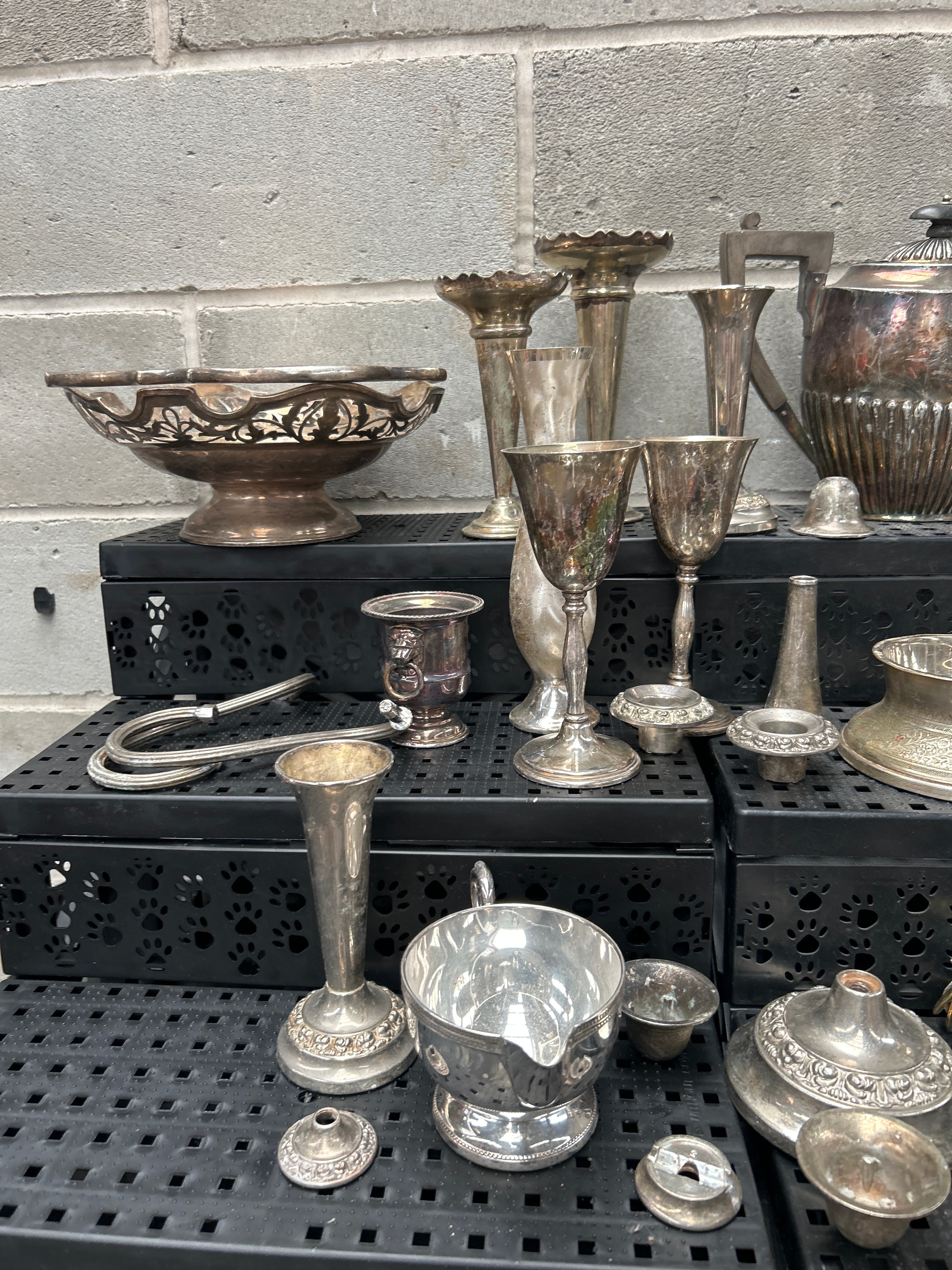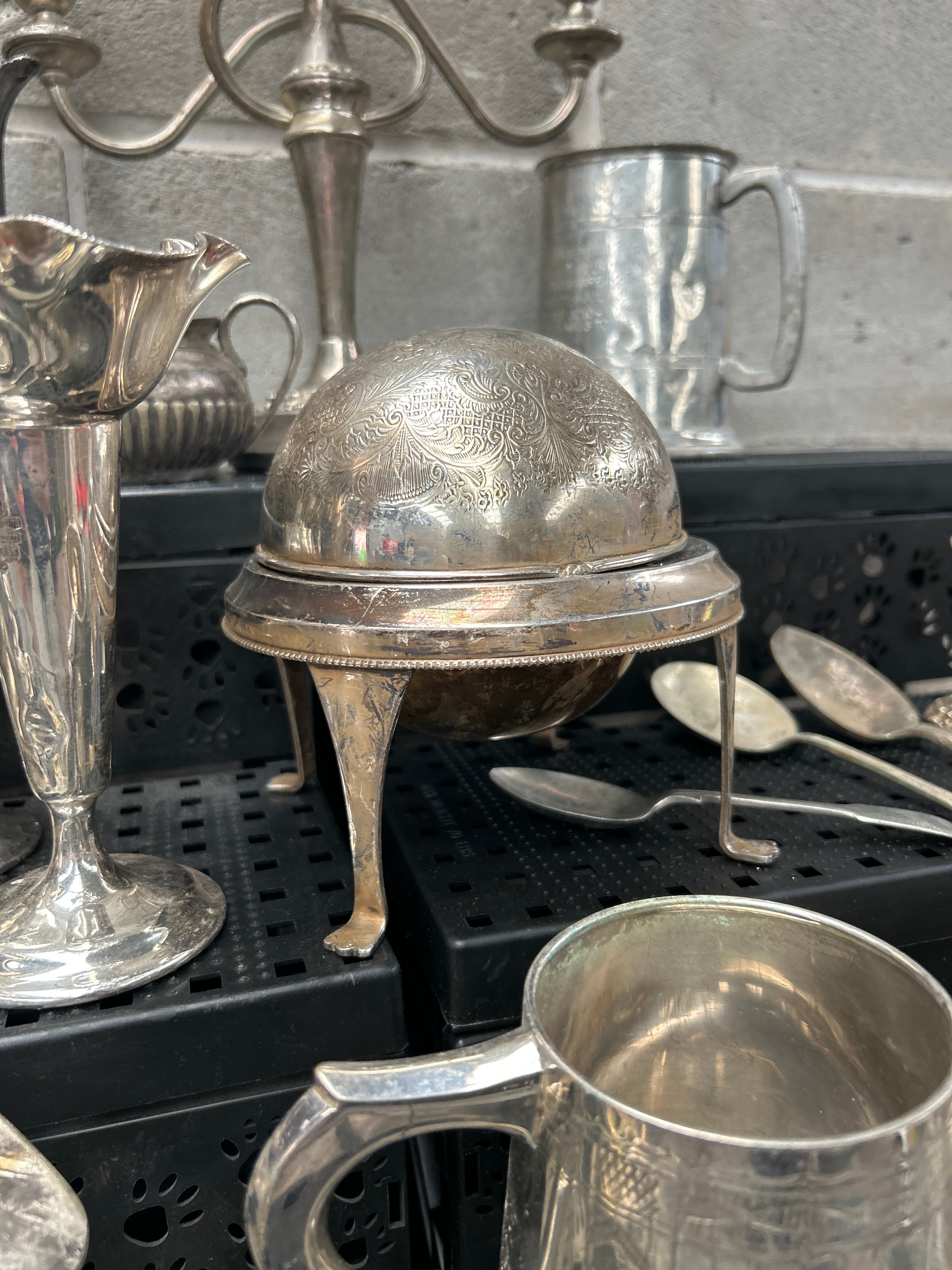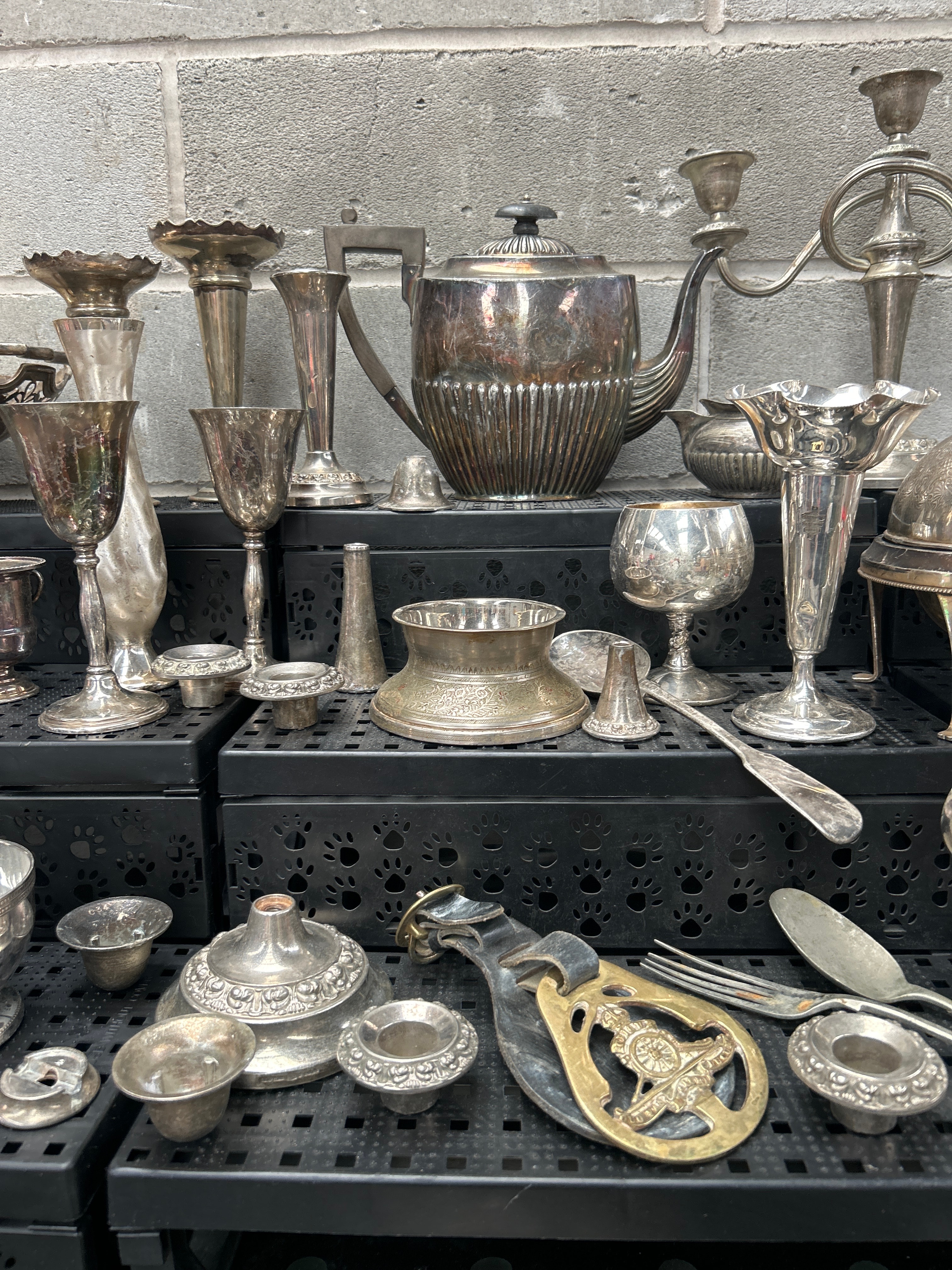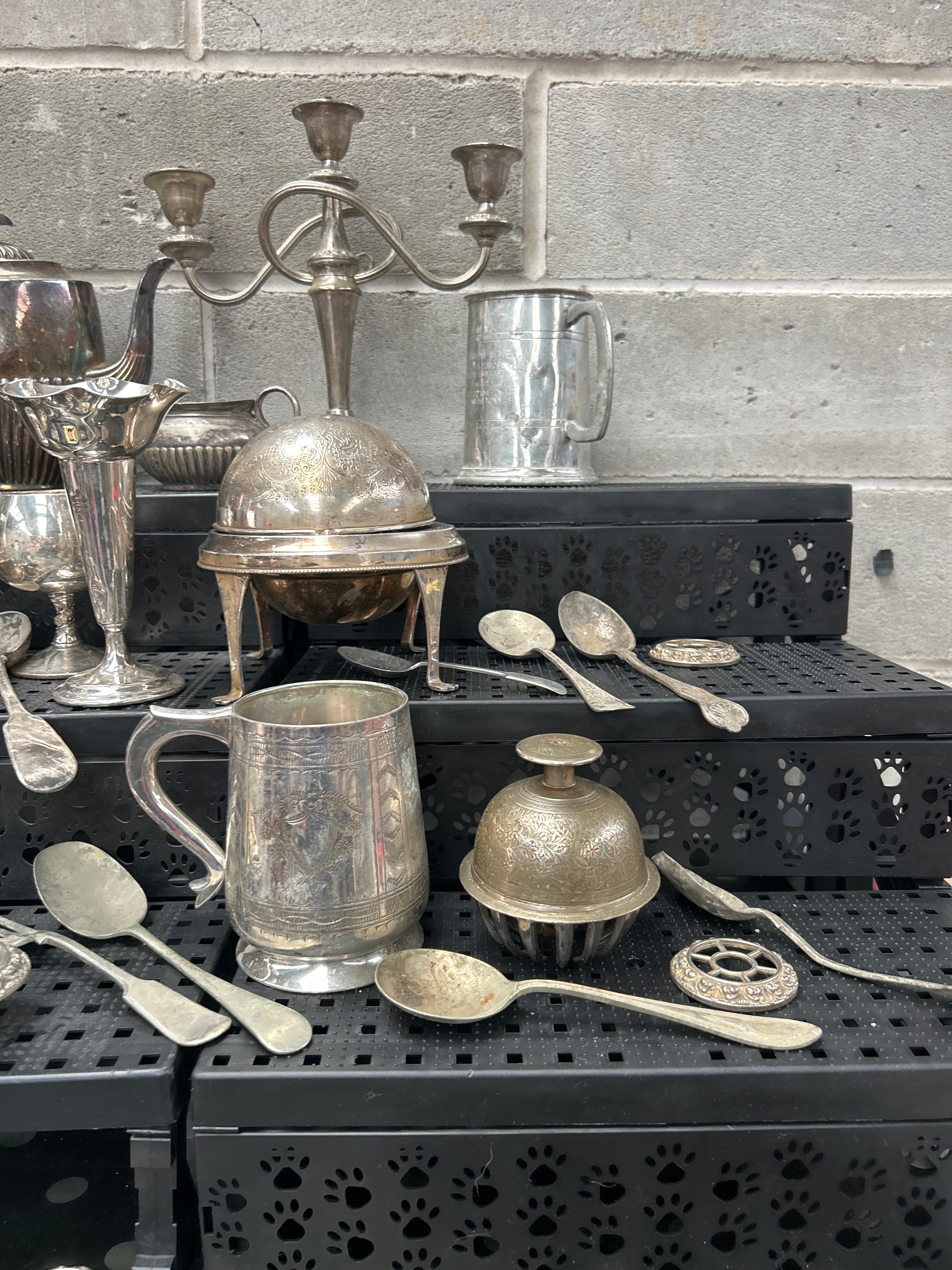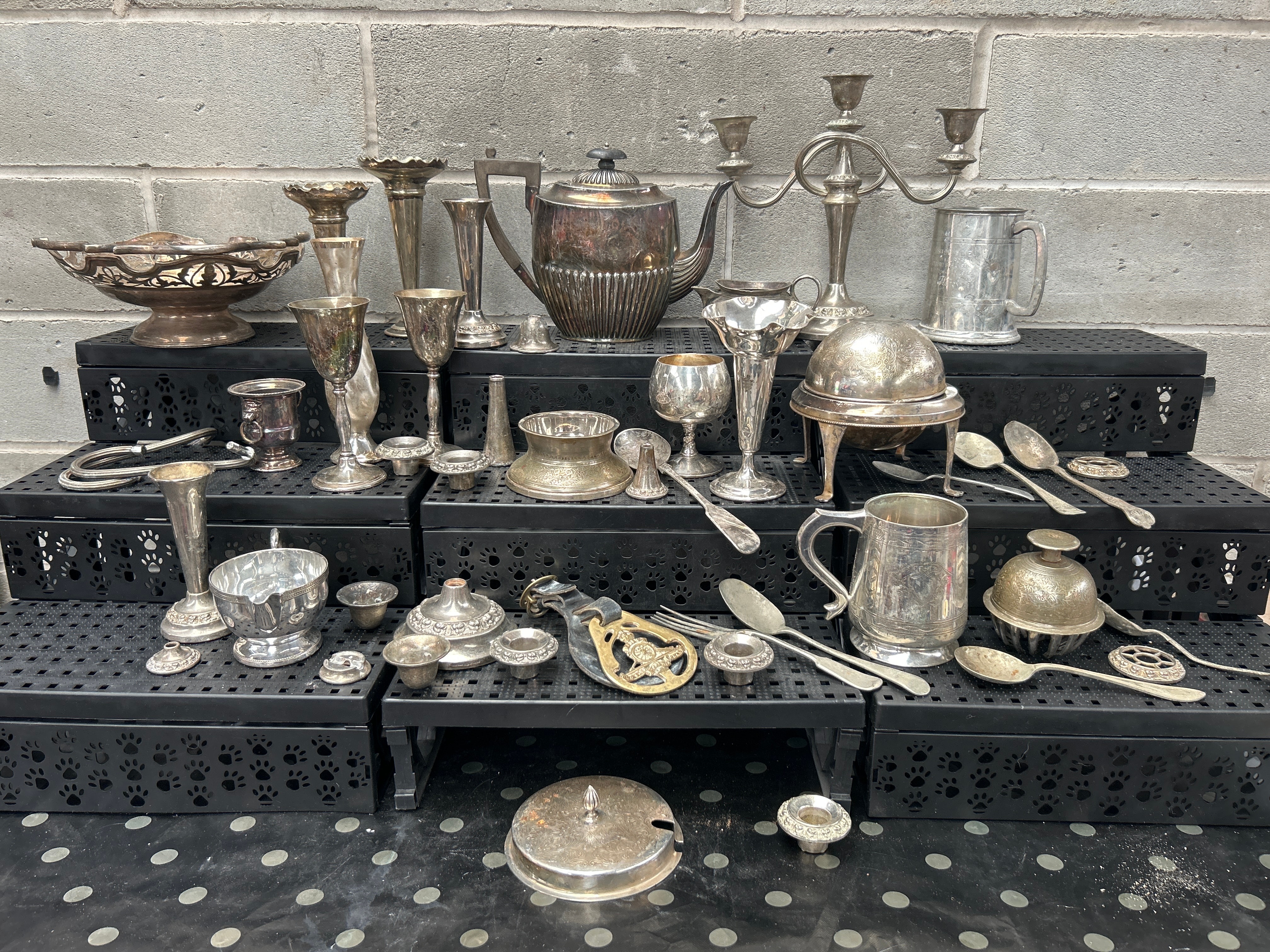 This lot comprises approximately 50 metallic tableware and decorative items, primarily appearing to be silver-plated along with one item in brass. The collection includes a fluted teapot, several candlesticks and a two-arm candelabra, various goblets, mugs, vases, serving bowls (one with an openwork rim), numerous spoons, a covered spherical warmer on legs, several lidded dishes (including a butter dish with intricate engraving), and smaller decorative containers. Stylistically, the items range from traditional Victorian to early 20th-century, featuring common decorative elements such as reeding, fluting, etched floral and foliate motifs, and some with embossed detailing. One brass/bronze item features an equestrian design.