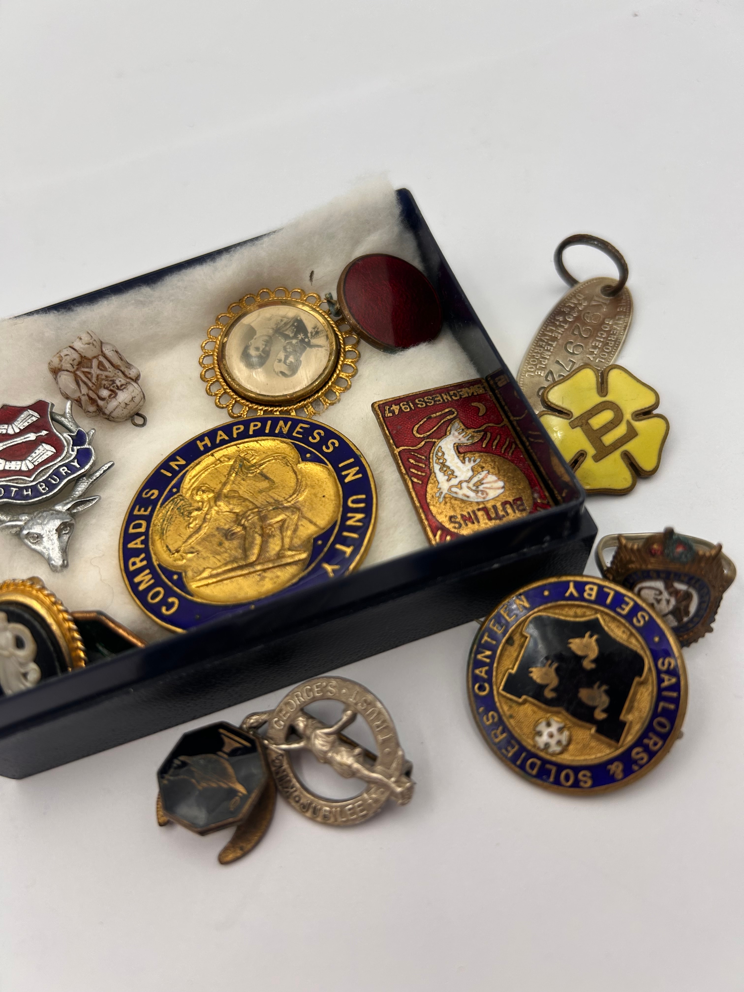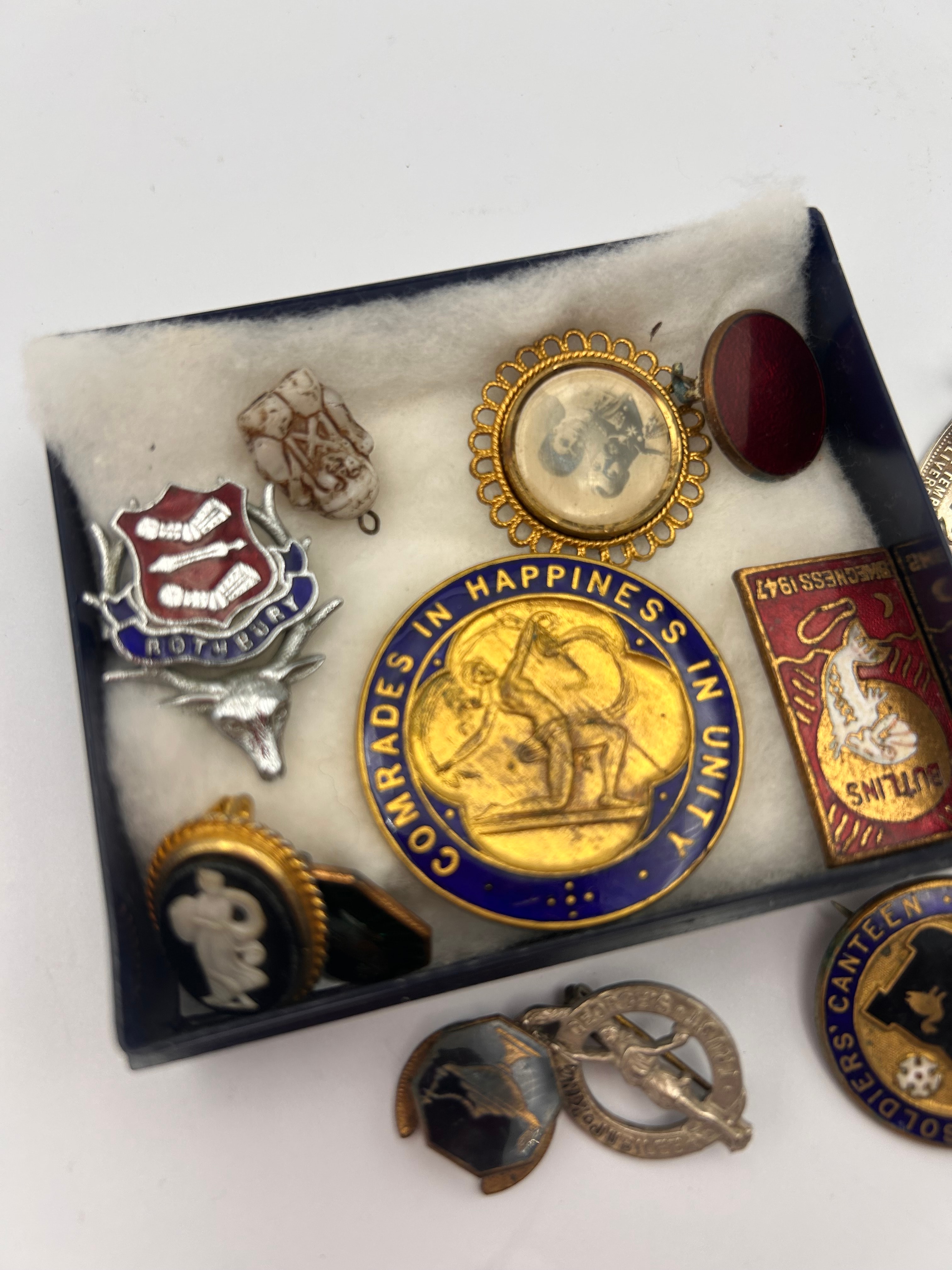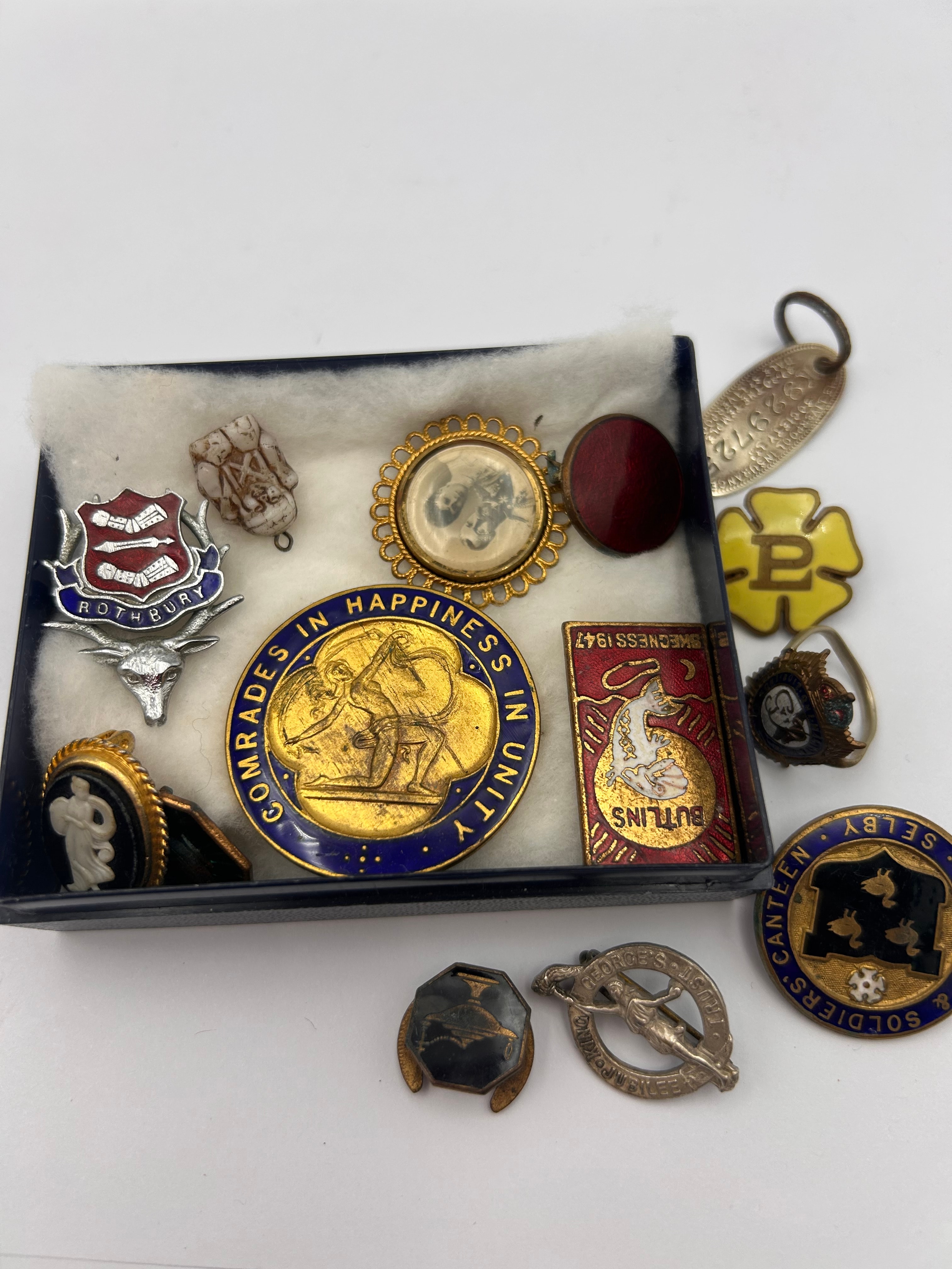 A collection of approximately fifteen vintage badges, pins, a locket-brooch, cufflinks, a small carved item, and an identification tag. The items are primarily made of metal with enamel, some featuring glass or resin elements. Styles range from commemorative and organizational badges to decorative cameos and a photographic locket, suggesting a mid-20th century to possibly earlier period. Visible text includes “COMRADES IN HAPPINESS IN UNITY” on a large blue and gold badge, “BUTLINS SKEGNESS 1947” on a red enamel badge, “ROTHBURY” on a shield badge, “SOLDIERS SAILORS CANTEEN SELBY” on another blue enamel badge, and “ST. GEORGE’S” on a silver-tone piece. An oval tag is marked “1972”, “No. 22074”, and “A.R.S.P.O.A. LICENCE NO.”.