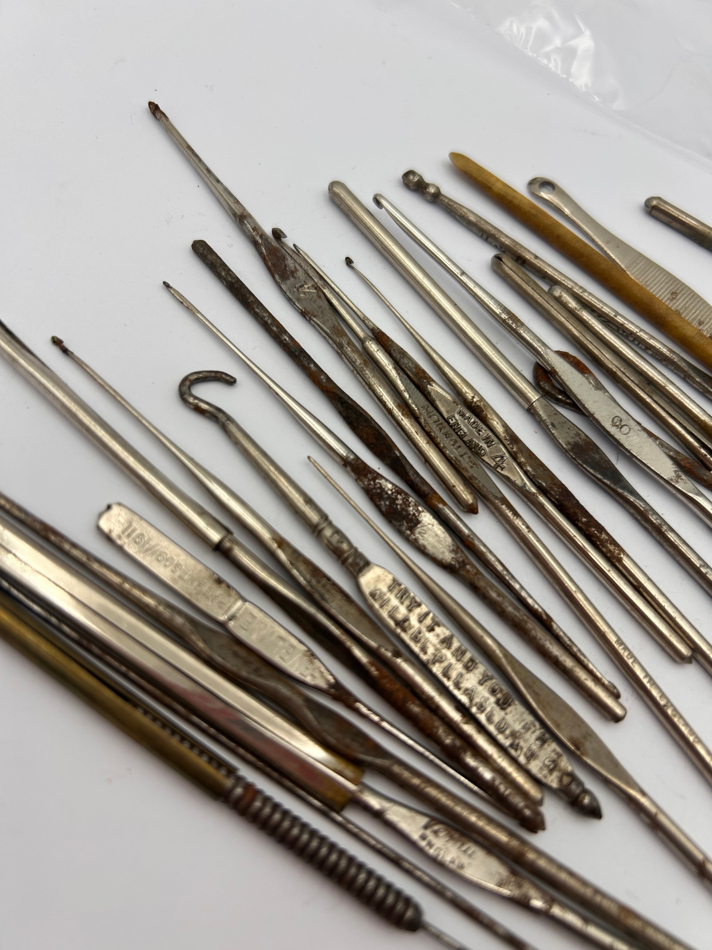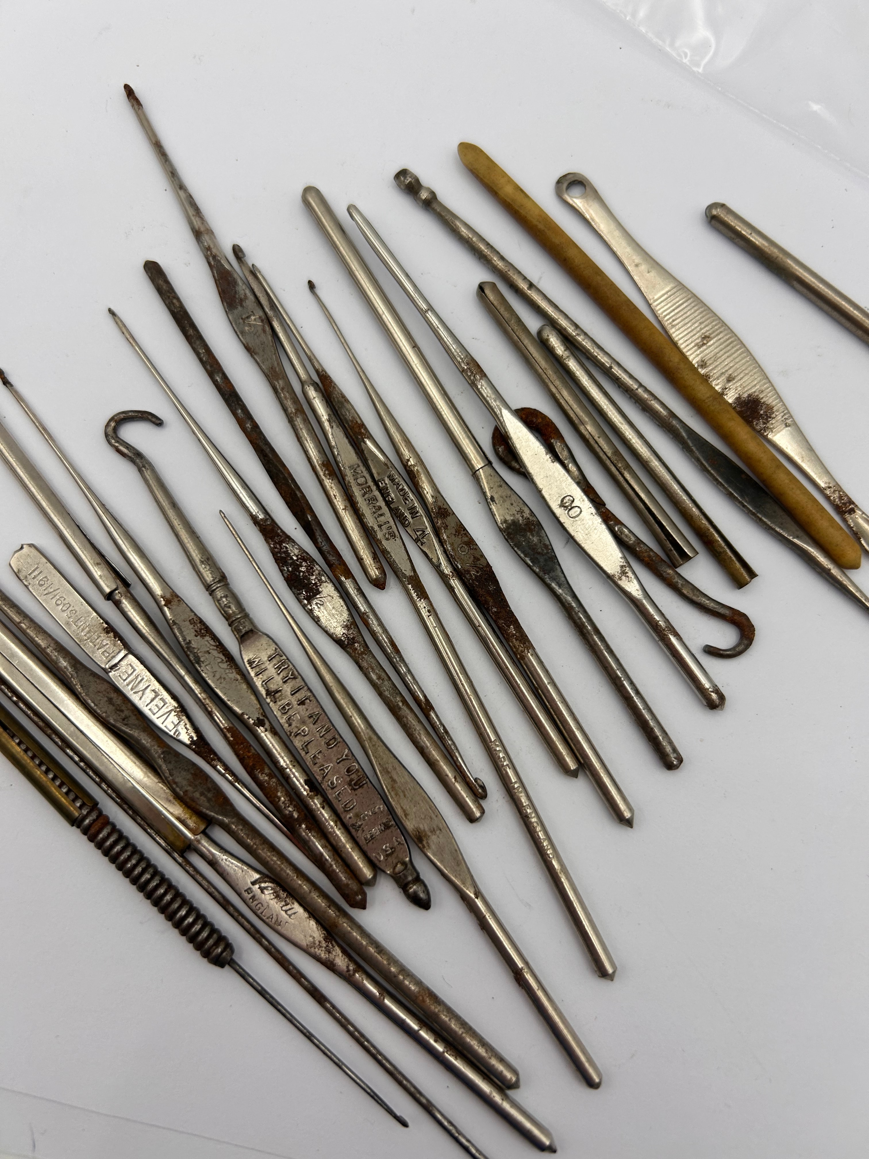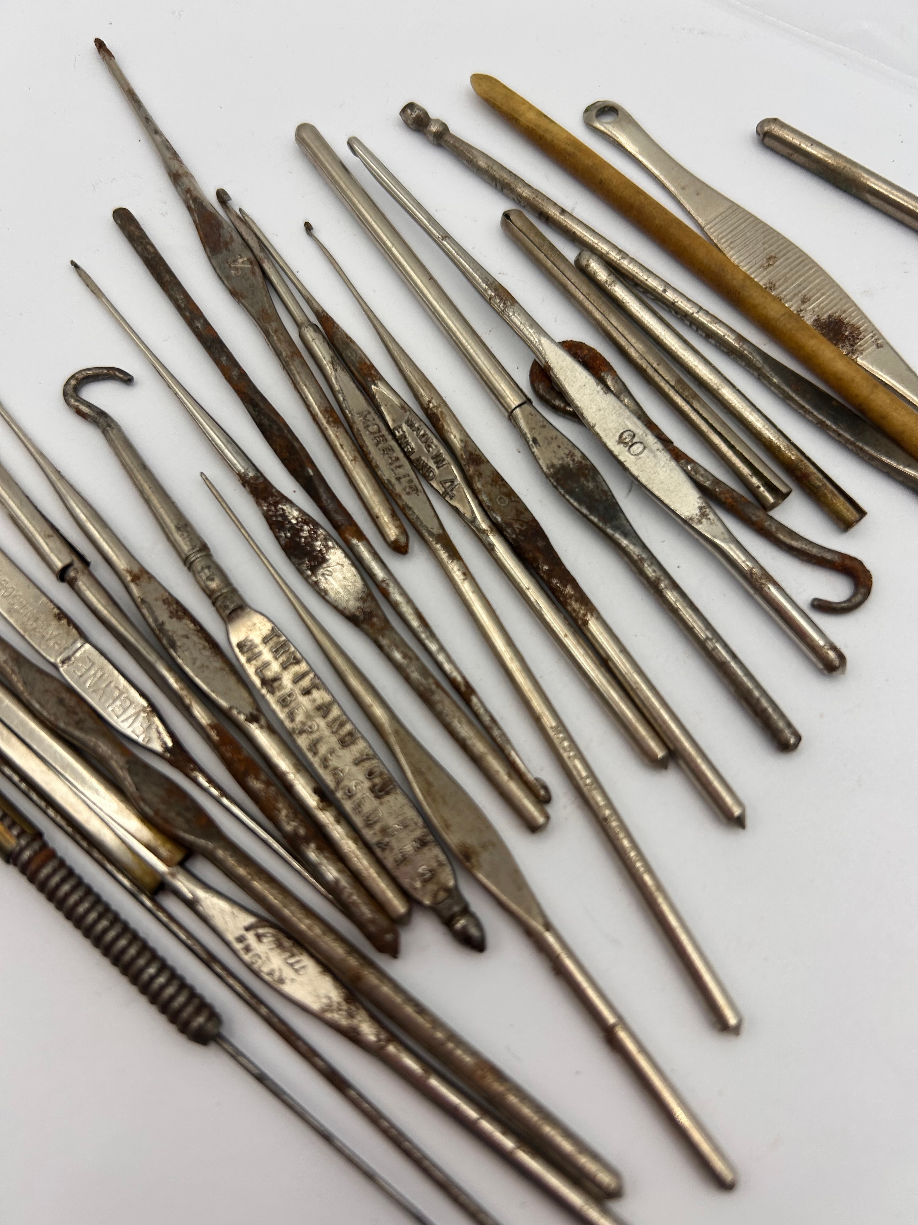 A collection of vintage and antique crafting tools, primarily identified as crochet hooks and darning needles. This lot comprises approximately 30-40 pieces, predominantly constructed from various metals, likely steel, with some appearing nickel-plated and others featuring wooden or composite material handles. Visible markings include “EVELYNE PATENT 546768/1911”, “MADE IN GERMANY”, “D.M.C.”, “BREVETÉS SGDG”, “TITAN”, and “GROLLES”, along with various size numbers.