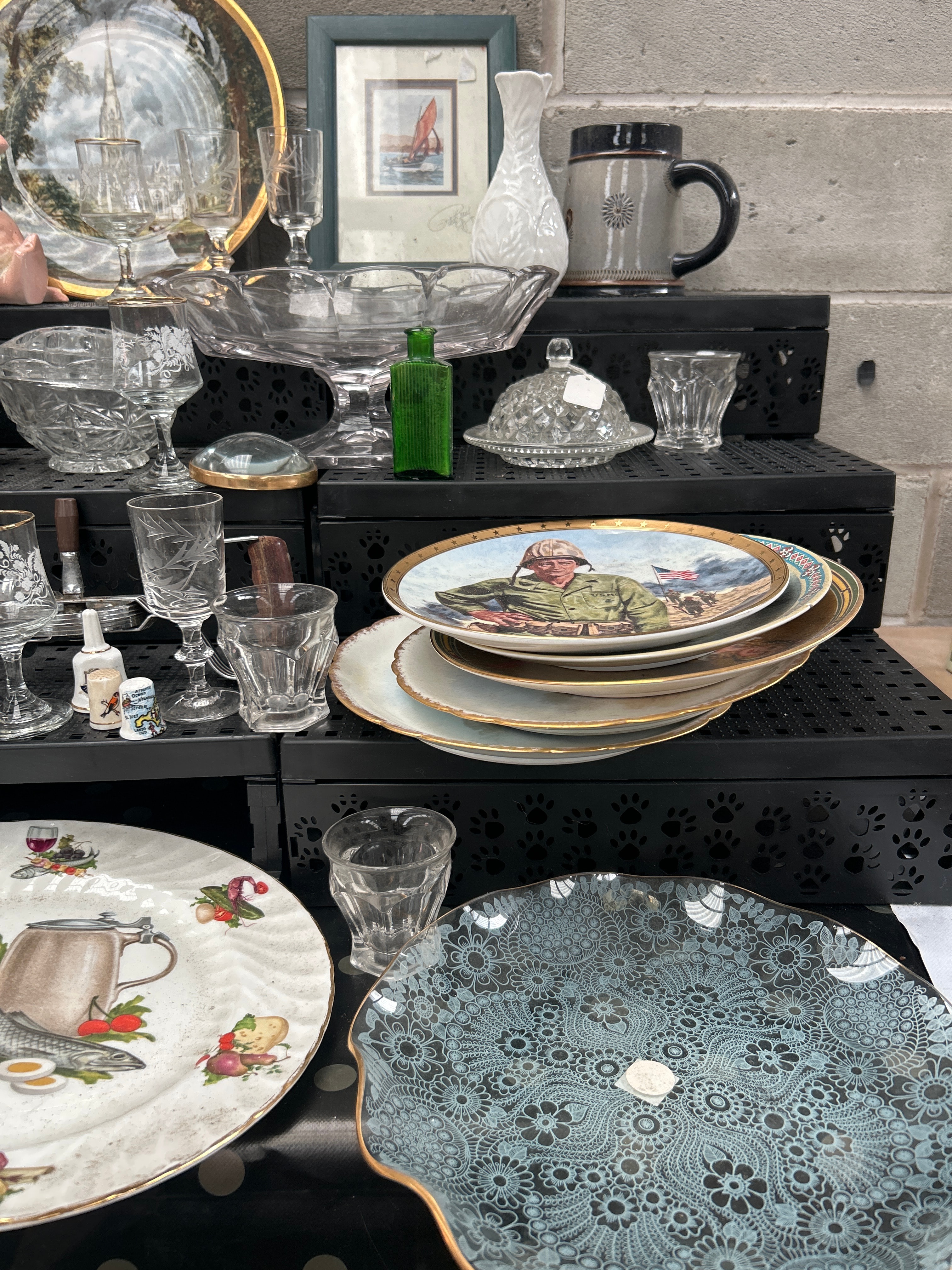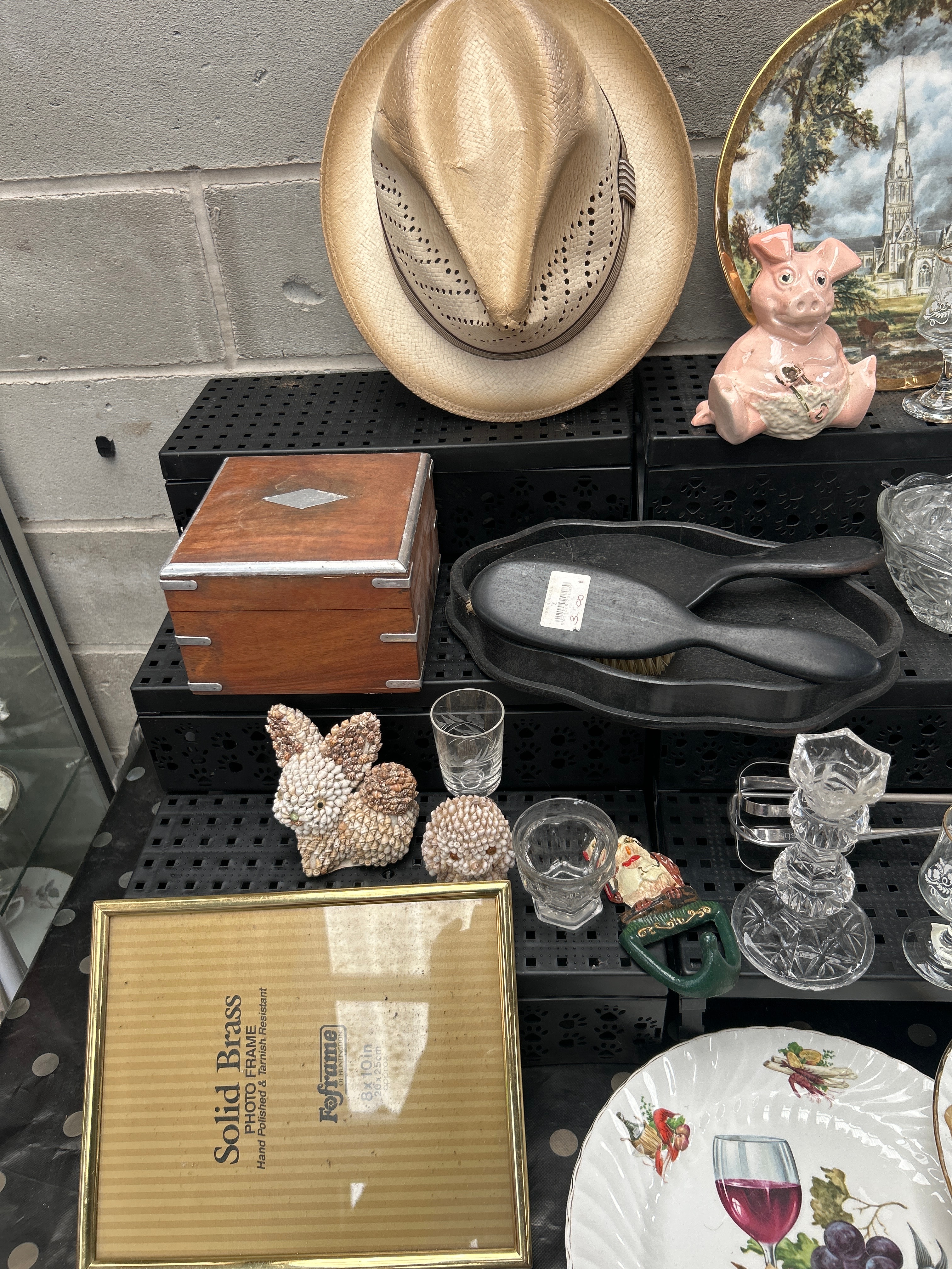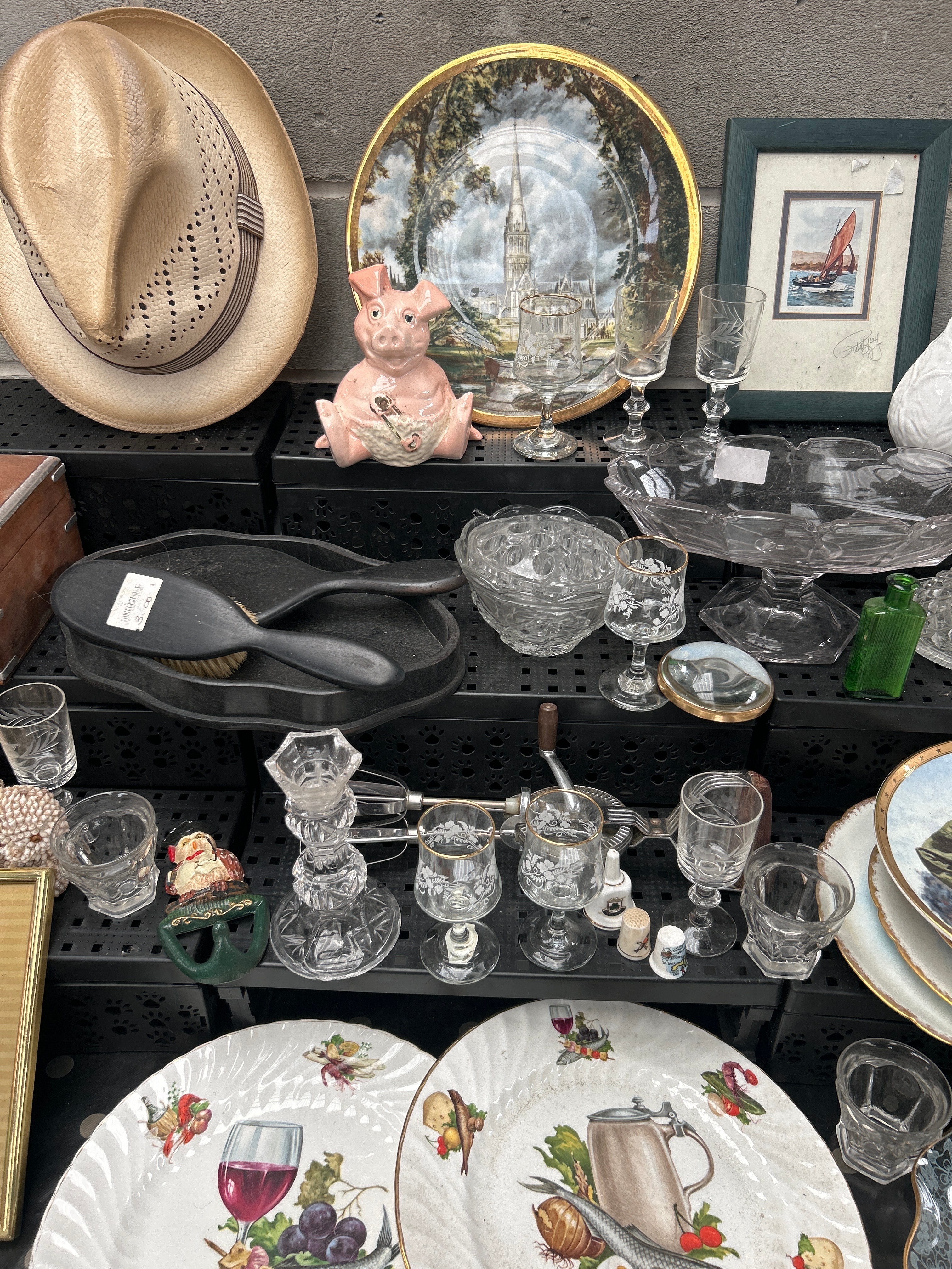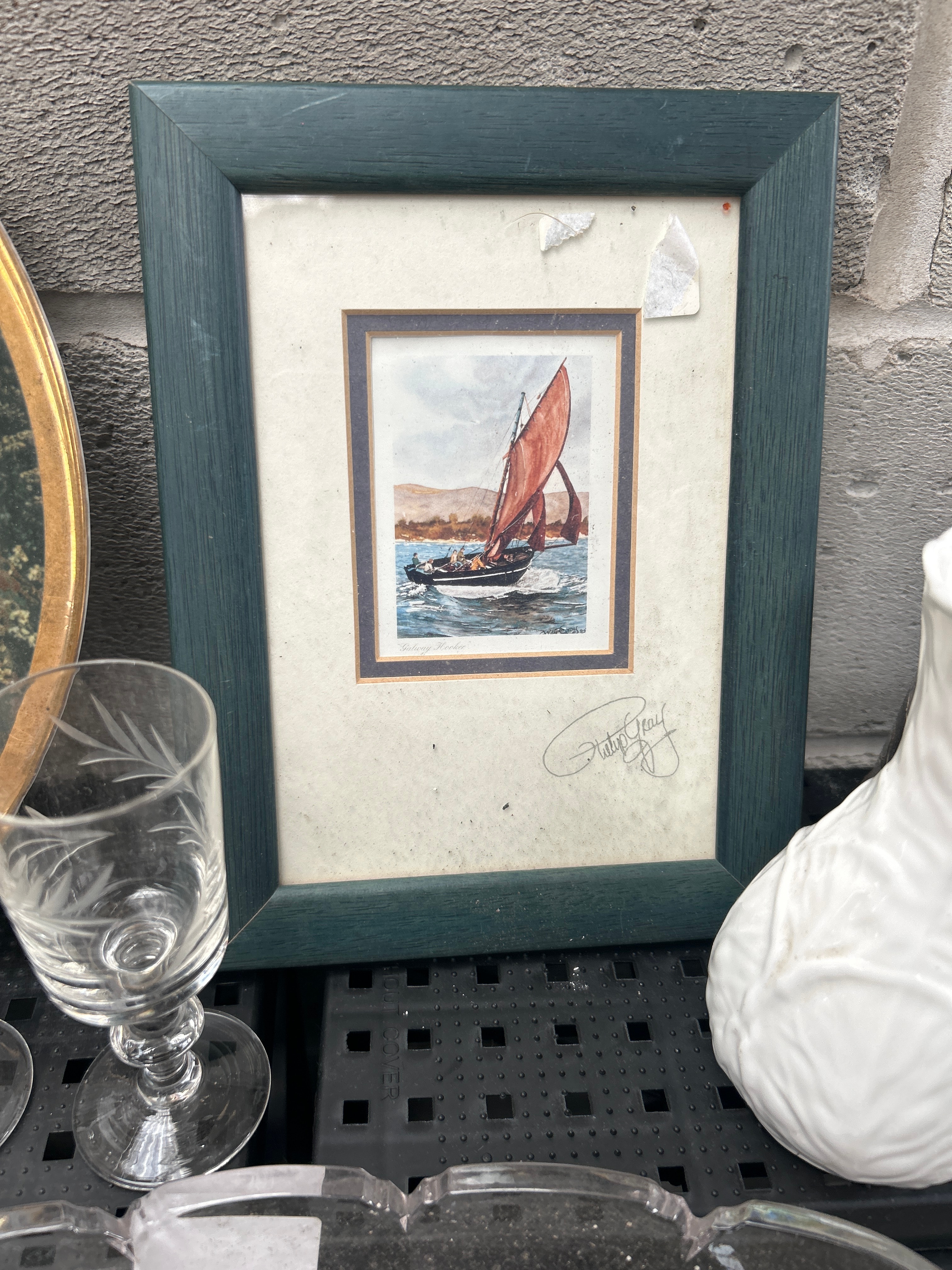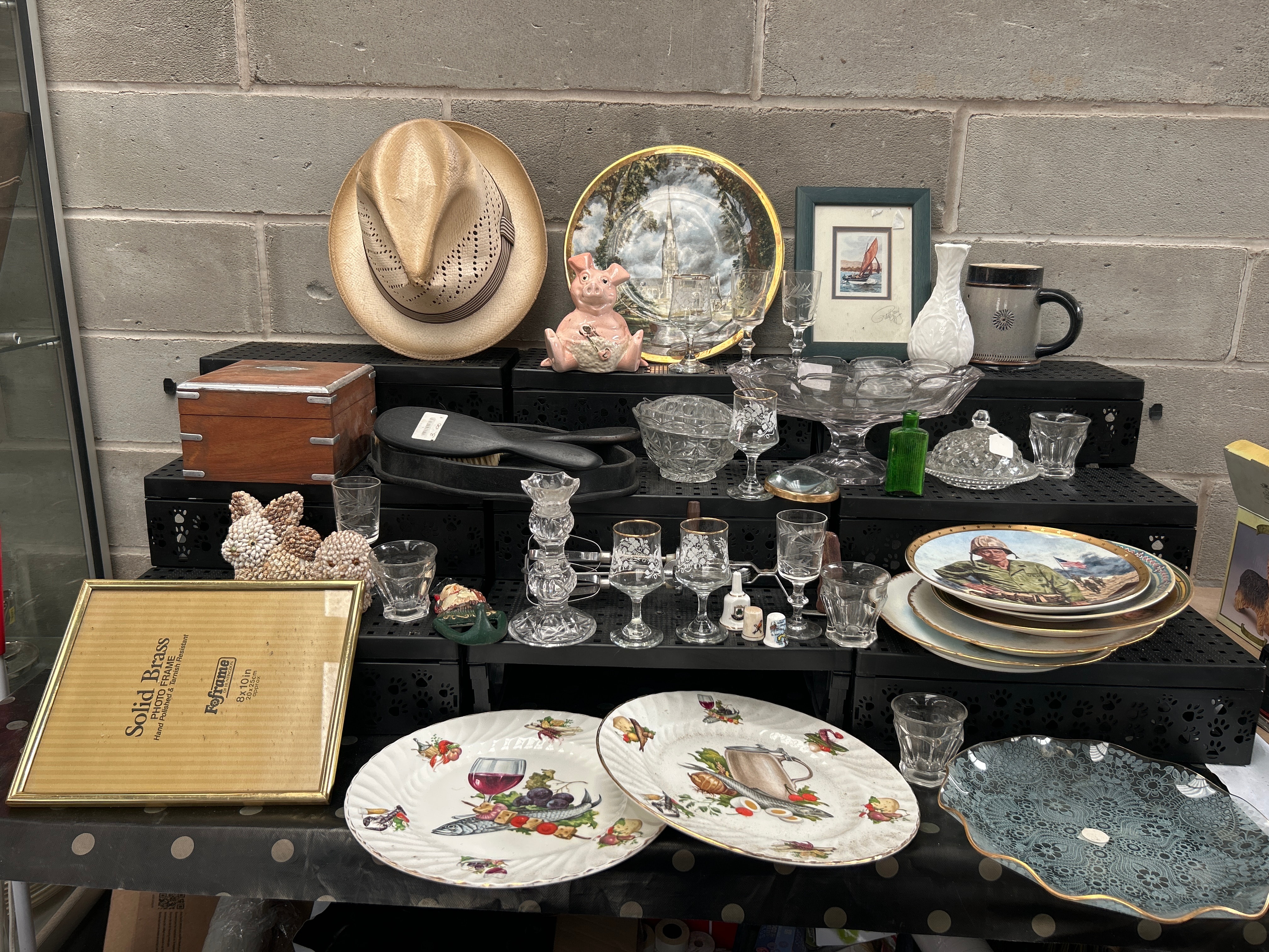 This diverse lot comprises a varied collection of decorative and household items. Key pieces include a woven straw hat; an assortment of clear glass and cut crystal stemware, bowls, and dishes; and a group of assorted ceramic and porcelain objects. The ceramic and porcelain items feature a pink pig figurine, a white relief-patterned vase, a dark mug, and several decorative plates, including one depicting a church spire, another with a military figure and a dog, two plates adorned with food and drink motifs and gilt accents, and a large blue/green plate with an intricate lace-like pattern. Further items include a framed print depicting a sailboat, signed “Patsy O’Neill”; a small wooden box with metal trim and an inlay; a black hairbrush; a pair of shell-covered figurines; a vintage metal kitchen tool; and a “Solid Brass PHOTO FRAME” by “Keframe” for an 8×10 inch picture.